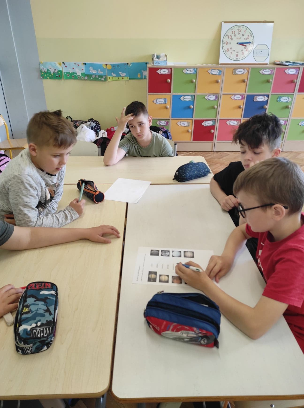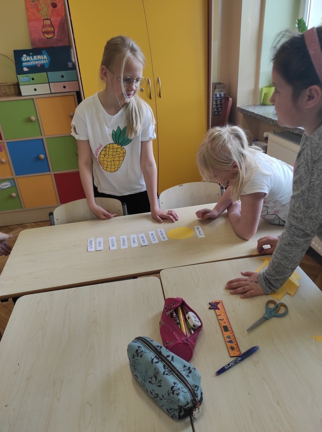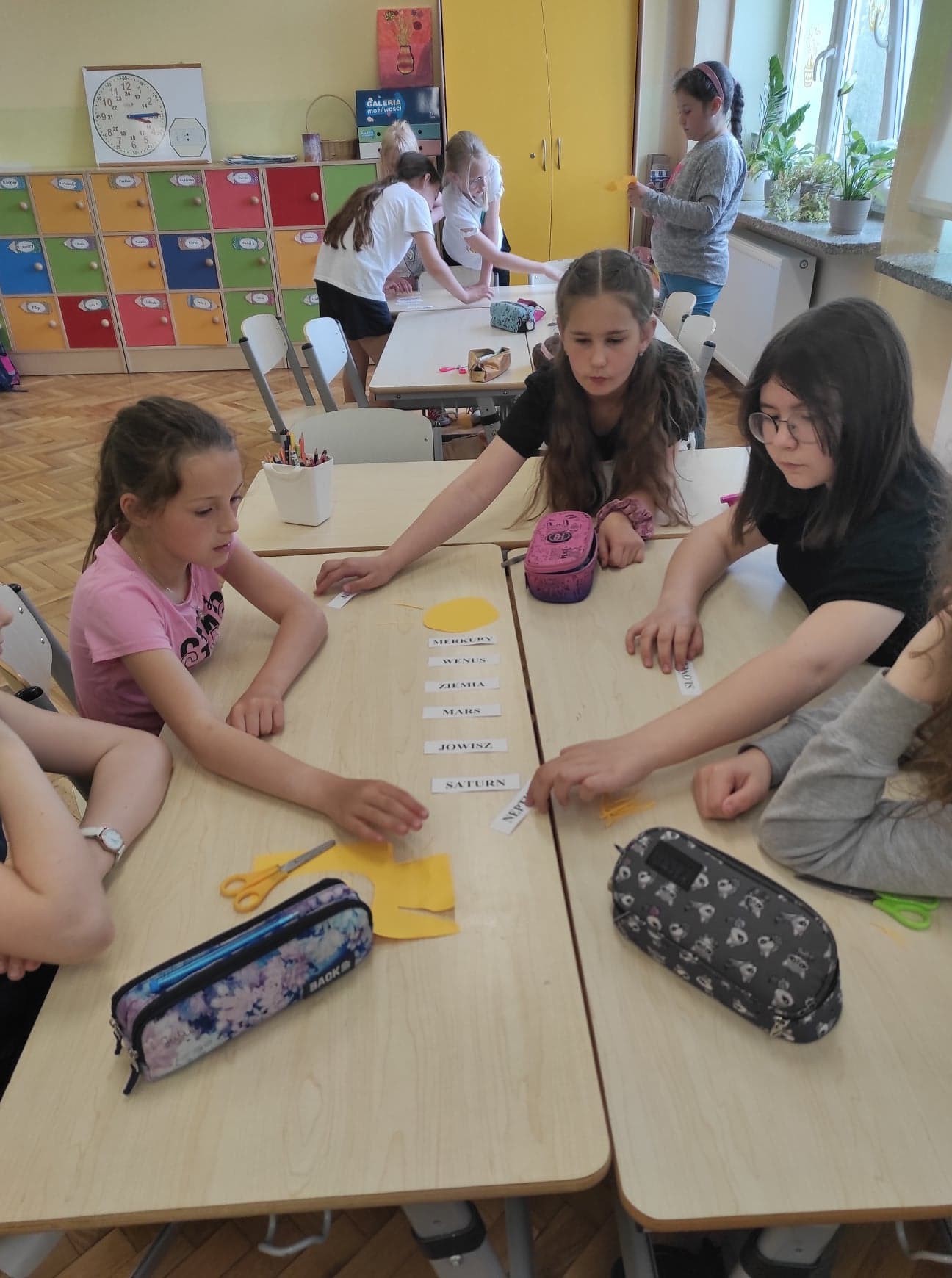 Na kolejnych zajęciach projektowych uczniowie klasy 3. rozmawiali na temat Układu Słonecznego. Obejrzeli prezentację multimedialną, dzięki której poszerzyli swoją wiedzę na temat planet. Na podstawie prezentacji uczniowie stworzyli makietę Układu Słonecznego. Rozpoznawali na podstawie ilustracji poszczególne planety i ich nazwy. Zajęcia opierały się głównie na pracy zespołowej.