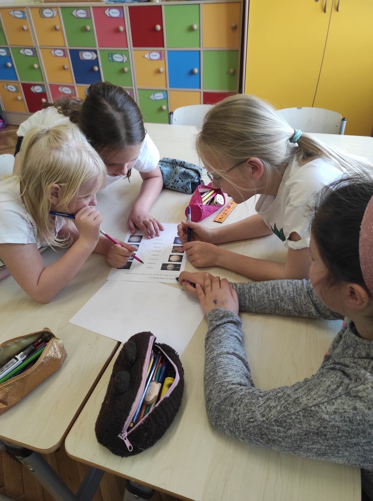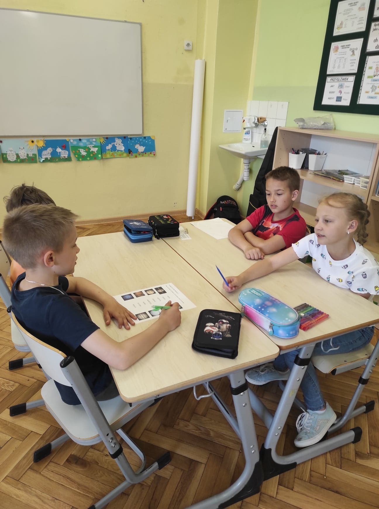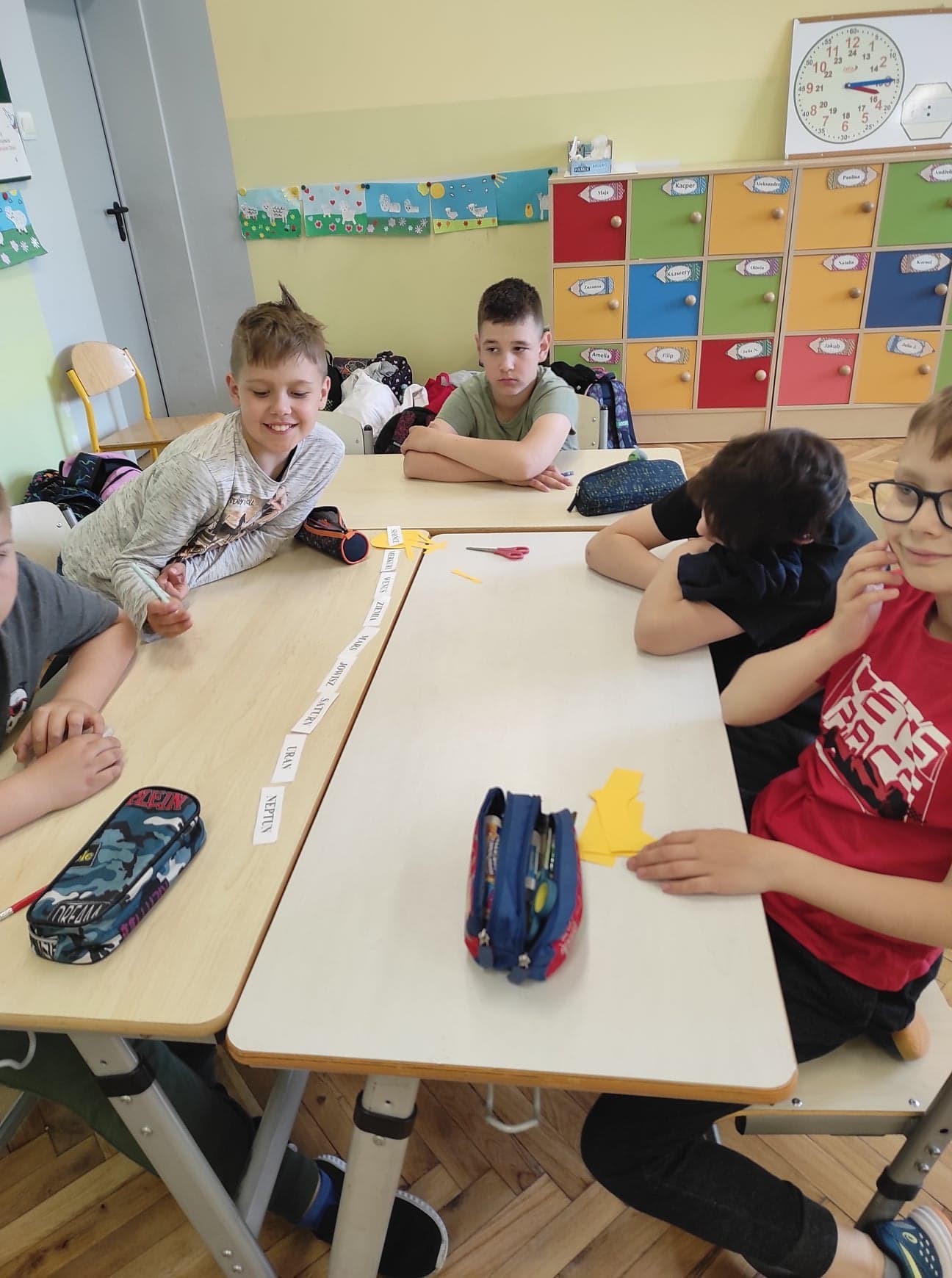 Na kolejnych zajęciach projektowych uczniowie klasy 3. rozmawiali na temat Układu Słonecznego. Obejrzeli prezentację multimedialną, dzięki której poszerzyli swoją wiedzę na temat planet. Na podstawie prezentacji uczniowie stworzyli makietę Układu Słonecznego. Rozpoznawali na podstawie ilustracji poszczególne planety i ich nazwy. Zajęcia opierały się głównie na pracy zespołowej.