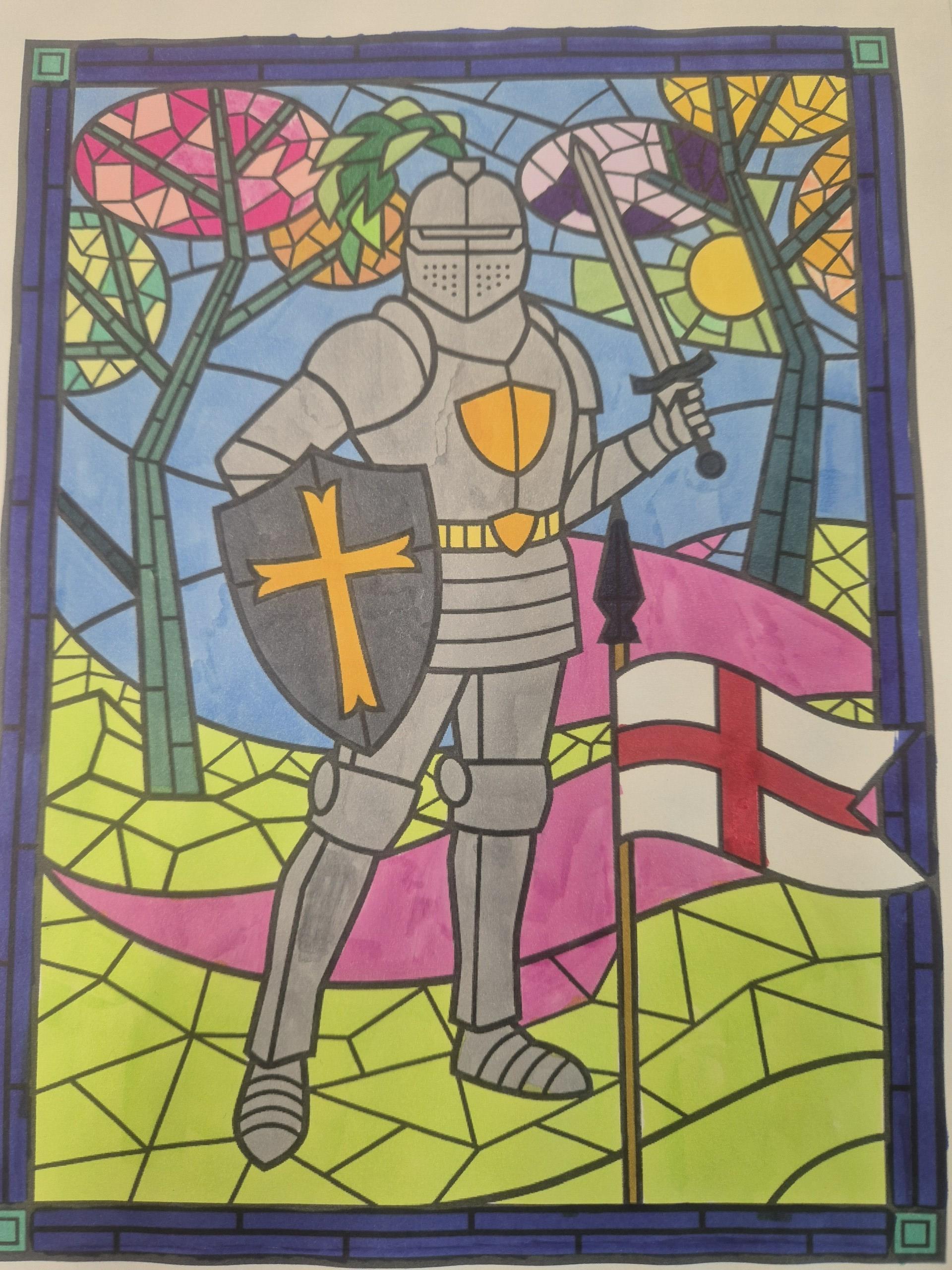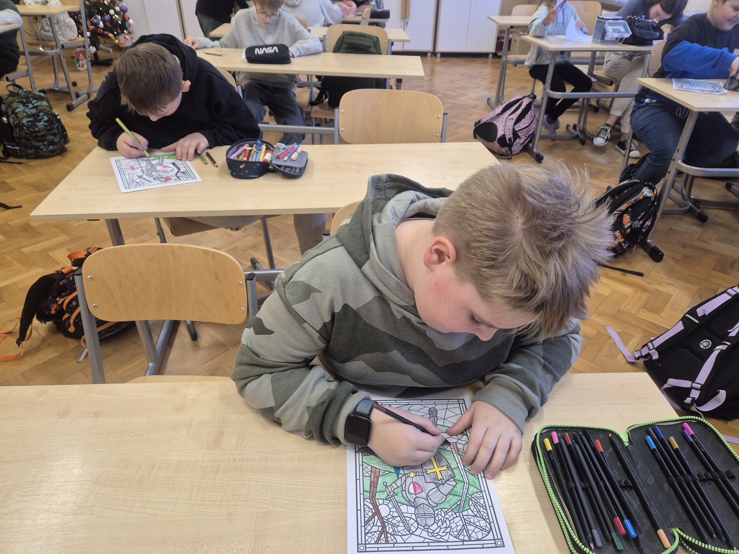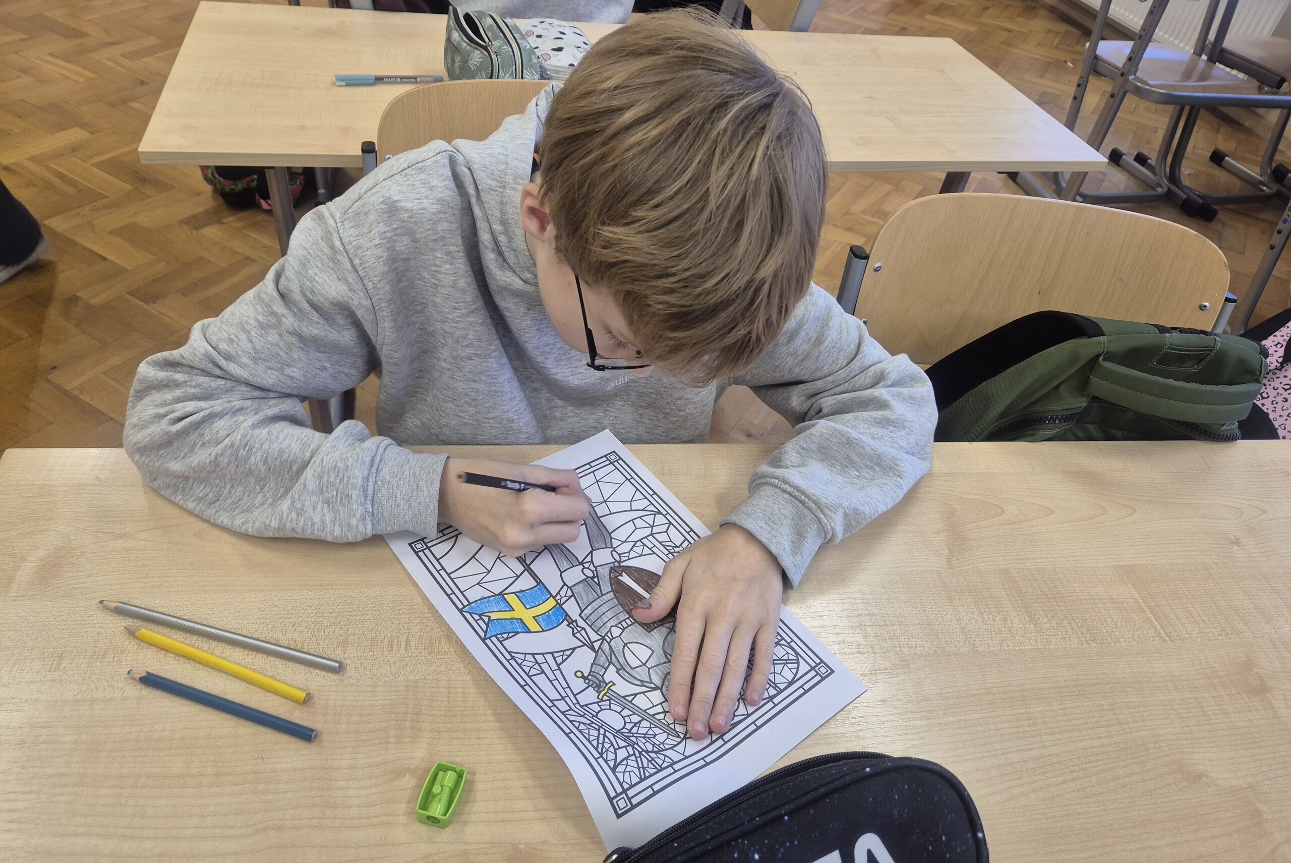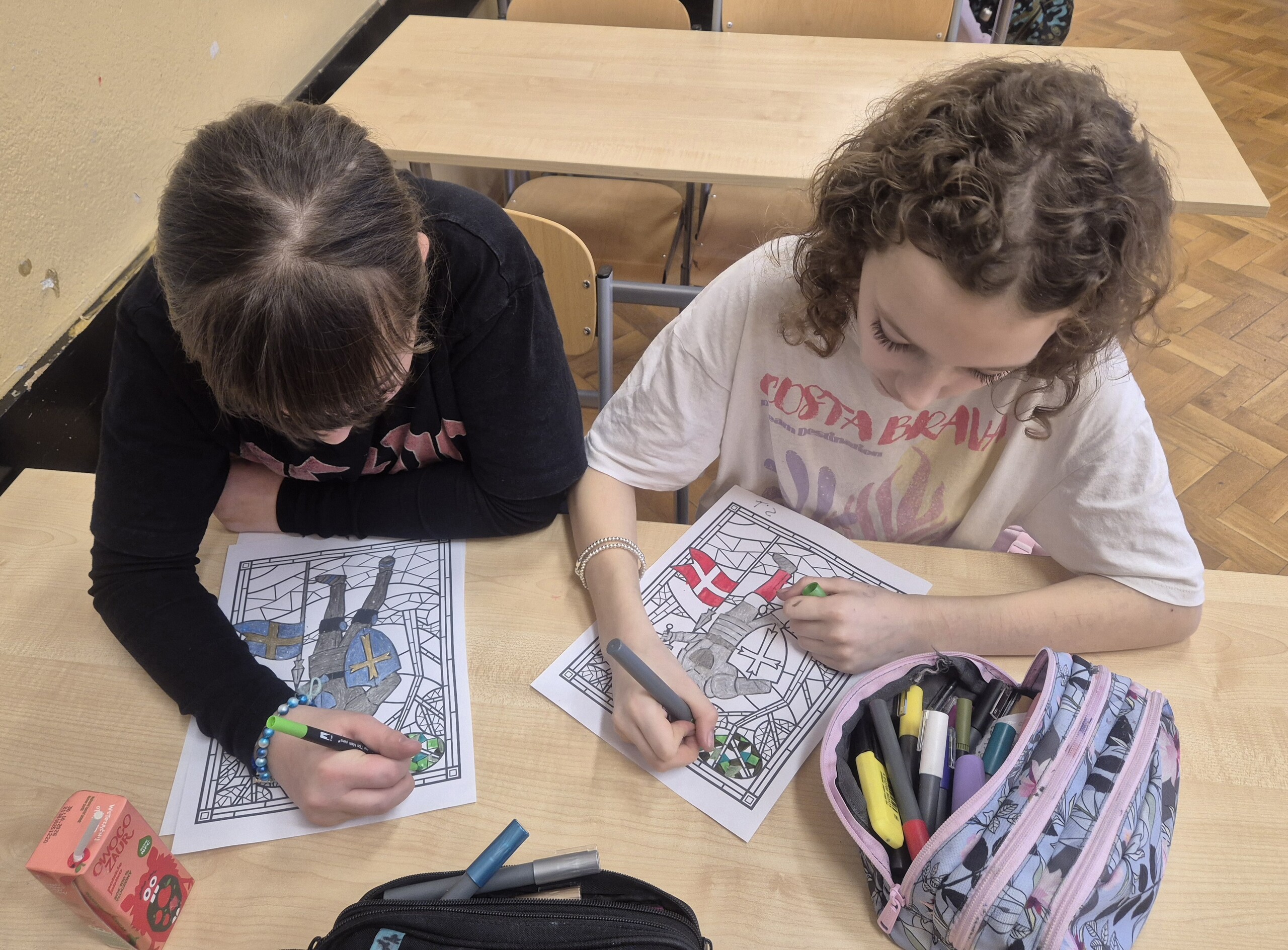 Następnie obejrzeli film edukacyjny przedstawiający proces powstawania witraży. Po zdobyciu wiedzy teoretycznej uczniowie przystąpili do części praktycznej, czyli wykonania własnych prac plastycznych. Każdy z uczniów stworzył kolorowy witraż, ozdabiając postać rycerza zgodnie z indywidualnym pomysłem.