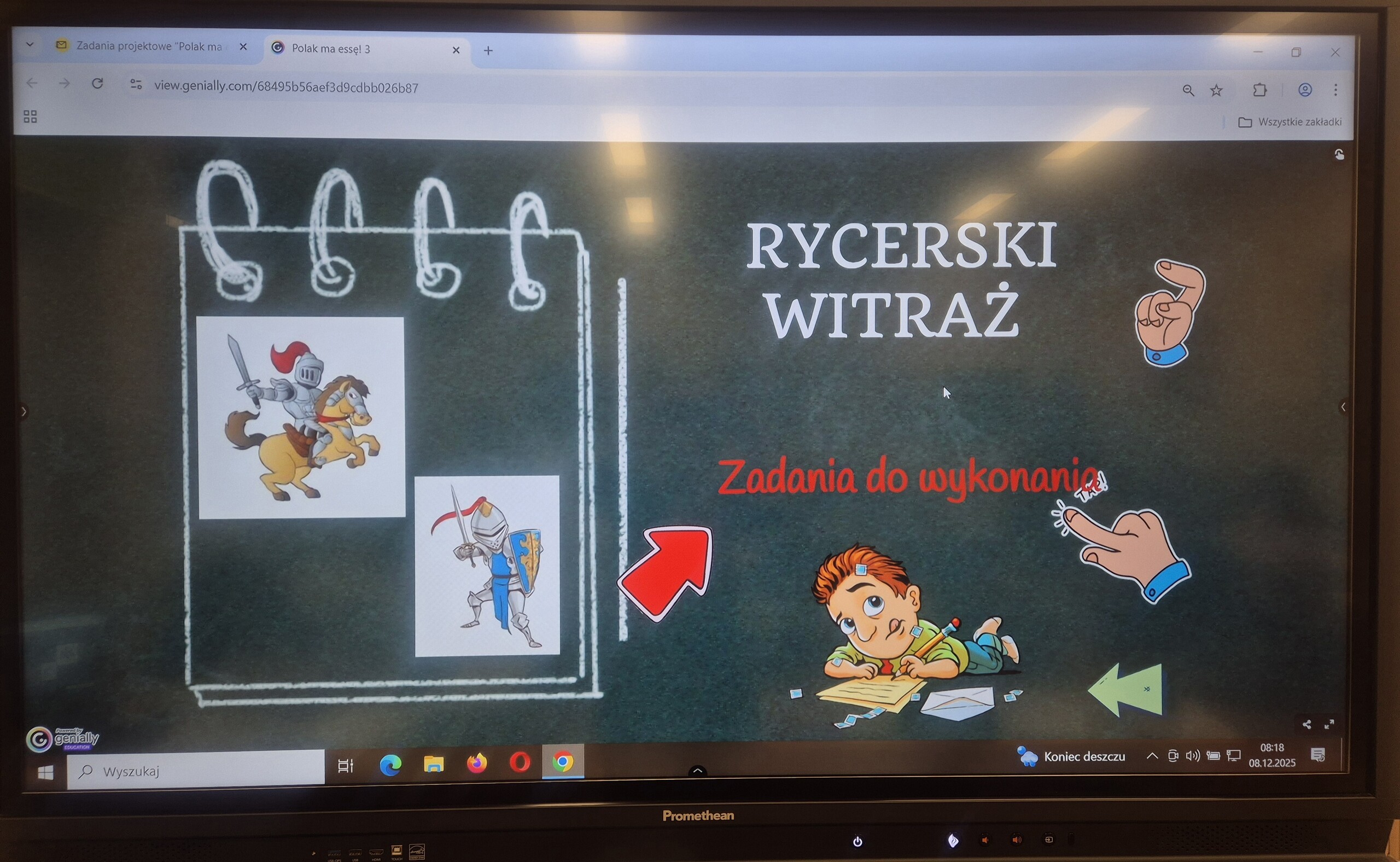 Klasa 5, na lekcji języka polskiego, zrealizowała zadanie w ramach projektu Polak ma essę pt. „Rycerski witraż”. Uczniowie rozpoczęli zajęcia od zapoznania się z krótką prezentacją, zawierającą informacje dotyczące symboliki oraz znaczenia kolorów stosowanych na średniowiecznych witrażach rycerskich.