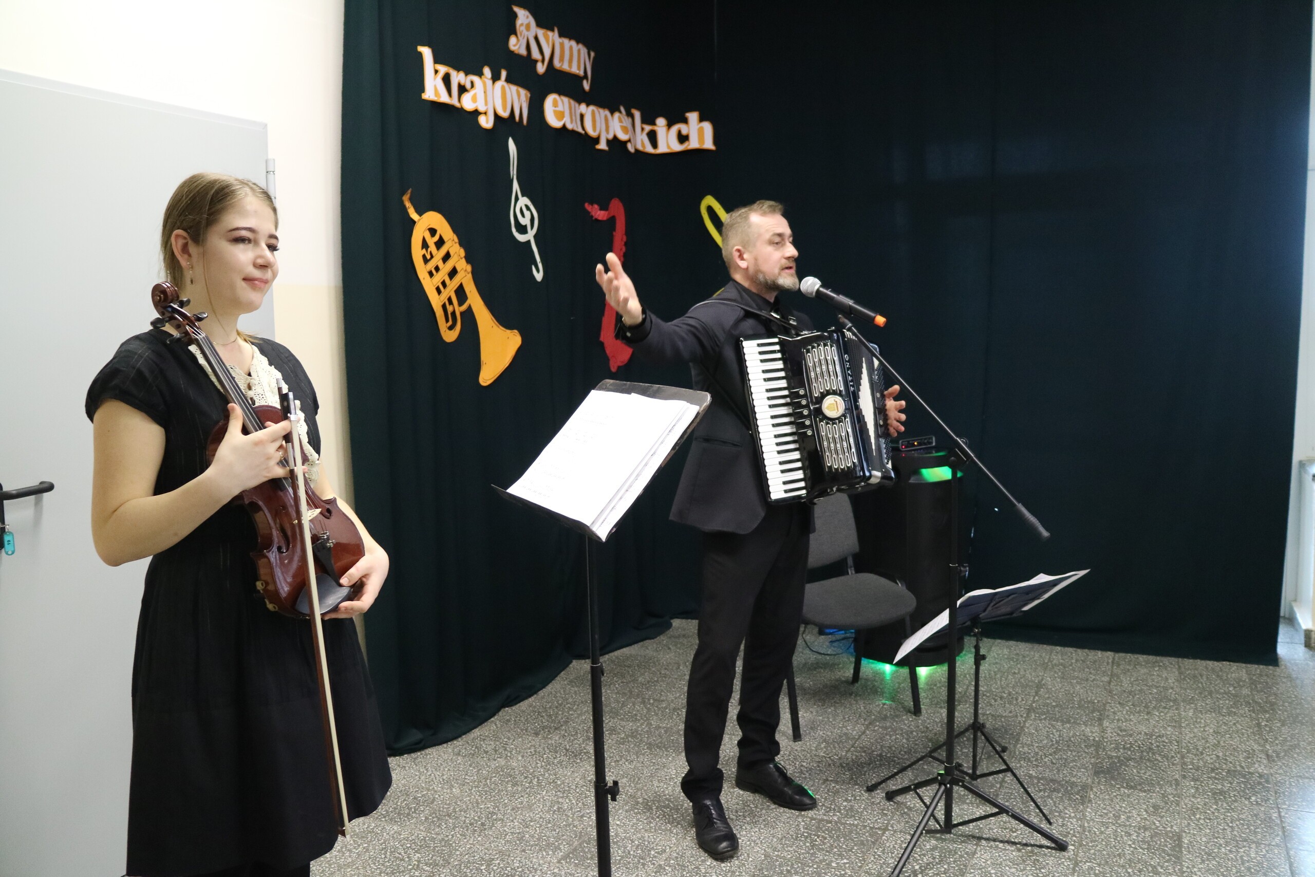 Dla uczniów naszej szkoły poniedziałkowy poranek 3 lutego rozpoczął się inaczej niż zwykle. Zaraz po pierwszym dzwonku wszyscy udali się na hol, by wziąć udział w audycji muzycznej. Muzycy przygotowali ciekawy program. Najpierw dzieci poznały instrumenty: akordeon i skrzypce. Dużym zainteresowaniem wśród młodych słuchaczy okazała się prezentacja akordeonu i jego brzmienia. Potem artyści zabrali nas w muzyczną podróż do wybranego kraju, aby zaprezentować melodię do tańców.