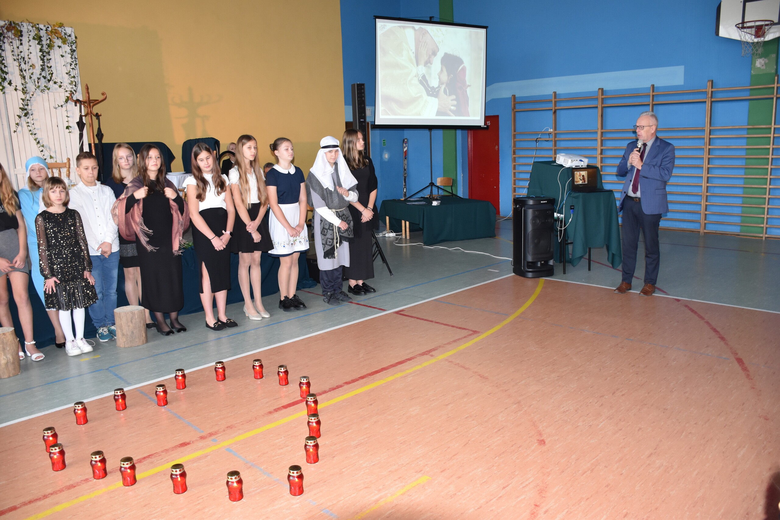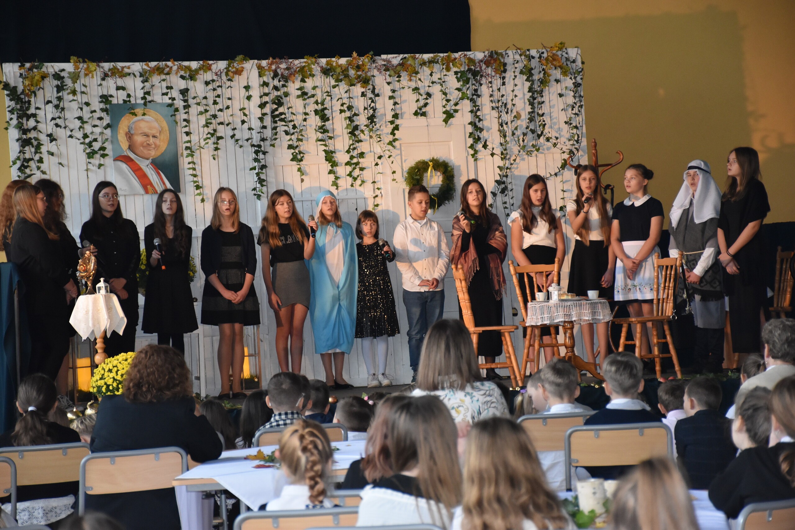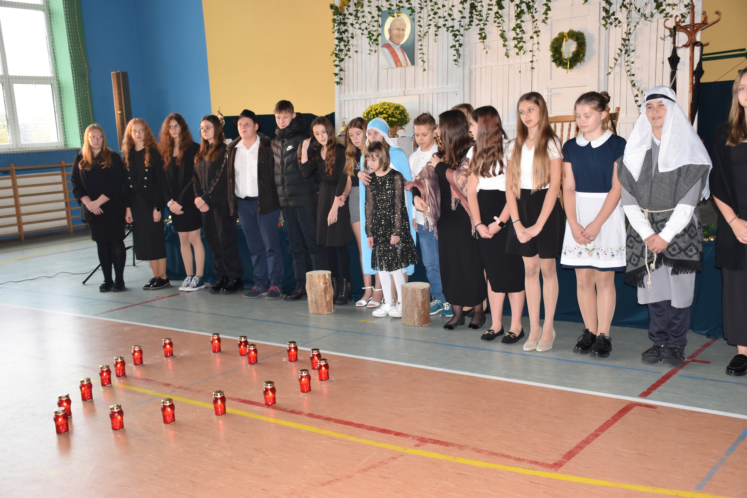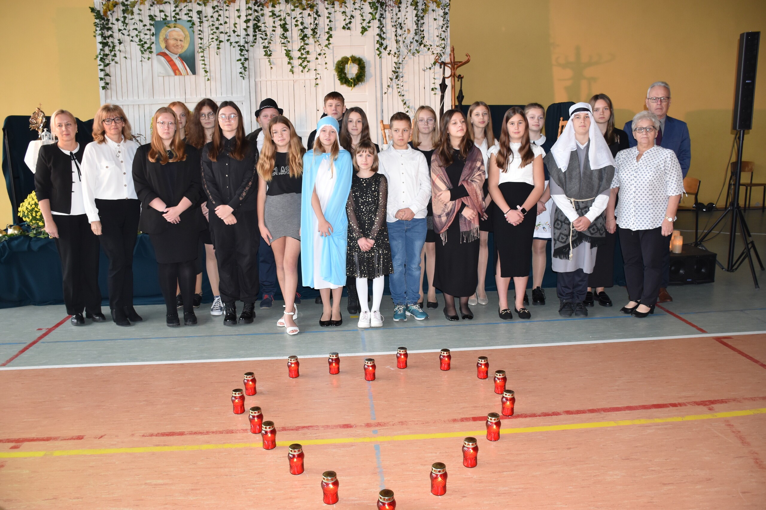 W środę 30 października 2024 roku obchodziliśmy kolejne Święto Szkoły. Uroczystość ta związana była z osiemnastą rocznicą nadania naszej szkole imienia Wielkiego Polaka – Papieża Jana Pawła II. W tym dniu staraliśmy się szczególnie uroczyście oddać hołd naszemu Patronowi. Uczniowie przyszli do szkoły w strojach galowych. Wśród społeczności szkolnej nie zabrakło również Przewodniczącej Rady Rodziców Pani Justyny Wilgi. Na początku uroczystości głos zabrał Pan Dyrektor Krzysztof Wojtysiak, który nawiązał do momentu nadania naszej szkole imienia Jana Pawła II. Uczniowie klas VI, VIII oraz uczennice kl. IV i V przygotowali program poetycko – muzyczny, przybliżając sylwetkę św. Jana Pawła II wprowadzając w chwilę refleksji i zadumy. W czasie uroczystości panowała poważna i wzniosła atmosfera. Uczniowie uważnie wsłuchiwali się w dialogi, deklamowane wiersze oraz śpiewane piosenki. Na zakończenie spotkania głos zabrał Pan dyrektor i podziękował wszystkim, którzy przygotowali dzisiejszą uroczystość. Miłym akcentem było wręczenie uczniom obrazka z wizerunkiem Papieża Świętego Jana Pawła II, które otrzymaliśmy od księdza proboszcza Janusza Górala.