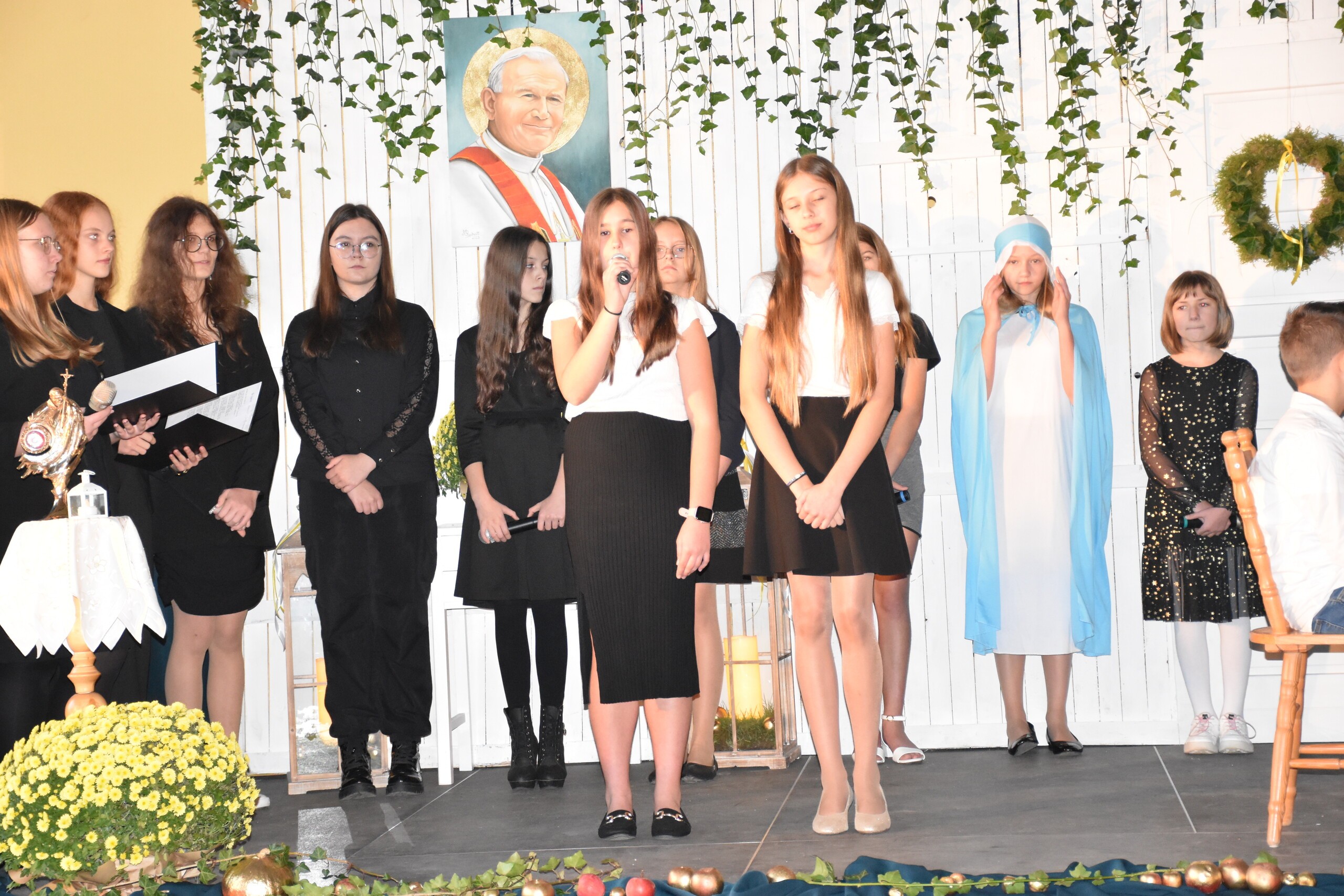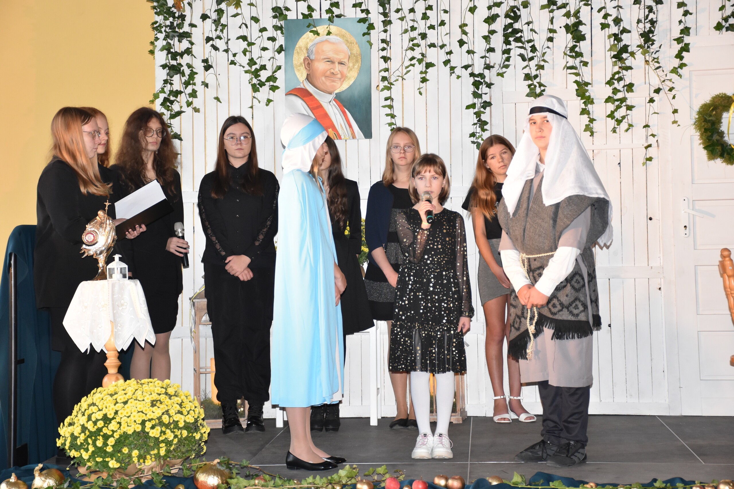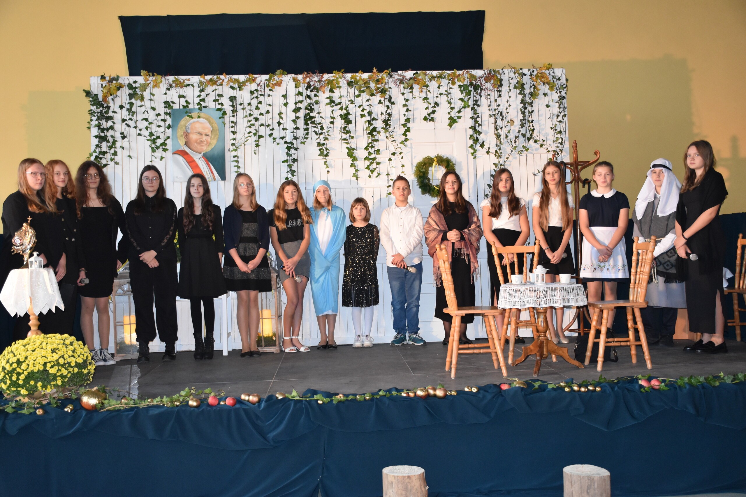 W środę 30 października 2024 roku obchodziliśmy kolejne Święto Szkoły. Uroczystość ta związana była z osiemnastą rocznicą nadania naszej szkole imienia Wielkiego Polaka – Papieża Jana Pawła II. W tym dniu staraliśmy się szczególnie uroczyście oddać hołd naszemu Patronowi. Uczniowie przyszli do szkoły w strojach galowych. Wśród społeczności szkolnej nie zabrakło również Przewodniczącej Rady Rodziców Pani Justyny Wilgi. Na początku uroczystości głos zabrał Pan Dyrektor Krzysztof Wojtysiak, który nawiązał do momentu nadania naszej szkole imienia Jana Pawła II. Uczniowie klas VI, VIII oraz uczennice kl. IV i V przygotowali program poetycko – muzyczny, przybliżając sylwetkę św. Jana Pawła II wprowadzając w chwilę refleksji i zadumy. W czasie uroczystości panowała poważna i wzniosła atmosfera. Uczniowie uważnie wsłuchiwali się w dialogi, deklamowane wiersze oraz śpiewane piosenki. Na zakończenie spotkania głos zabrał Pan dyrektor i podziękował wszystkim, którzy przygotowali dzisiejszą uroczystość. Miłym akcentem było wręczenie uczniom obrazka z wizerunkiem Papieża Świętego Jana Pawła II, które otrzymaliśmy od księdza proboszcza Janusza Górala.