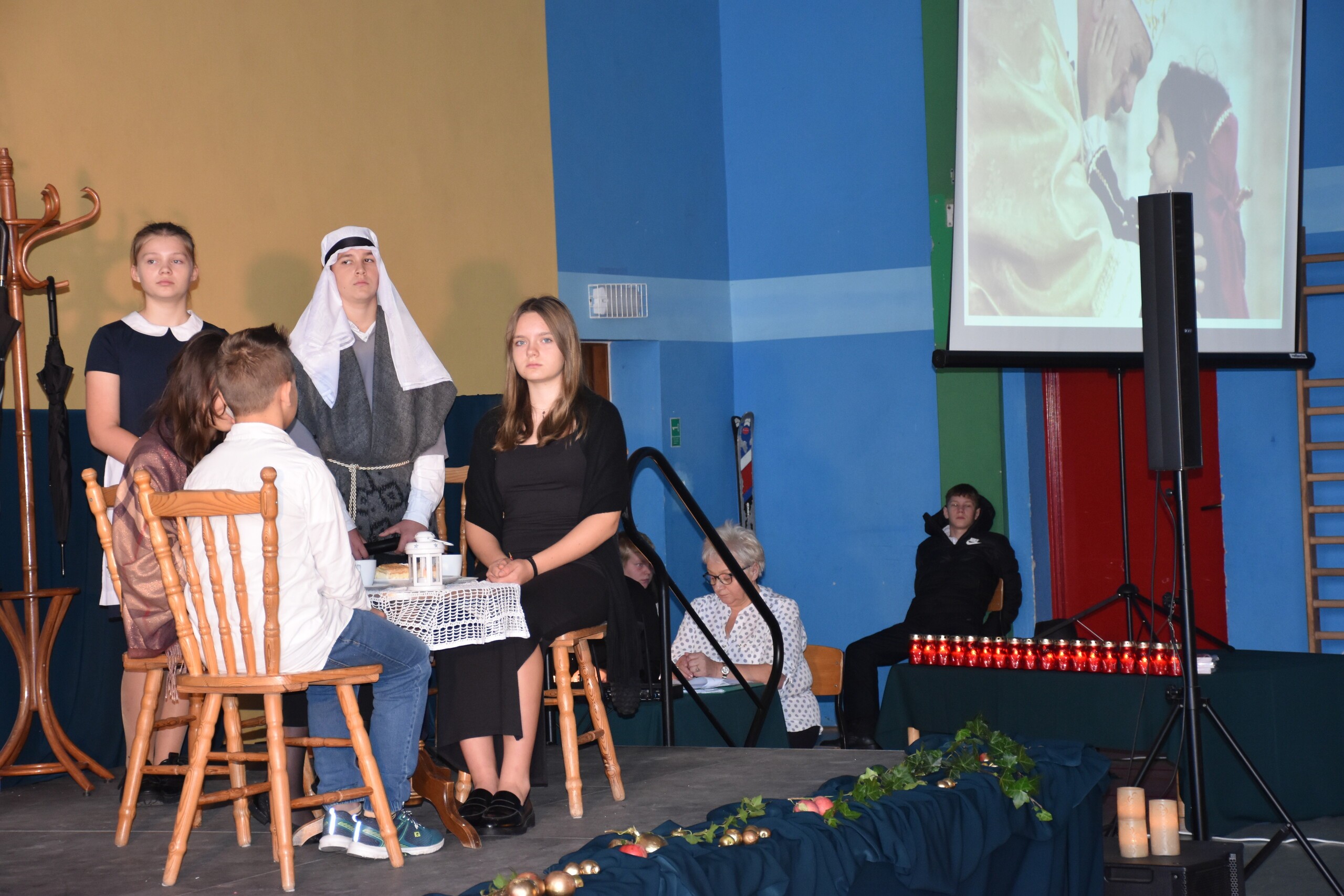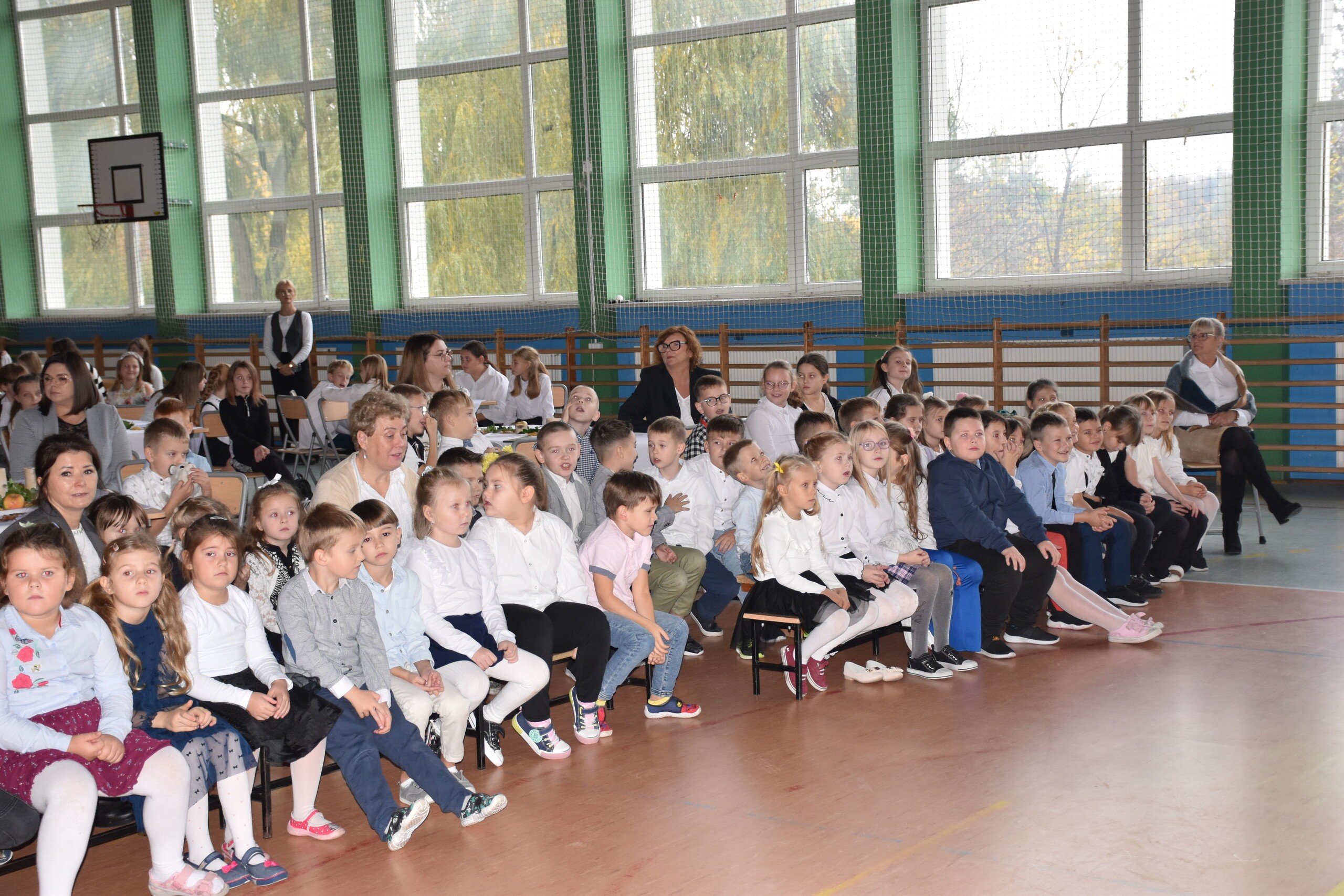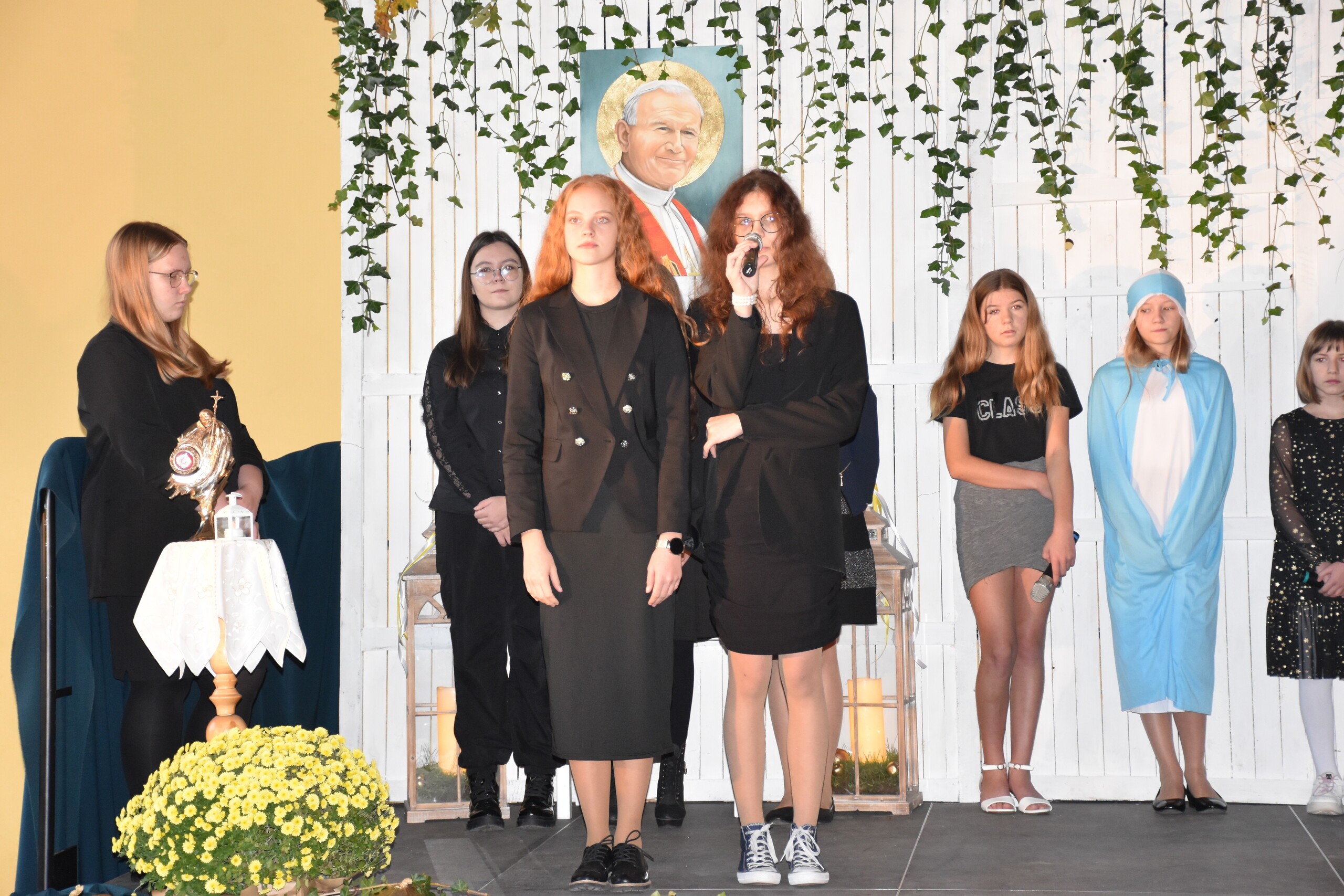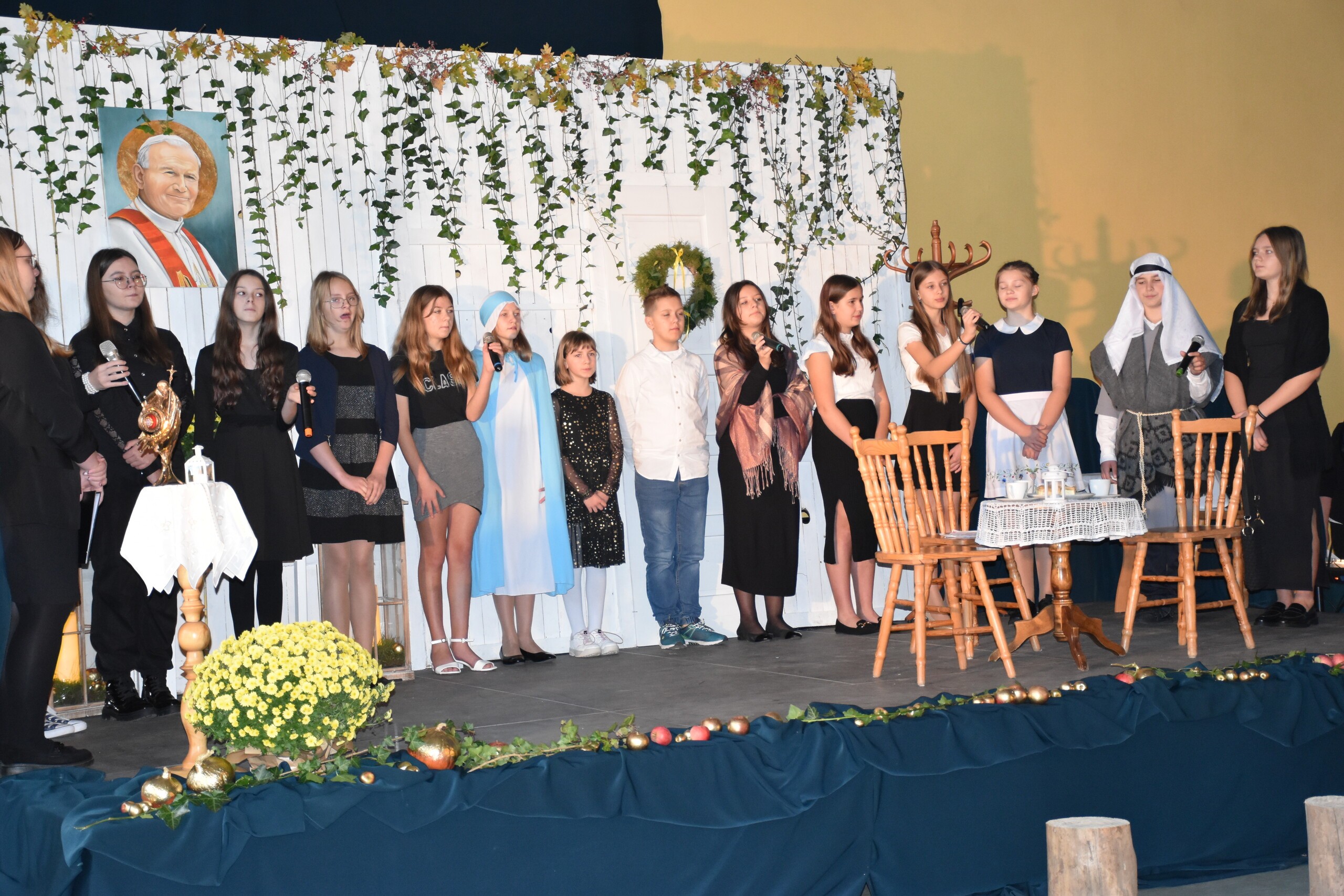 W środę 30 października 2024 roku obchodziliśmy kolejne Święto Szkoły. Uroczystość ta związana była z osiemnastą rocznicą nadania naszej szkole imienia Wielkiego Polaka – Papieża Jana Pawła II. W tym dniu staraliśmy się szczególnie uroczyście oddać hołd naszemu Patronowi. Uczniowie przyszli do szkoły w strojach galowych. Wśród społeczności szkolnej nie zabrakło również Przewodniczącej Rady Rodziców Pani Justyny Wilgi. Na początku uroczystości głos zabrał Pan Dyrektor Krzysztof Wojtysiak, który nawiązał do momentu nadania naszej szkole imienia Jana Pawła II. Uczniowie klas VI, VIII oraz uczennice kl. IV i V przygotowali program poetycko – muzyczny, przybliżając sylwetkę św. Jana Pawła II wprowadzając w chwilę refleksji i zadumy. W czasie uroczystości panowała poważna i wzniosła atmosfera. Uczniowie uważnie wsłuchiwali się w dialogi, deklamowane wiersze oraz śpiewane piosenki. Na zakończenie spotkania głos zabrał Pan dyrektor i podziękował wszystkim, którzy przygotowali dzisiejszą uroczystość. Miłym akcentem było wręczenie uczniom obrazka z wizerunkiem Papieża Świętego Jana Pawła II, które otrzymaliśmy od księdza proboszcza Janusza Górala.