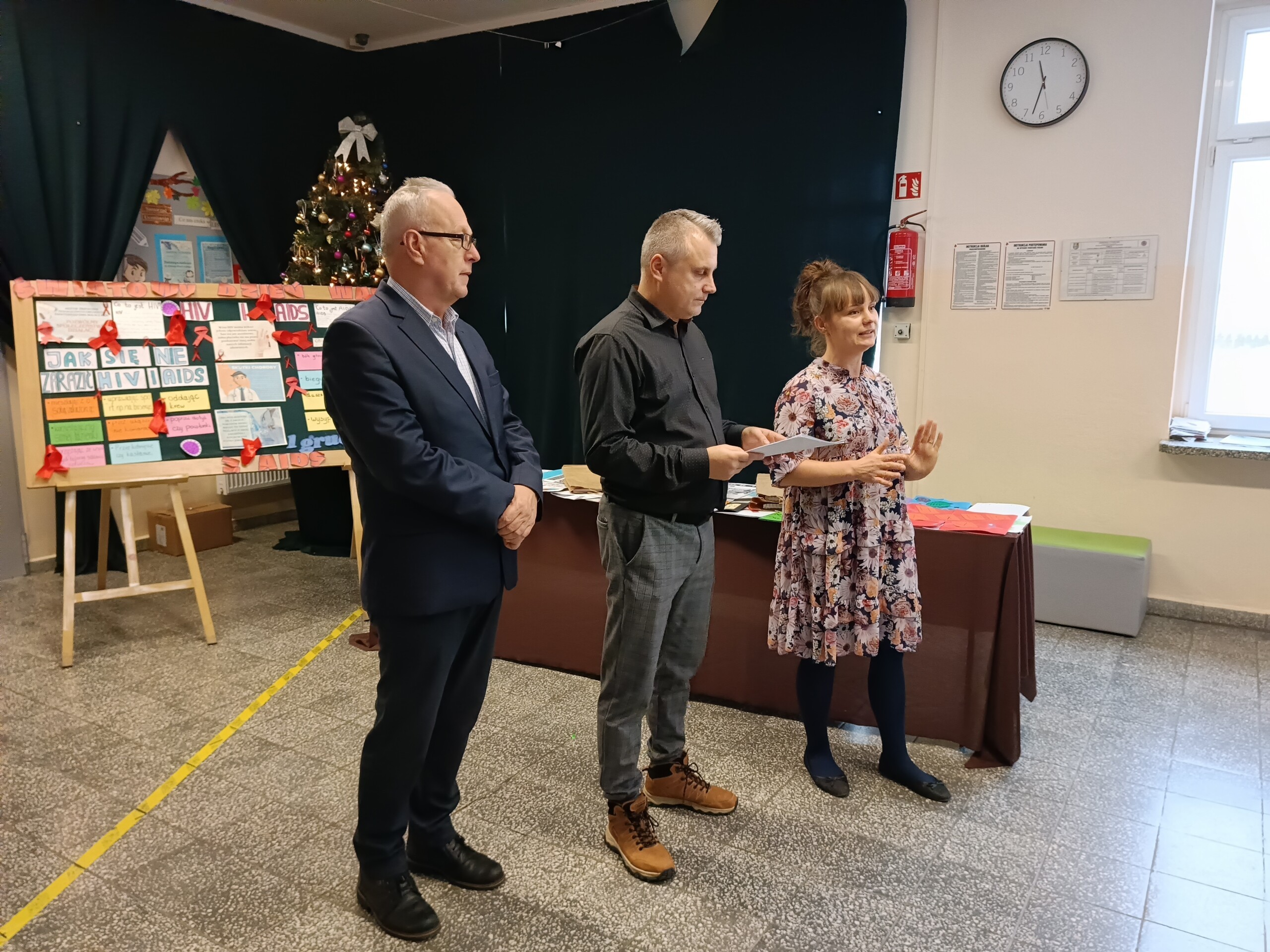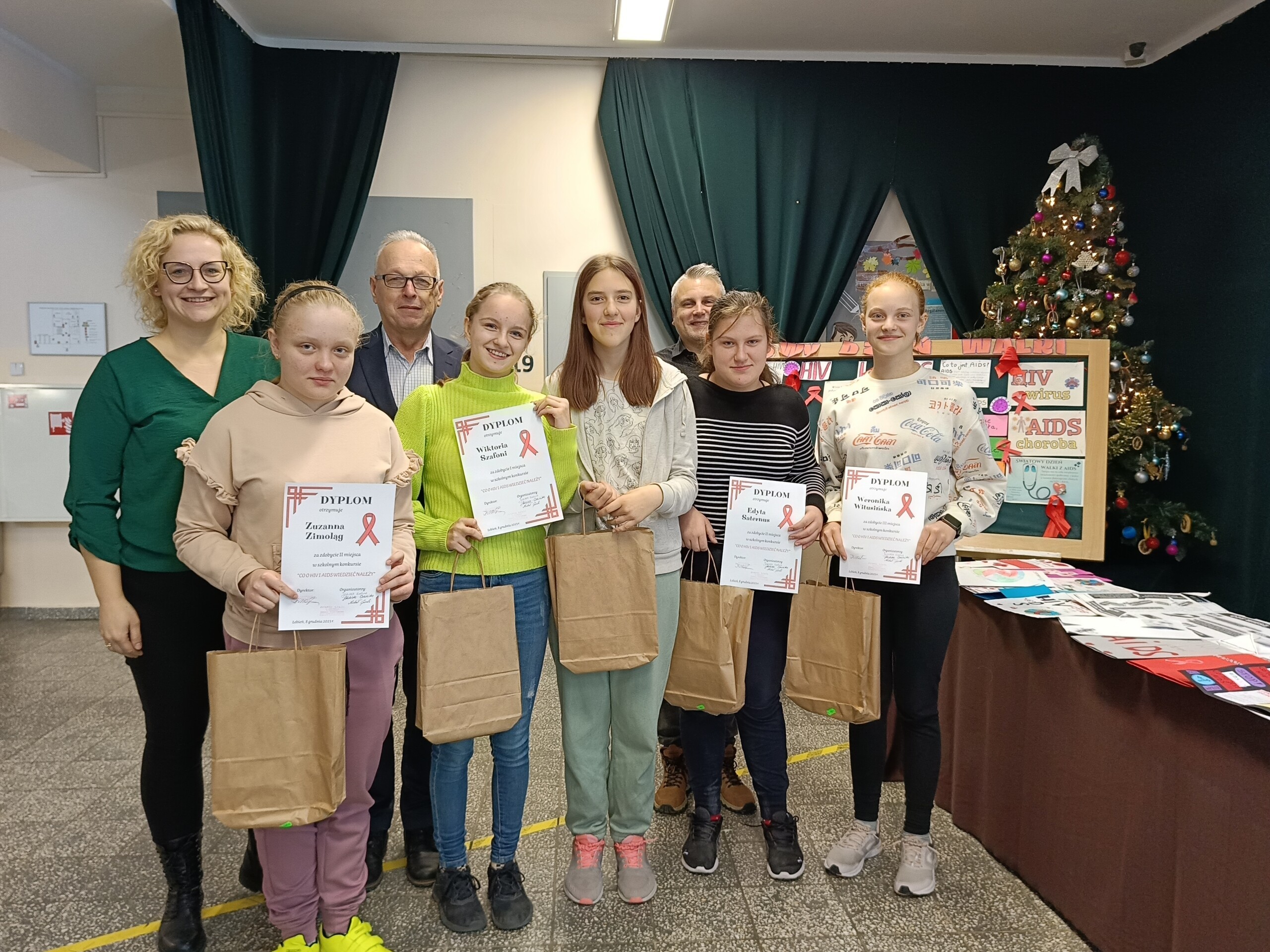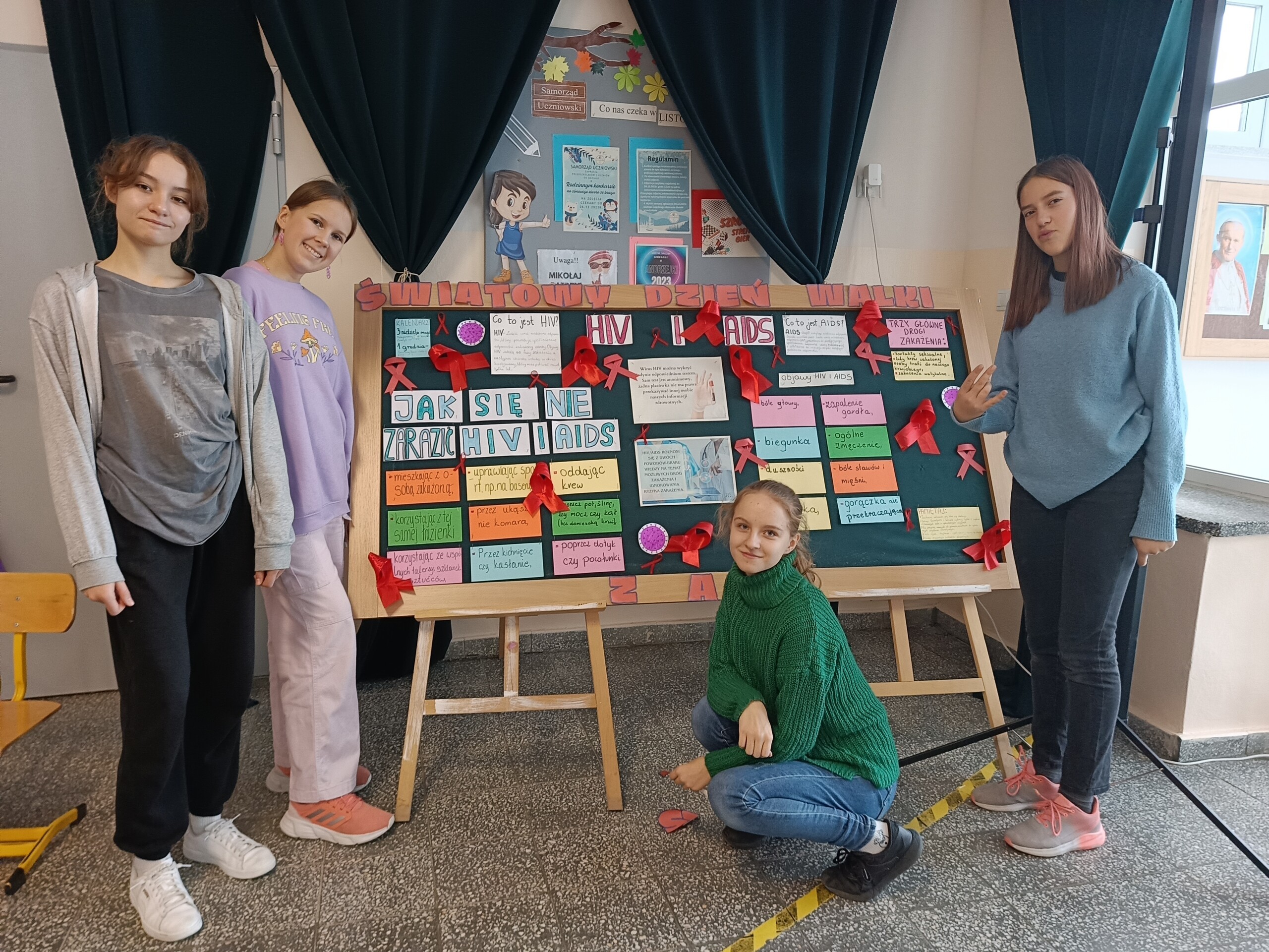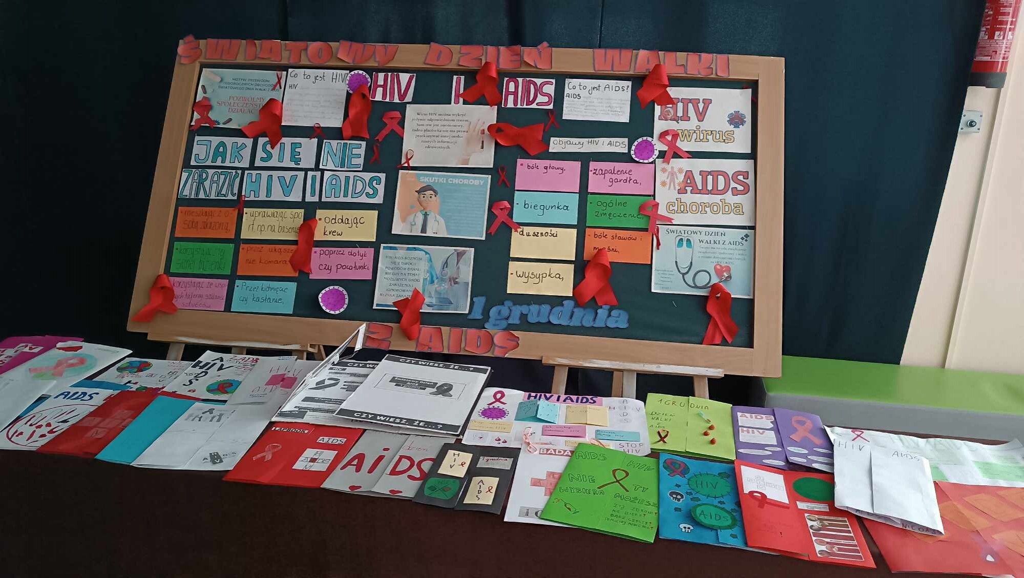 Jak co roku w naszej szkole uczniowie klas V-VIII podczas lekcji biologii zapoznawali się z wiedzą na temat HIV/ AIDS, poznając fakty, obalone zostały mity na temat tej choroby. Na holu szkoły powstała gazetka i kącik informacyjny, w którym prezentowane były lapbooki autorstwa uczniów. Dodatkowo został przeprowadzony konkurs wiedzy na temat: „Co o HIV i AIDS wiedzieć należy”, udział w nim wzięli uczniowie klas VII- VIII.