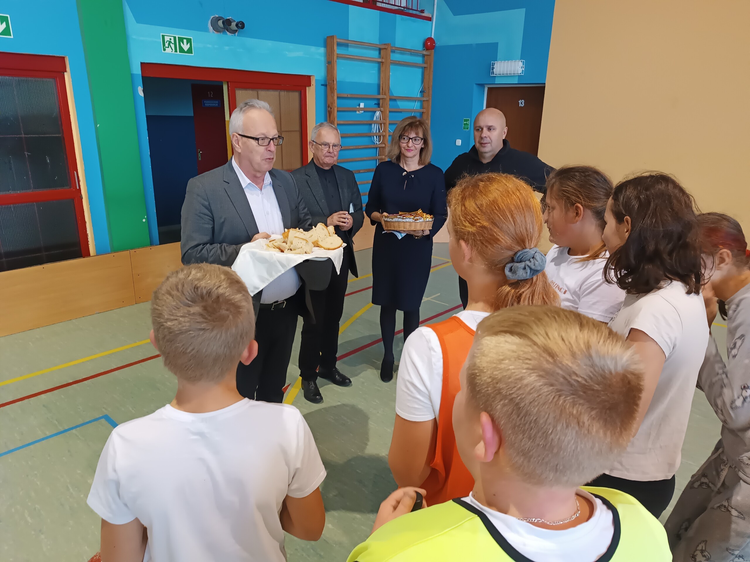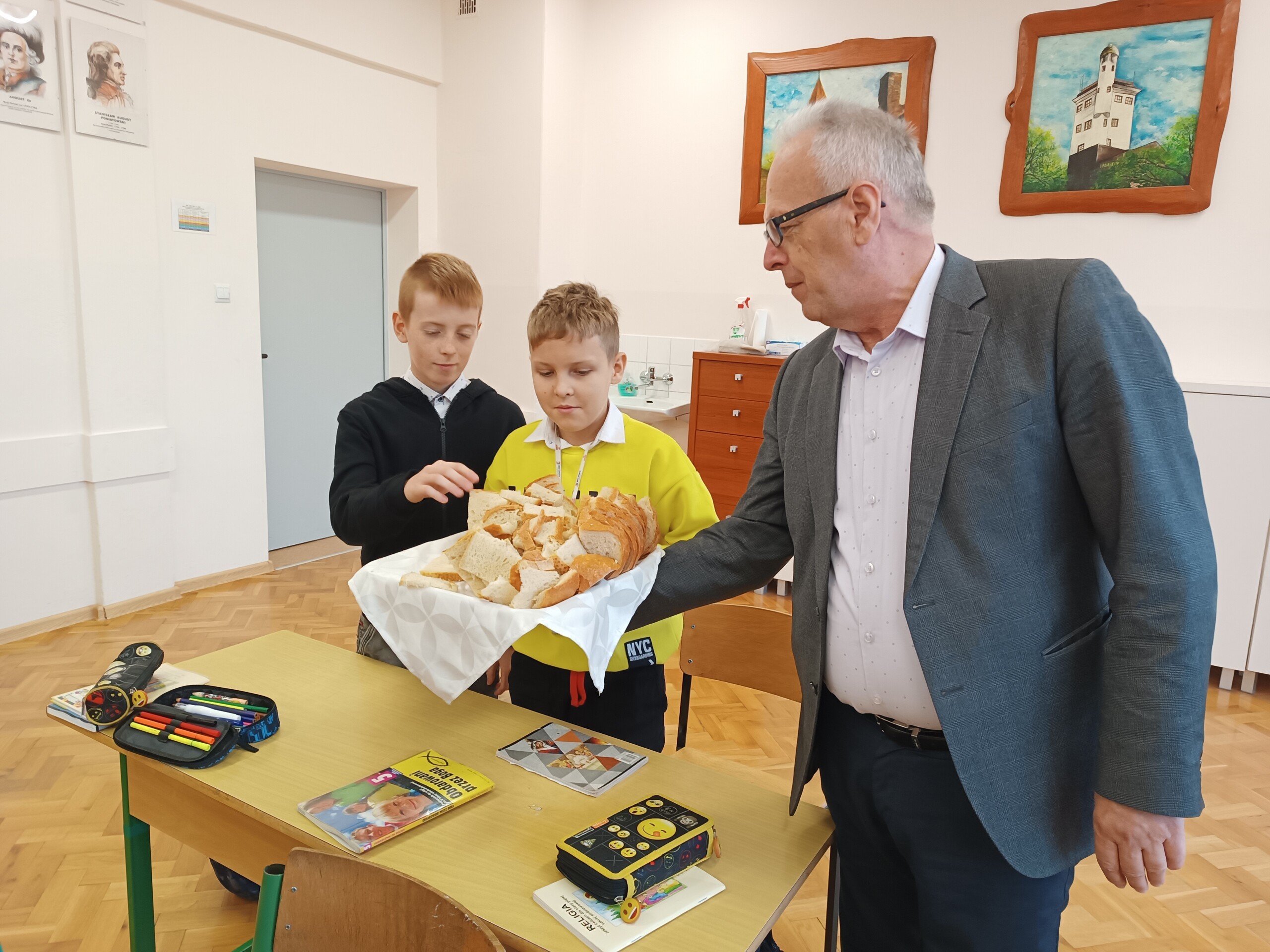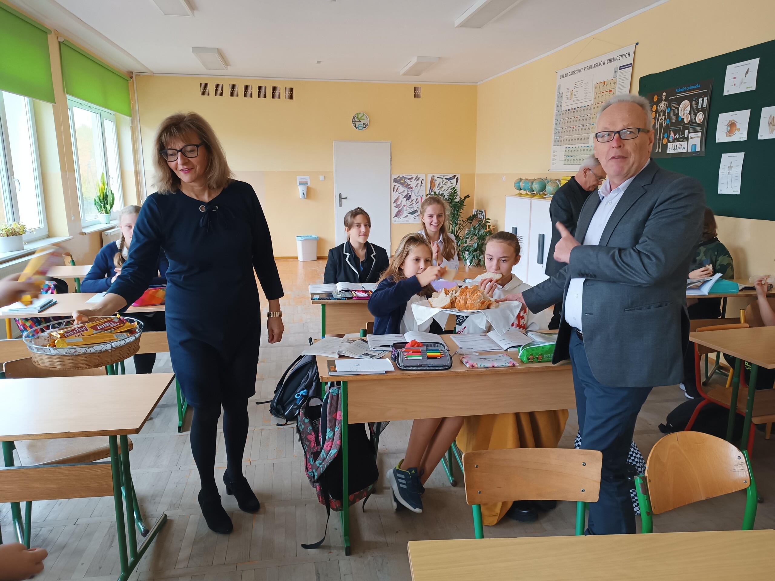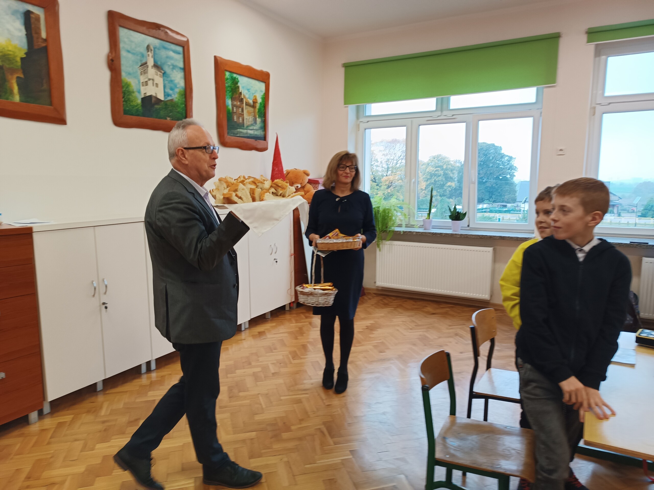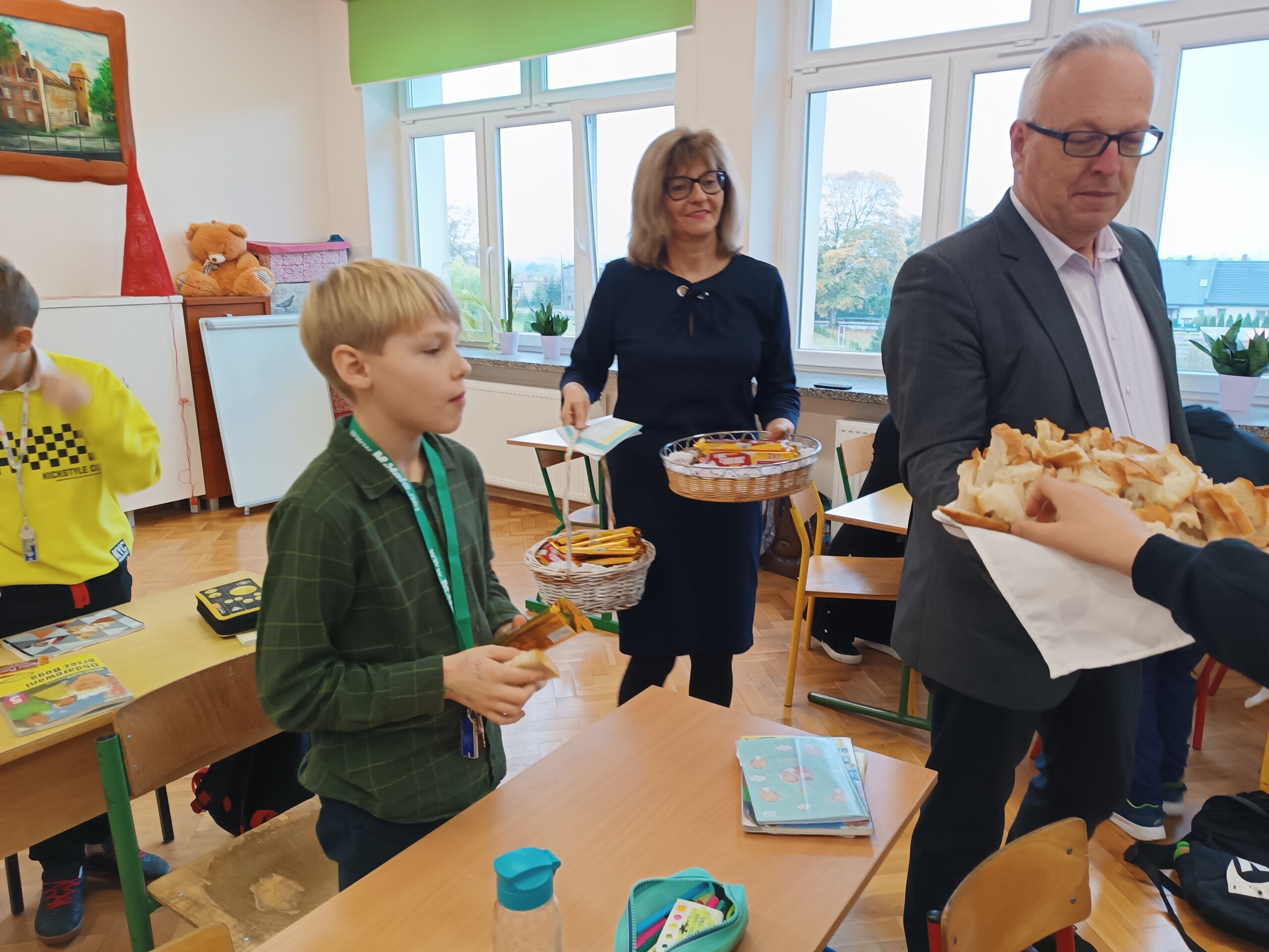 Miłym akcentem tego dnia było spożycie chleba, przez całą społeczność szkolną, który był składany podczas Mszy św. na ołtarzu pańskim. Pan dyrektor częstował chlebem, pani wicedyrektor wręczała słodkie batoniki ufundowane przez księdza proboszcza Janusz Górala, a ksiądz proboszcz wręczał każdemu obrazek z wizerunkiem Papieża Świętego Jana Pawła II.