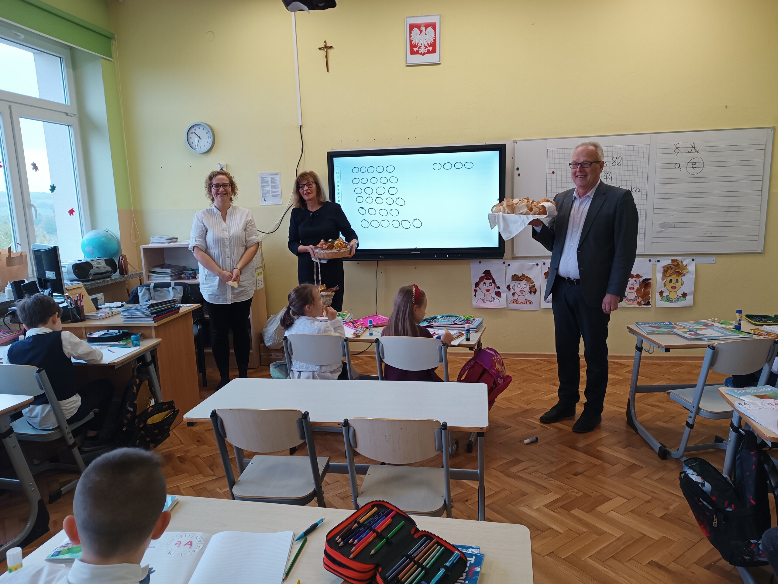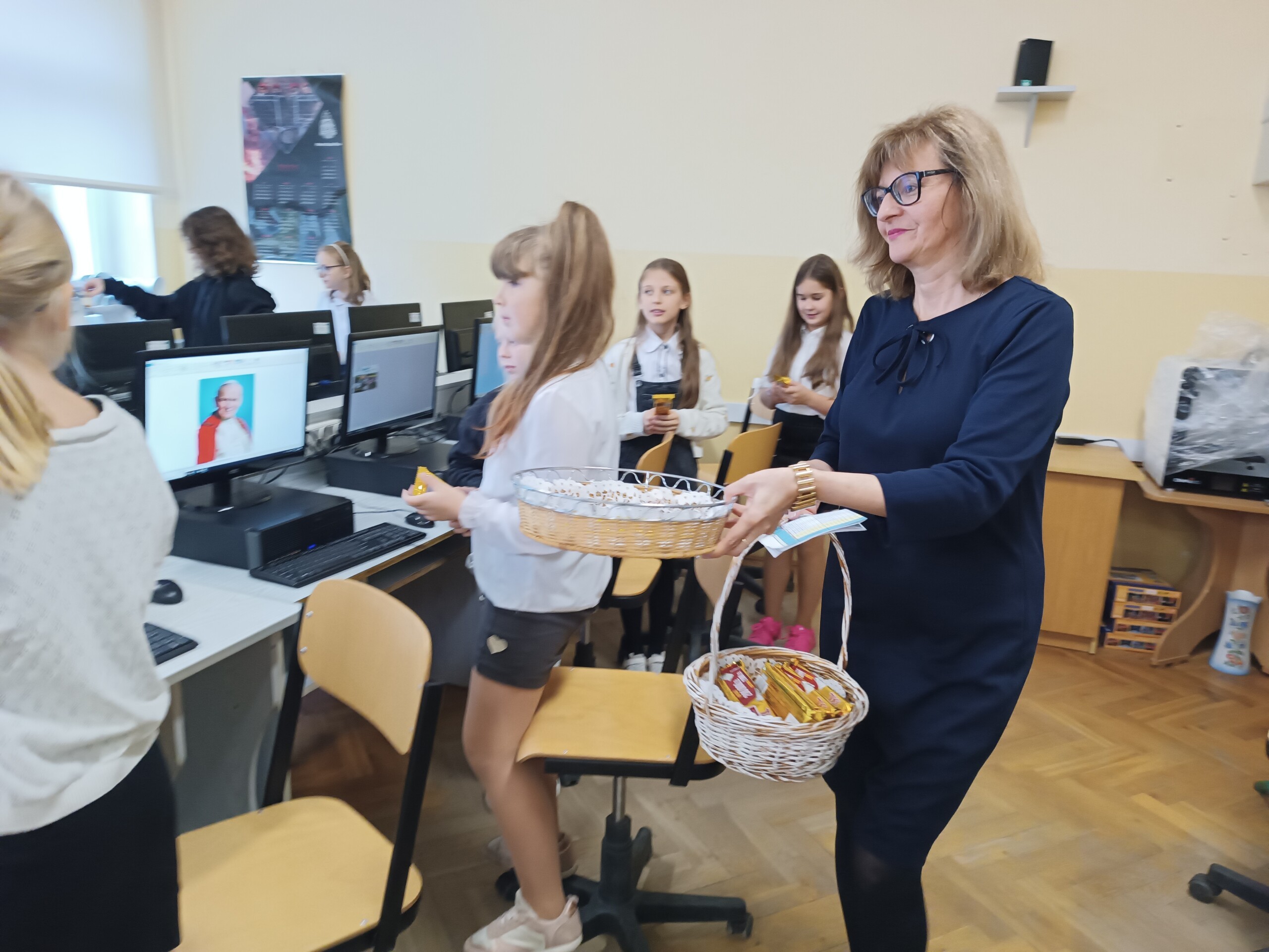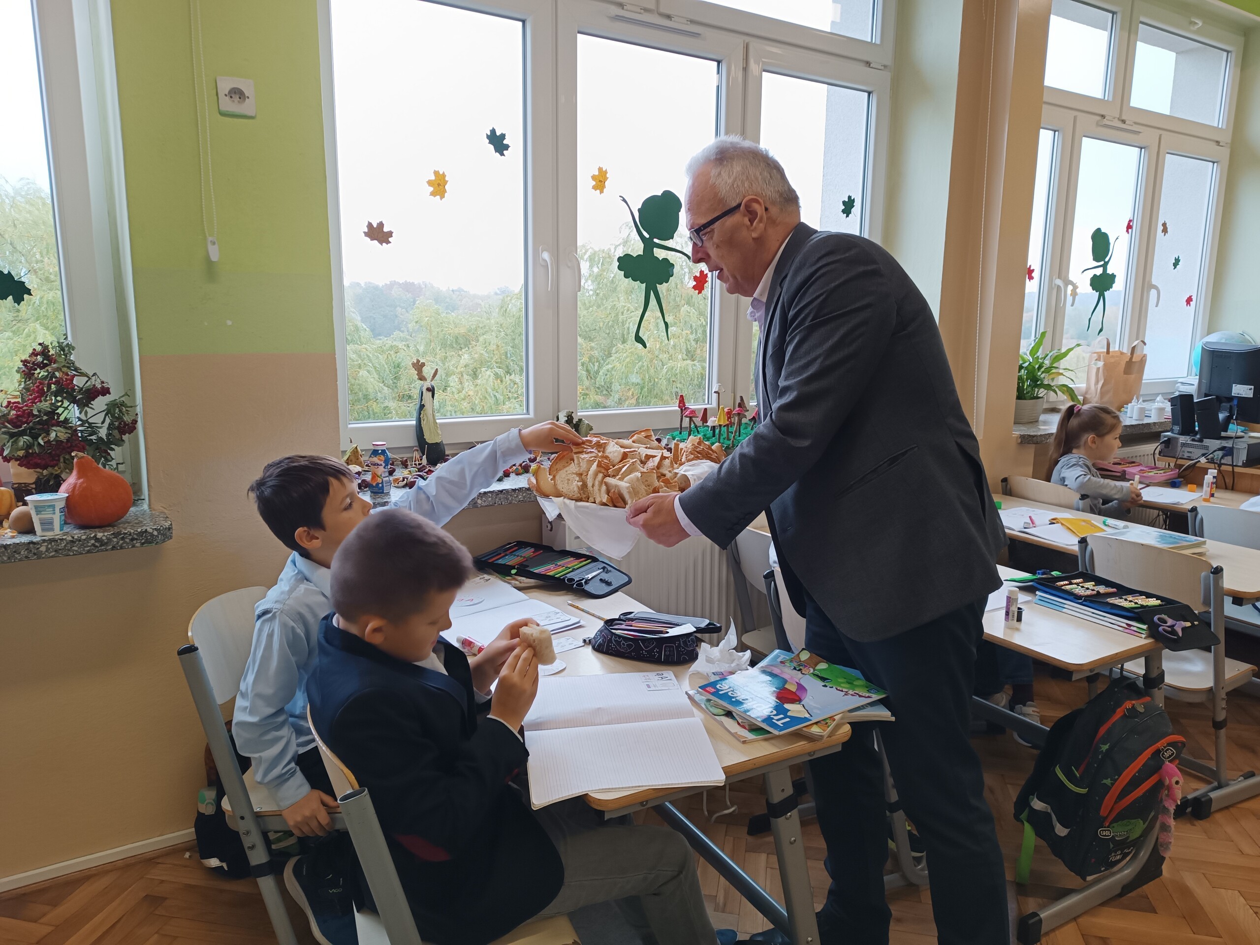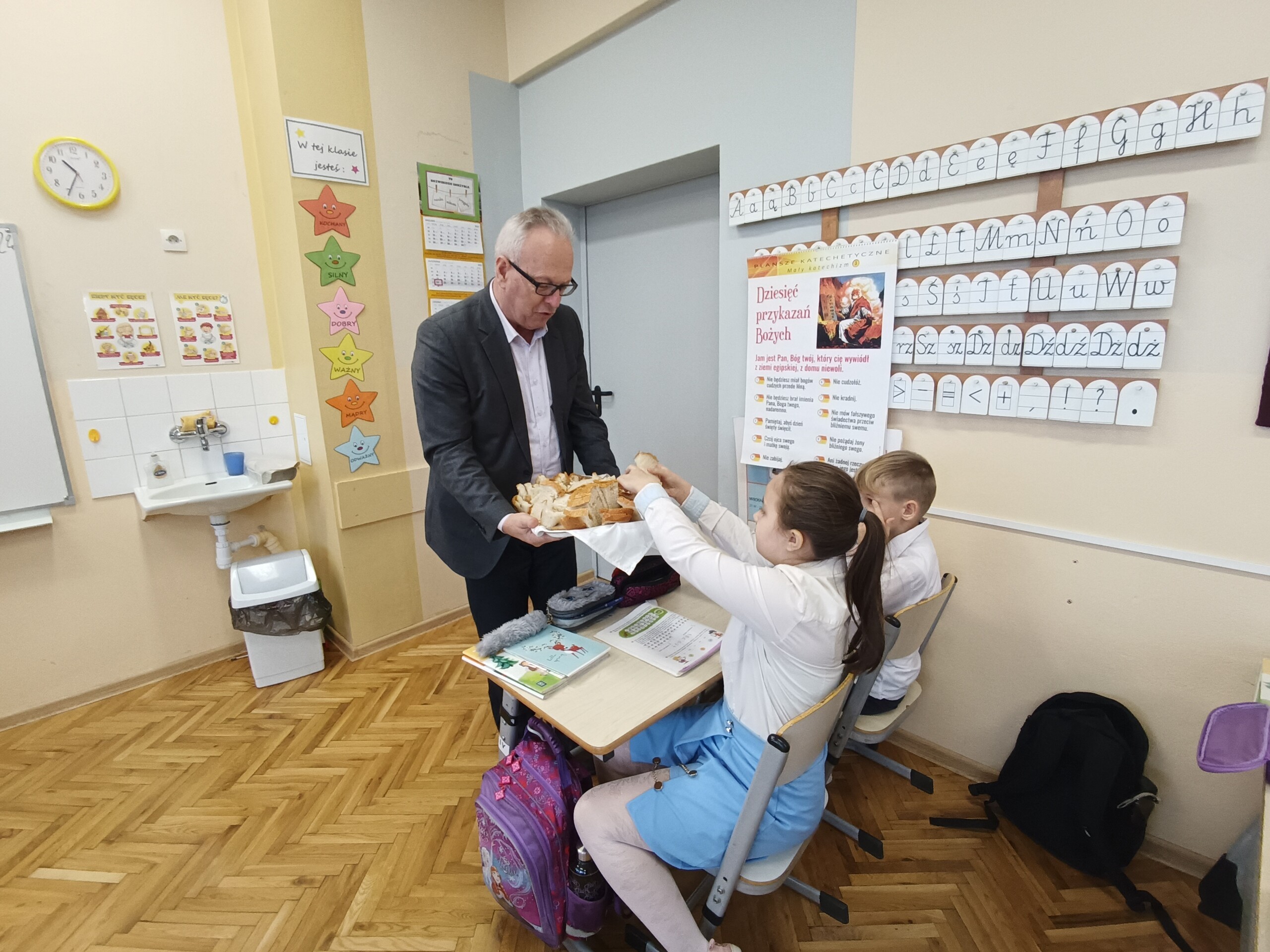 Miłym akcentem tego dnia było spożycie chleba, przez całą społeczność szkolną, który był składany podczas Mszy św. na ołtarzu pańskim. Pan dyrektor częstował chlebem, pani wicedyrektor wręczała słodkie batoniki ufundowane przez księdza proboszcza Janusz Górala, a ksiądz proboszcz wręczał każdemu obrazek z wizerunkiem Papieża Świętego Jana Pawła II.