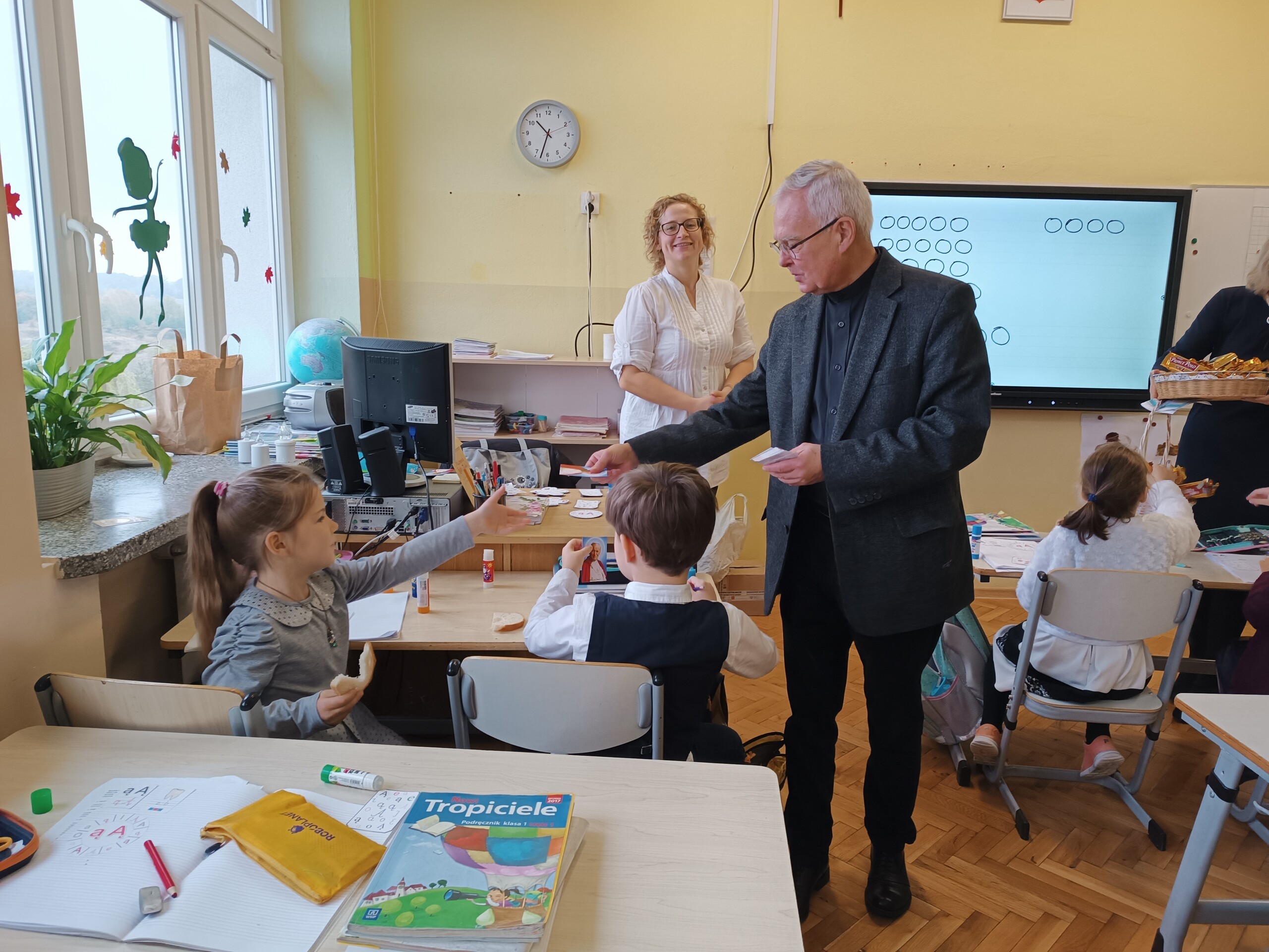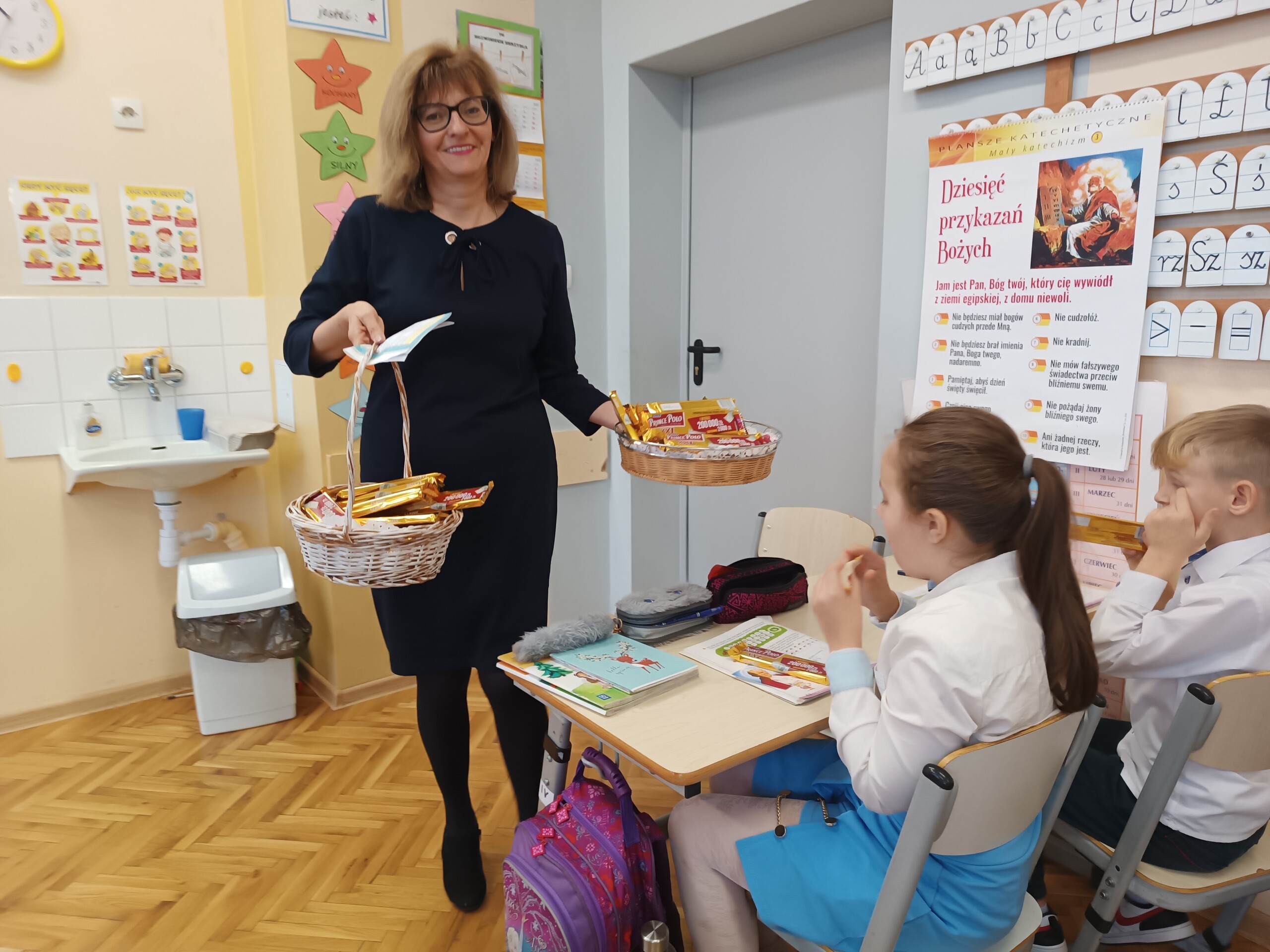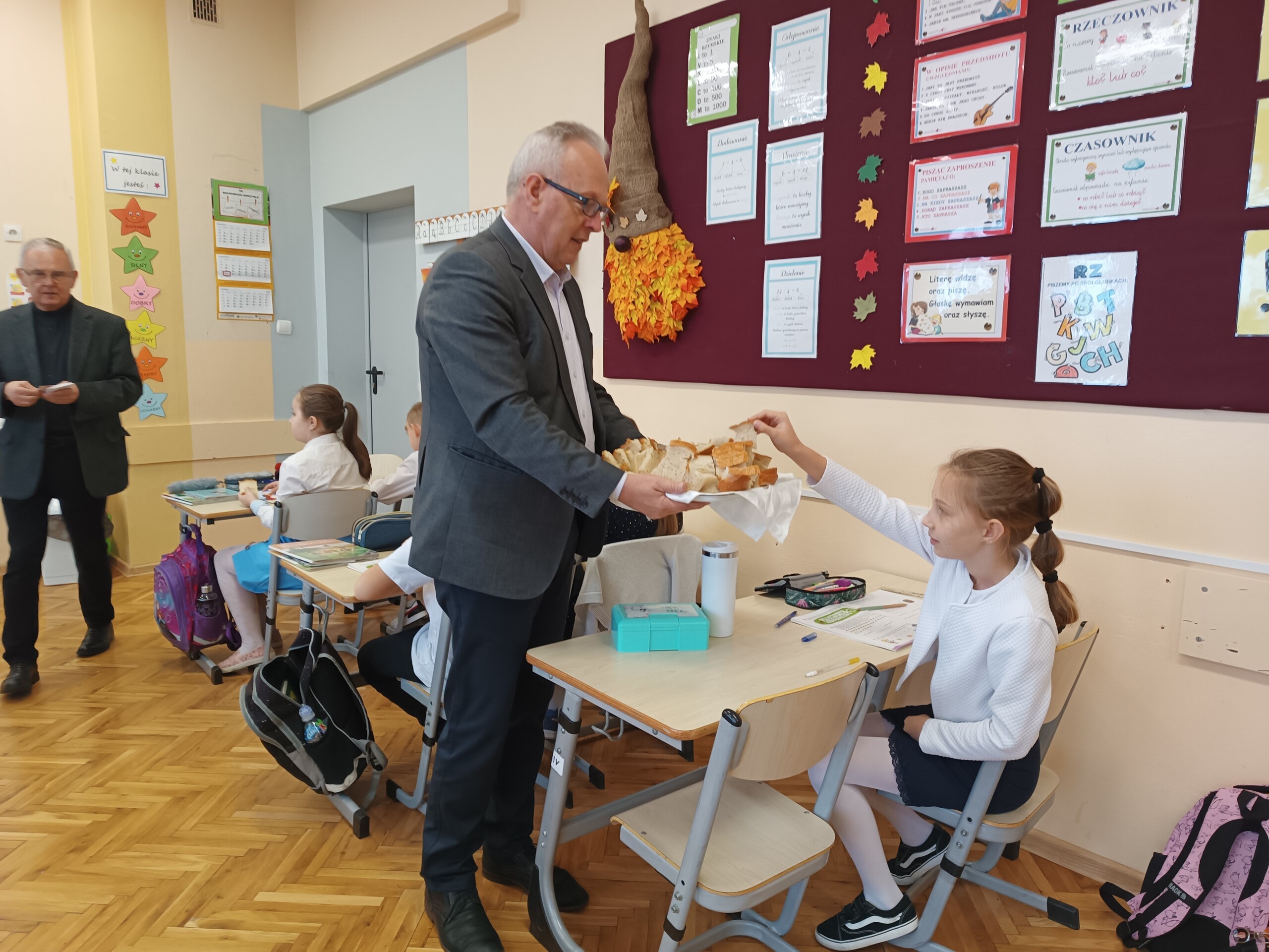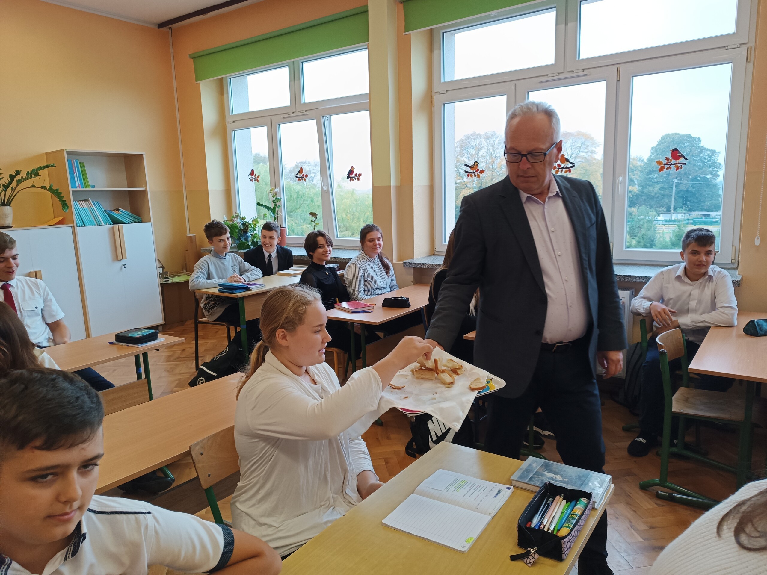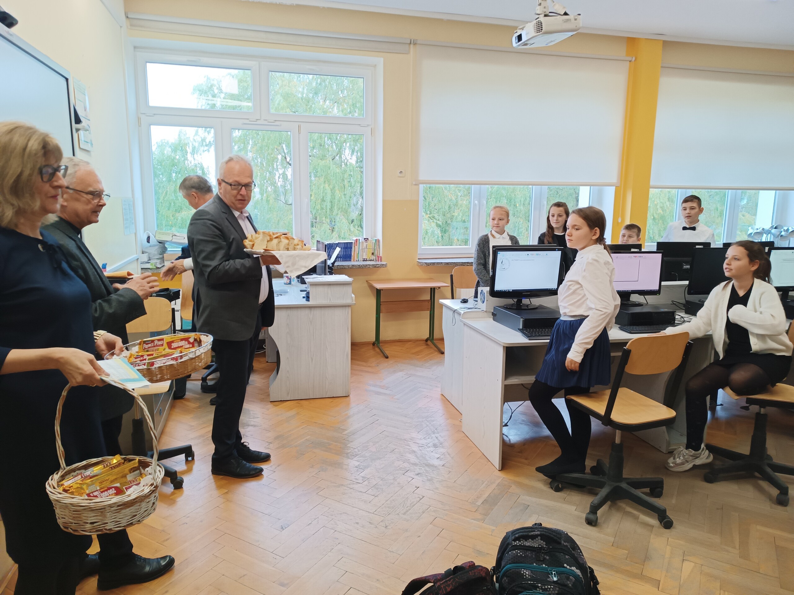 Miłym akcentem tego dnia było spożycie chleba, przez całą społeczność szkolną, który był składany podczas Mszy św. na ołtarzu pańskim. Pan dyrektor częstował chlebem, pani wicedyrektor wręczała słodkie batoniki ufundowane przez księdza proboszcza Janusz Górala, a ksiądz proboszcz wręczał każdemu obrazek z wizerunkiem Papieża Świętego Jana Pawła II.