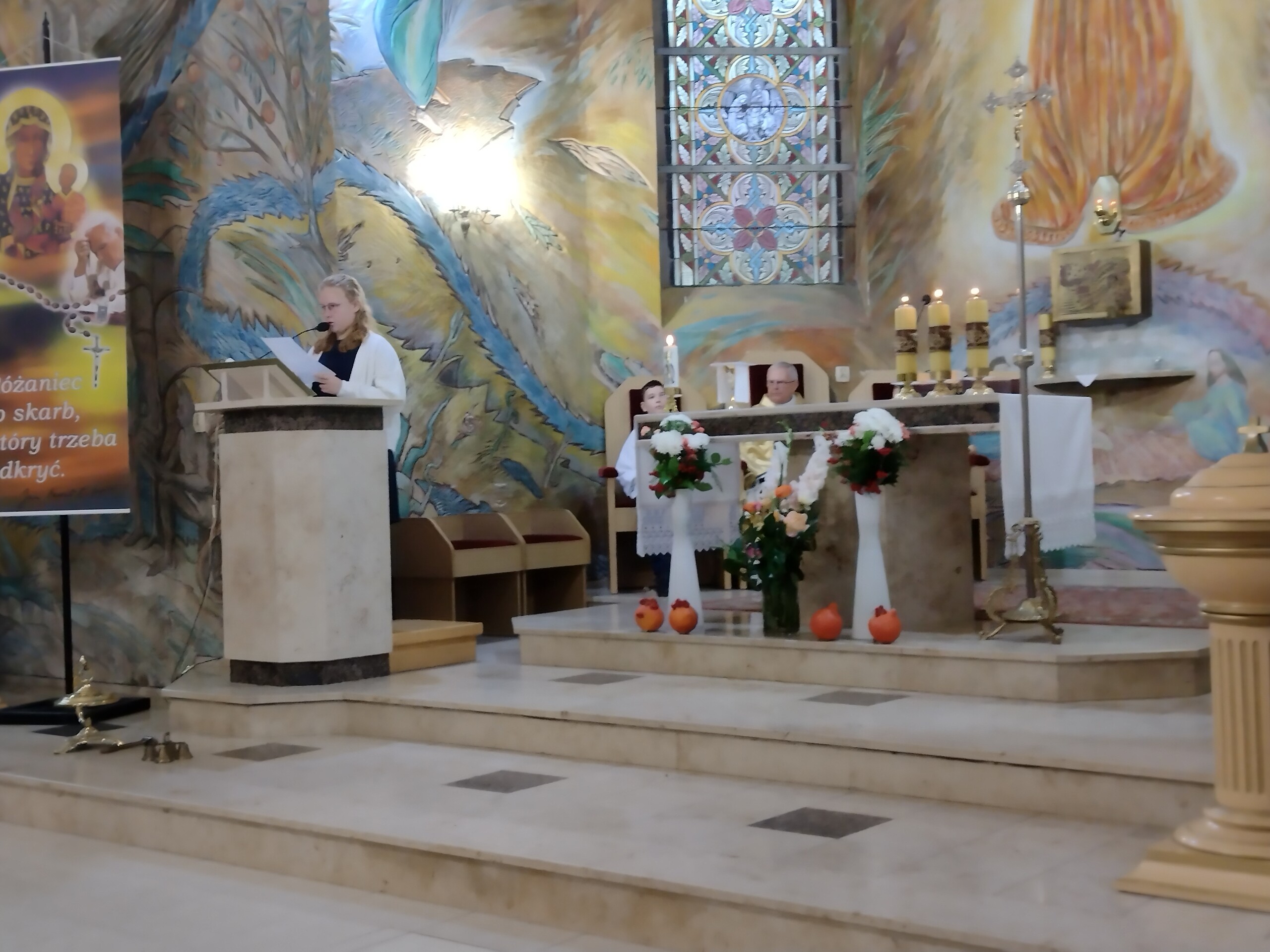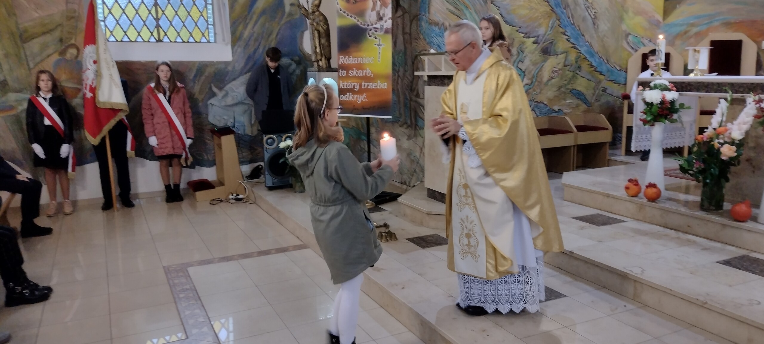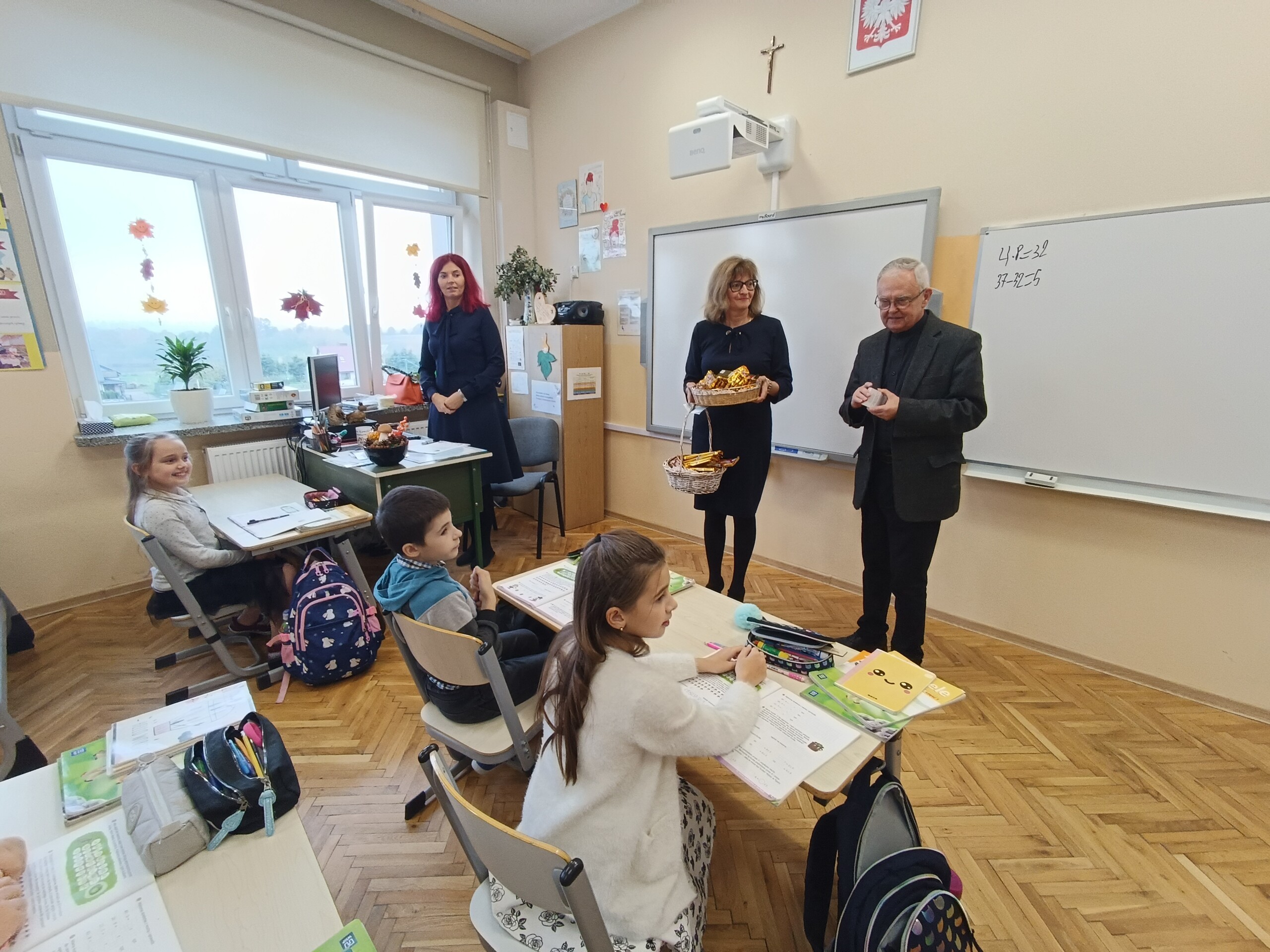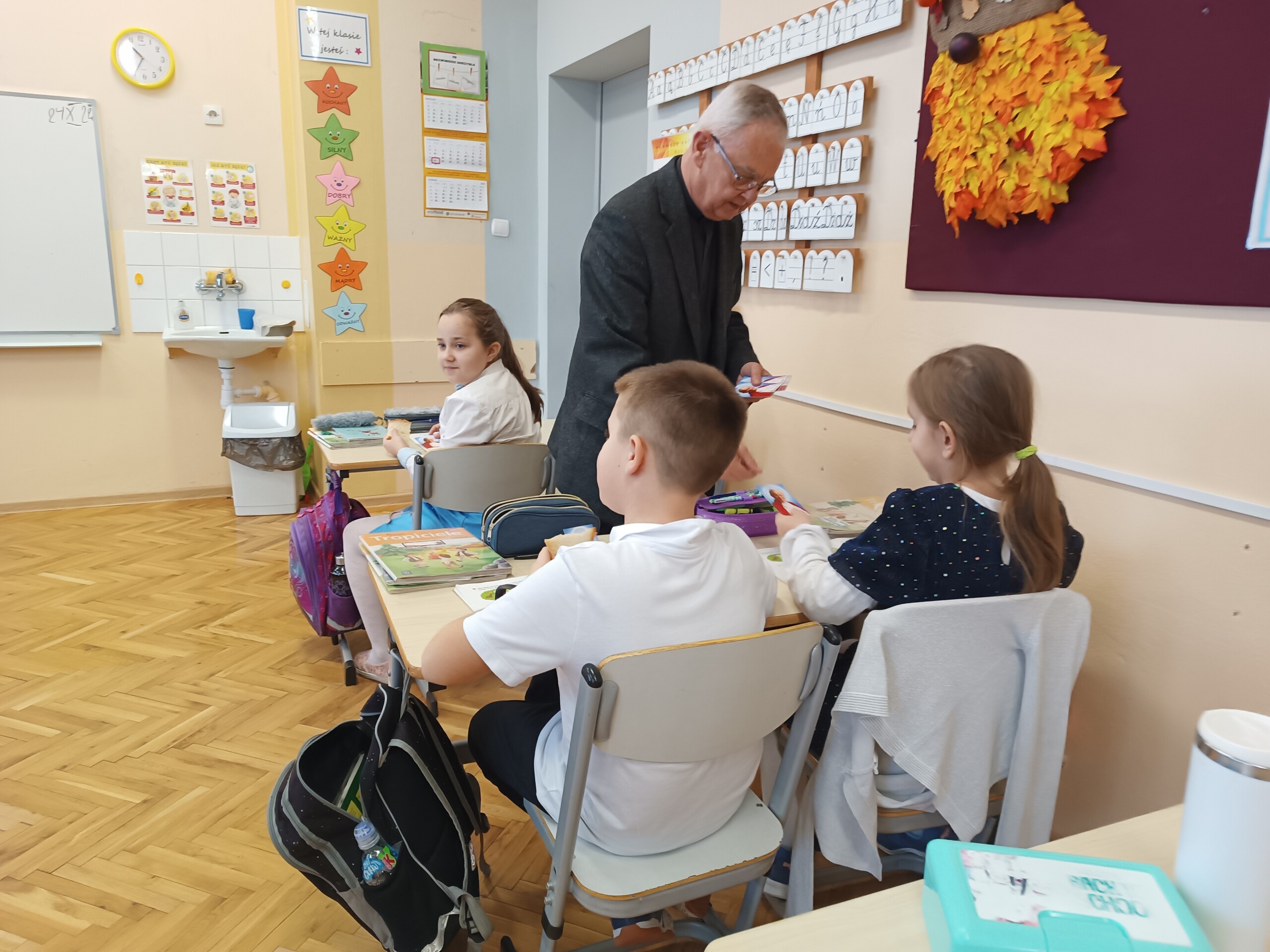 Miłym akcentem tego dnia było spożycie chleba, przez całą społeczność szkolną, który był składany podczas Mszy św. na ołtarzu pańskim. Pan dyrektor częstował chlebem, pani wicedyrektor wręczała słodkie batoniki ufundowane przez księdza proboszcza Janusz Górala, a ksiądz proboszcz wręczał każdemu obrazek z wizerunkiem Papieża Świętego Jana Pawła II.
