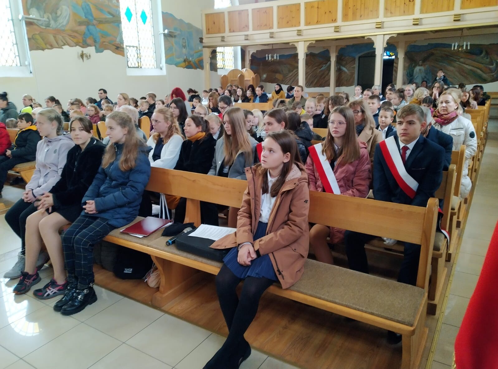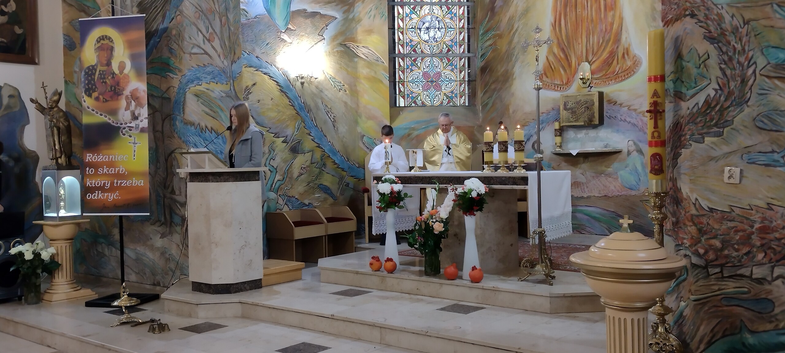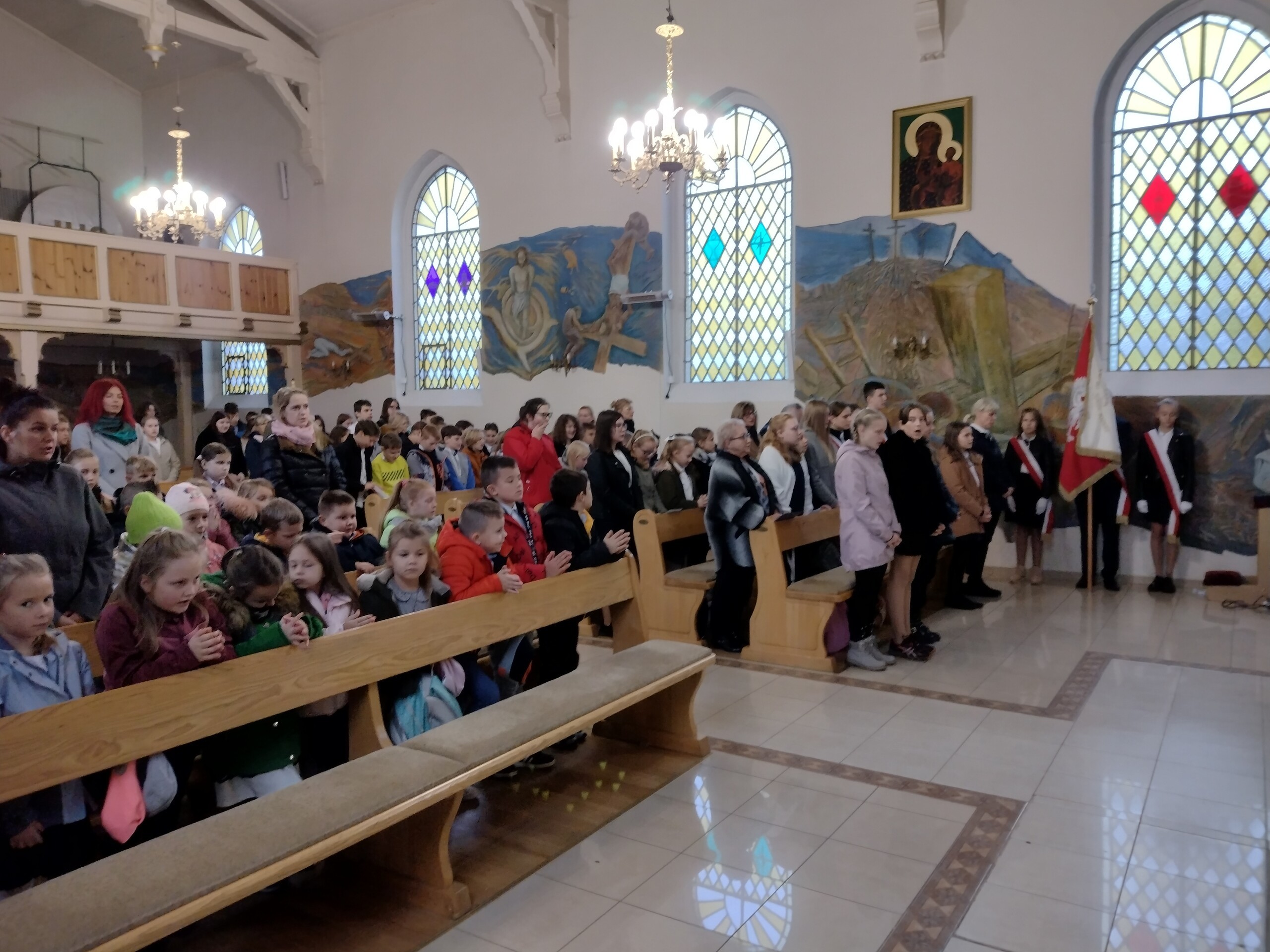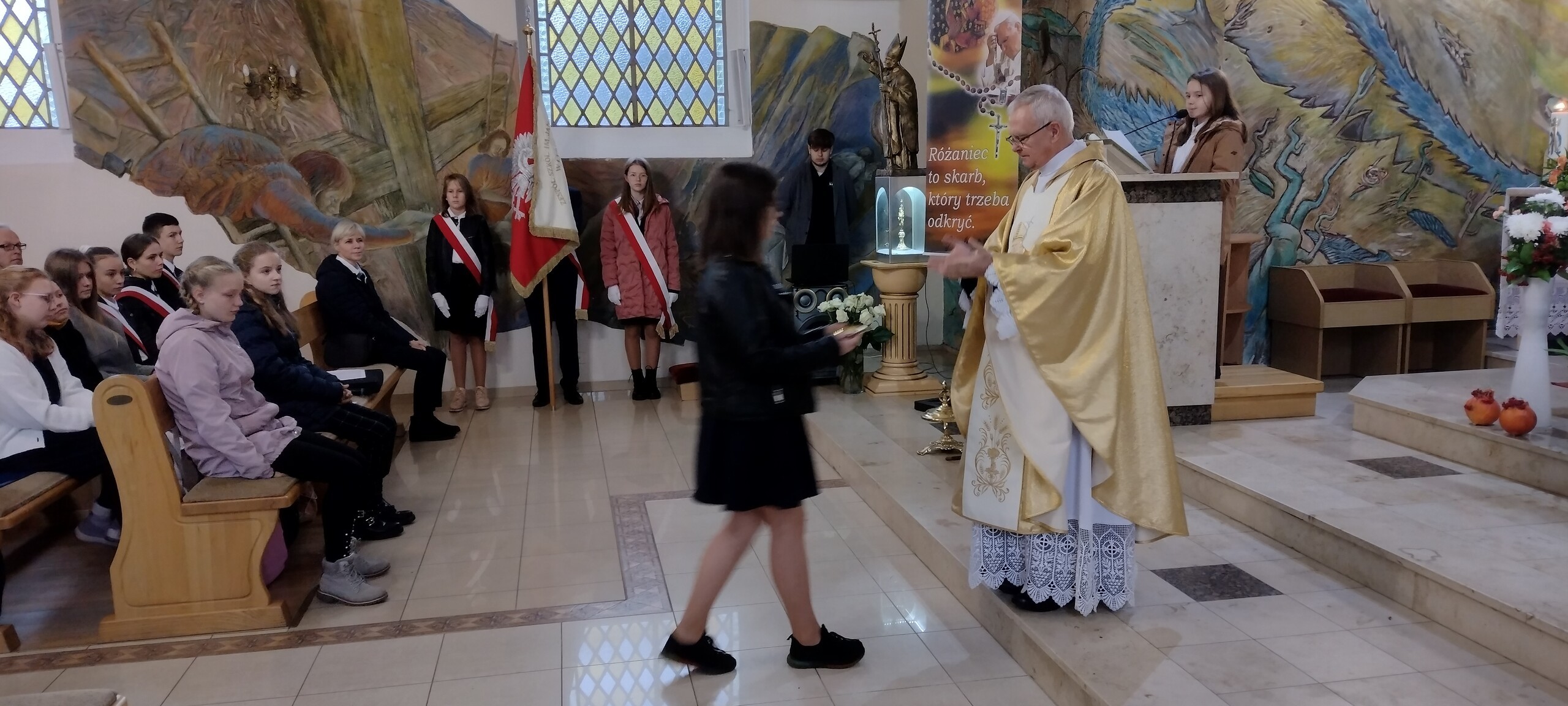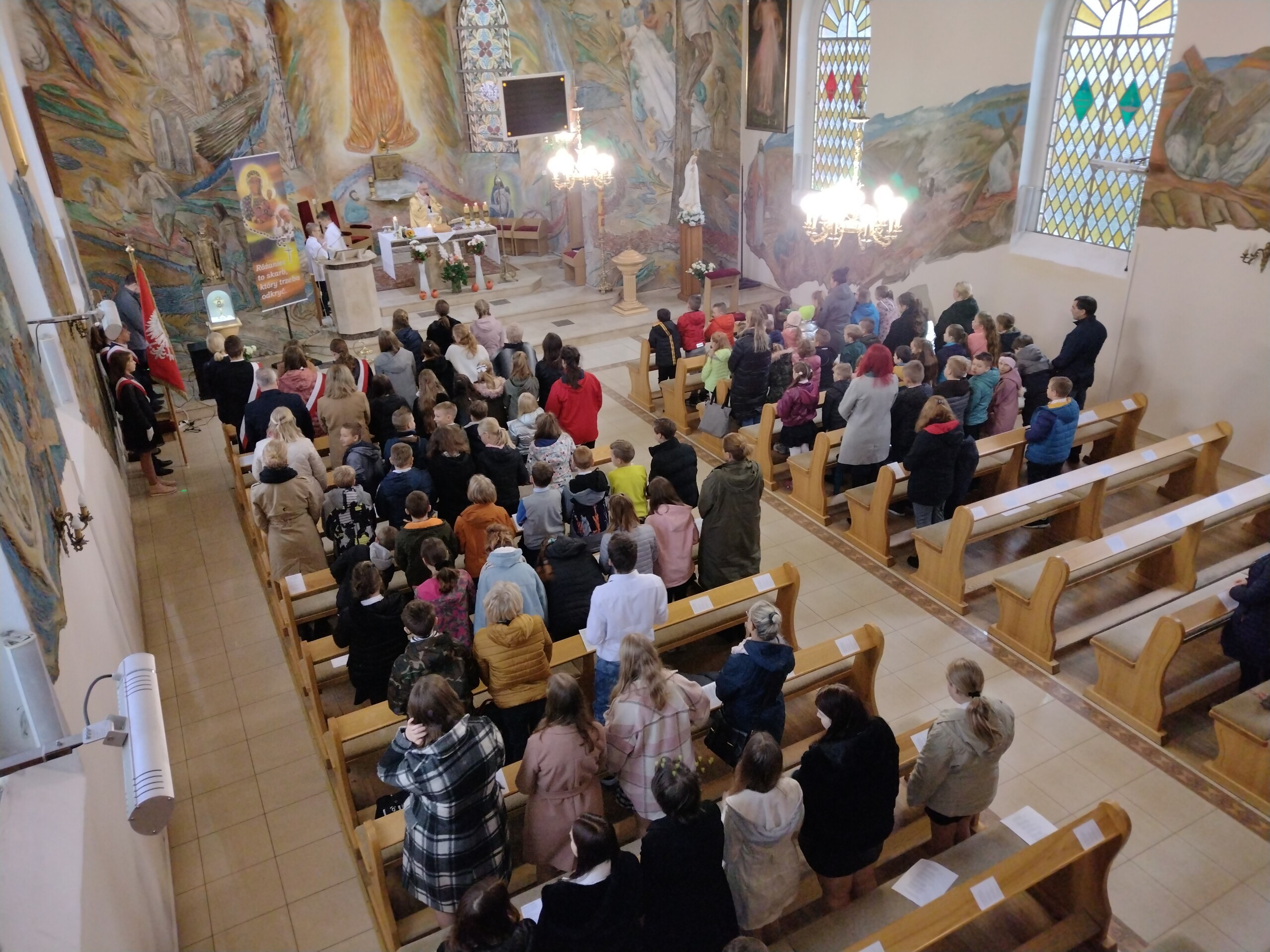 Od szesnastu lat imię Jana Pawła II nosi zaszczytnie nasza szkoła. Z tej okazji 24 października 2022r. odbyła się w naszym kościele parafialnym pw. Matki Bożej Królowej Polski Msza święta, której przewodniczył ksiądz proboszcz Janusz Góral. Przed Mszą został wprowadzony sztandar szkoły i odśpiewaliśmy hymn szkoły. Uczniowie wzięli czynny udział w Eucharystii czytając modlitwy wiernych, śpiewając psalmy i niosąc dary do stołu pańskiego. Podczas Mszy świętej uczniowie pieśnią i słowem przybliżyli sylwetkę Patrona Szkoły, wprowadzając zebranych w chwilę zadumy nad słowami Ojca Świętego. Na zakończenie Mszy św. zaśpiewaliśmy znaną pieśń „Barkę” jako podziękowanie dla Tego, który zawsze wskazywał drogę ku temu, co piękne i dobre. We Mszy św. wzięli udział rodzice na czele z Przewodniczącą Rady Rodziców panią Emilią Stanuch , parafianie oraz pracownicy szkoły. W tym dniu uczniowie klasy VI trzymali wartę honorową pod tablicą pamiątkową oraz wszystkie klasy zapaliły znicze pod portretem naszego Patrona Świętego Jana Pawła II.