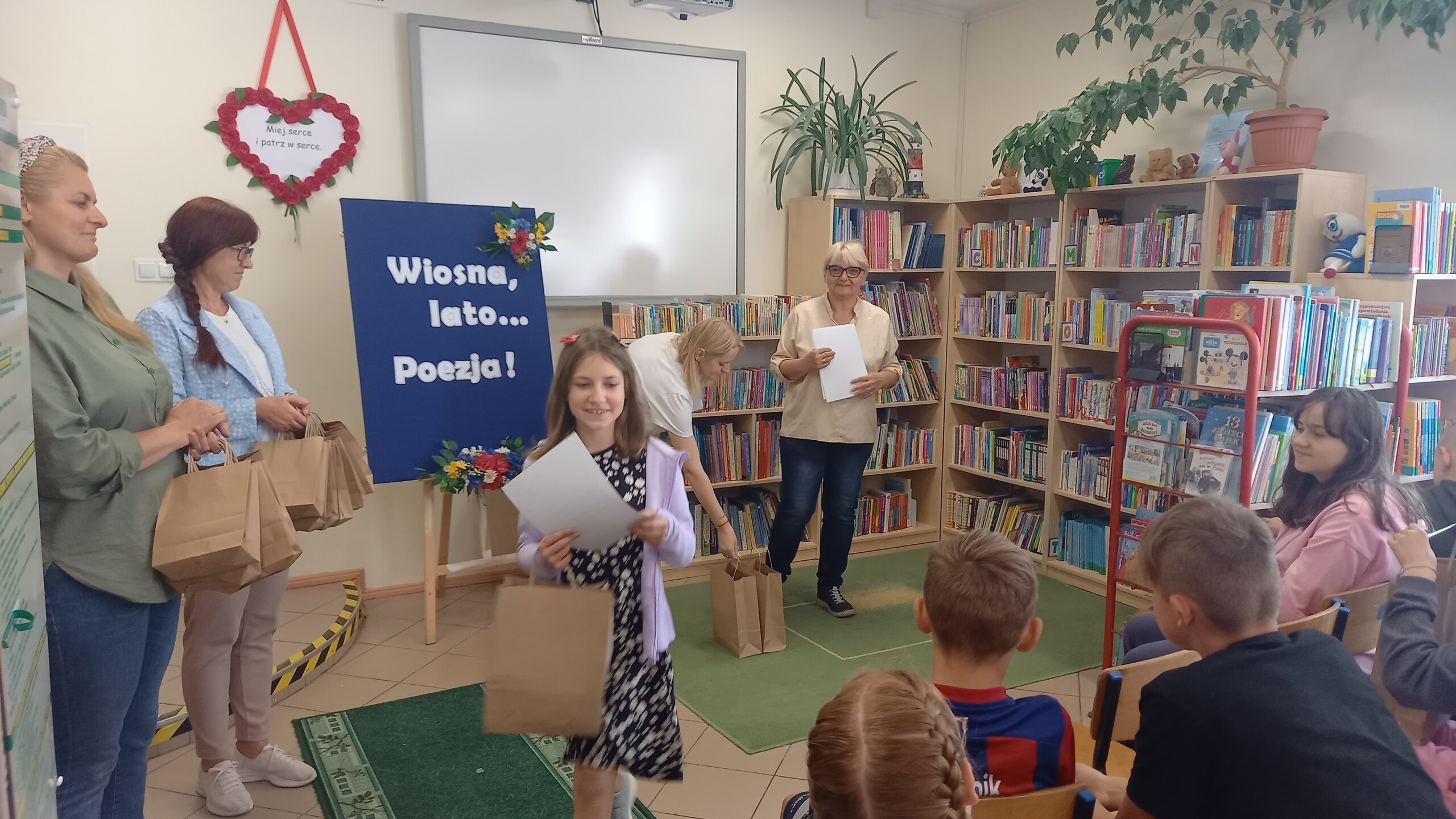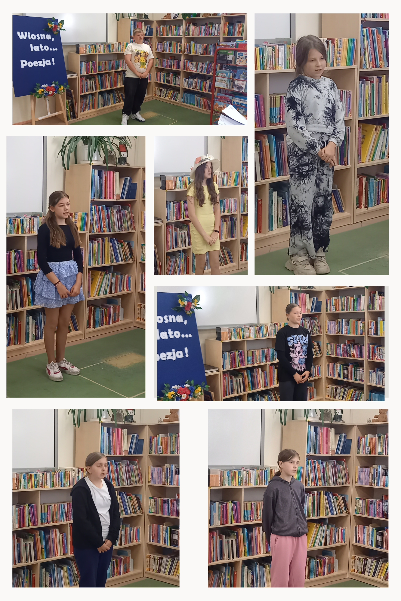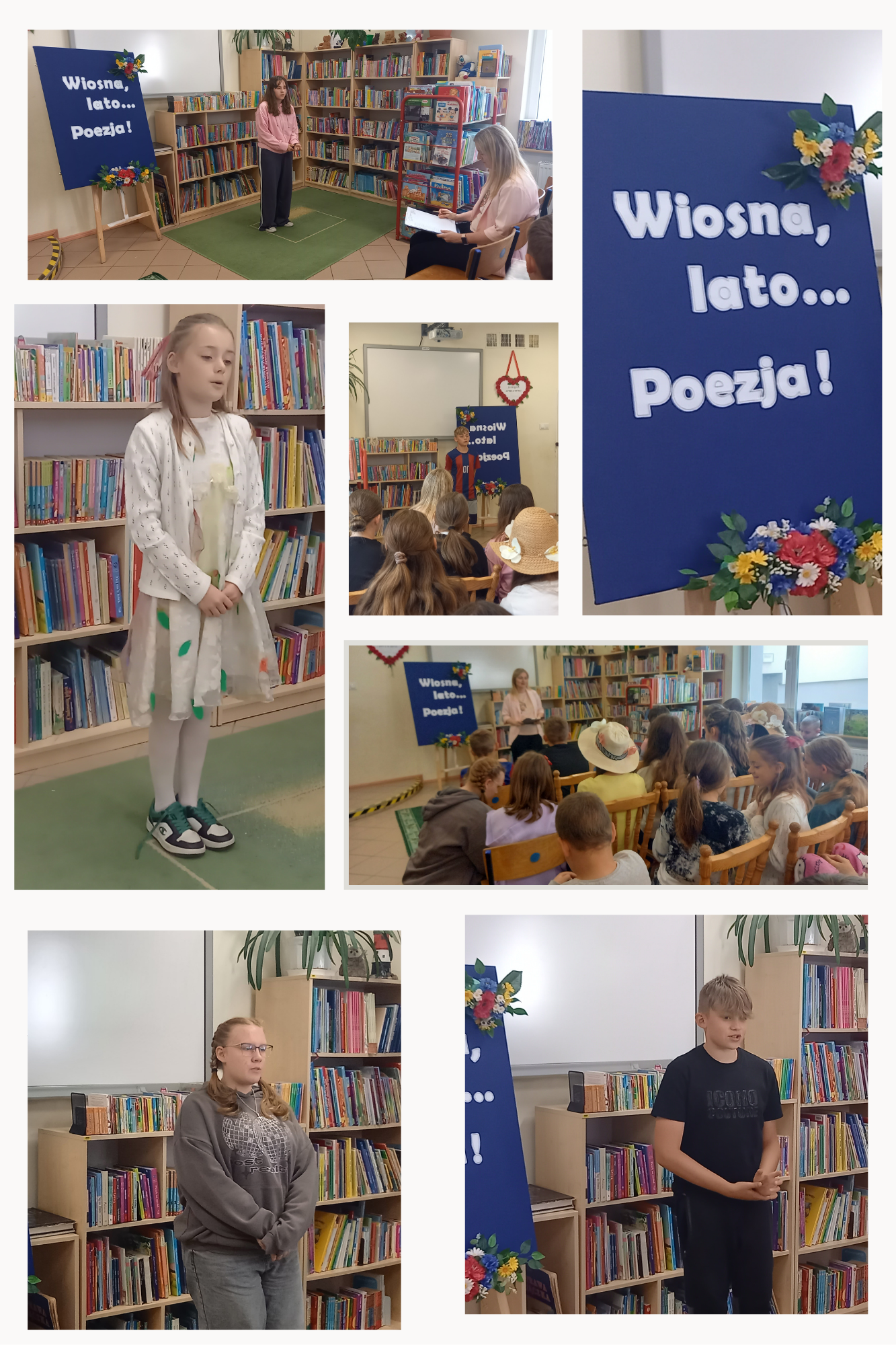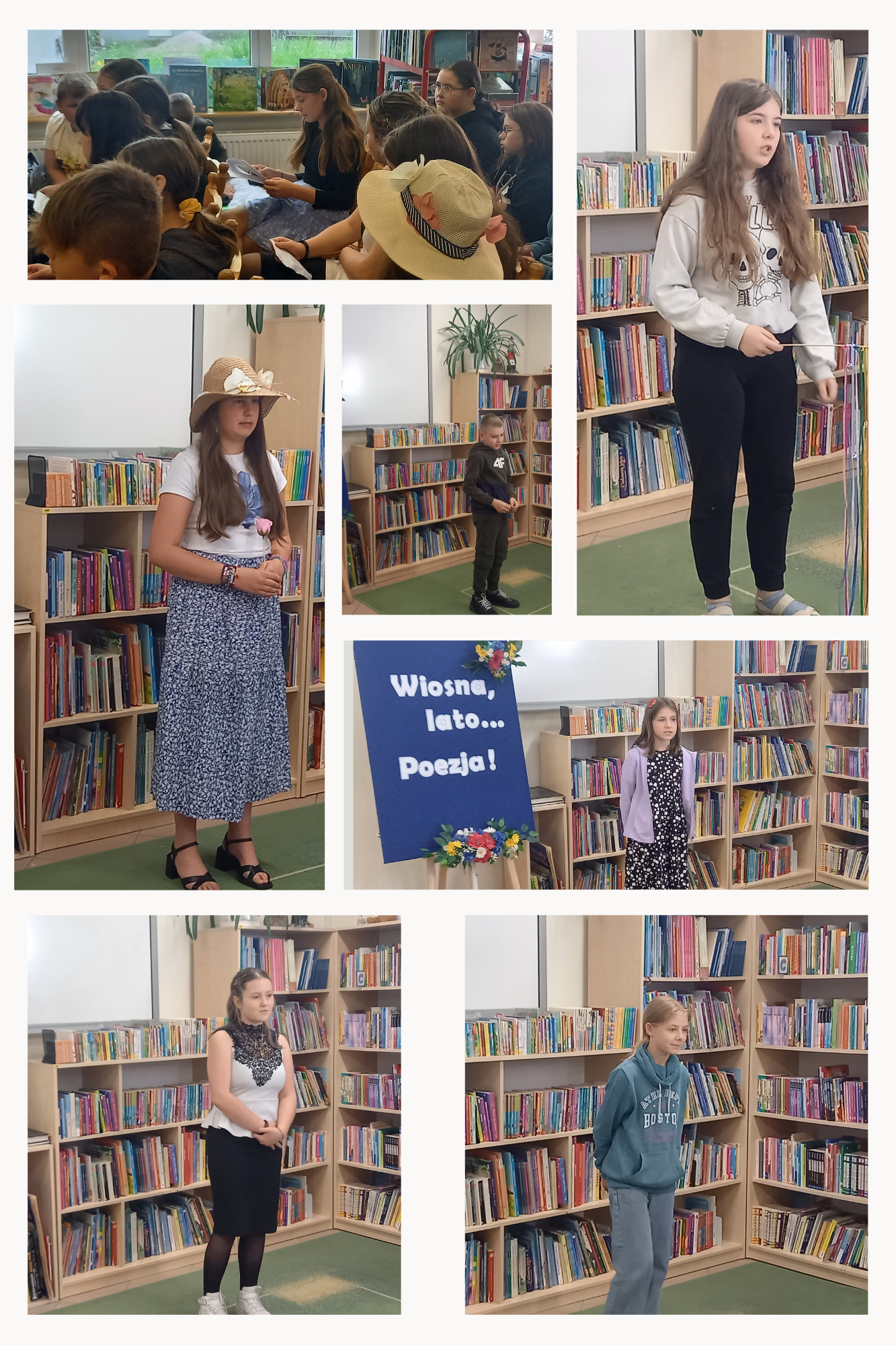 12czerwca 2025 roku w bibliotece szkolnej odbył się Szkolny Konkurs Recytatorski „Wiosna i lato wierszem malowane”. Uczniowie z klas 4-8 recytowali wiersze polskich poetów o tematyce wiosennej i letniej. Konkurs miał na celu rozwijanie wrażliwości na słowo poetyckie oraz promowanie talentu dzieci. Jury oceniało dobór repertuaru, interpretację i prezentację wiersza oraz opanowanie pamięciowe tekstu.