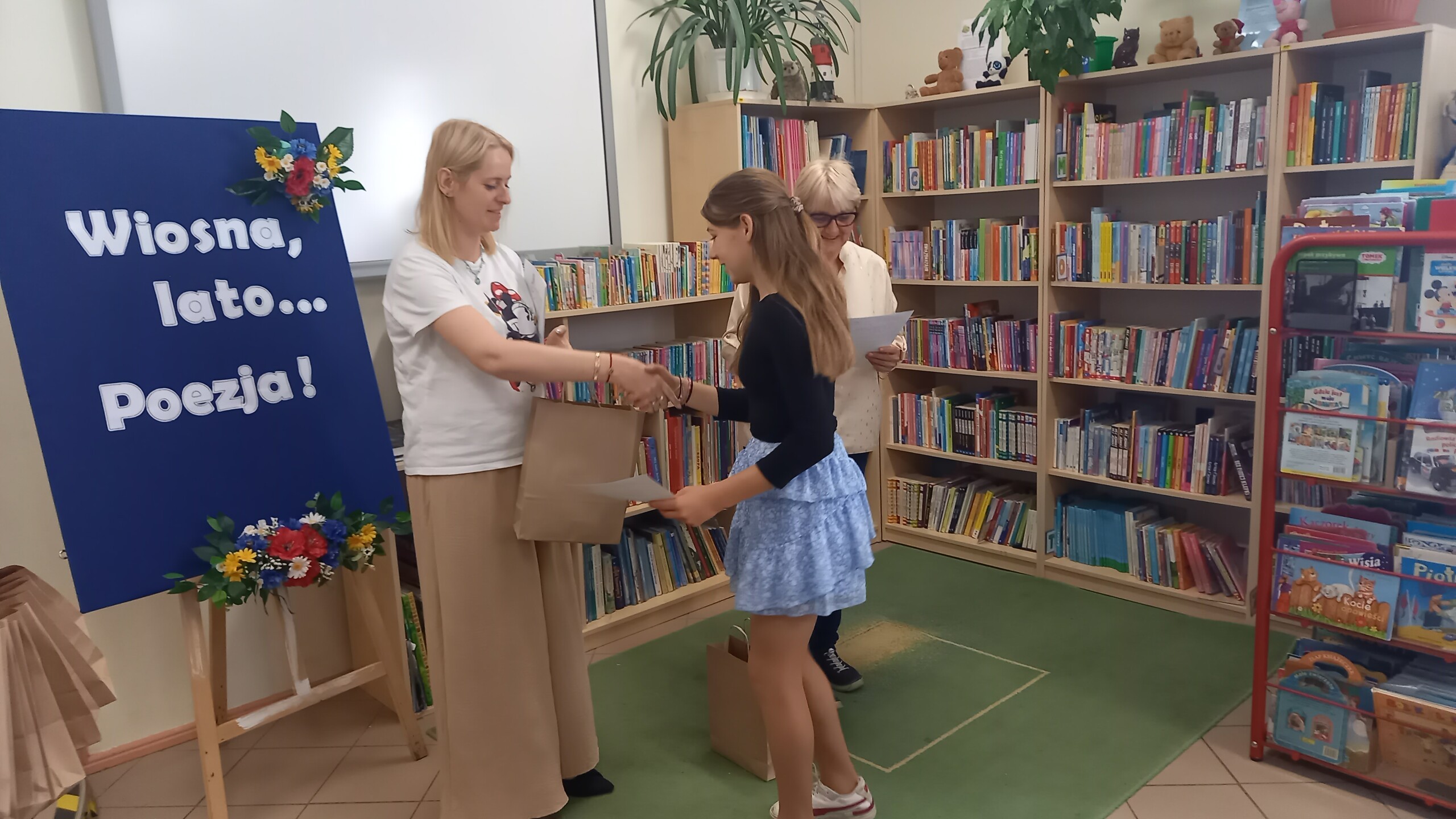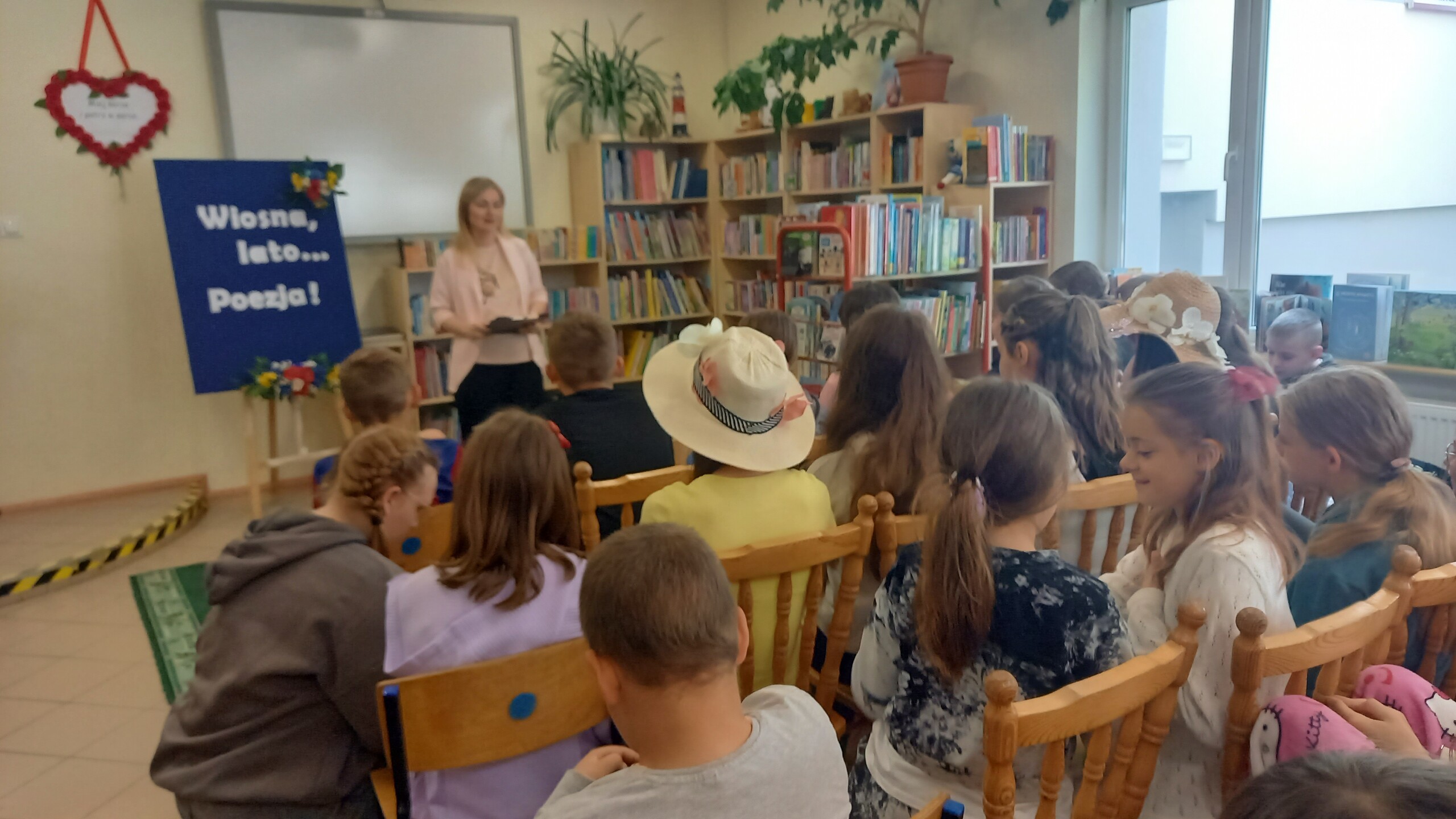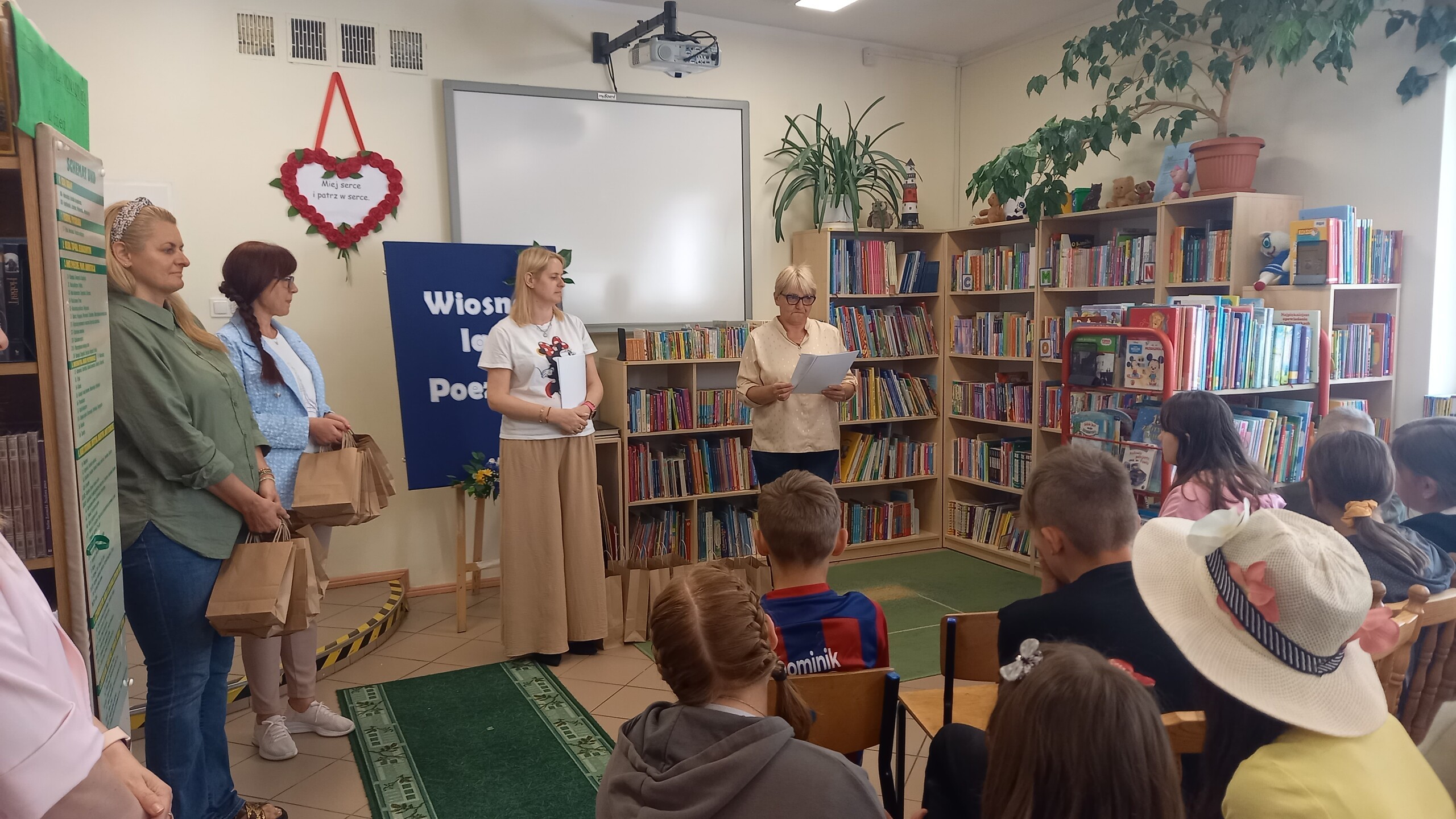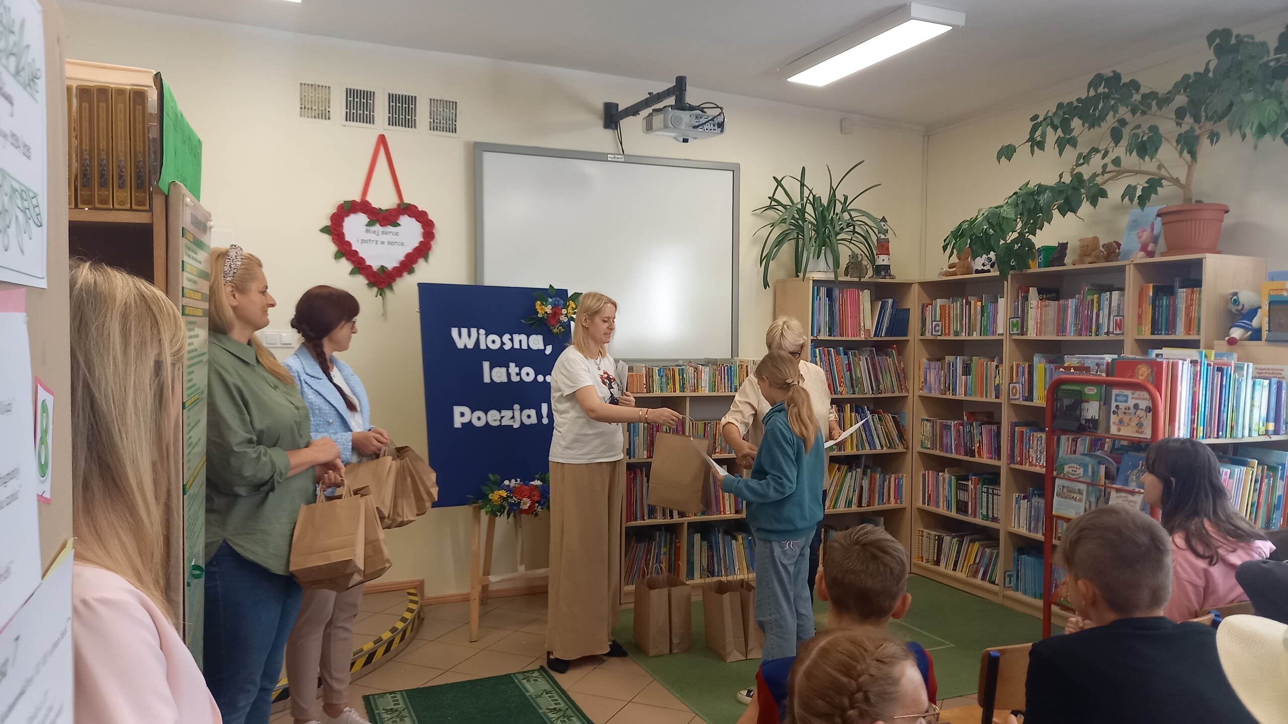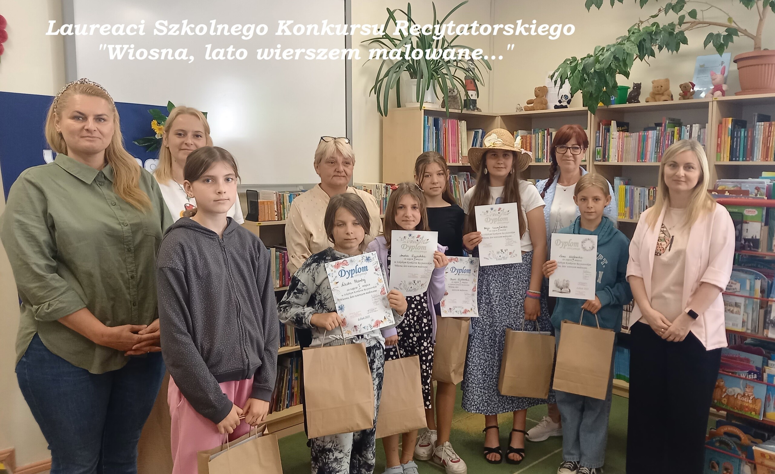 12czerwca 2025 roku w bibliotece szkolnej odbył się Szkolny Konkurs Recytatorski „Wiosna i lato wierszem malowane”. Uczniowie z klas 4-8 recytowali wiersze polskich poetów o tematyce wiosennej i letniej. Konkurs miał na celu rozwijanie wrażliwości na słowo poetyckie oraz promowanie talentu dzieci. Jury oceniało dobór repertuaru, interpretację i prezentację wiersza oraz opanowanie pamięciowe tekstu.
