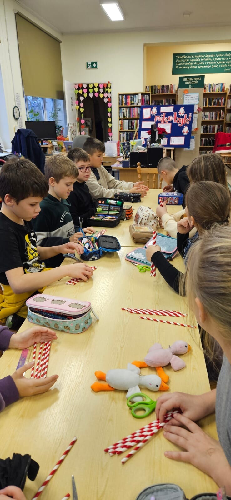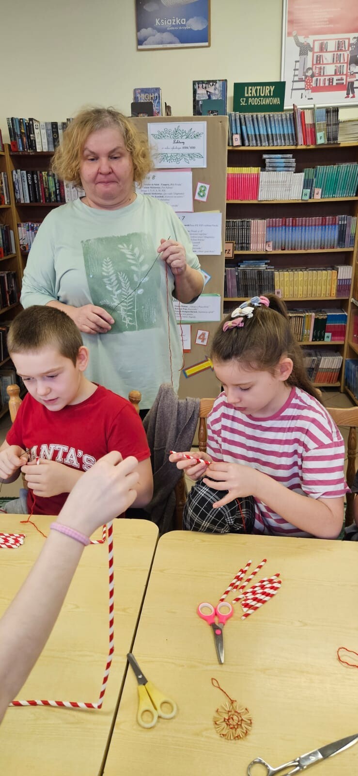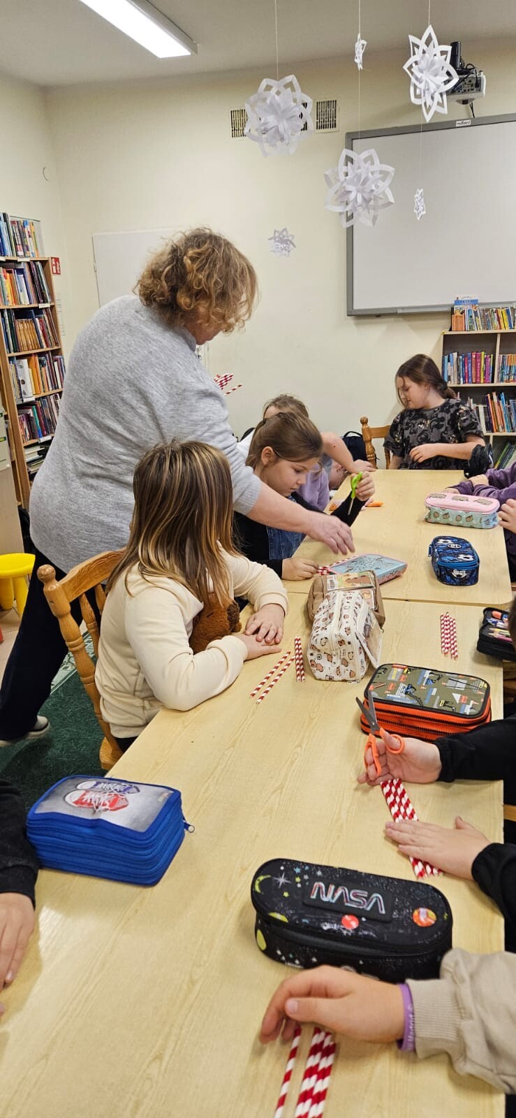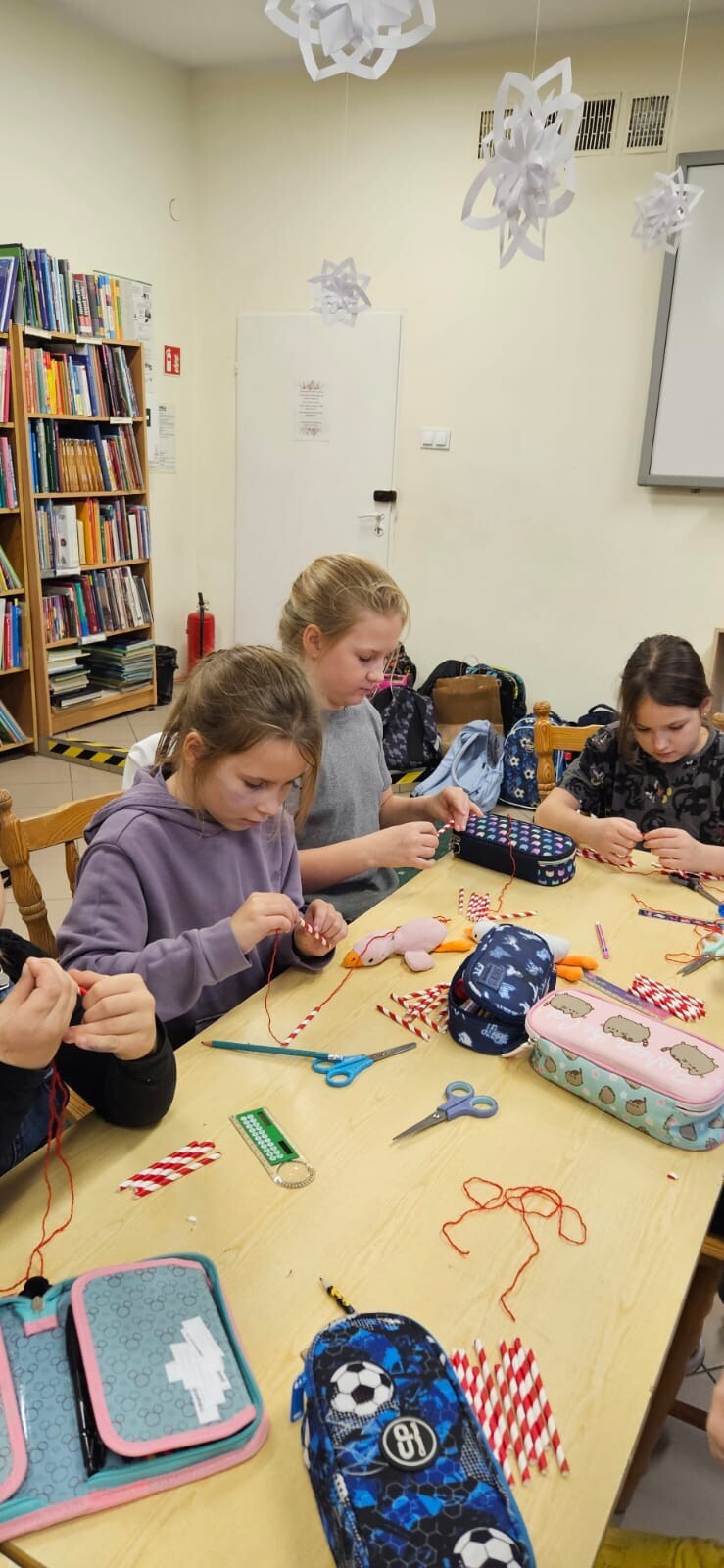 Uczniowie klasy IIa, IIb i III w bibliotece szkolnej uczestniczyli w warsztatach, podczas których samodzielnie wykonali gwiazdki ze słomek papierowych oraz łańcuchy z kolorowej bibuły i słomek.