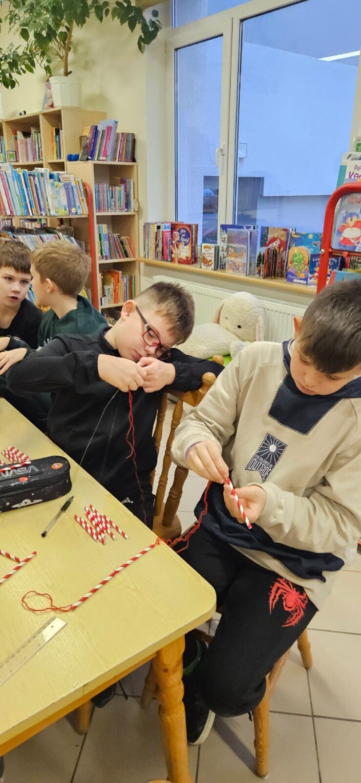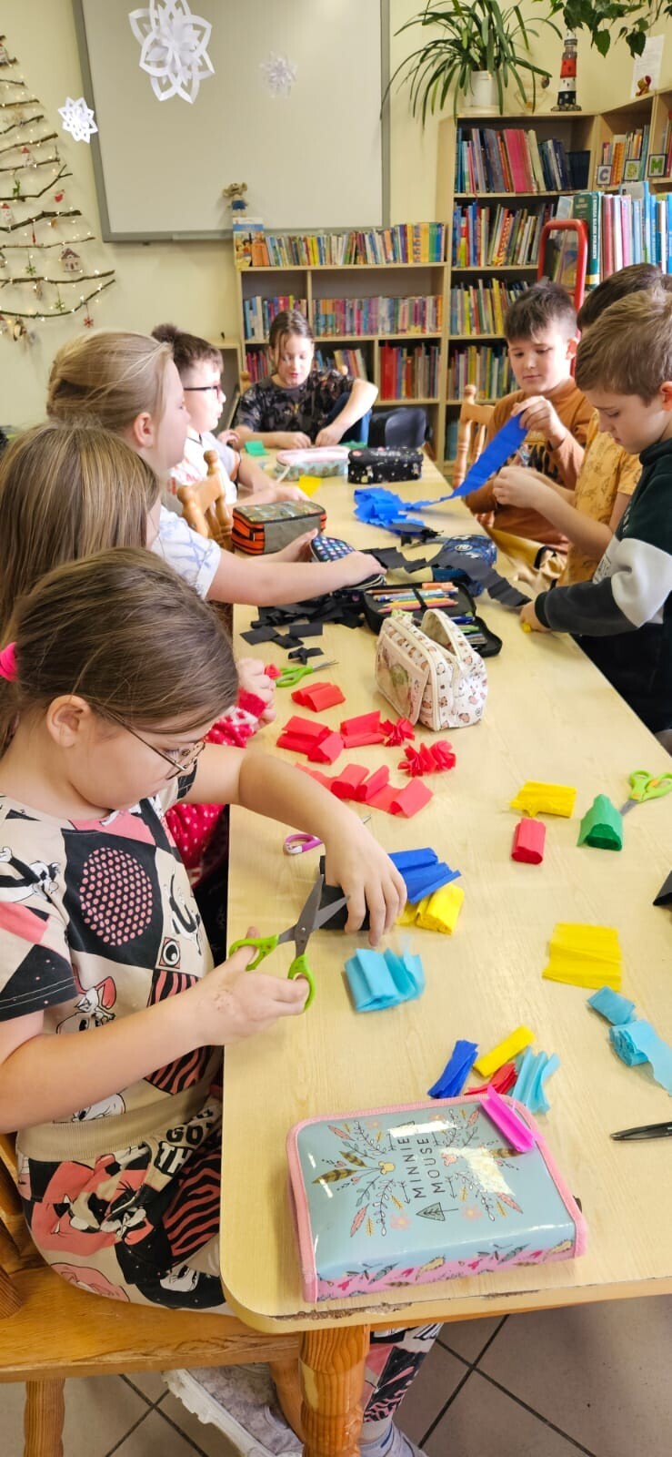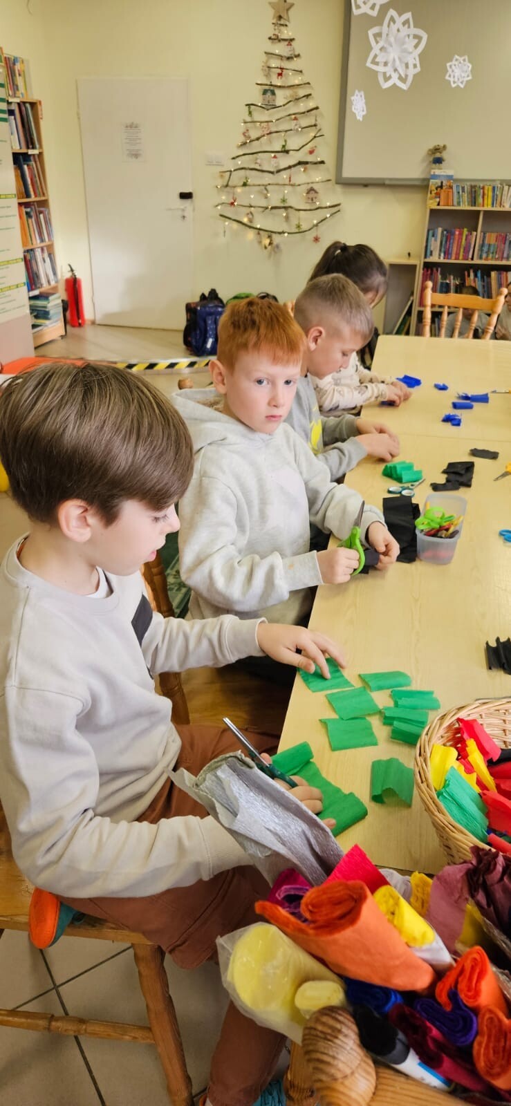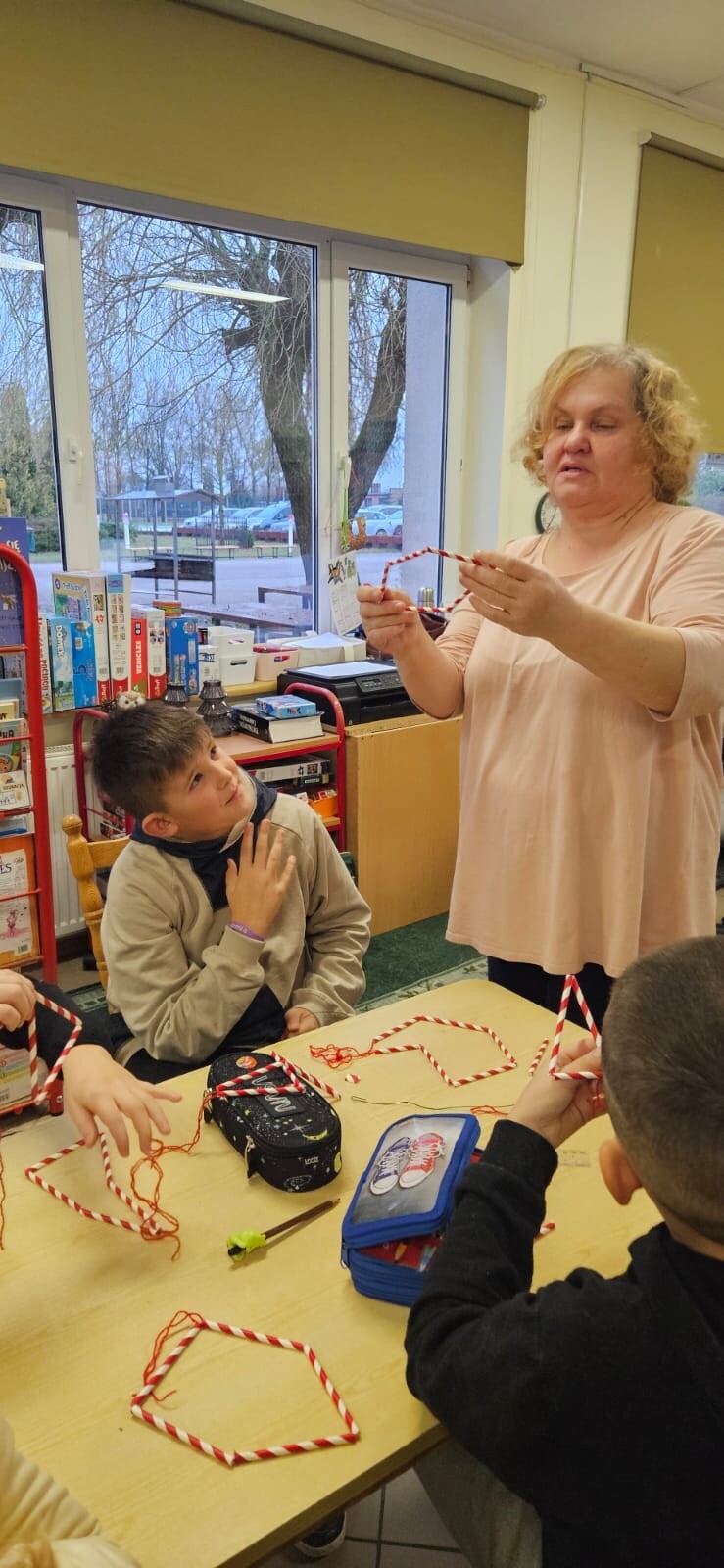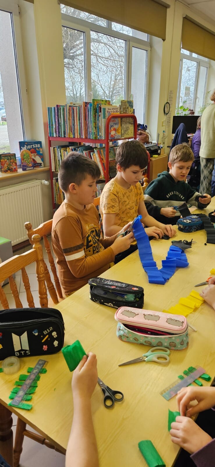 Uczniowie klasy IIa, IIb i III w bibliotece szkolnej uczestniczyli w warsztatach, podczas których samodzielnie wykonali gwiazdki ze słomek papierowych oraz łańcuchy z kolorowej bibuły i słomek.