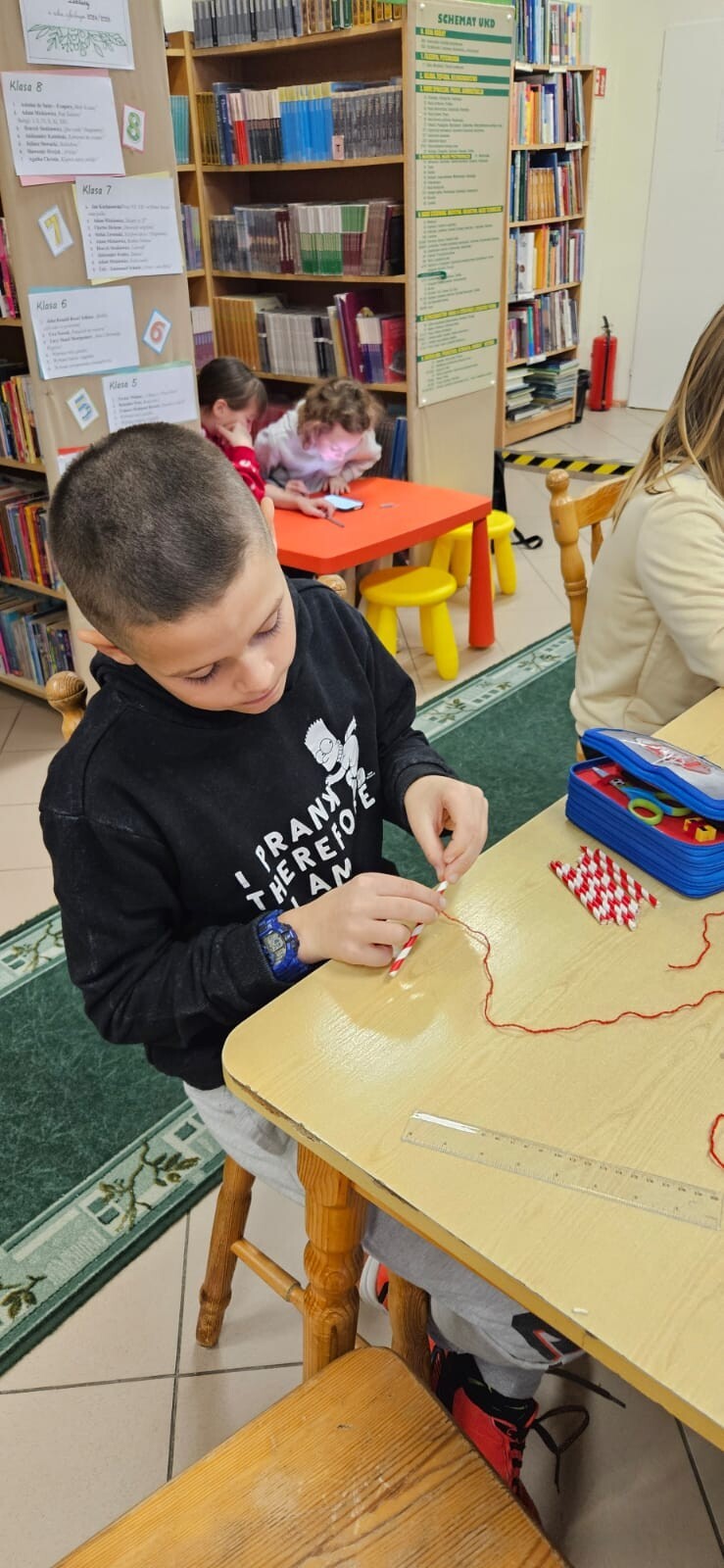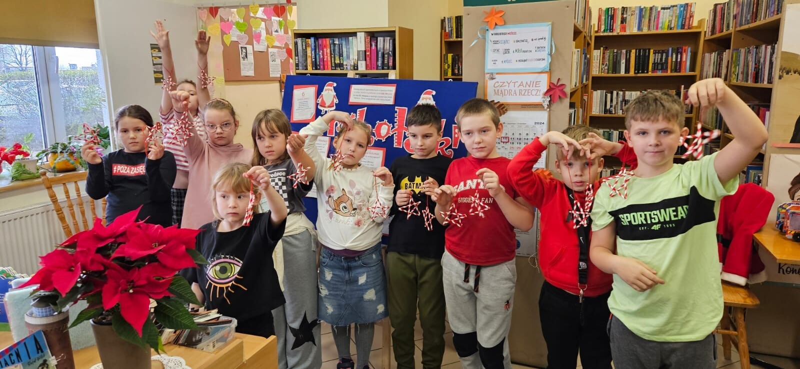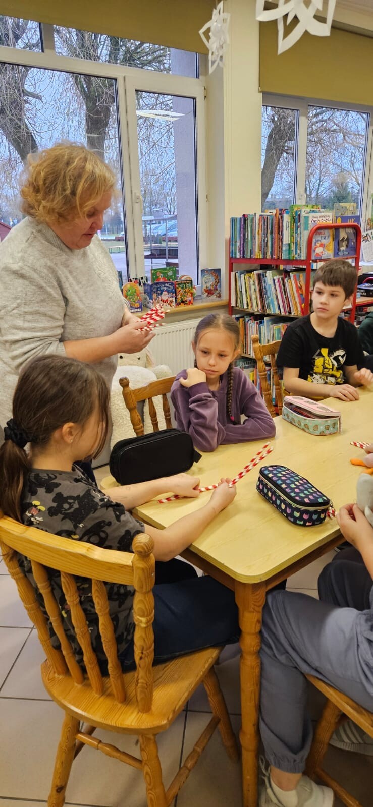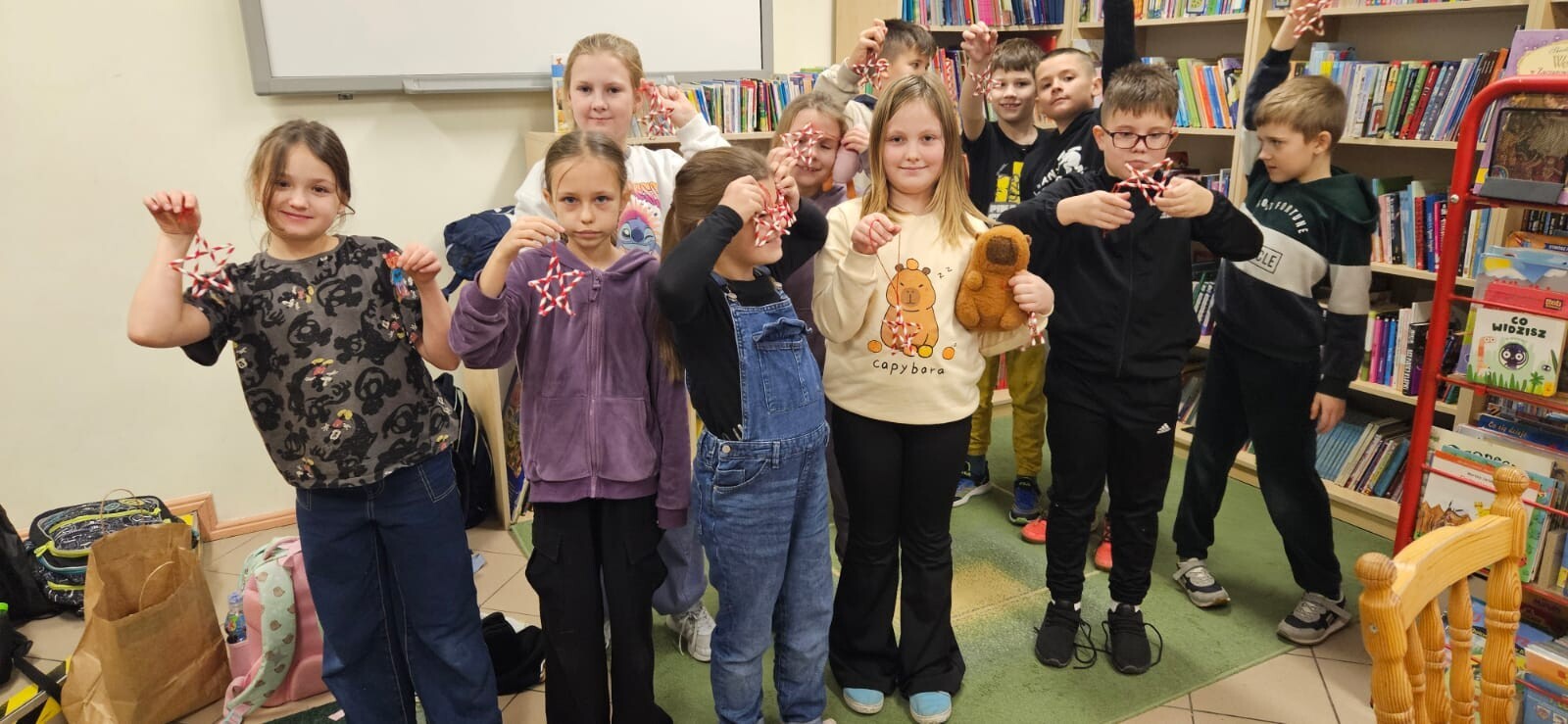 Uczniowie klasy IIa, IIb i III w bibliotece szkolnej uczestniczyli w warsztatach, podczas których samodzielnie wykonali gwiazdki ze słomek papierowych oraz łańcuchy z kolorowej bibuły i słomek.