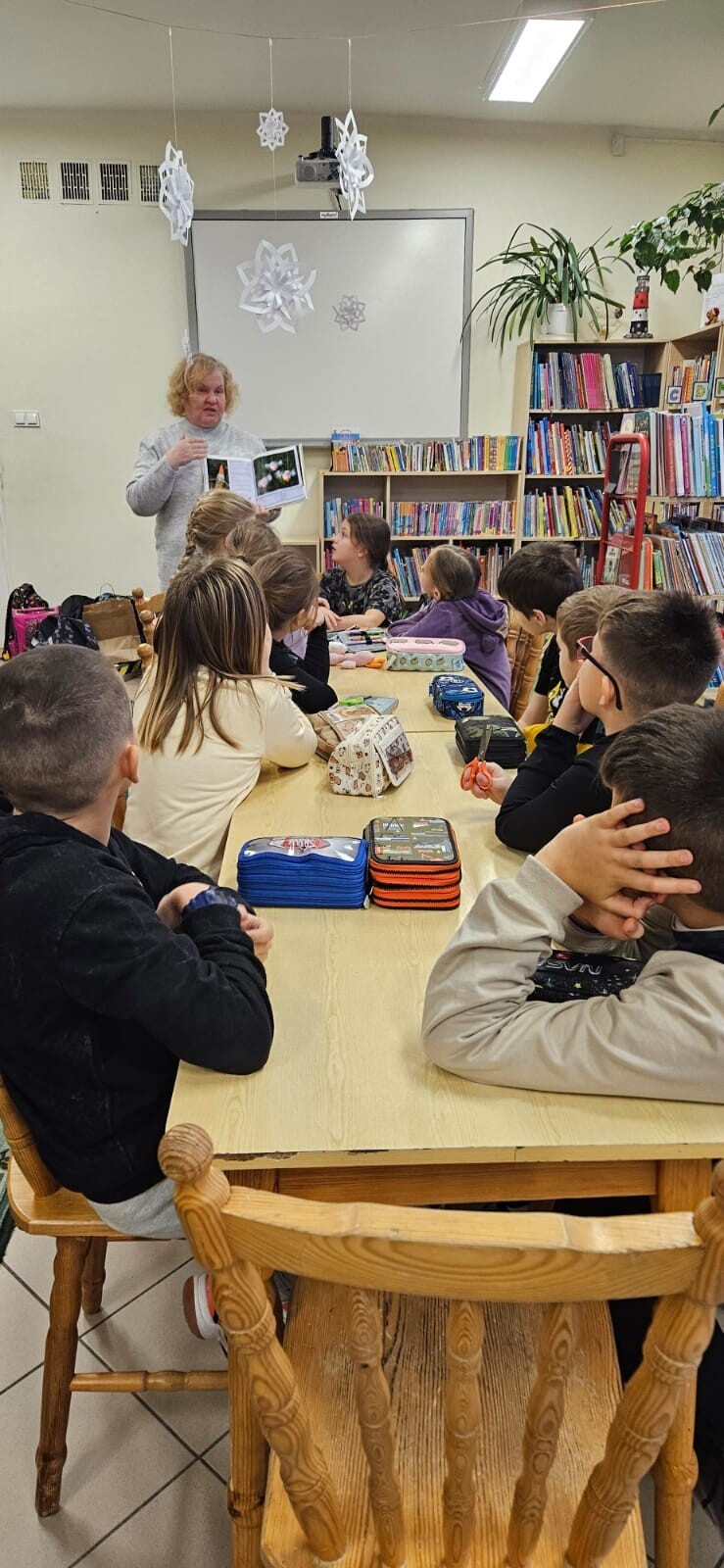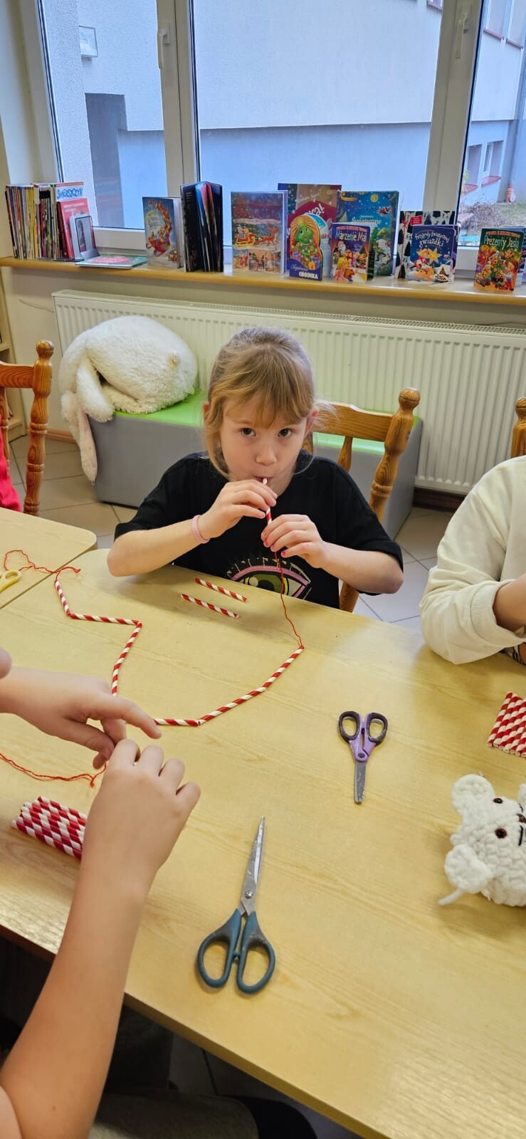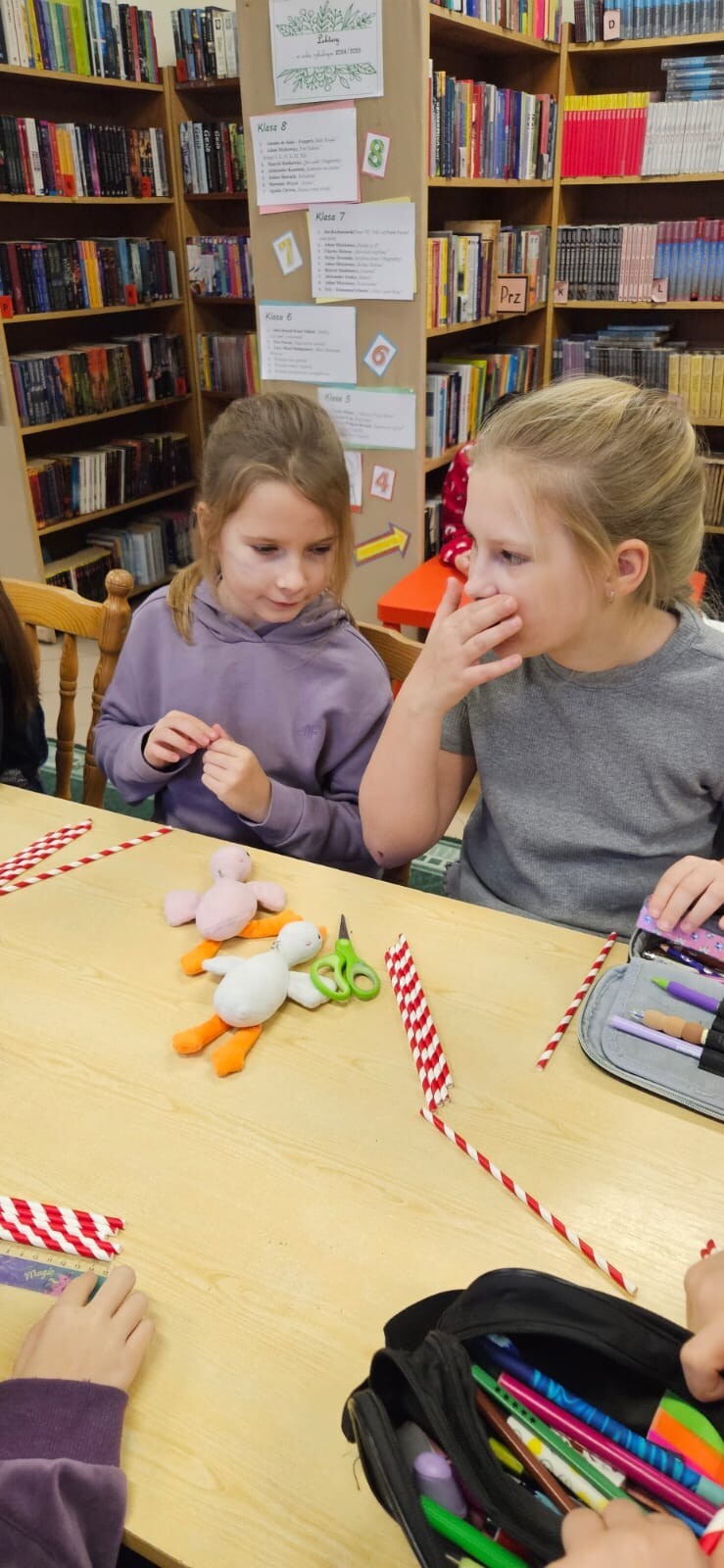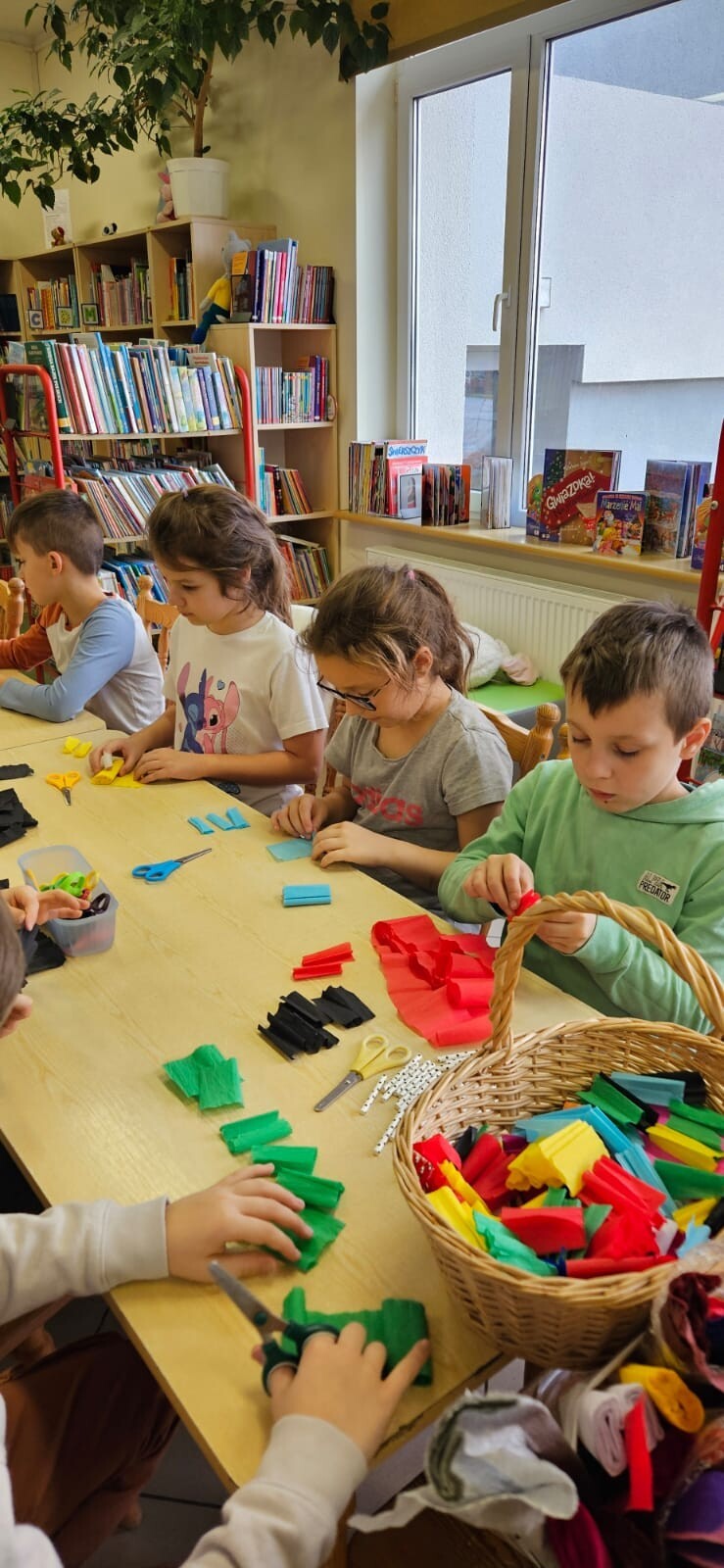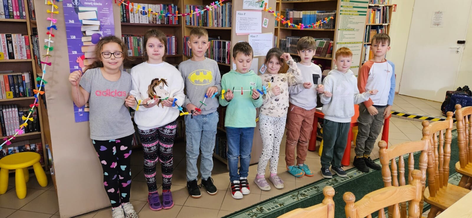 Uczniowie klasy IIa, IIb i III w bibliotece szkolnej uczestniczyli w warsztatach, podczas których samodzielnie wykonali gwiazdki ze słomek papierowych oraz łańcuchy z kolorowej bibuły i słomek.