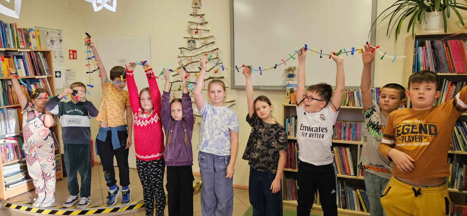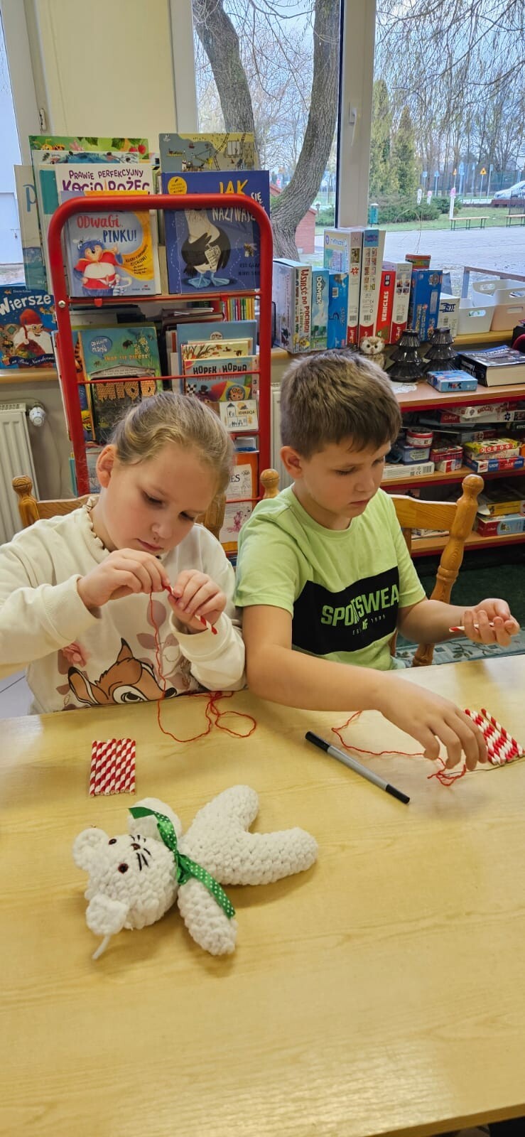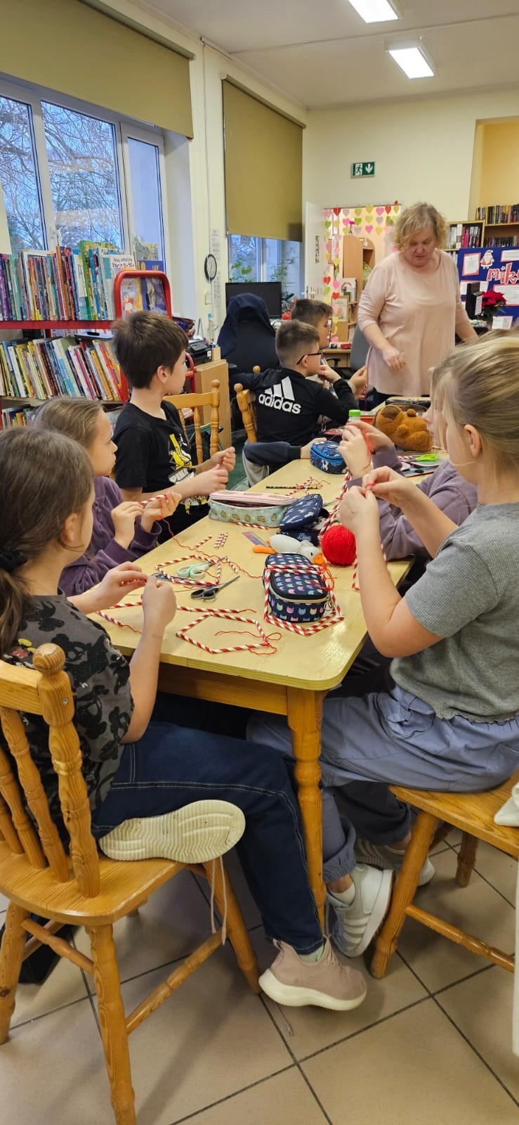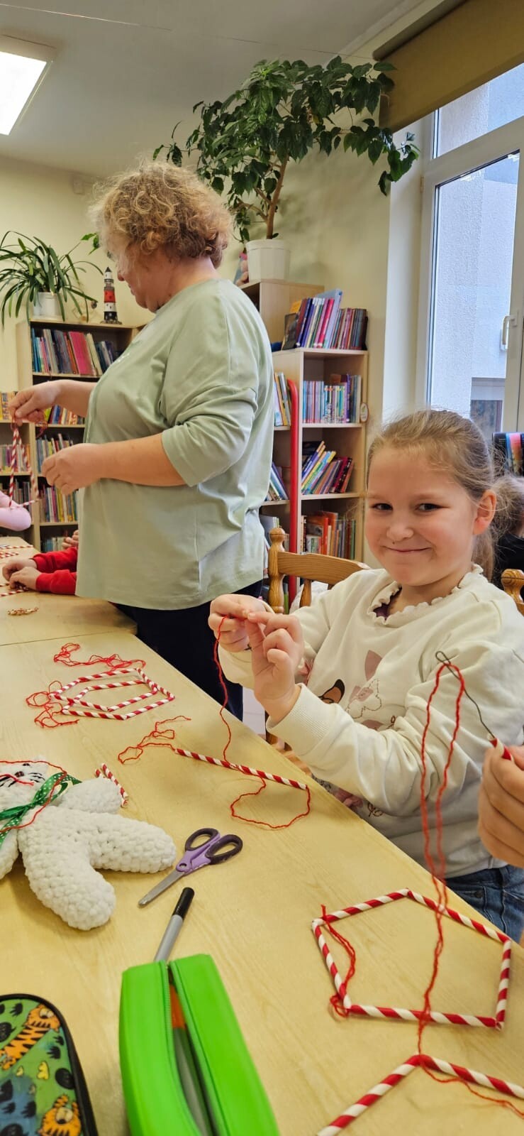 Uczniowie klasy IIa, IIb i III w bibliotece szkolnej uczestniczyli w warsztatach, podczas których samodzielnie wykonali gwiazdki ze słomek papierowych oraz łańcuchy z kolorowej bibuły i słomek.
