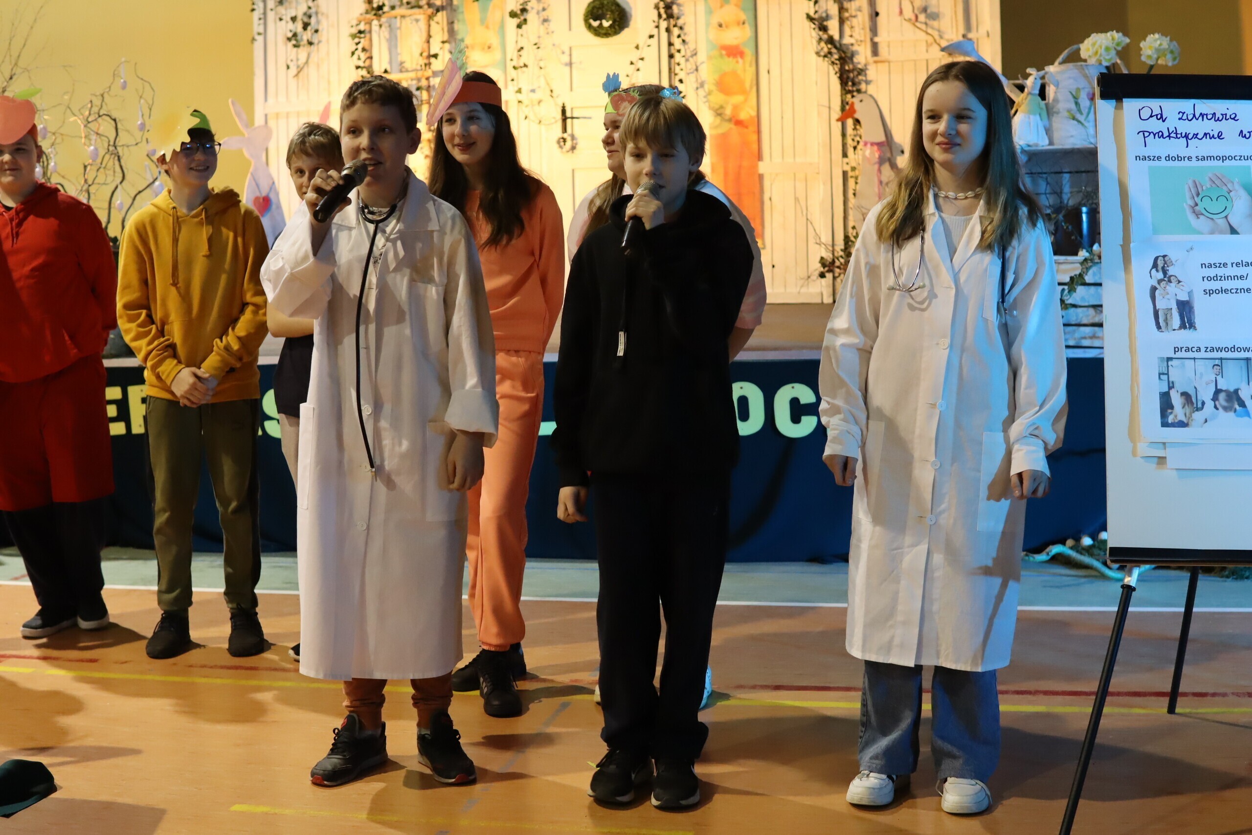 Nasza szkoła po raz kolejny wzięła udział w ogólnopolskim programie edukacyjnym „Trzymaj formę”, którego organizatorami jest m.in. Główny Inspektorat Sanitarny i Polska Federacja Producentów Żywności Związek Pracodawców. W ramach programu uczniowie klasy VI zrealizowali projekt edukacyjny, w efekcie którego powstał spektakl teatralny pt. „Witaminy zjadamy, o zdrowie dbamy”. Głównym celem było poznanie roli i witamin w prawidłowym funkcjonowaniu ludzkiego organizmu, a tym samym kształtowanie właściwych nawyków żywieniowych. Podczas realizacji projektu uczniowie pracowali zróżnicowanymi metodami aktywizującymi, nabywali umiejętności współpracy i rozwijali swoją kreatywność. Prace nad powstaniem spektaklu oparto na metodzie projektu i poprzedzone były kilkugodzinnymi spotkaniami z uczniami, na których stworzono scenariusz przedstawienia. Realizowano ustalone zadania, aż do punktu kulminacyjnego, czyli przedstawieniu spektaklu społeczności szkolnej i środowisku lokalnemu na kiermaszu wielkanocnym, podczas którego dużym zainteresowaniem cieszył się zorganizowany przez uczniów „Kącik zdrowia” z informacjami dotyczącymi zdrowego odżywiania.