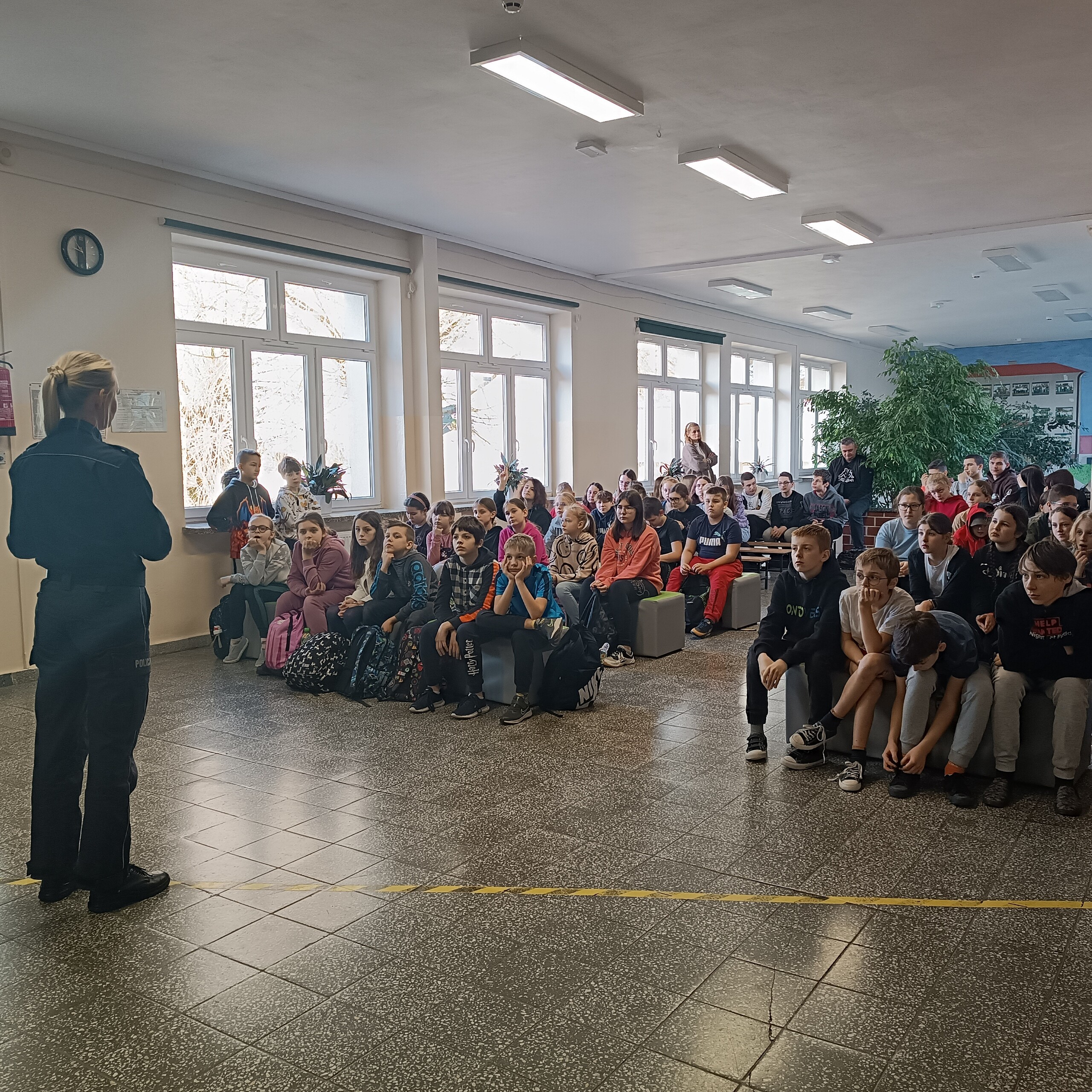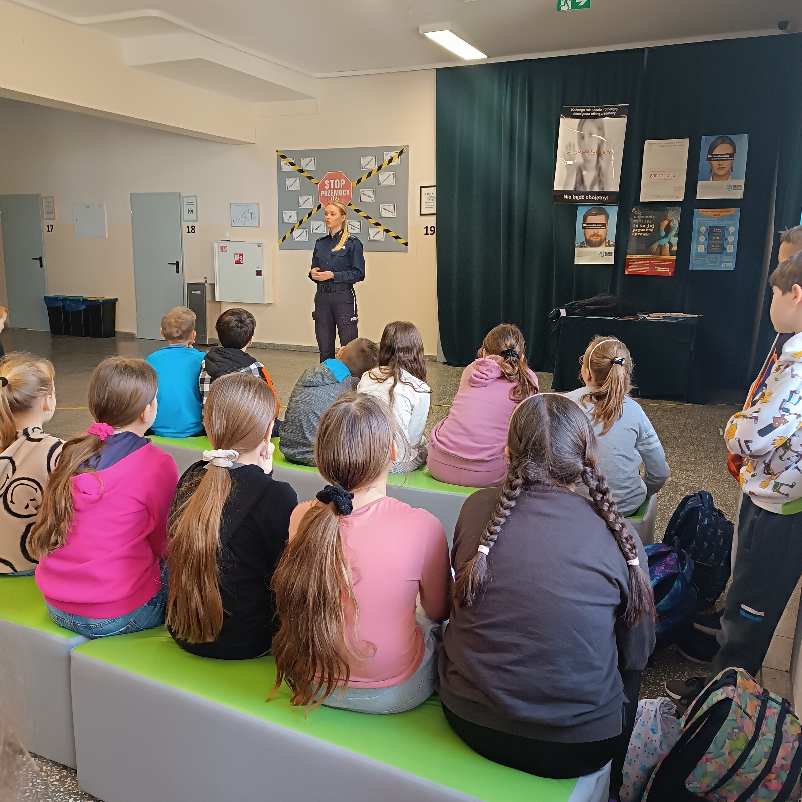 Uczniowie naszej szkoły wzięli udział w trwającej tydzień akcji pod hasłem „Stop przemocy!”. W każdej klasie odbyły się zajęcia profilaktyczne dotyczące zjawiska przemocy w tym cyberprzemocy, na którą współczesne dzieci są w szczególności narażone. Uczniowie spotkali się z funkcjonariuszami policji z Powiatowej Komendy Policji z Lęborka. Pani policjantka szczegółowo przedstawiła uczniom konsekwencje prawne stosowania przemocy oraz wskazała instytucje, numery telefoniczne organizacji udzielającej wsparcia i pomocy w sytuacji doznania przemocy.