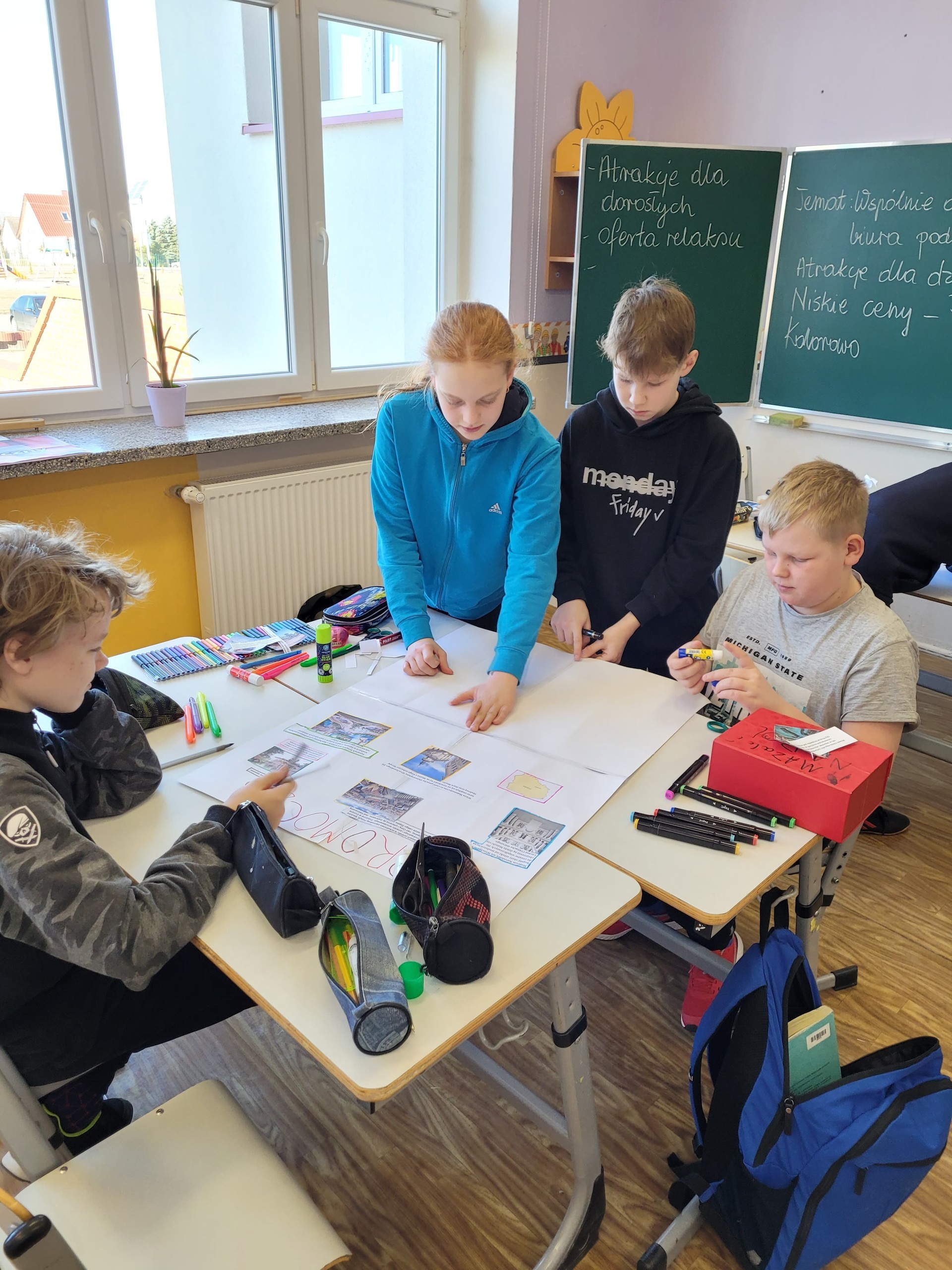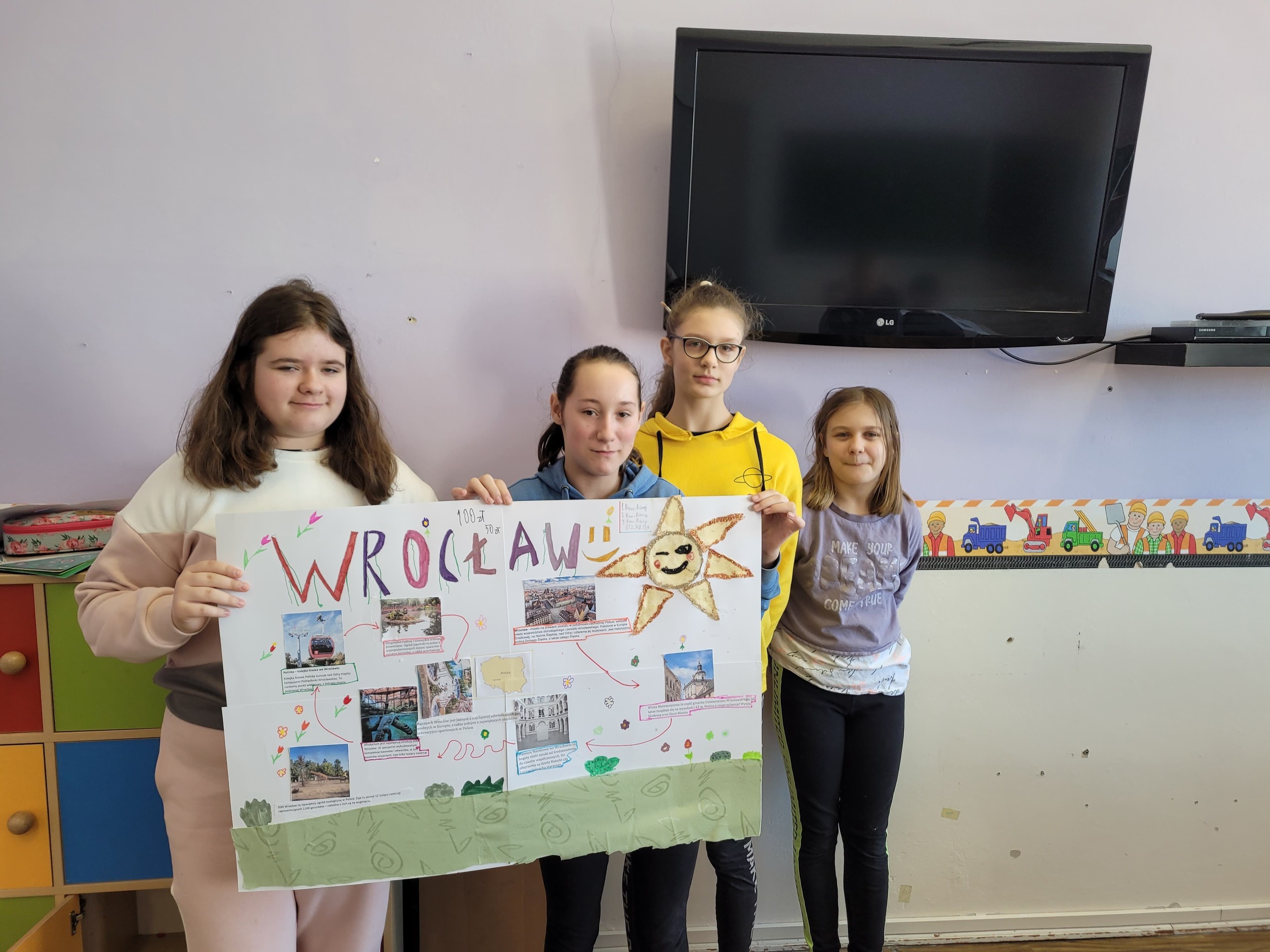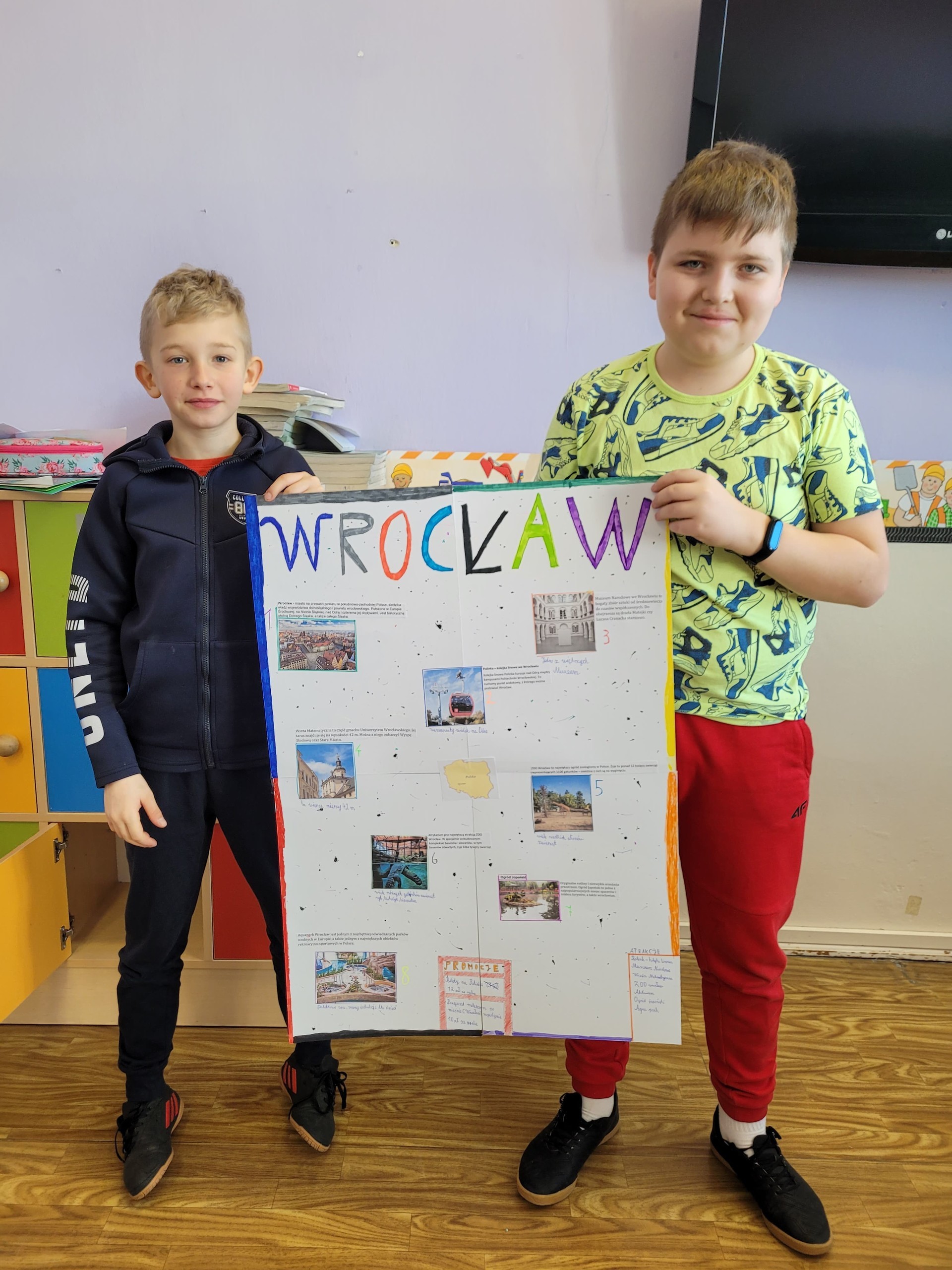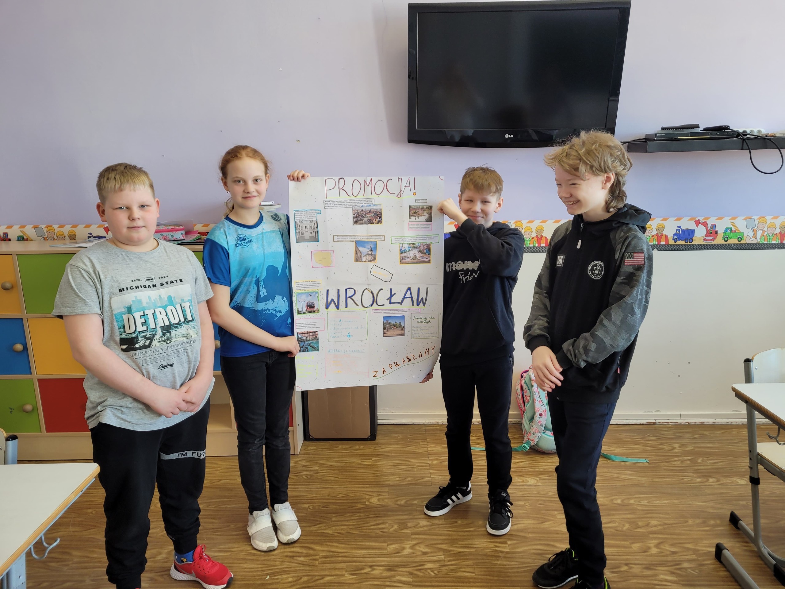 Uczniowie klasy V pracowali na lekcjach języka polskiego metodą projektu. W zespołach wspólnie opracowali ofertę biura podróży, która dotyczyła wycieczki do Wrocławia. Uczniowie korzystając z informacji o mieście, wymieniali się pomysłami, a także przeanalizowali oferty biur podróży. Praca zespołowa przebiegała bardzo sprawnie. Uczniowie zauważyli, że oferowanie usług turystycznych jest związane z przyciągnięciem uwagi odbiorcy za pomocą odpowiednich zdjęć, zaskakujących haseł, przemyślanej szaty graficznej.