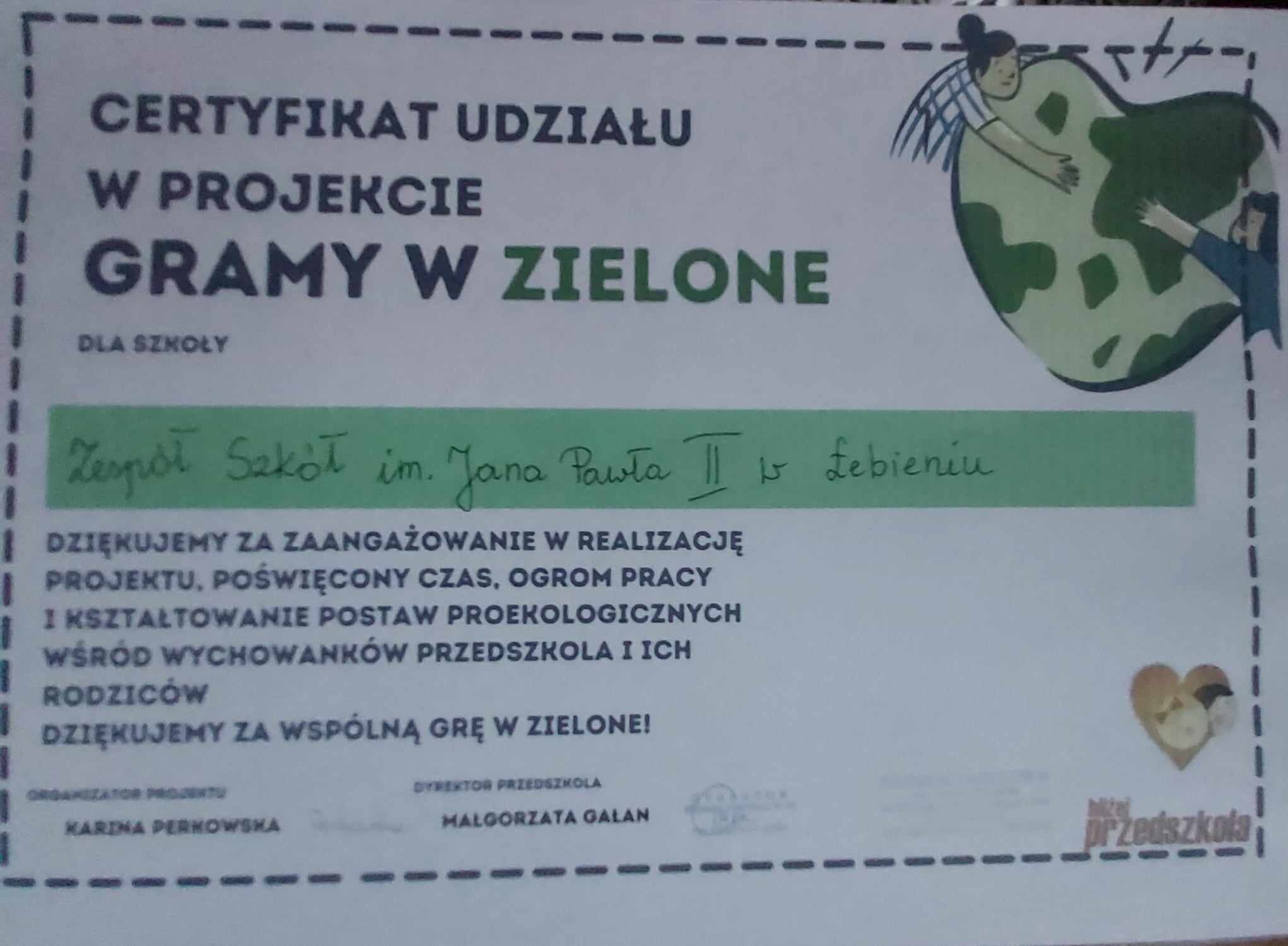 Grupa „Jeżyki” w bieżącym roku wzięła udział w dwóch projektach o wydźwięku ekologicznym tj. „Gramy w zielone” oraz „Z darami natury świat nie jest ponury”. Zadania, które wykonały dzieci były ściśle związane z dbaniem o przyrodę i swój drugi dom jakim jest planeta Ziemia. Wiele zajęć poświęconych było nauce segregowania śmieci oraz wykorzystywania surowców wtórnych, a co za tym idzie zmniejszania ilości śmieci. Dzieci bardzo chętnie uczestniczyły w zajęciach i dowiedziały się, że każdy z nich może przyczynić się do wielkiej misji jaką jest czysta Ziemia. Wszystkie zadania wyznaczone w projekcie zostały wykonane, czego dowodem są otrzymane za udział certyfikaty.
