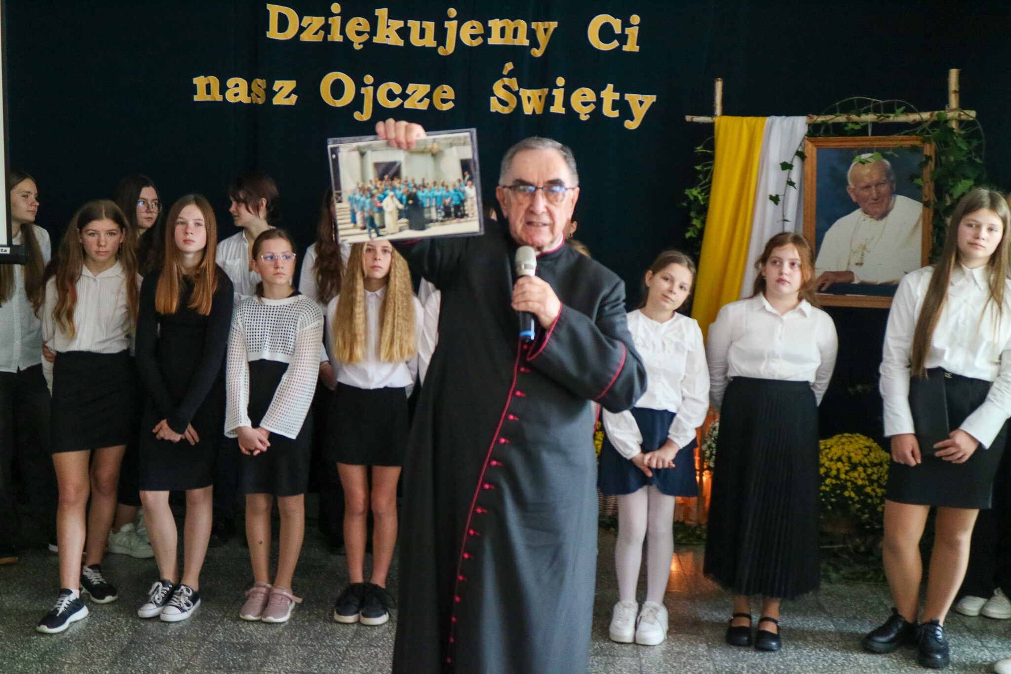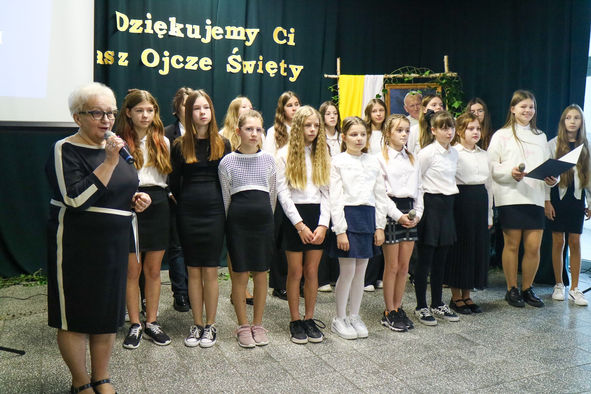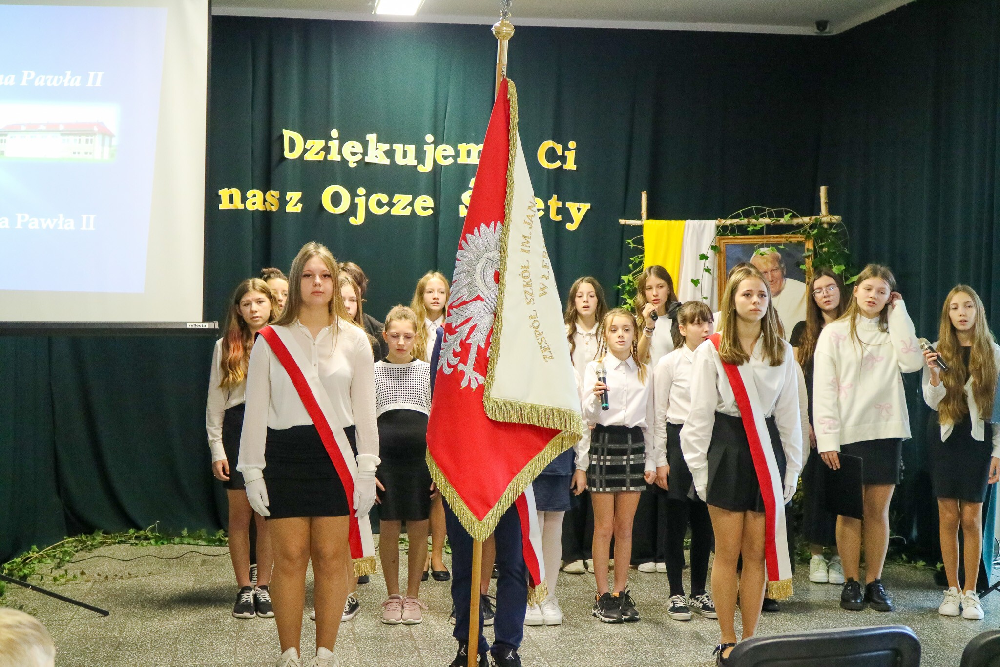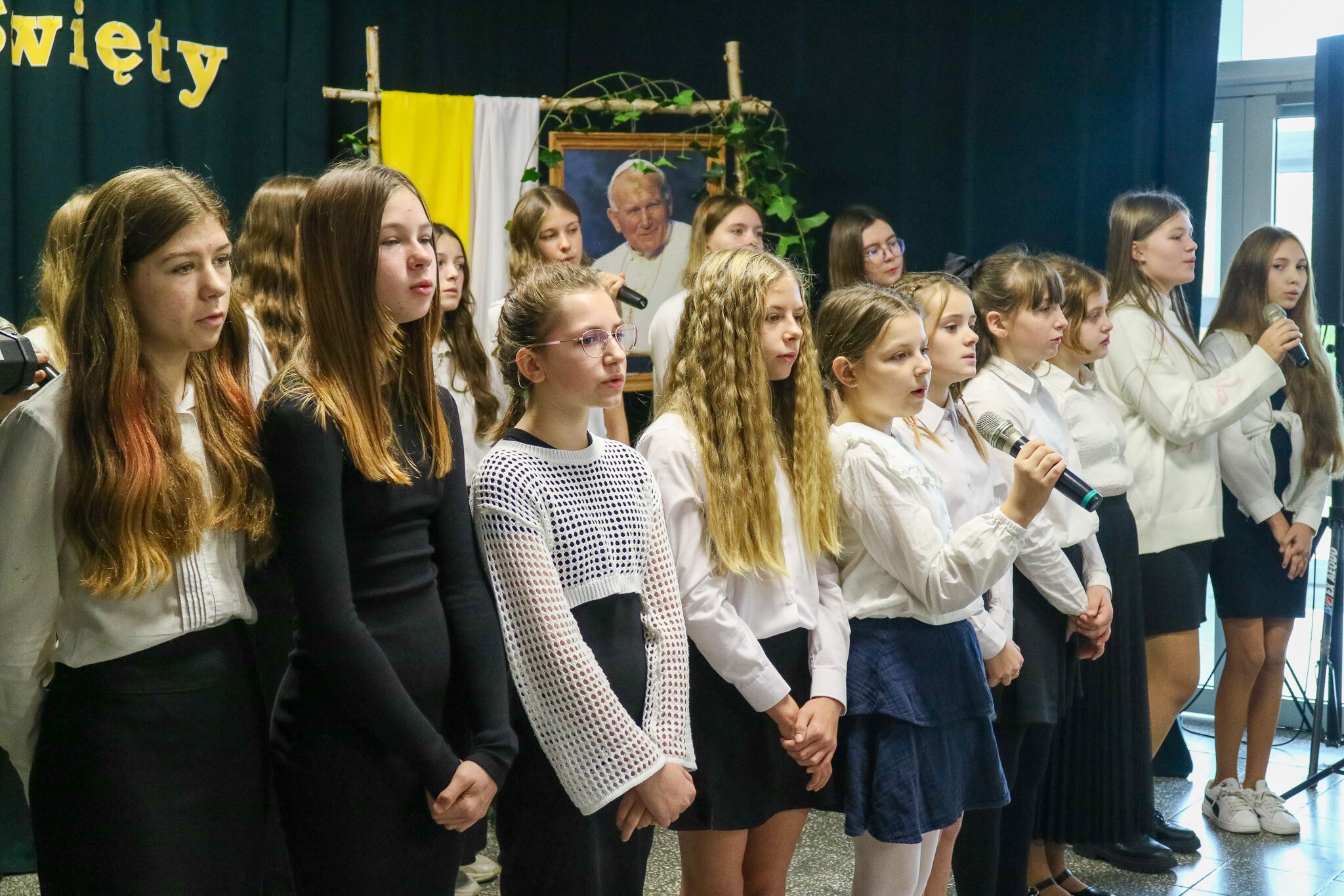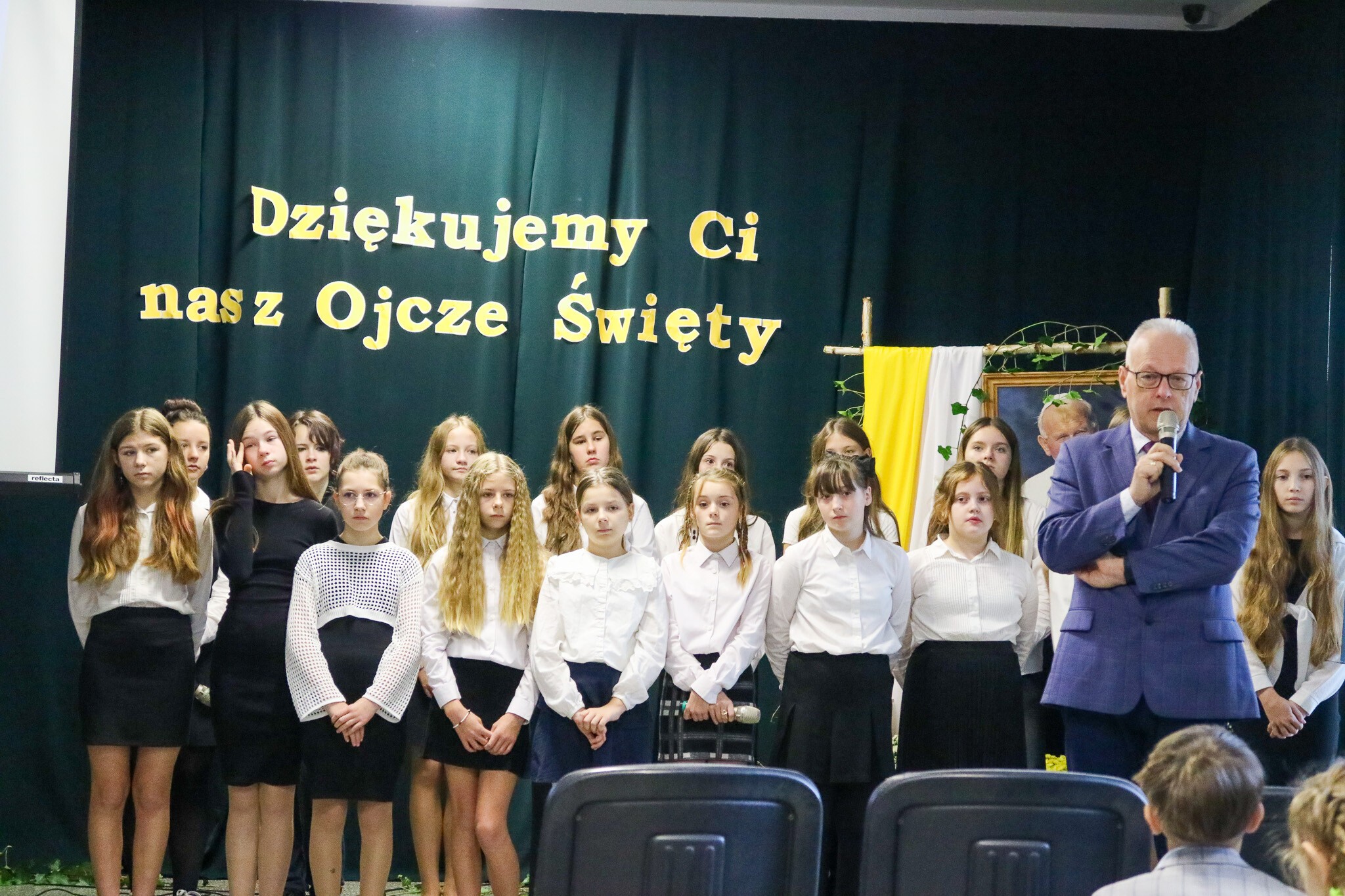 4 listopada w naszej szkole odbyła się uroczysta akademia z okazji dziewiętnastej rocznicy nadania naszej szkole imienia Jana Pawła II. Świętowanie rozpoczęło się od wprowadzenia sztandaru i odśpiewania hymnu szkoły. Następnie dyrektor Krzysztof Wojtysiak przywitał zaproszonych gości oraz całą społeczność szkolną. Zaproszonymi gośćmi byli: delegat księdza biskupa – ksiądz prałat Marian Szczepiński, diakon stały Zbigniew Machnikowski, ksiądz proboszcz Janusz Góral oraz przewodnicząca Rady Rodziców – pani Justyna Wilga. Po przemówieniu dyrektora delegacja w składzie: dyrekcja szkoły, przewodnicząca Samorządu Uczniowskiego oraz przewodnicząca Rady Rodziców złożyli kwiaty przed tablicą upamiętniającą nadanie naszej szkole imienia Jana Pawła II. Następnie uczennice klasy piątej, szóstej i siódmej zaprezentowały część artystyczną poświęconą postaci naszego patrona. Rozpoczęła się ona od zaśpiewania ulubionej pieśni Jana Pawła II – „Barka”. W swoim wystąpieniu uczennice przypomniały najważniejsze momenty z życia Karola Wojtyły – od dzieciństwa i młodości spędzonych w Wadowicach, poprzez okres kapłaństwa i pracy duszpasterskiej, aż po wybór na Stolicę Piotrową. Występ podkreślał jego niezwykłą wiarę, miłość do drugiego człowieka, otwartość na młodych oraz nieustanne dążenie do pokoju i dialogu między narodami. Uczennice z wielkim zaangażowaniem recytowały teksty ukazujące duchową głębię i mądrość Jana Pawła II. Program artystyczny przeplatany był pieśniami, które wprowadziły wszystkich w podniosły, a zarazem refleksyjny nastrój. Całość występu stanowiła piękne przypomnienie, że słowa i czyny Papieża Polaka pozostają wciąż aktualne i inspirujące. W czasie akademii wyświetlano slajdy przedstawiające najważniejsze wydarzenia z życia Jana Pawła II. Wzbogaciły one program i pomogły młodszym uczniom lepiej poznać postać naszego patrona. Po zakończeniu części artystycznej głos zabrał delegat księdza biskupa – ksiądz Marian Szczepiński, który w swoim wystąpieniu nawiązał do momentu wyboru Karola Wojtyły na papieża oraz o spotkaniu z Janem Pawłem II w Watykanie. Podkreślił znaczenie nauczania Papieża Polaka oraz rolę, jaką jego wartości – miłość, prawda, szacunek i odpowiedzialność – odgrywają w wychowaniu młodego pokolenia. Podziękował również uczennicom za piękny występ.