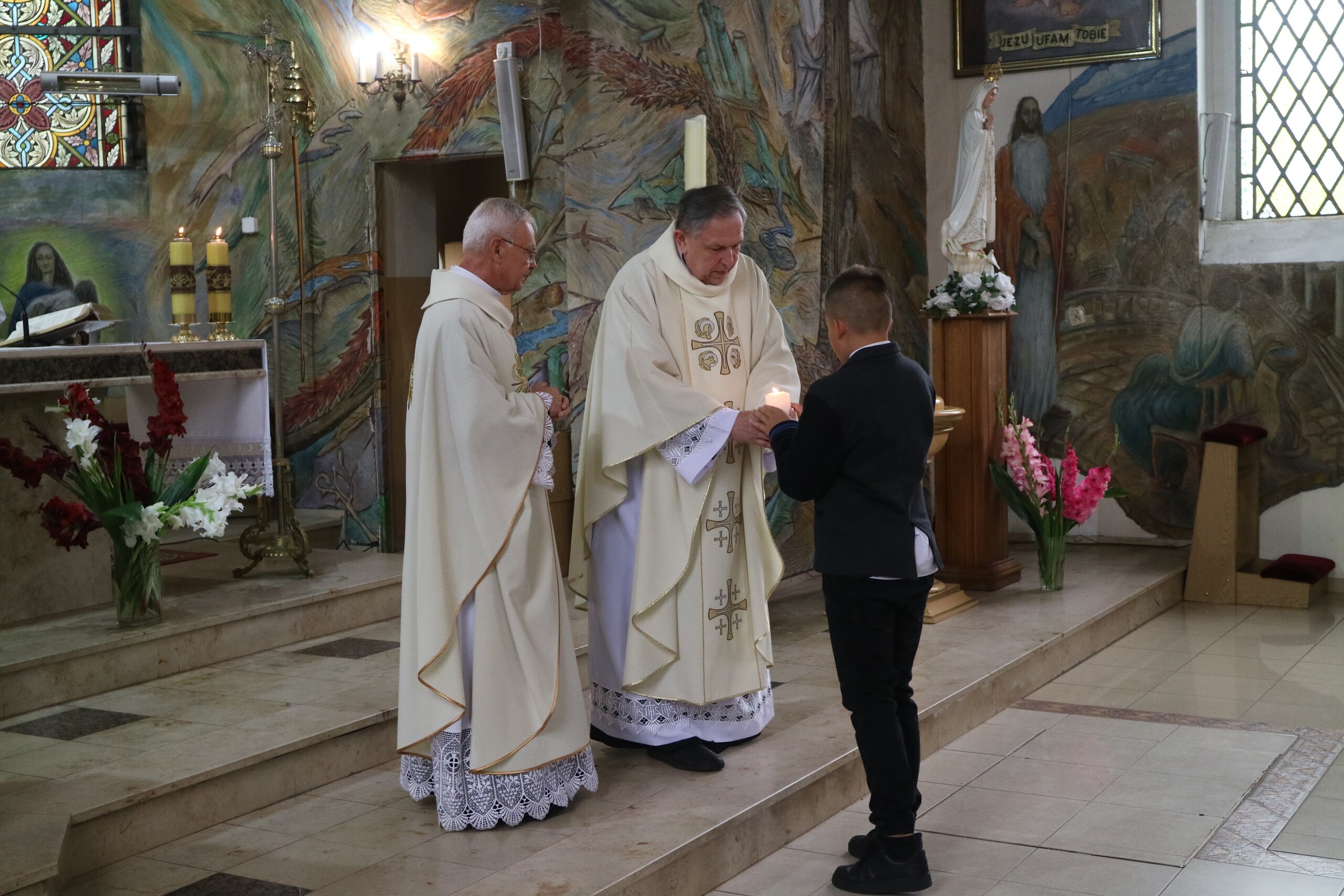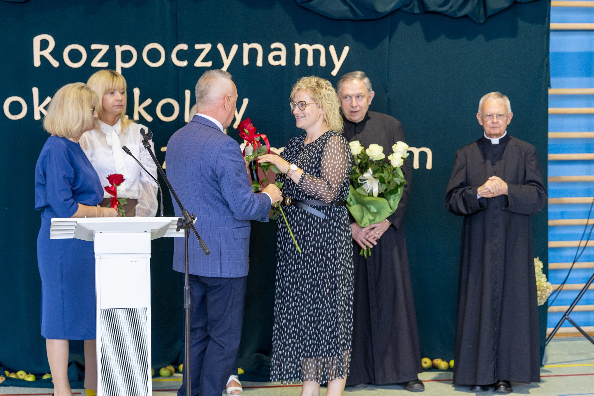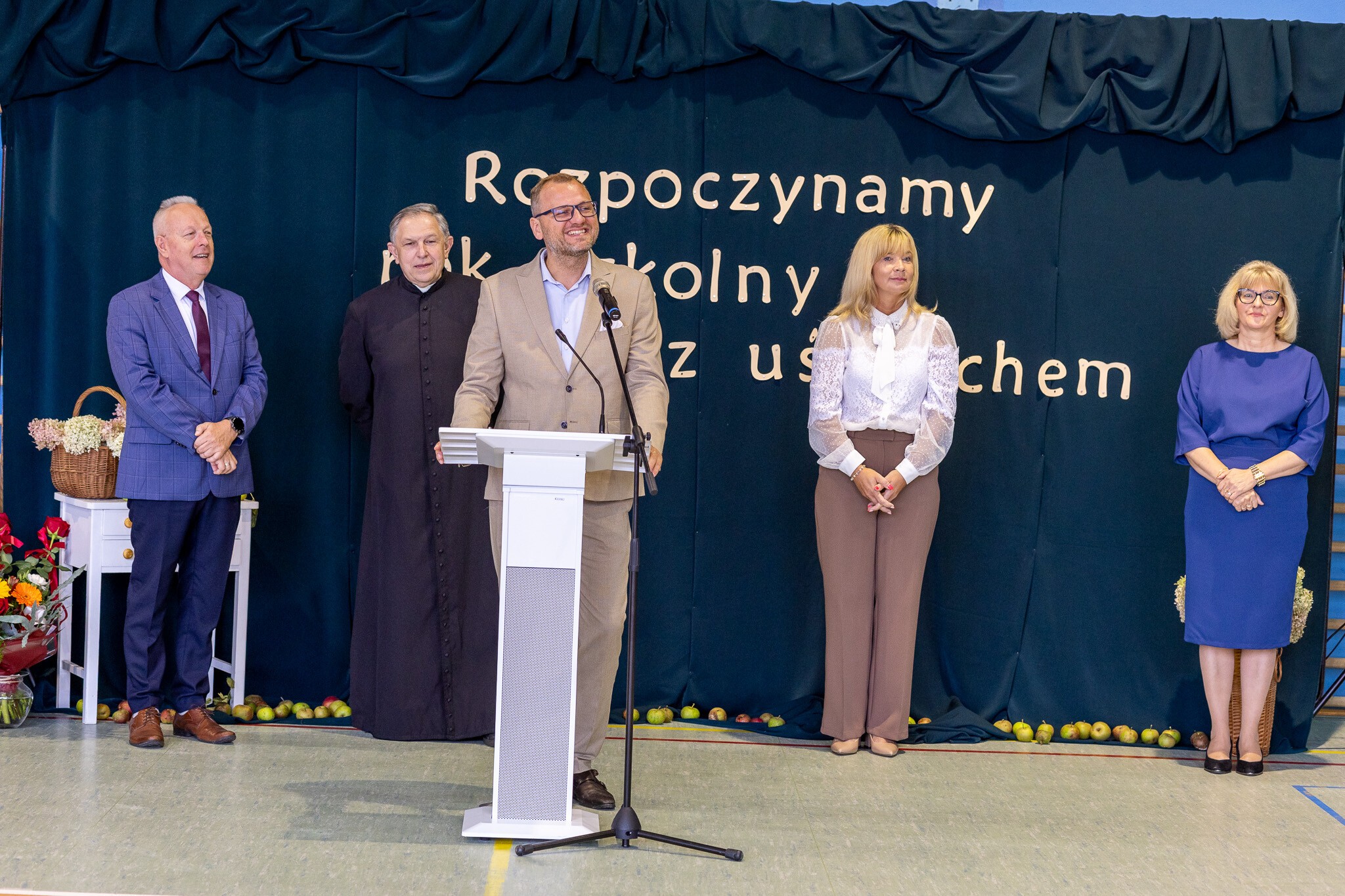 1 września 2025 roku w naszej szkole odbyło się uroczyste rozpoczęcie roku szkolnego 2025/2026. Tradycyjnie najpierw społeczność szkolna uczestniczyła w mszy św. w kościele parafialnym w Łebieniu, którą celebrował ks. Krzysztof Kozakiewicz proboszcz Parafii św. Jana Chrzciciela w Białogardzie i ks. Janusz Góral proboszcz Parafii Matki Bożej Królowej Polski w Łebieniu. Eucharystia była czasem refleksji, modlitwy o siły na nadchodzące miesiące nauki oraz dziękczynienia za minione wakacje. Następnie wszyscy udali się do szkoły, gdzie odbyła się oficjalna część inauguracji nowego roku szkolnego. Uroczystość rozpoczął Dyrektor pan Krzysztof Wojtysiak, który serdecznie powitał wszystkich zebranych, a szczególnie gości Wójta Gminy Nowa Wieś Lęborska pana Szymona Medaliona, przewodniczącą Rady Rodziców panią Justynę Wilgę oraz księdza Janusza Górala i księdza Krzysztofa Kozakiewicza. Dyrektor w swoim przemówieniu życzył uczniom owocnej nauki, nauczycielom satysfakcji z pracy, a rodzicom dumy z osiągnięć swoich dzieci. Nawiązał również do 86 rocznicy wybuchu II Wojny Światowej. Minutą ciszy uczczono pamięć o tych tragicznych wydarzeniach. Do społeczności szkolnej zwrócił się także Wójt Gminy Nowa Wieś Lęborska pan Szymon Medalion, który podkreślił znaczenie edukacji, wspólnej pracy oraz wzajemnego wsparcia w rozwoju uczniów. Podkreślił znaczenie współpracy samorządu, społeczności lokalnej i placówek oświatowych. Złożył wszystkim życzenia spokojnego i udanego roku szkolnego, pełnego sukcesów i pozytywnych doświadczeń. Cała społeczność szkolna podziękowała ks. Krzysztofowi Kozakiewiczowi , który postanowił zakończyć swoją pracę i przejść na zasłużony odpoczynek. Dyrektor szkoły podziękował księdzu – katechecie za wszelkie działania na rzecz dzieci, za wszelką pomoc i życzył spokojnych i zdrowych lat na emeryturze. Szczególnym momentem uroczystości było wręczenie kwiatów i gratulacji z okazji jubileuszu pracy zawodowej nauczycielce p. Marioli Wojtysiak i wicedyrektor p. Marzenie Łapie. Ich wieloletnie zaangażowanie i oddanie zasługują na najwyższe uznanie. Ponadto wyróżniono nauczycielki, które w ostatnim czasie uzyskały awans zawodowy na stopień nauczyciela mianowanego p. Ewelinę Jaskulską i p. Roksanę Sowińską. Gratulujemy i życzymy dalszego rozwoju oraz sukcesów w pracy dydaktycznej. Rozpoczęcie roku szkolnego to zawsze czas pełen emocji - nowych nadziei, planów i wyzwań. Wszystkim uczniom życzymy, aby ten rok był bogaty w ciekawe doświadczenia, a nauczycielom i pracownikom szkoły, by każdy dzień pracy przynosił satysfakcję i radość. Niech rok szkolny 2025/2026 będzie dla całej społeczności szkolnej czasem rozwoju, współpracy i wzajemnego wsparcia.