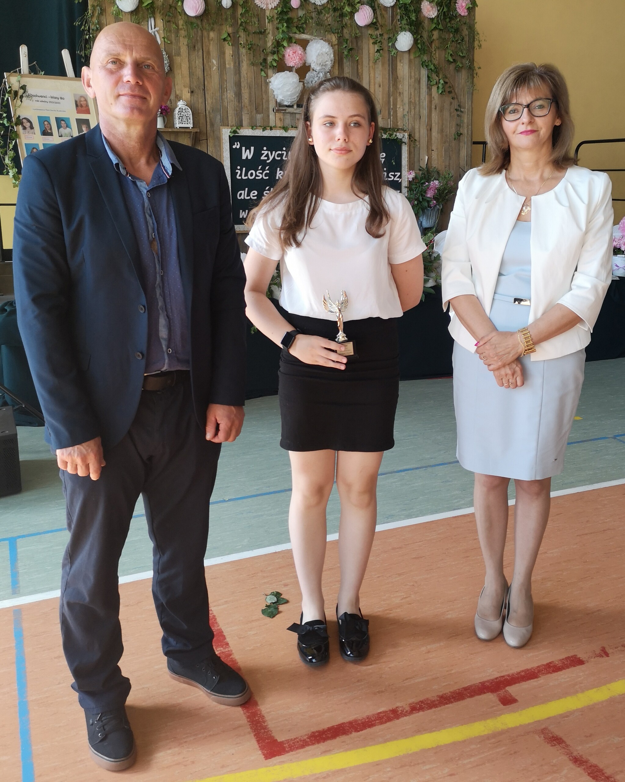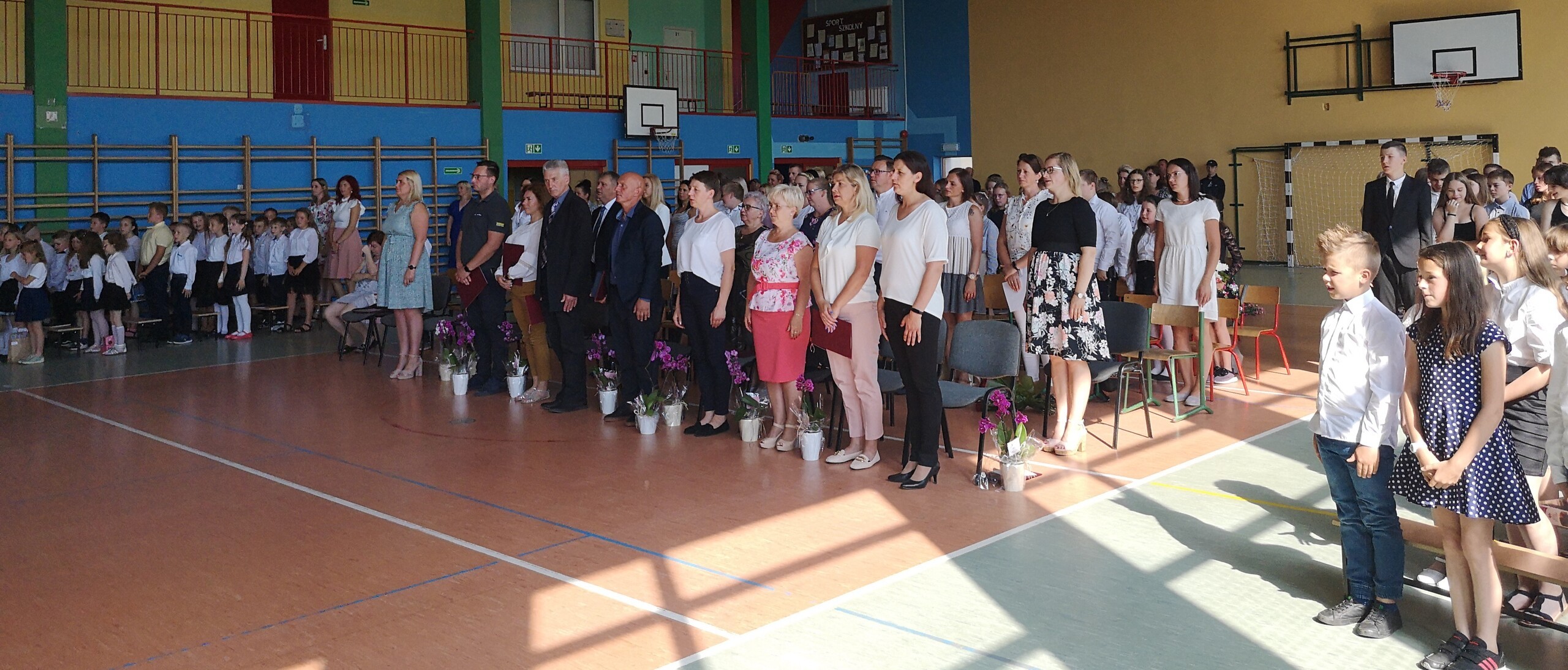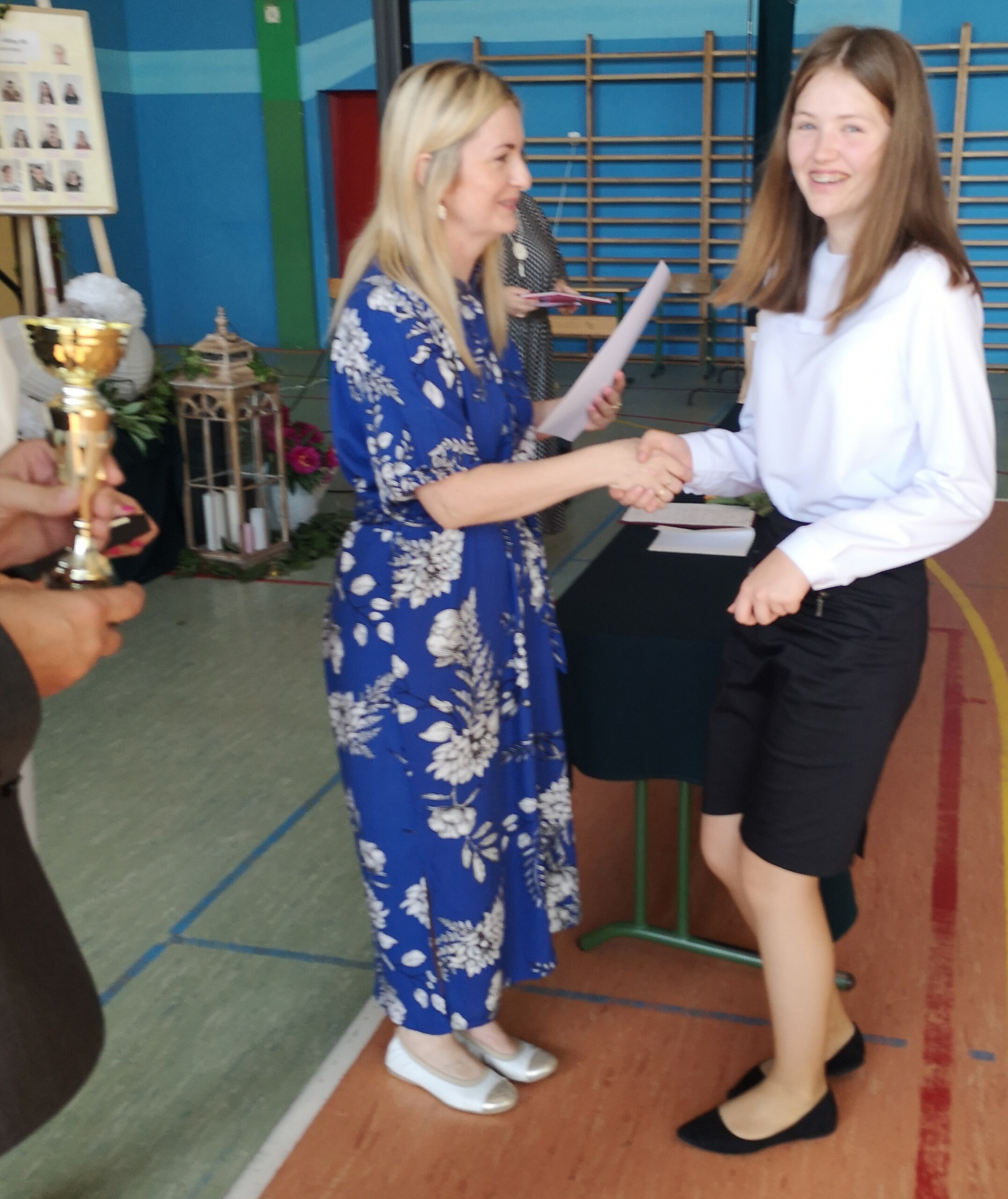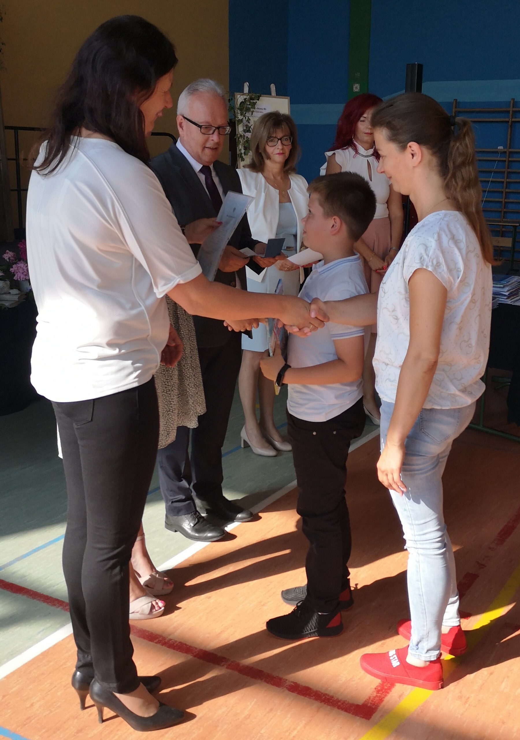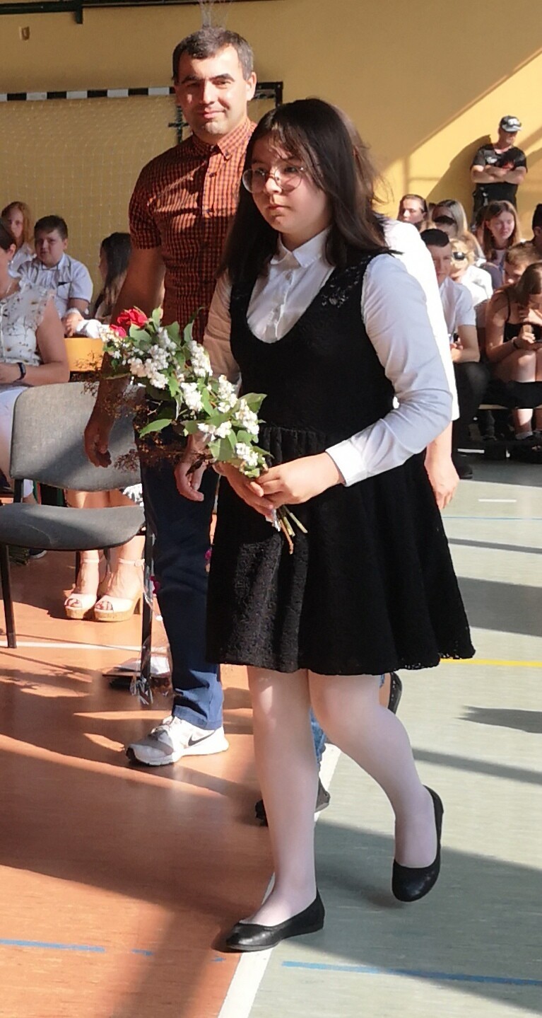 Po tej szczególnej chwili nastąpiło uroczyste wręczenie świadectw i nagród uczniom wyróżniającym się w nauce, listów gratulacyjnych i podziękowań dla rodziców oraz nagród laureatom konkursów szkolnych, gminnych, powiatowych i ogólnopolskich. Od wielu lat przyznajemy wyróżnienia wychowawcze. W tym roku szkolnym tytuł „Uczeń z klasą” otrzymała Alicja Stanuch z klasy VIIIa, „Reprezentant szkoły” otrzymali: Zofia Brokowska z klasy VII, Julia Folga z klasy VI i Pola Sterkowicz z klasy IV. Uczeń klasy VII Michał Twardowski za osiągnięcia sportowe, a przede wszystkim w Wojewódzkich Igrzyskach Młodzieży nagrodzony został tytułem „Sportowiec roku”. Na ten sam tytuł zasłużyła Alicja Stanuch za wybitne osiągnięcia na ogólnopolskich arenach sportowych. Wręczono również medale i puchary wyróżniającym się wolontariuszom i sportowcom.