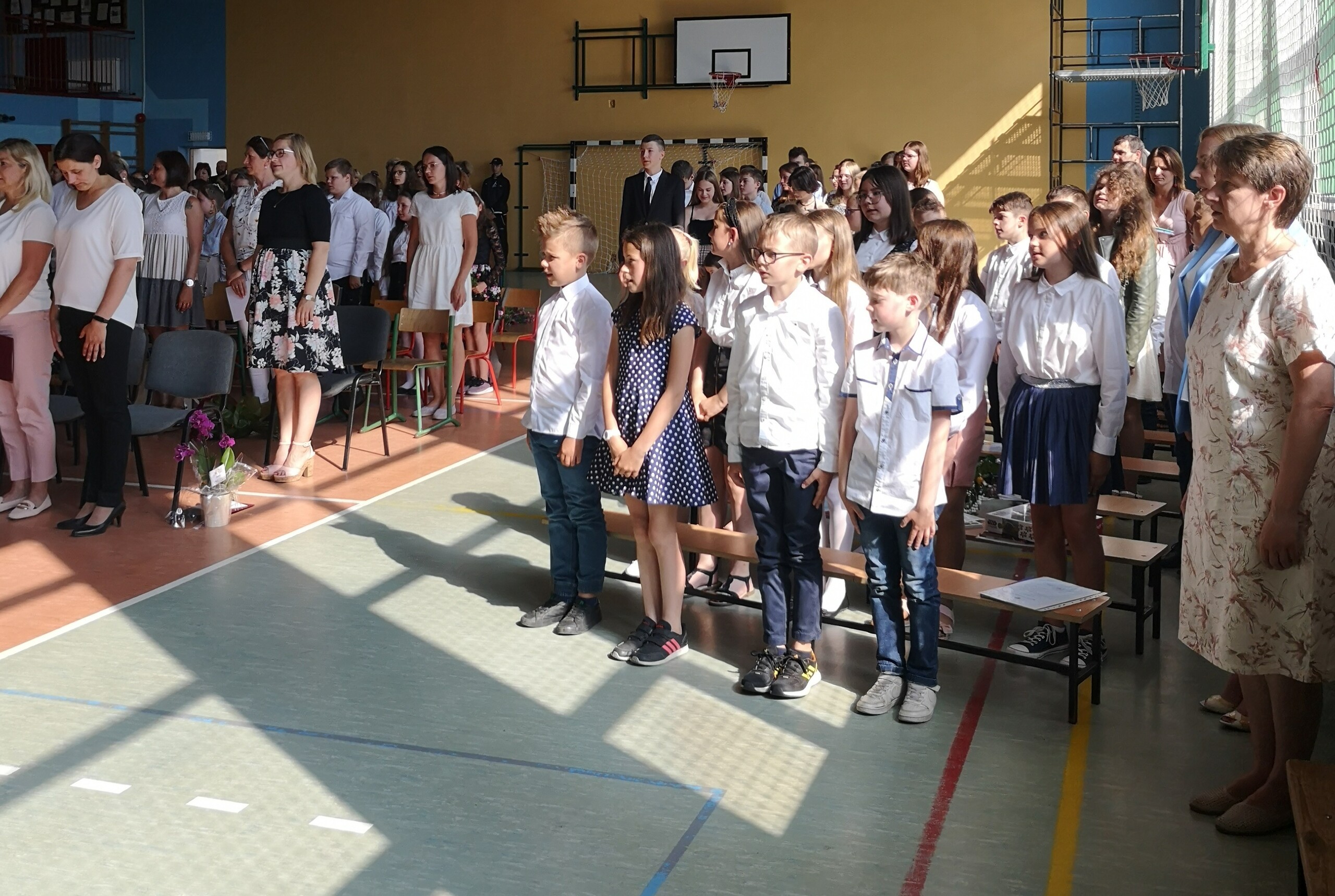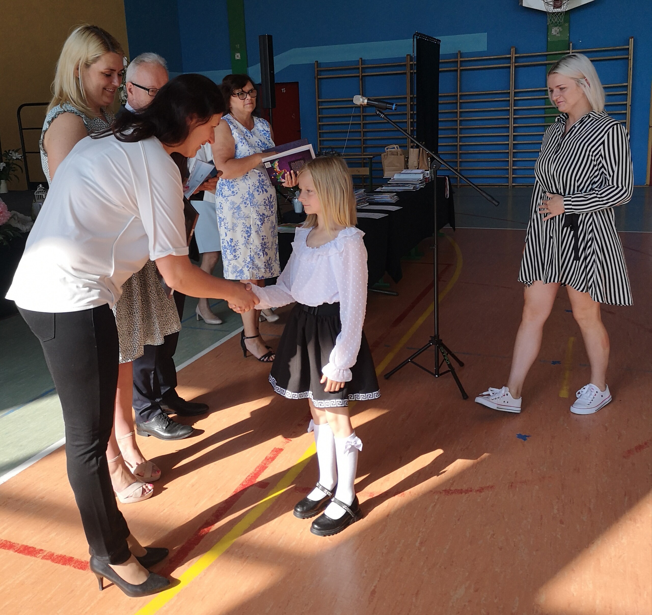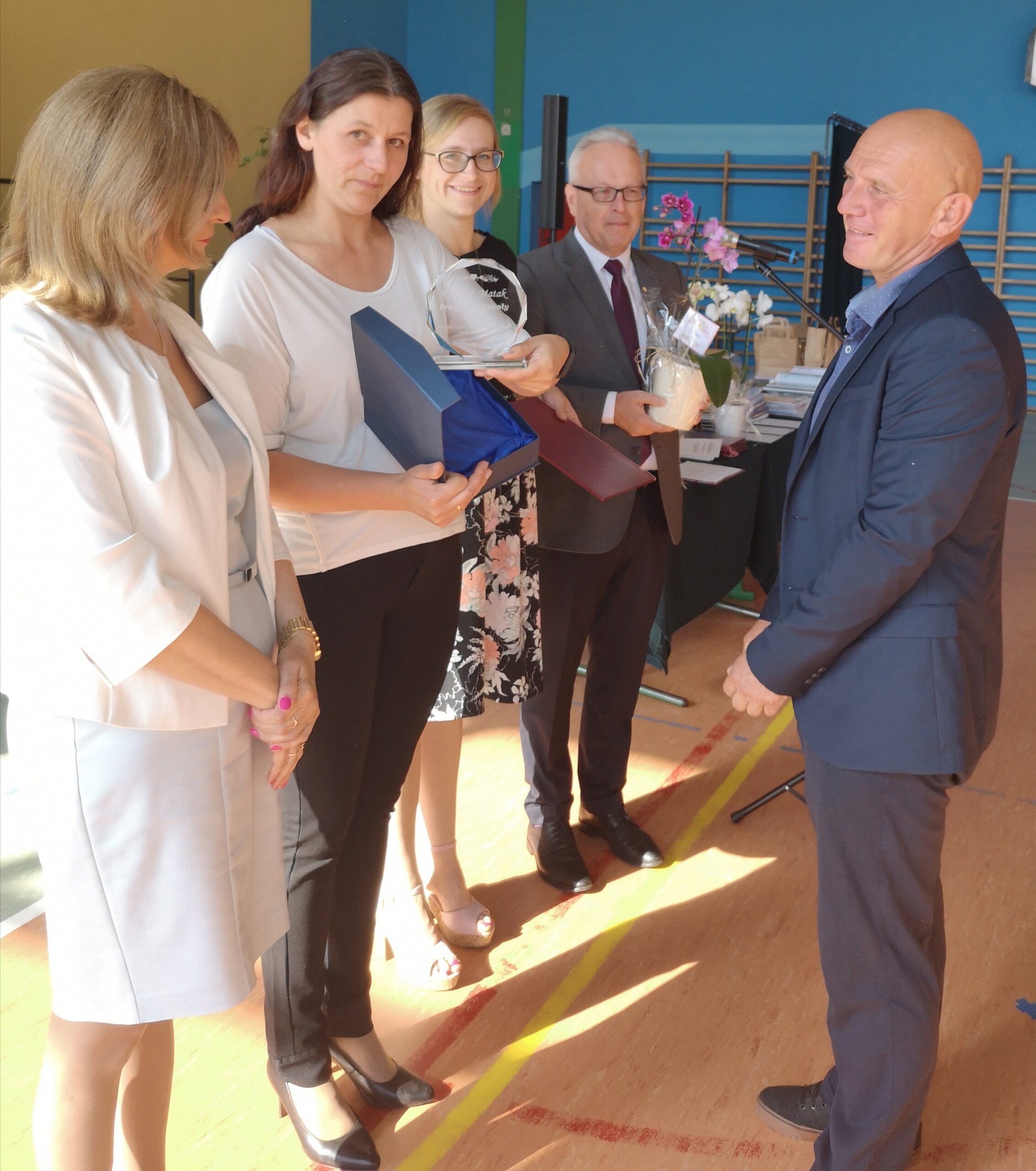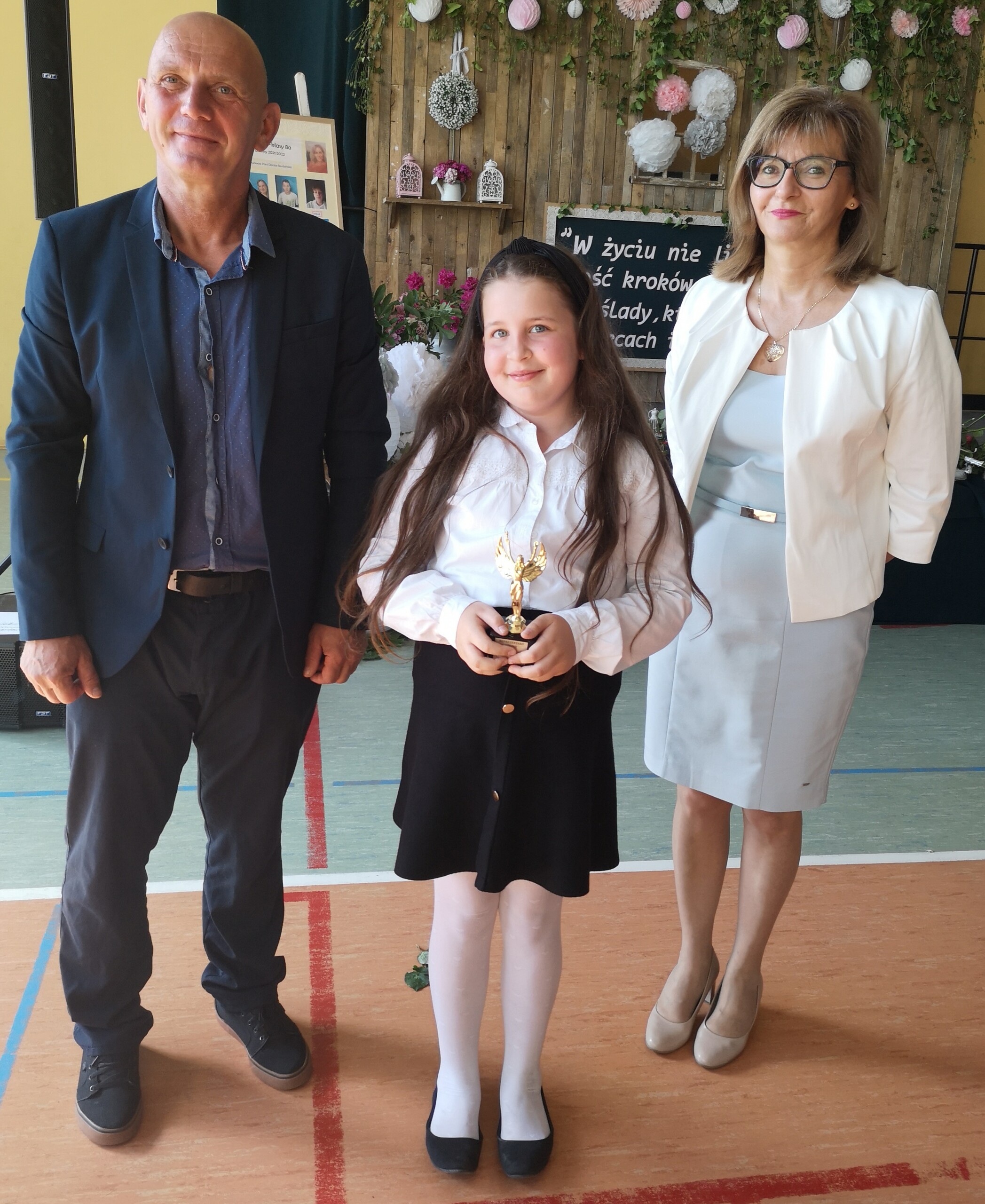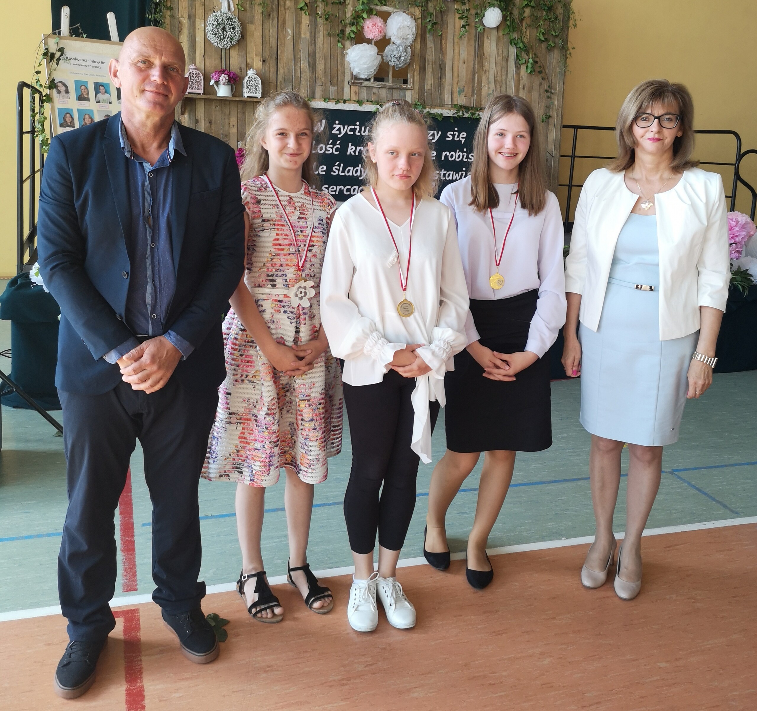 Po tej szczególnej chwili nastąpiło uroczyste wręczenie świadectw i nagród uczniom wyróżniającym się w nauce, listów gratulacyjnych i podziękowań dla rodziców oraz nagród laureatom konkursów szkolnych, gminnych, powiatowych i ogólnopolskich. Od wielu lat przyznajemy wyróżnienia wychowawcze. W tym roku szkolnym tytuł „Uczeń z klasą” otrzymała Alicja Stanuch z klasy VIIIa, „Reprezentant szkoły” otrzymali: Zofia Brokowska z klasy VII, Julia Folga z klasy VI i Pola Sterkowicz z klasy IV. Uczeń klasy VII Michał Twardowski za osiągnięcia sportowe, a przede wszystkim w Wojewódzkich Igrzyskach Młodzieży nagrodzony został tytułem „Sportowiec roku”. Na ten sam tytuł zasłużyła Alicja Stanuch za wybitne osiągnięcia na ogólnopolskich arenach sportowych. Wręczono również medale i puchary wyróżniającym się wolontariuszom i sportowcom.