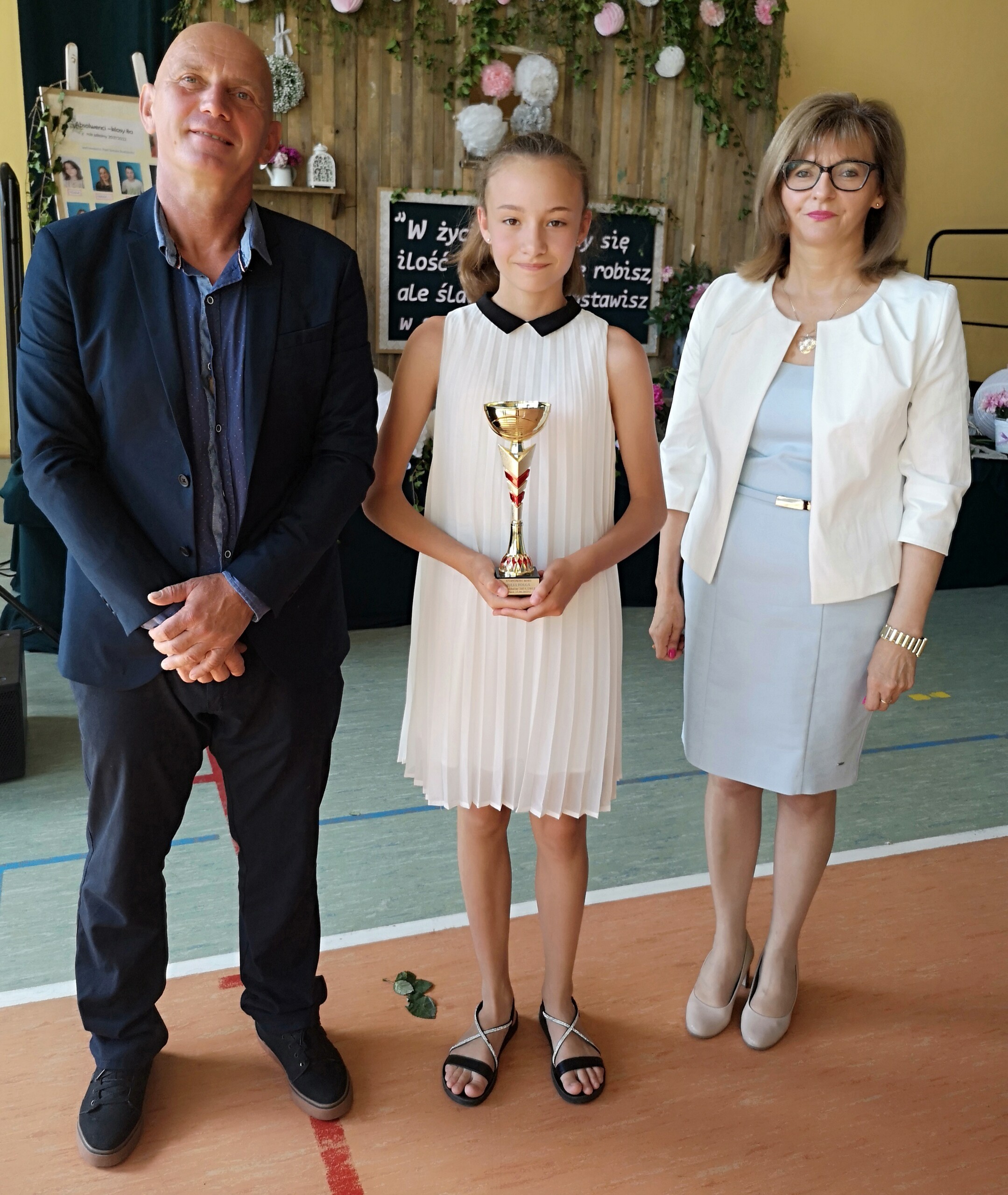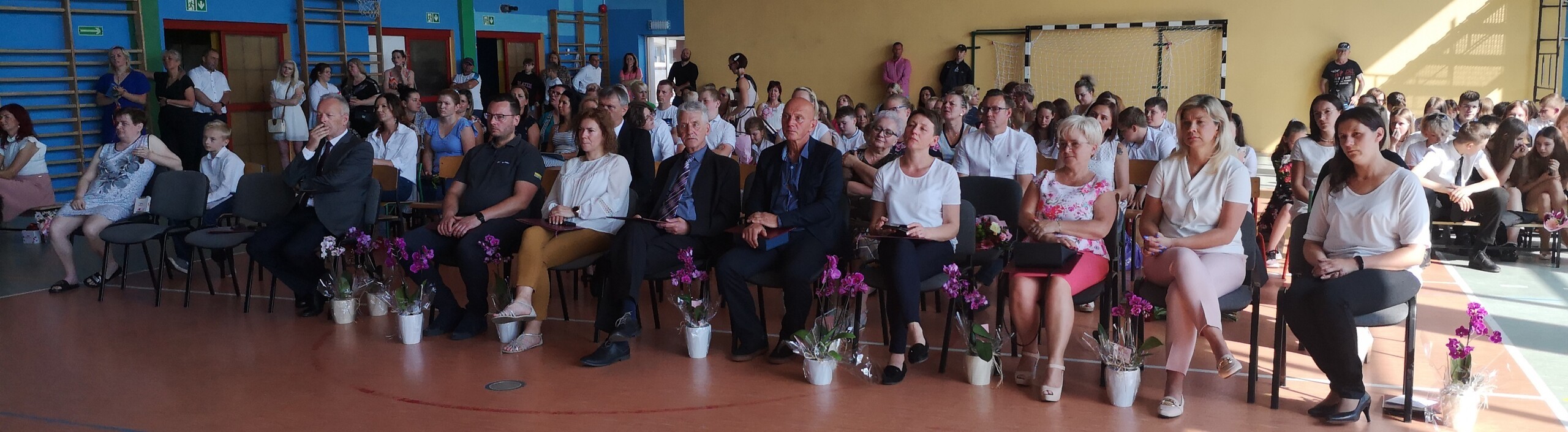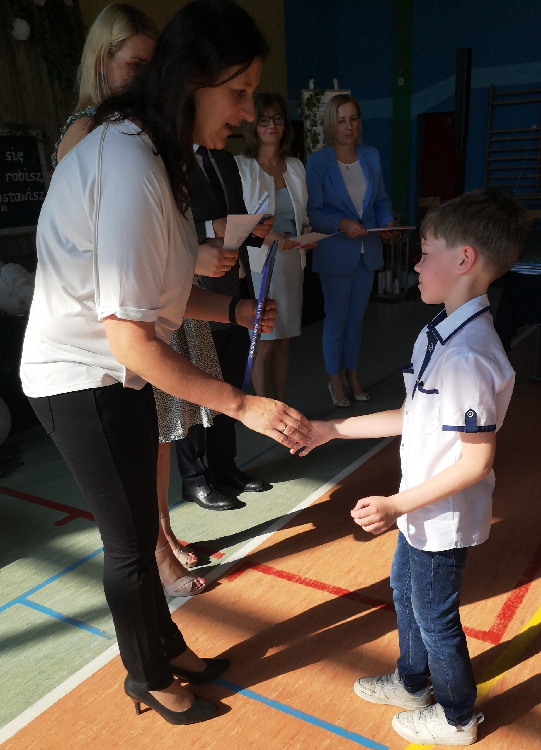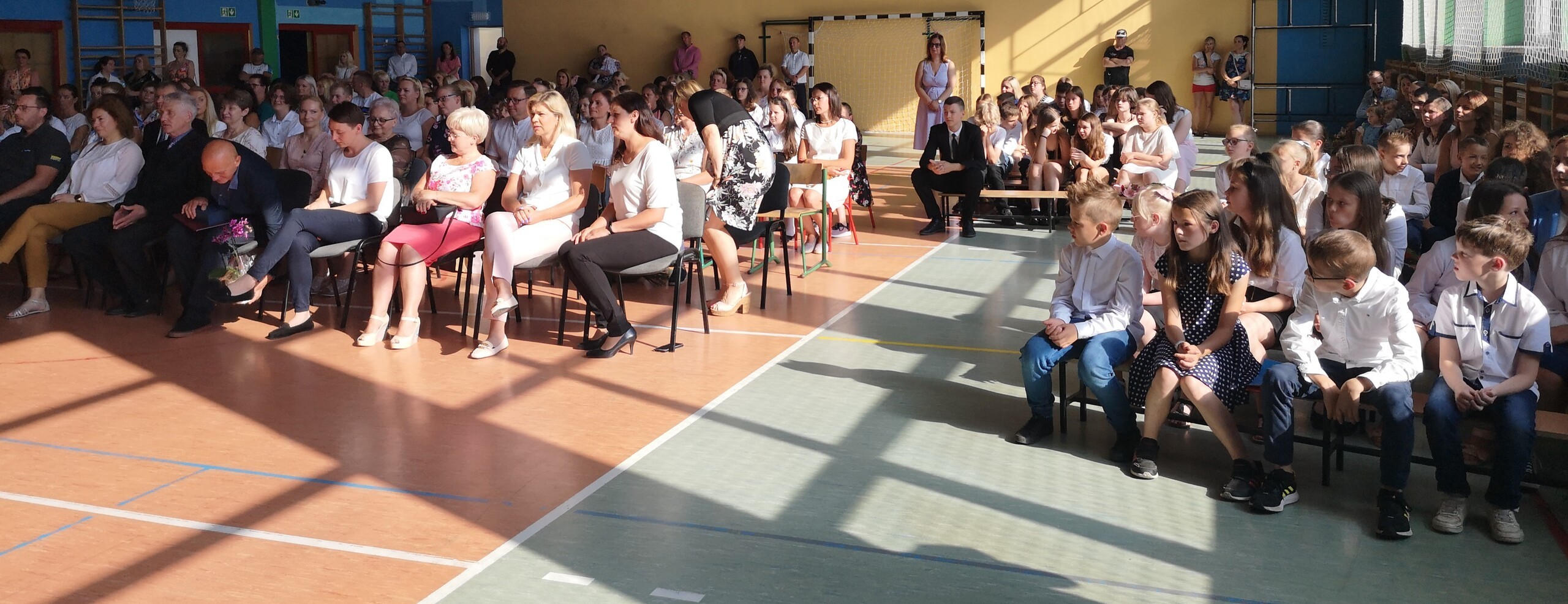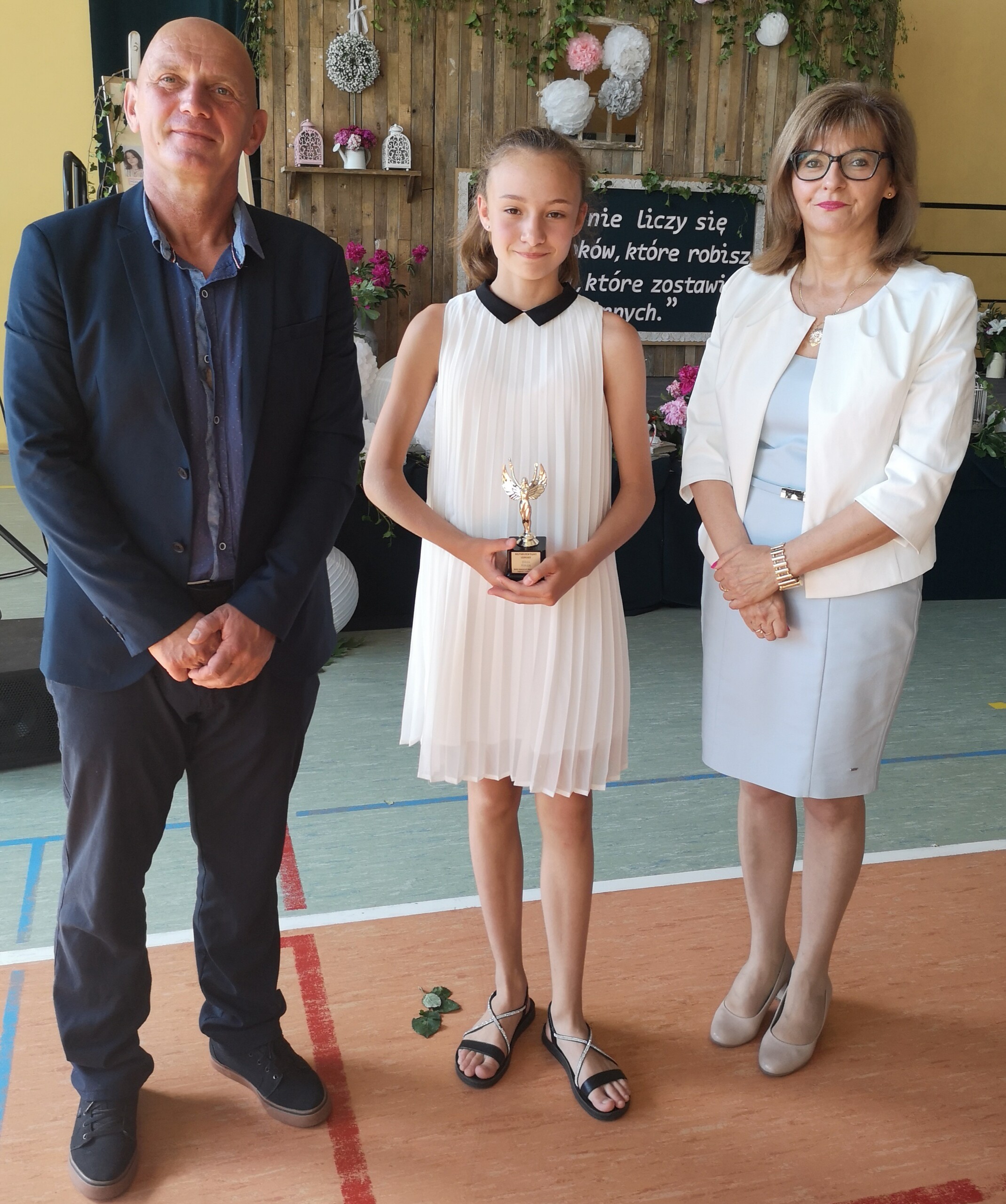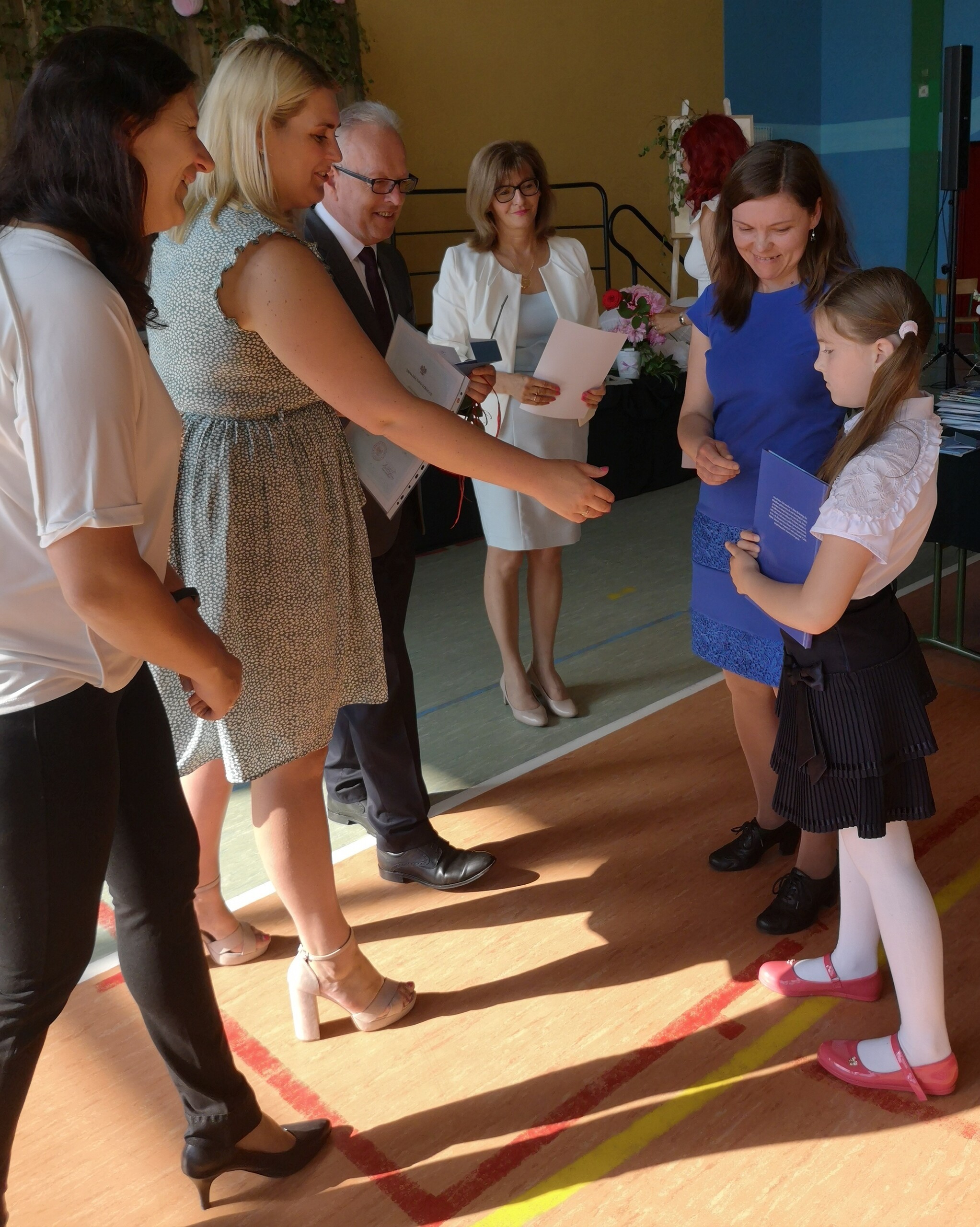 Po tej szczególnej chwili nastąpiło uroczyste wręczenie świadectw i nagród uczniom wyróżniającym się w nauce, listów gratulacyjnych i podziękowań dla rodziców oraz nagród laureatom konkursów szkolnych, gminnych, powiatowych i ogólnopolskich. Od wielu lat przyznajemy wyróżnienia wychowawcze. W tym roku szkolnym tytuł „Uczeń z klasą” otrzymała Alicja Stanuch z klasy VIIIa, „Reprezentant szkoły” otrzymali: Zofia Brokowska z klasy VII, Julia Folga z klasy VI i Pola Sterkowicz z klasy IV. Uczeń klasy VII Michał Twardowski za osiągnięcia sportowe, a przede wszystkim w Wojewódzkich Igrzyskach Młodzieży nagrodzony został tytułem „Sportowiec roku”. Na ten sam tytuł zasłużyła Alicja Stanuch za wybitne osiągnięcia na ogólnopolskich arenach sportowych. Wręczono również medale i puchary wyróżniającym się wolontariuszom i sportowcom.