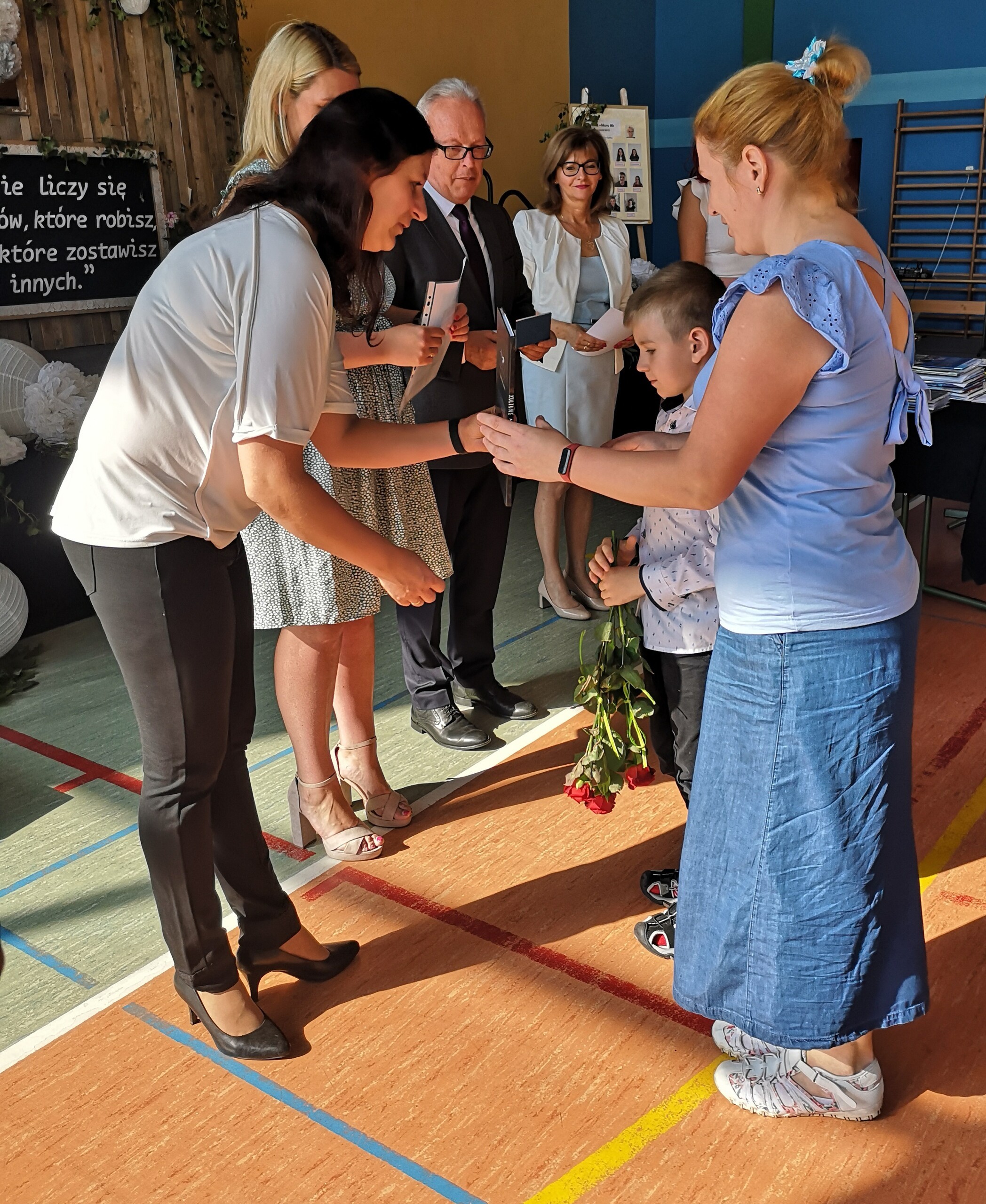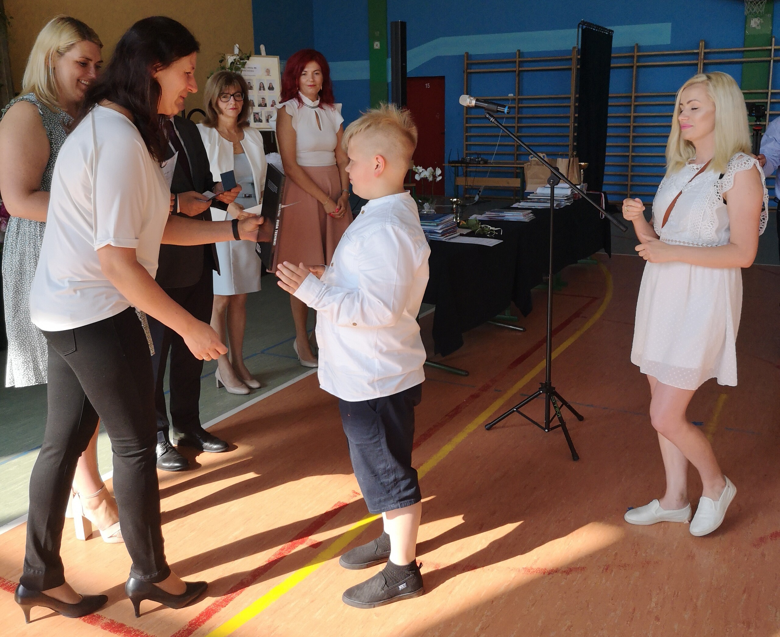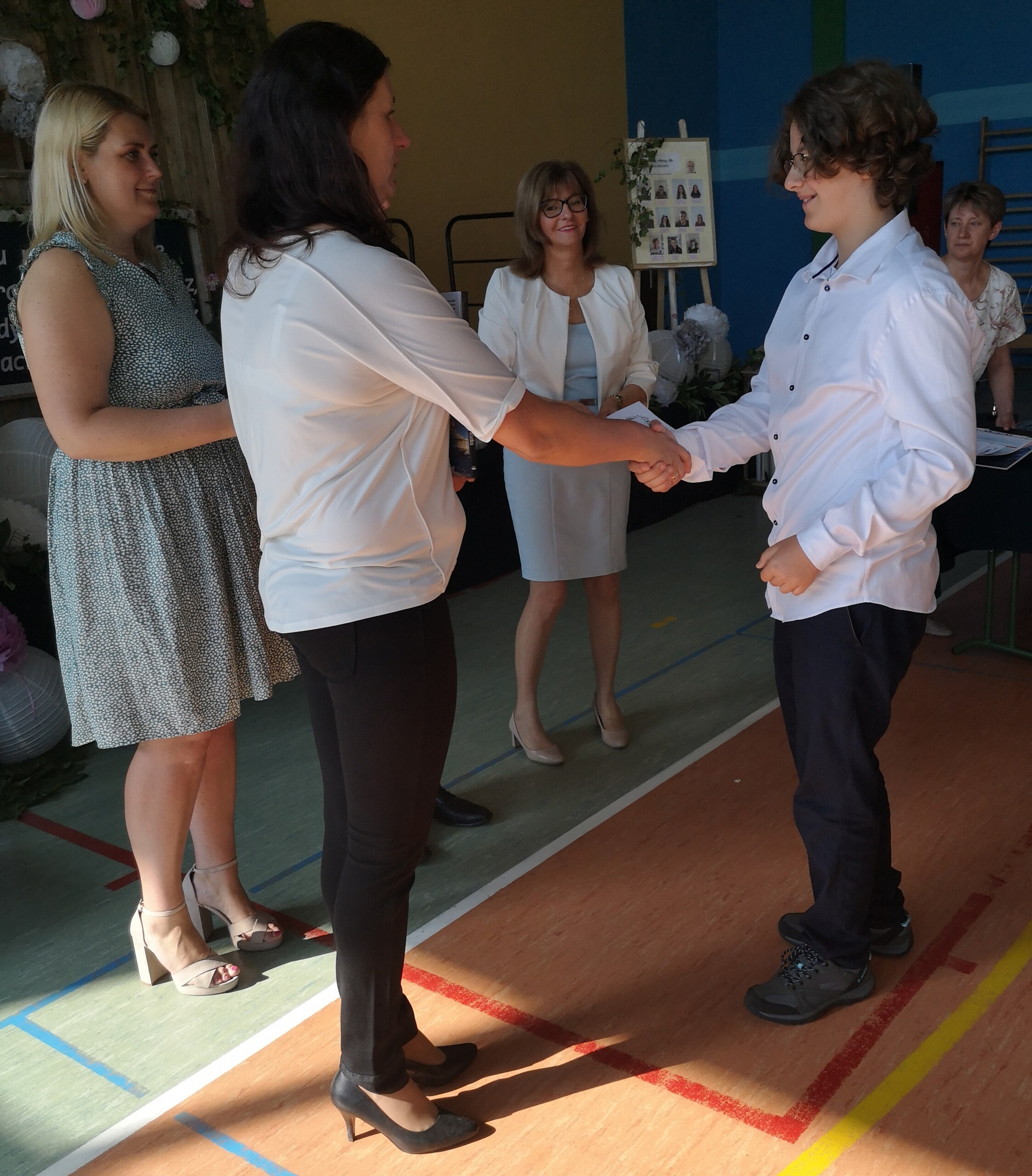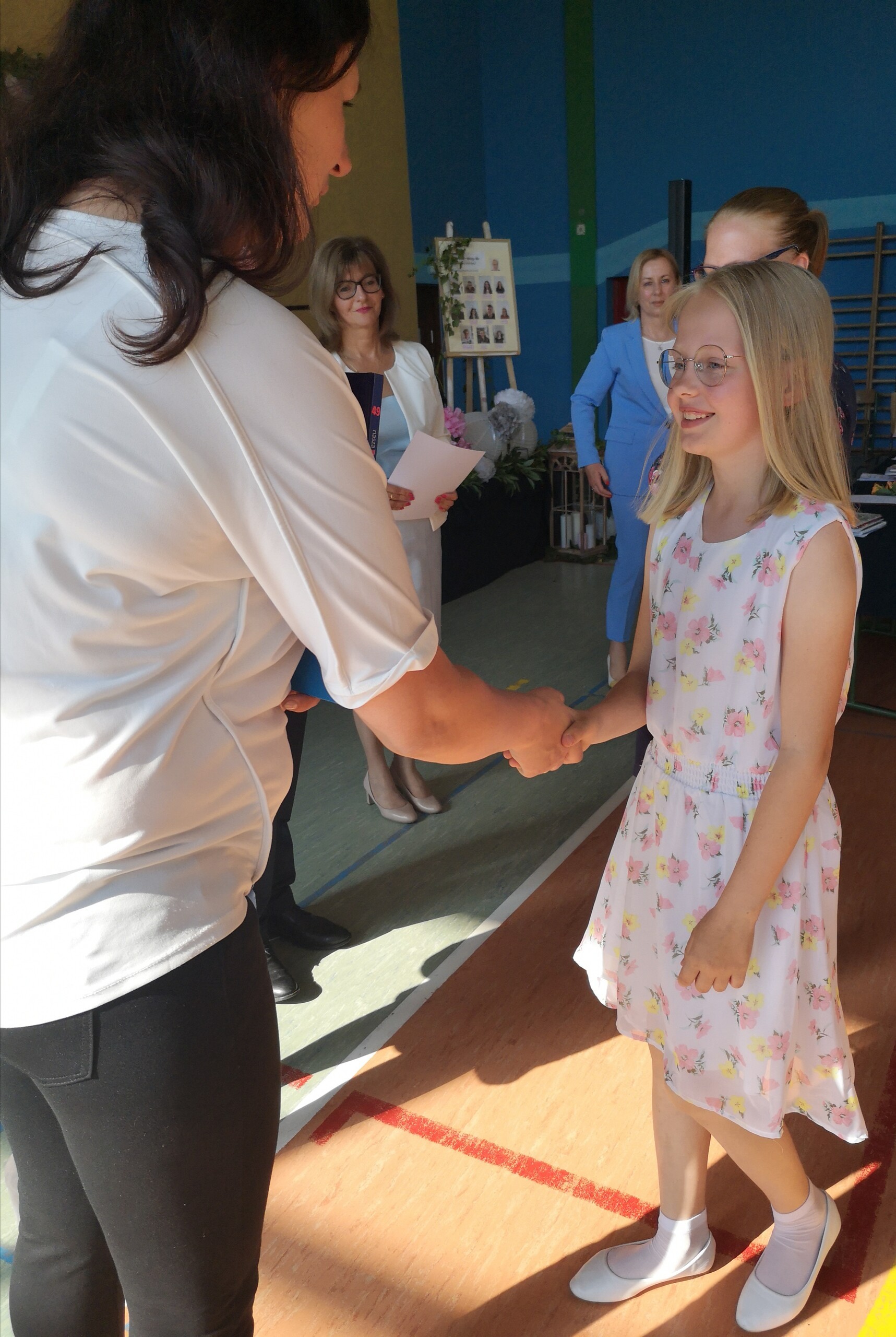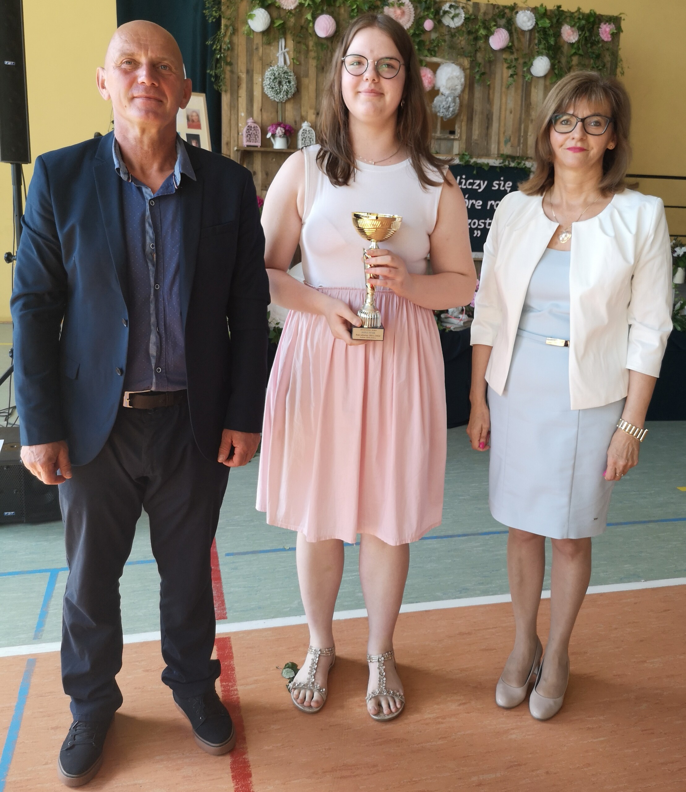 Po tej szczególnej chwili nastąpiło uroczyste wręczenie świadectw i nagród uczniom wyróżniającym się w nauce, listów gratulacyjnych i podziękowań dla rodziców oraz nagród laureatom konkursów szkolnych, gminnych, powiatowych i ogólnopolskich. Od wielu lat przyznajemy wyróżnienia wychowawcze. W tym roku szkolnym tytuł „Uczeń z klasą” otrzymała Alicja Stanuch z klasy VIIIa, „Reprezentant szkoły” otrzymali: Zofia Brokowska z klasy VII, Julia Folga z klasy VI i Pola Sterkowicz z klasy IV. Uczeń klasy VII Michał Twardowski za osiągnięcia sportowe, a przede wszystkim w Wojewódzkich Igrzyskach Młodzieży nagrodzony został tytułem „Sportowiec roku”. Na ten sam tytuł zasłużyła Alicja Stanuch za wybitne osiągnięcia na ogólnopolskich arenach sportowych. Wręczono również medale i puchary wyróżniającym się wolontariuszom i sportowcom.