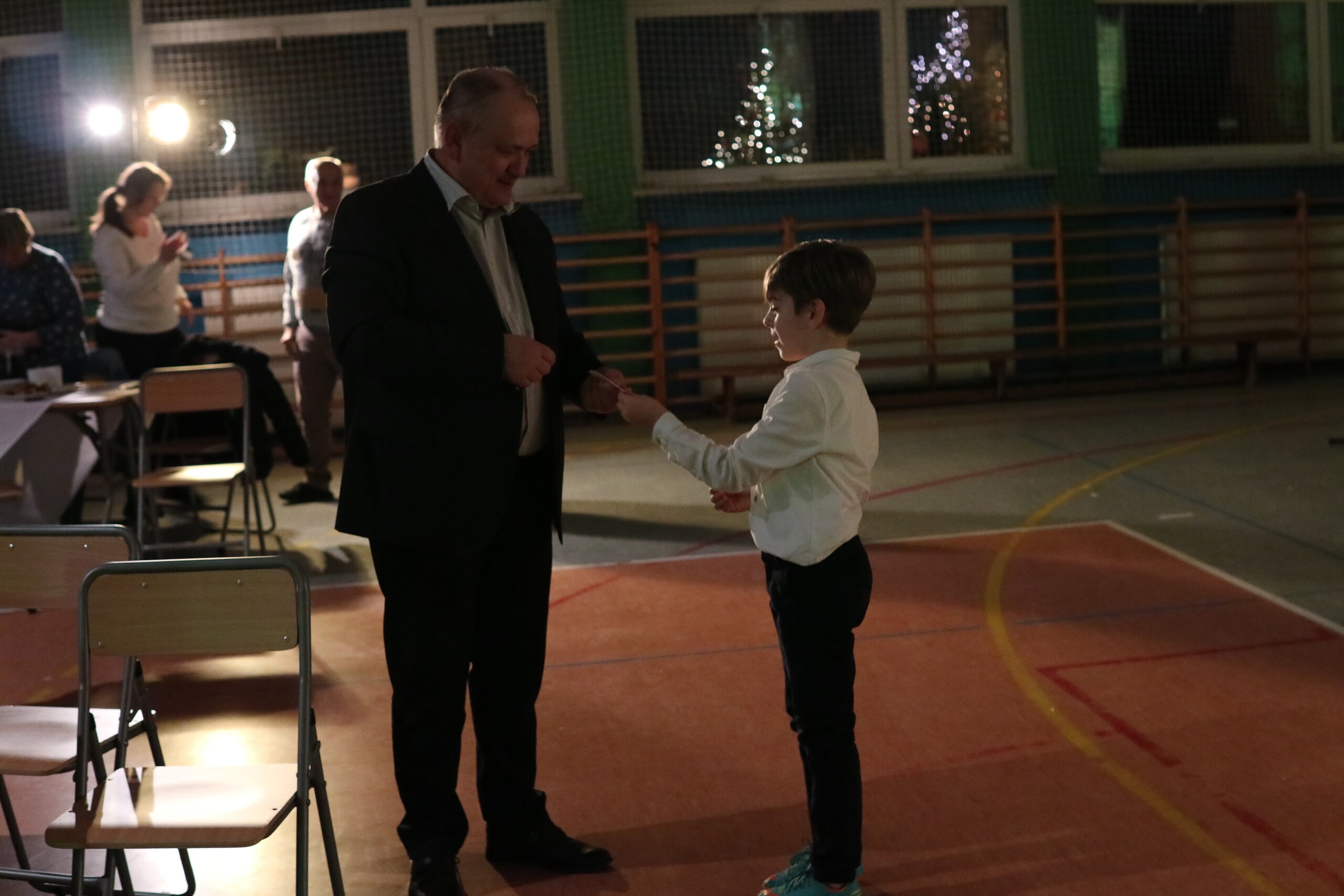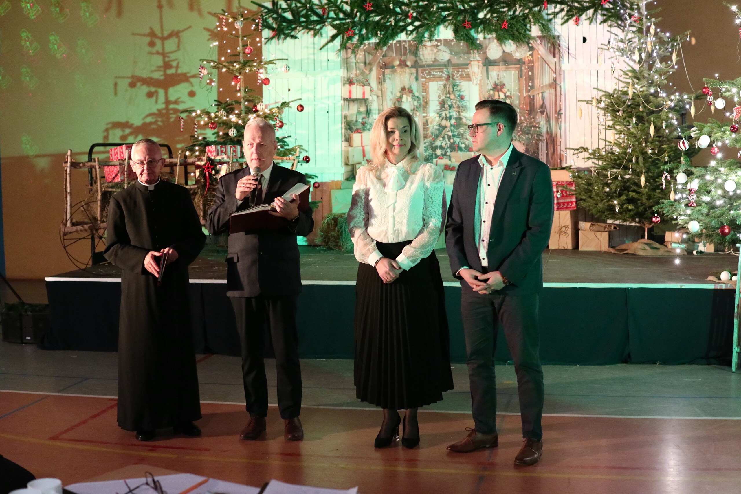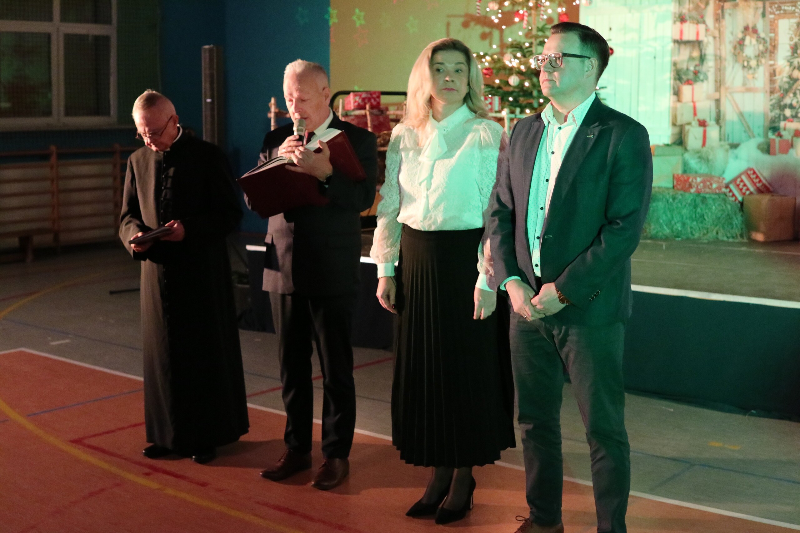 Spotkanie rozpoczęło się od Ewangelii Św. Łukasza o Narodzeniu Pańskim, którą przeczytał dyrektor Krzysztof Wojtysiak, świąteczną modlitwę odmówił ks. proboszcz Janusz Góral, a życzenia świąteczne i noworoczne złożyli sołtys Łebienia Adam Folga, przewodnicząca Rady Rodziców ZS w Łebieniu Justyna Wilga, ks. proboszcz Janusz Góral i dyrektor szkoły Krzysztof Wojtysiak.