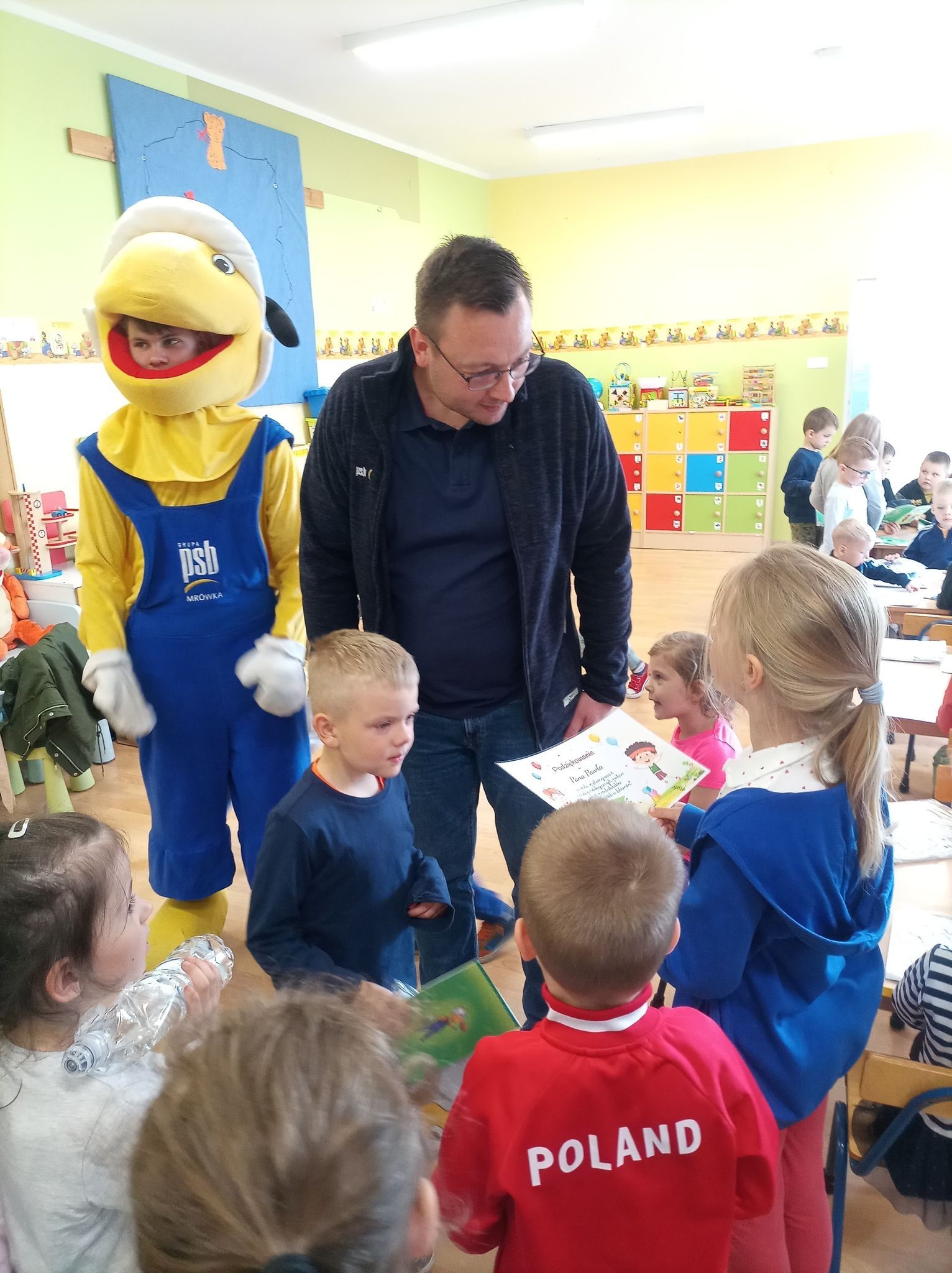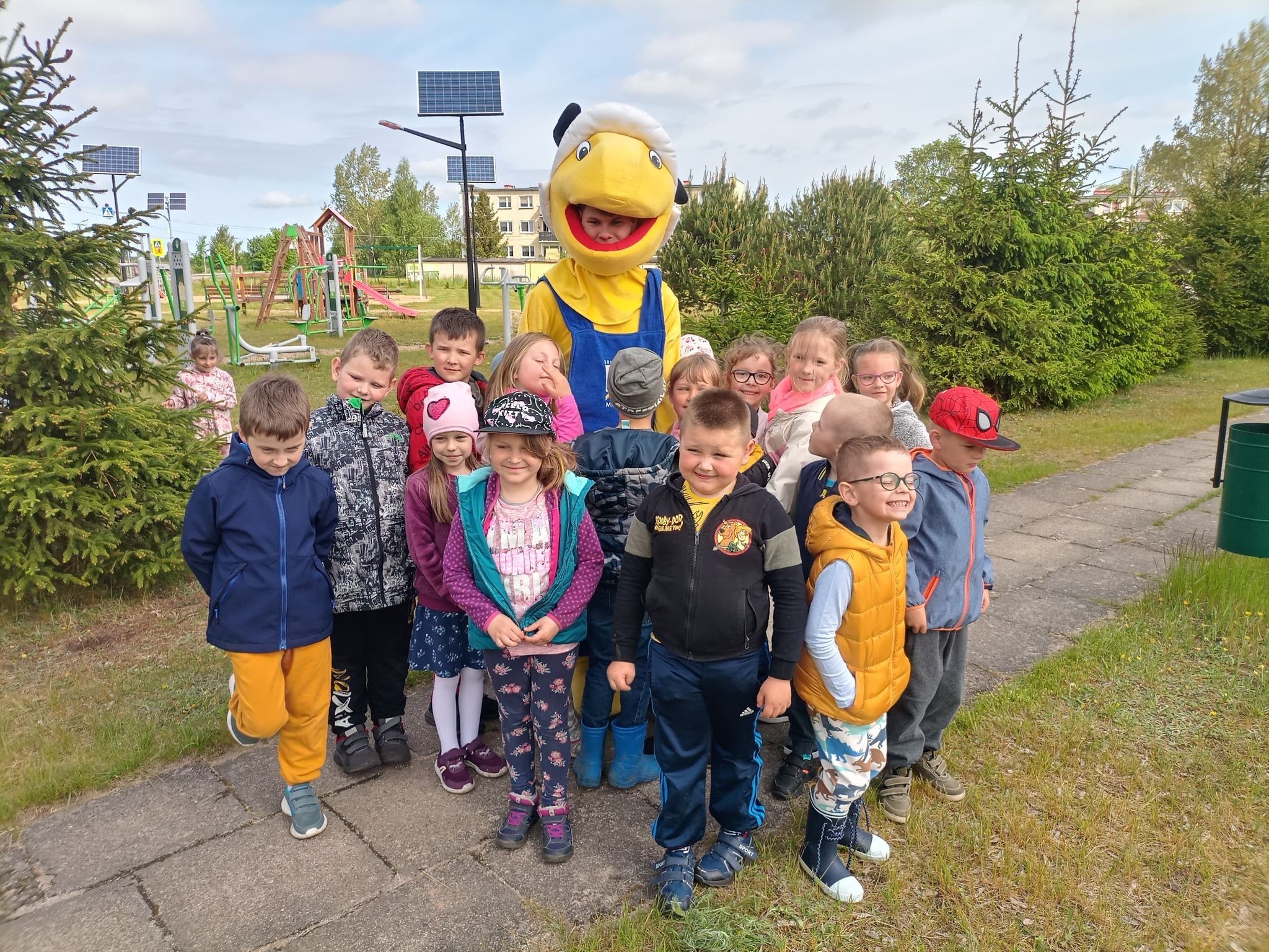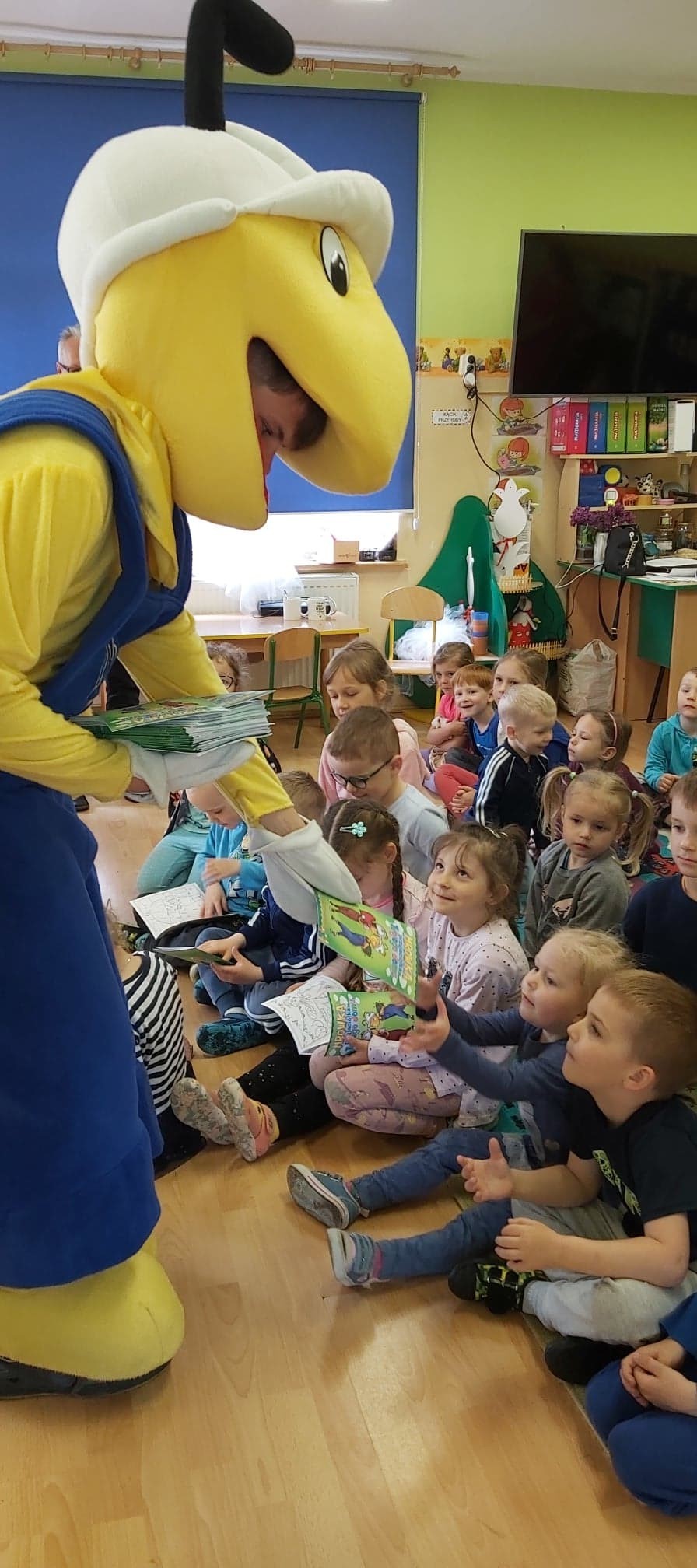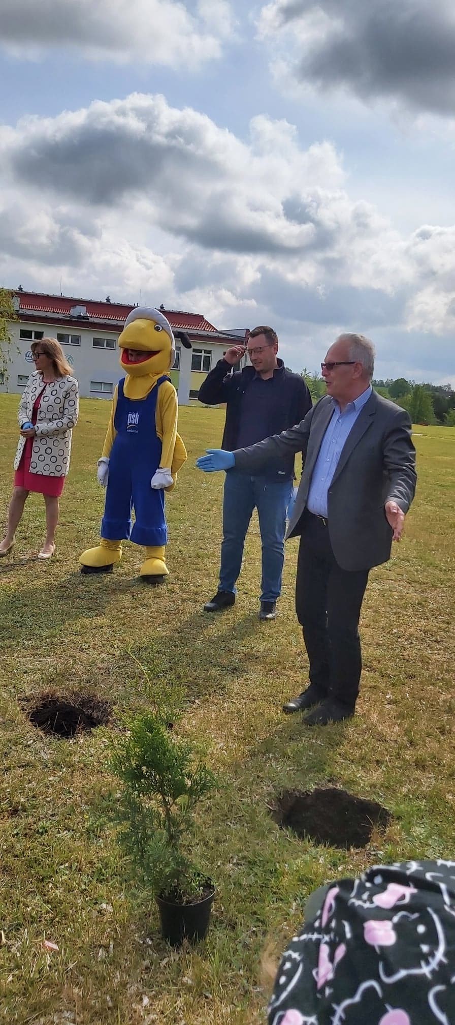 25 maja 2022r. w związku z akcją „Wiosna w przedszkolu” naszych przedszkolaków odwiedził niezwykły gość, Mrówka - maskotka ze sklepu PSB w Lęborku. Spotkanie z nim odbyło się na zewnątrz szkoły, gdyż ta bardzo miła wizyta miała wydźwięk ekologiczny. Dzieci wspólnie z Mrówką, panem Pawłem Benasiewiczem kierownikiem PBS Mrówka w Lęborku, panem dyrektorem i panią wicedyrektor sadziły drzewka, które podarował nam nasz gość. Wszystkie dzieci chętnie pomagały i każdy chciał mieć swój udział w tej pięknej akcji. Na koniec po wspólnej pracy Mrówka oraz pan Paweł Benasiewicz wręczyli każdemu dziecku koszulkę i kolorowankę, co także sprawiło dzieciom wiele radości.
