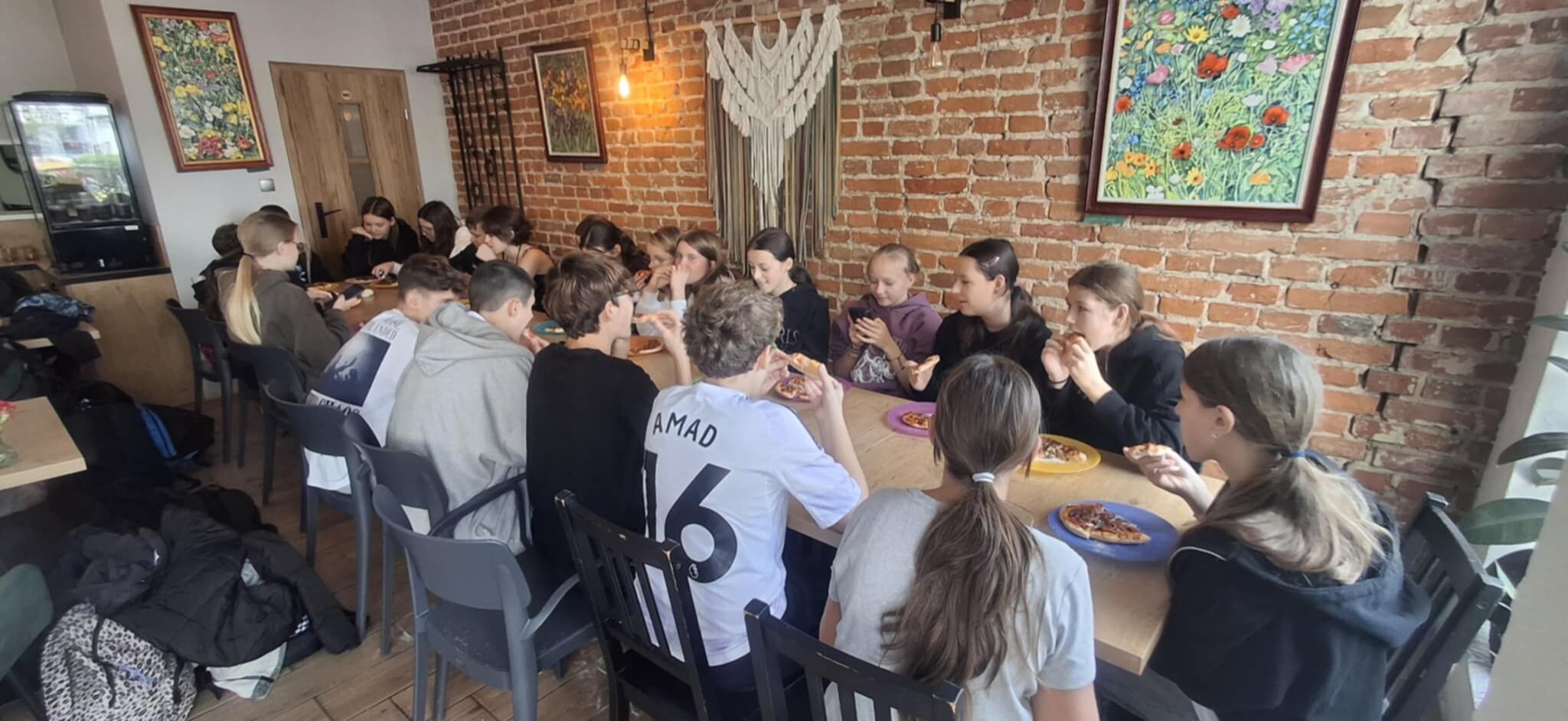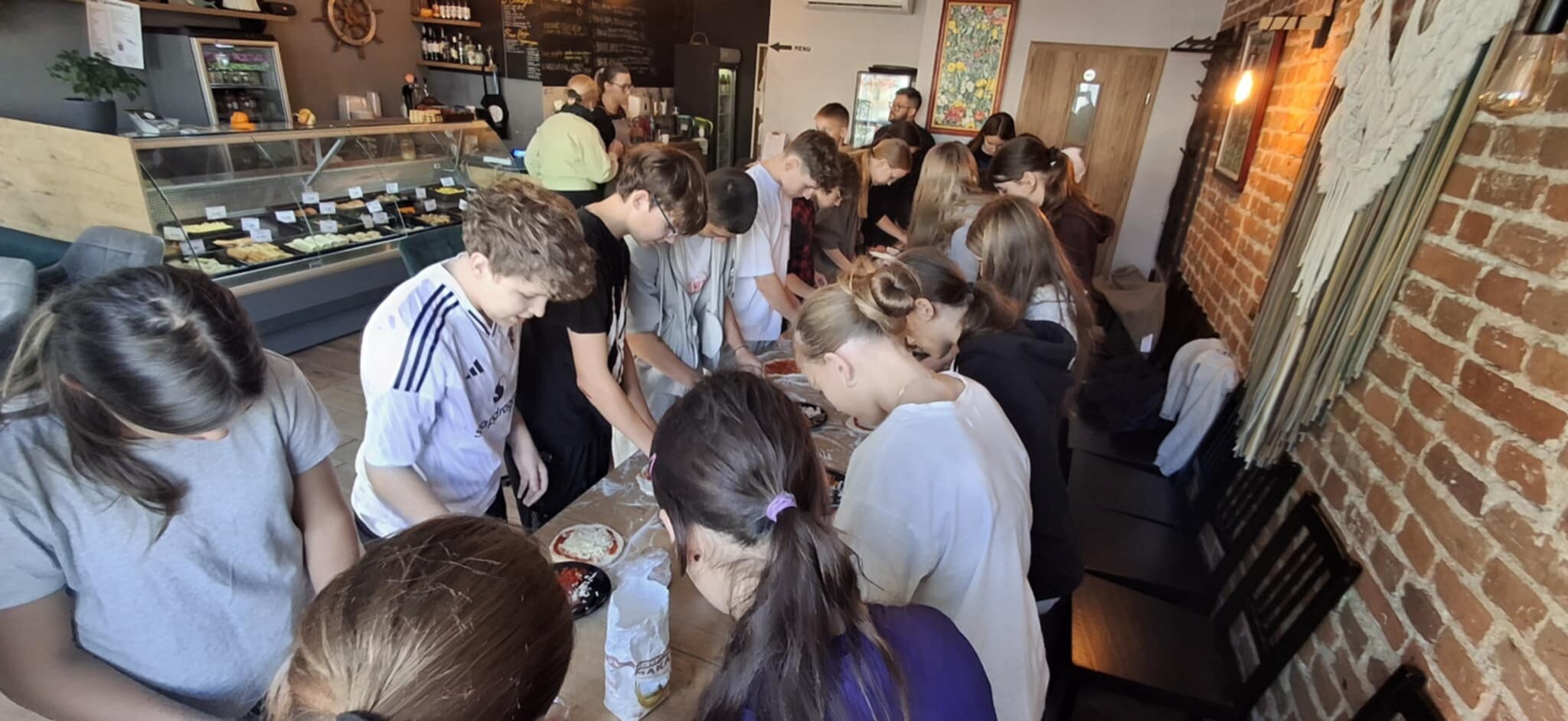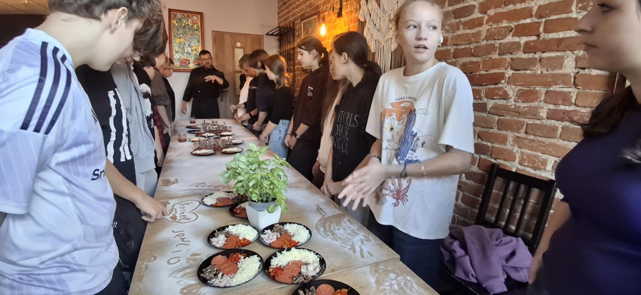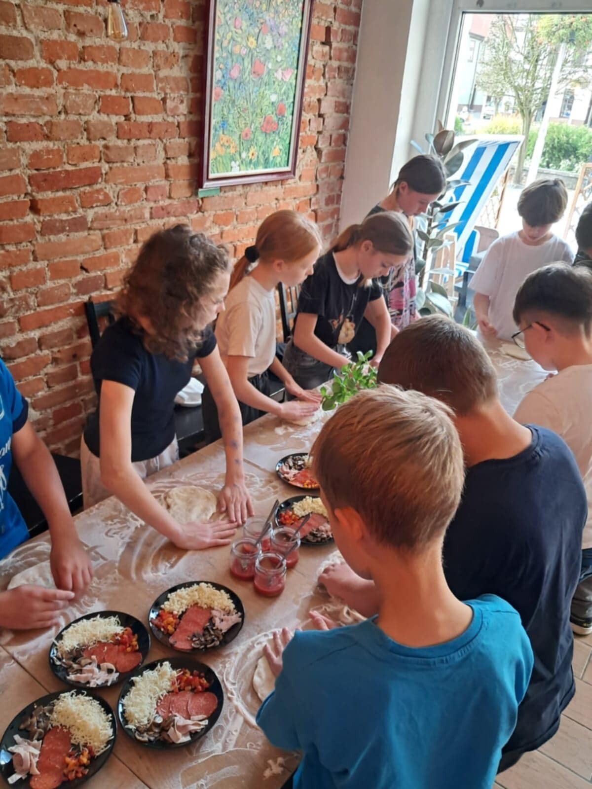 Ostatnim punktem wycieczki były warsztaty kulinarne w pizzerii . Na wstępie kucharz opowiedział uczniom historię pochodzenia pizzy oraz przedstawił sposób jej przygotowania. Po krótkim instruktażu dzieci zabrały się do robienia swoich własnych pizz. Pod bacznym okiem pracowników restauracji uczniowie formowali ciasto, smarowali je sosem, następnie komponowali dodatki według własnego smaku. Na koniec każda pizza została posypana serem. Dzieci poważnie potraktowały powierzone im zadanie i z wielkim skupieniem wykonywały swoją pracę. Po upieczeniu przystąpiły do degustacji. Wszystkie wypieki smakowały doskonale!