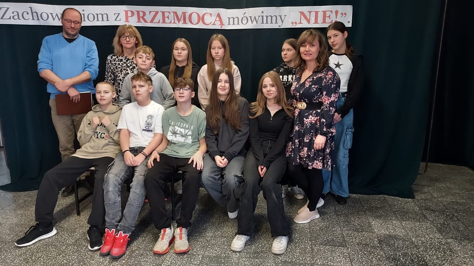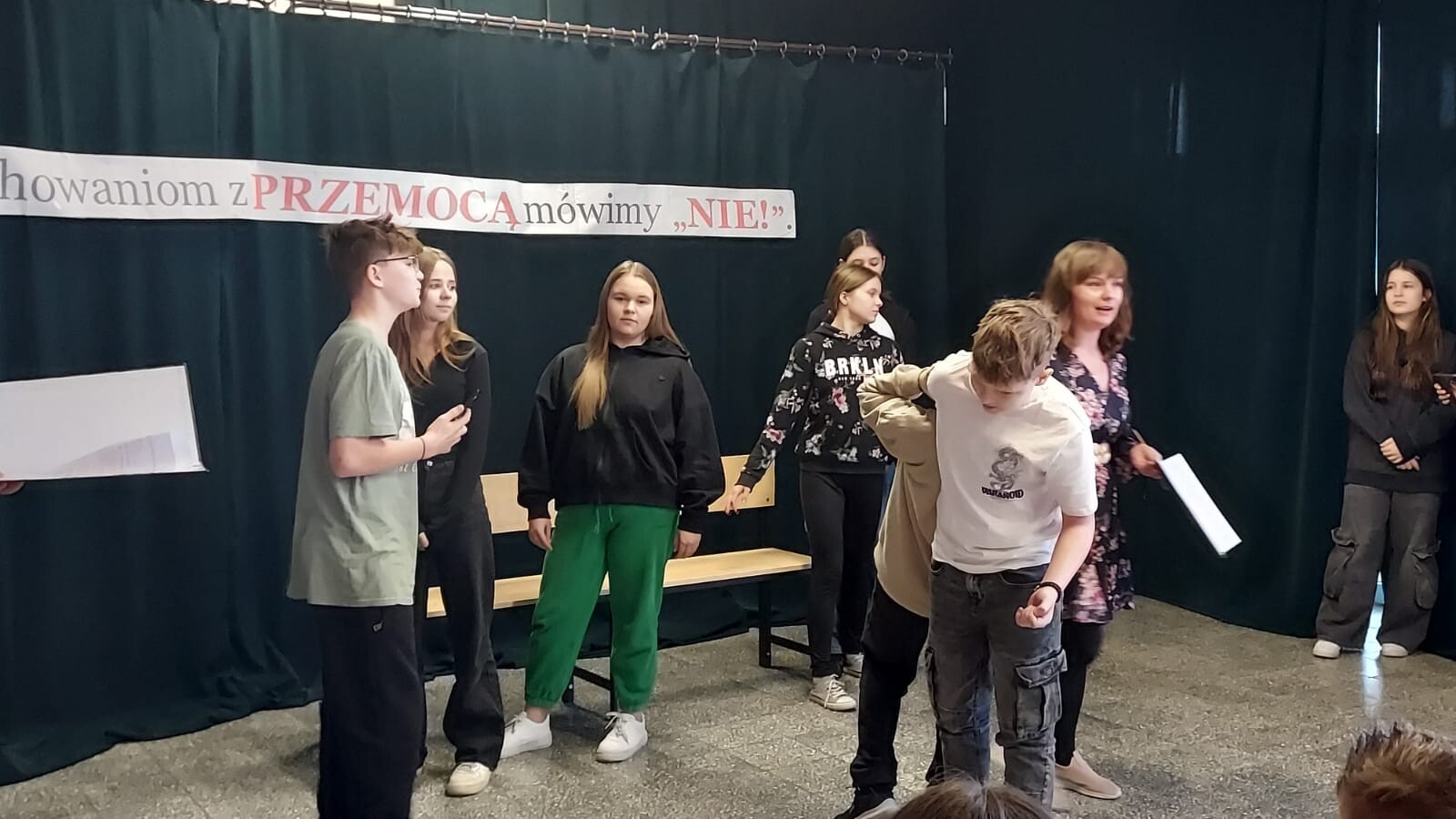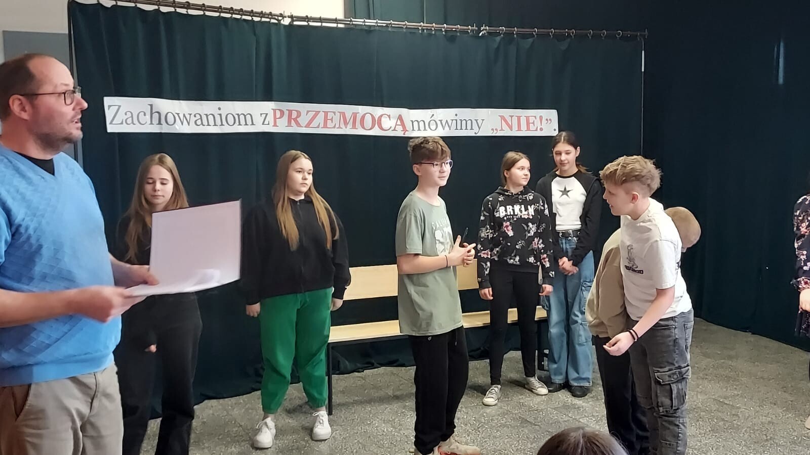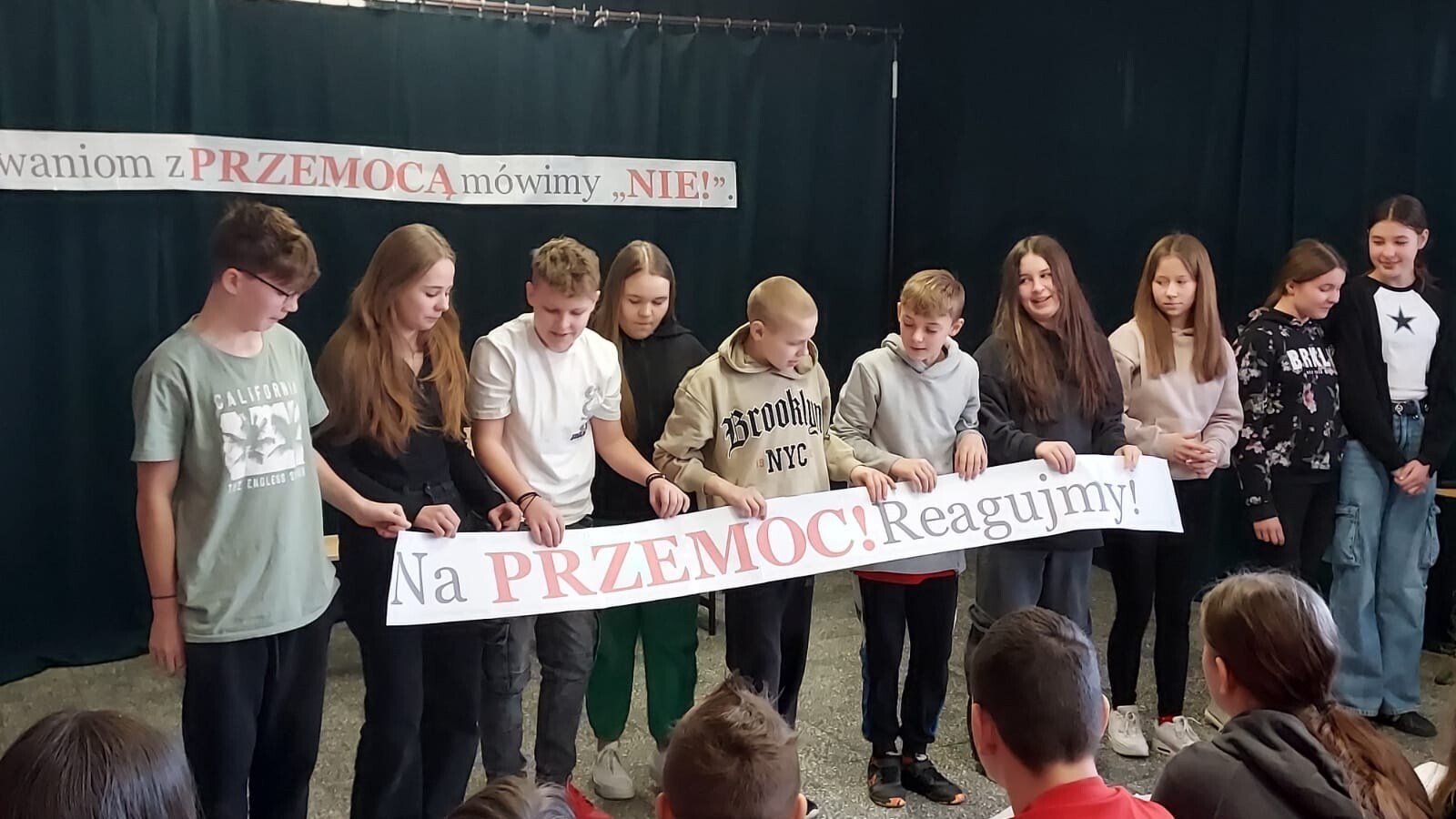 W ramach działań przeciwdziałania przemocy i nienawiści wśród młodzieży z inicjatywy uczniów klasy VII w naszej szkole, odbył się apel, podczas którego młodzież przedstawiła spektakl pod hasłem „Zachowaniom z PRZEMOCĄ mówimy NIE”. Celem przedstawienia było zwrócenie uwagi odbiorców na przemoc w różnych jej postaciach oraz na konsekwencje stosowania jej wobec innych. Ważnym elementem poruszonym podczas przedstawienia była postać podżegacza do przemocy. Wszyscy uczestnicy spektaklu dowiedzieli się, że ważne jest reagowanie na przemoc w sposób właściwy, a brak reakcji nie jest dobrym rozwiązaniem. Spektakl przeplatał się z żywą dyskusją wszystkich uczestników wydarzenia. Punktem kulminacyjnym były przesłania od klasy VII dla reszty uczniów naszej szkoły, a jedno z ważniejszych to: „Bądźmy dla siebie mili i wzajemnie się szanujmy!”.