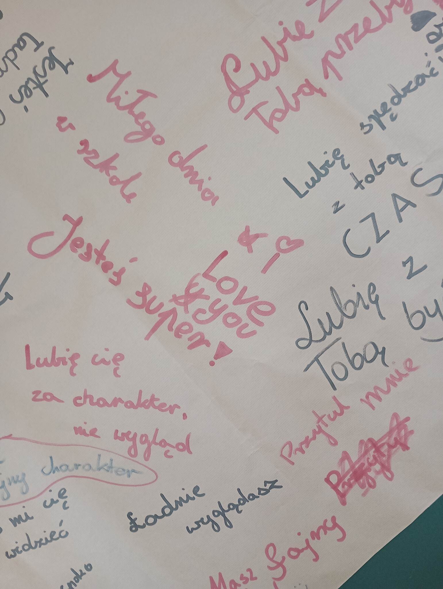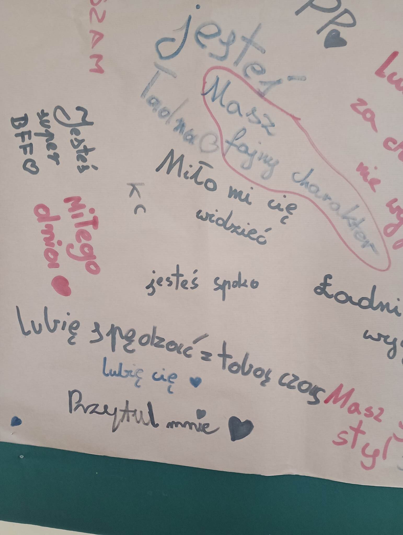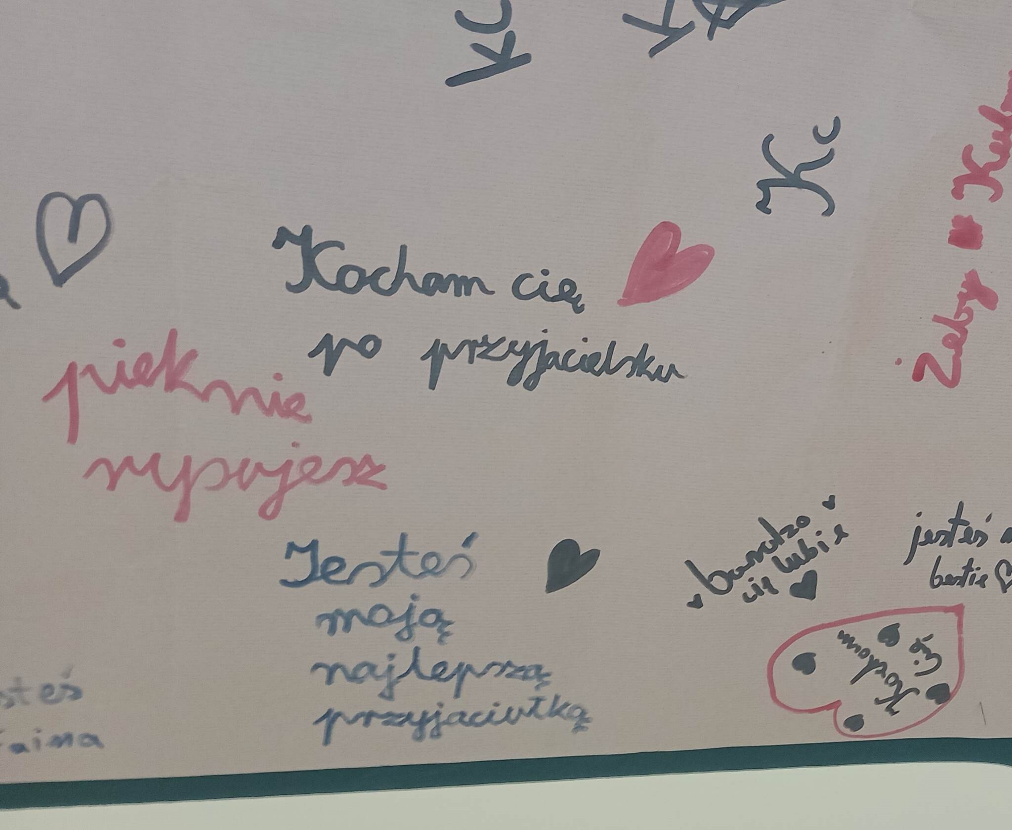 Na lekcji wychowawczej uczniowie klasy czwartej pracowała nad tematem bycia miłym dla innych. Każdy miał okazję dopisać jakiś tekst, który byłoby mu miło od kogoś usłyszeć. Na koniec powstał spory zbiór miłych słów. Uczymy się być dla siebie miłymi, żeby świat był piękniejszy.