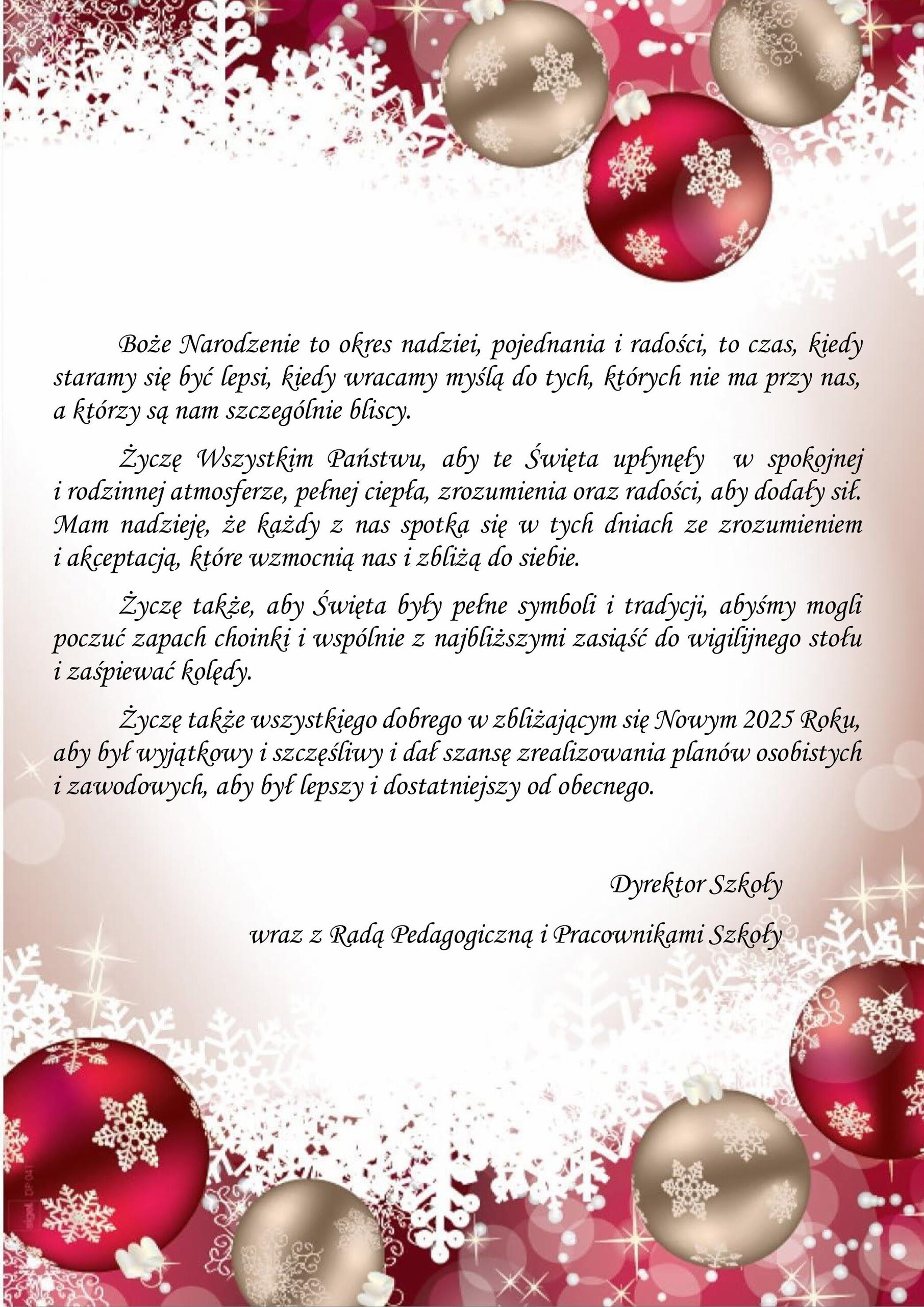 Życzę także wszystkiego dobrego w zbliżającym się Nowym 2025 Roku, aby był wyjątkowy i szczęśliwy i dał szansę zrealizowania planów osobistych i zawodowych, aby był lepszy i dostatniejszy od obecnego.