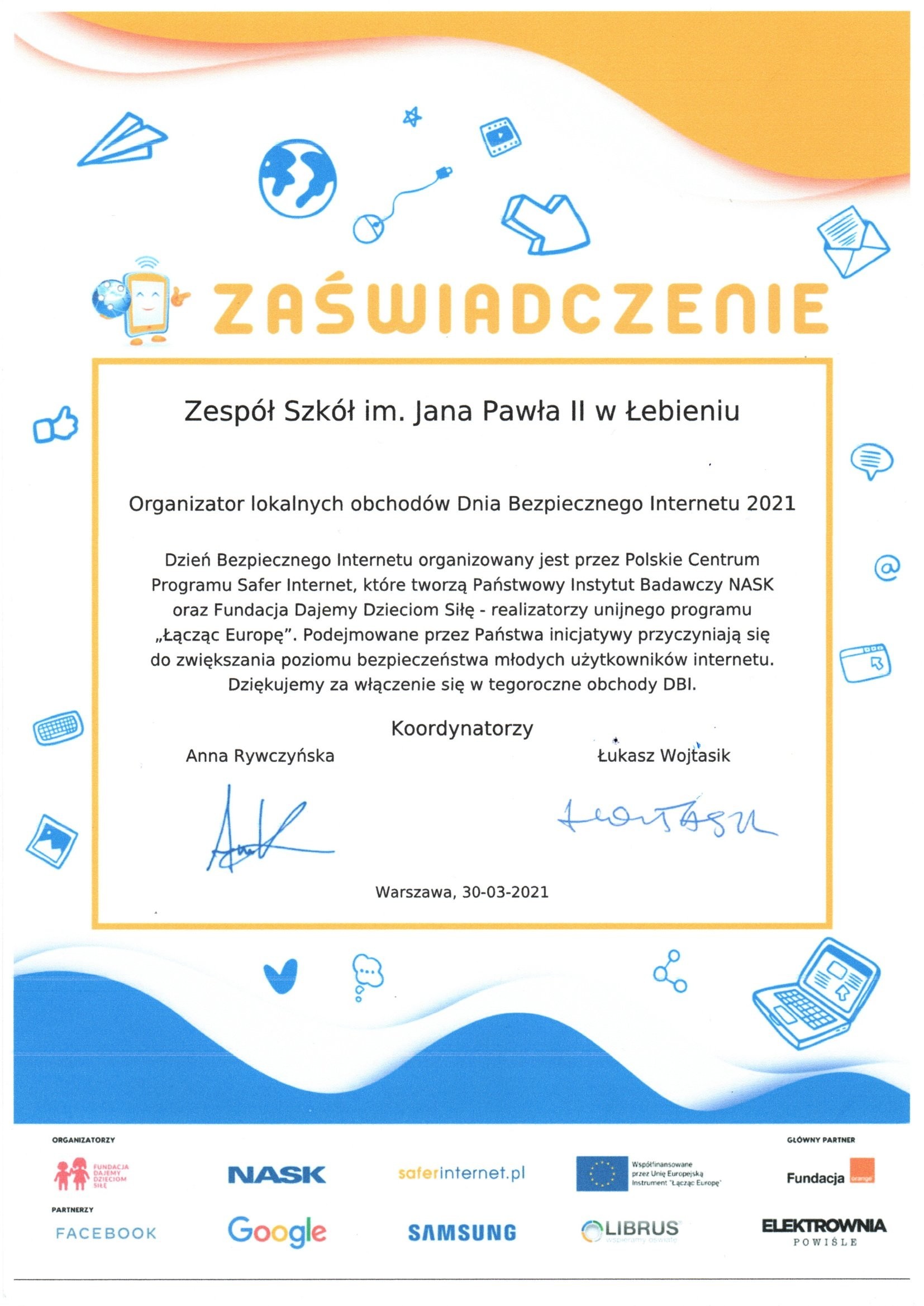 Jesteśmy dumni z tego, że zostaliśmy organizatorami lokalnych obchodów Dnia Bezpiecznego Internetu 2021. Dołożymy wszelkich starań, by nasza młodzież bezpiecznie korzystała z komunikatorów i Internetu.