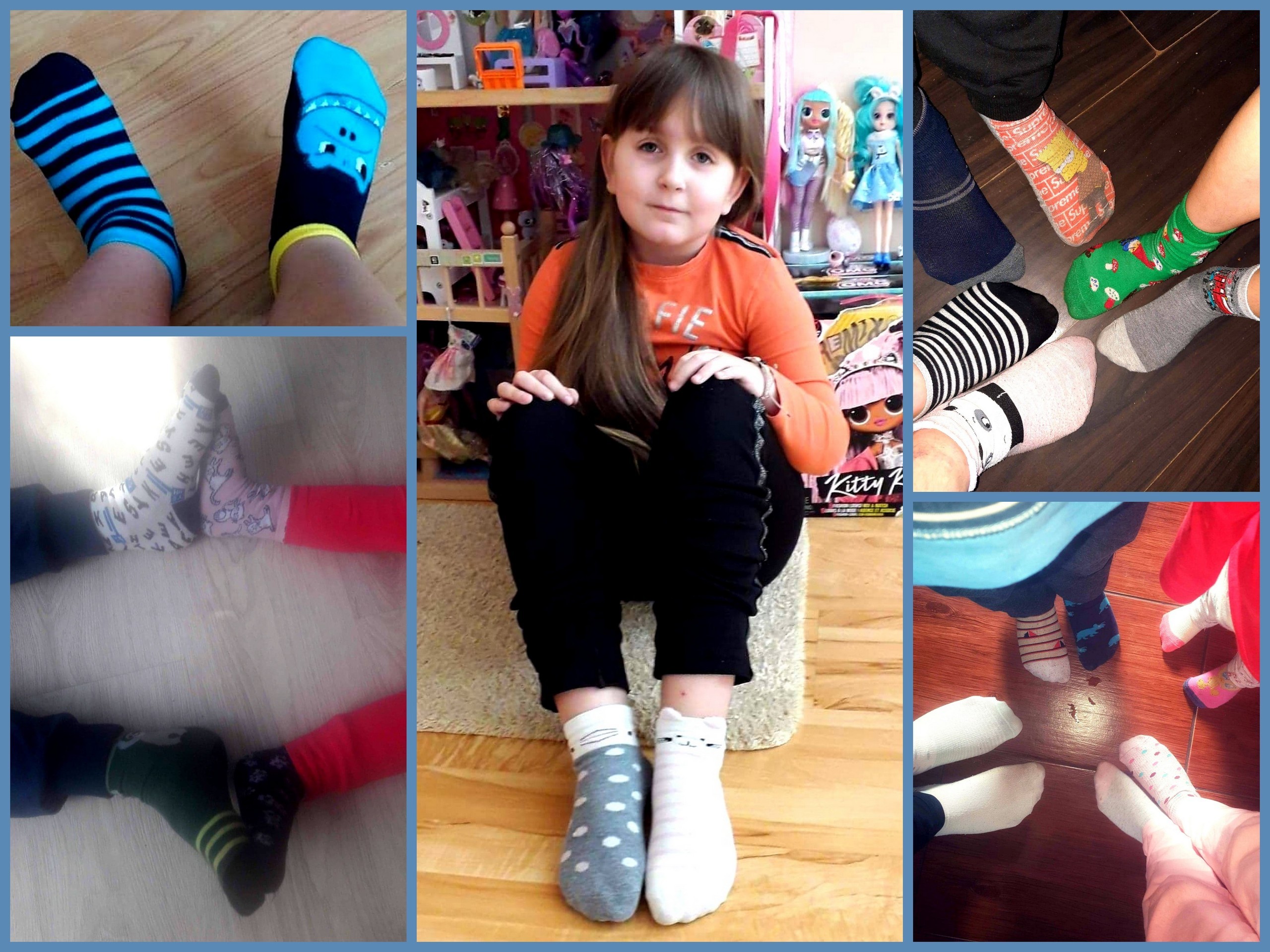 Uczniowie klas 1 - 3 obejrzeli prezentację, której celem było zwiększenie ich świadomości o funkcjonowaniu osób z Zespołem Downa. Dzieci chętnie przyłączyły się do akcji i przysłały zdjęcia swoich stóp w kolorowych skarpetkach.