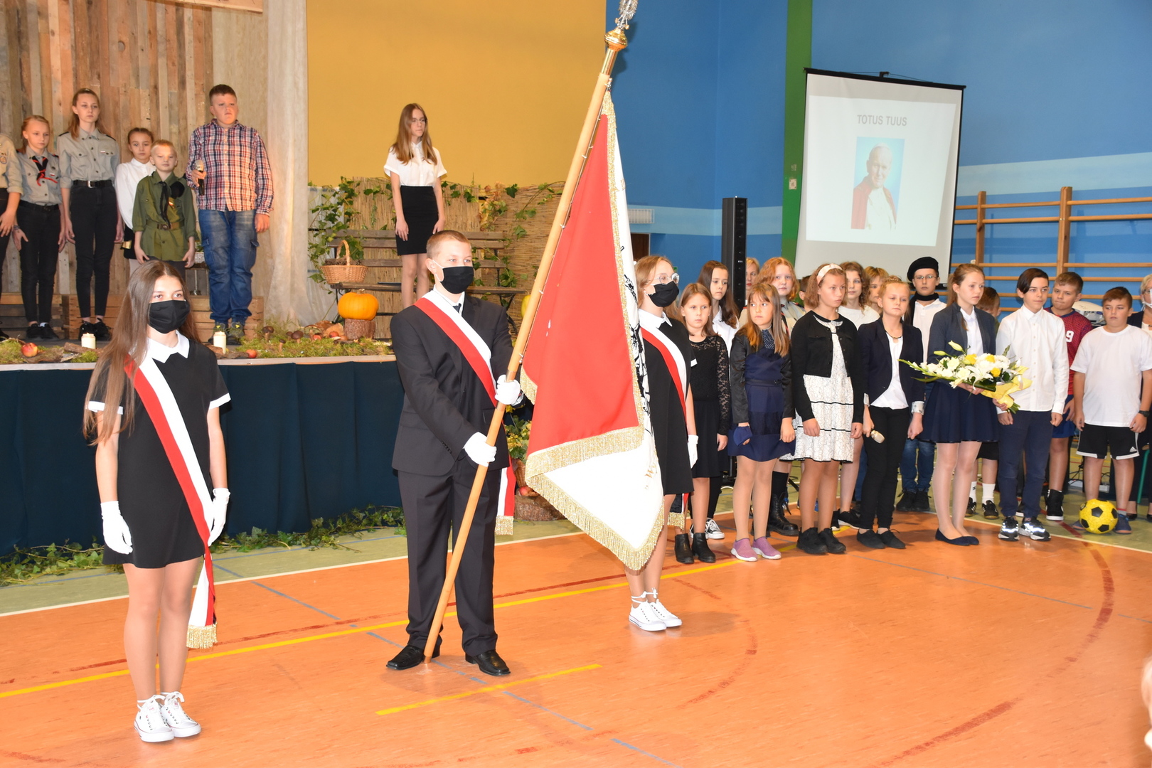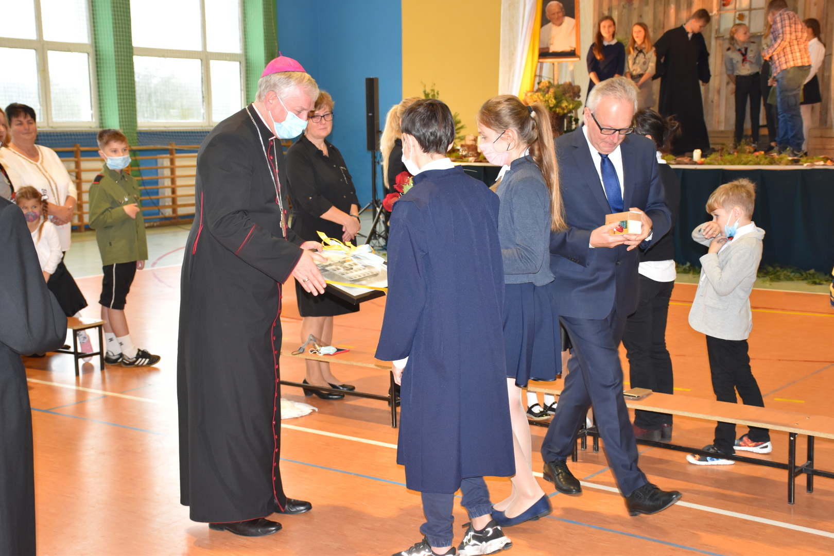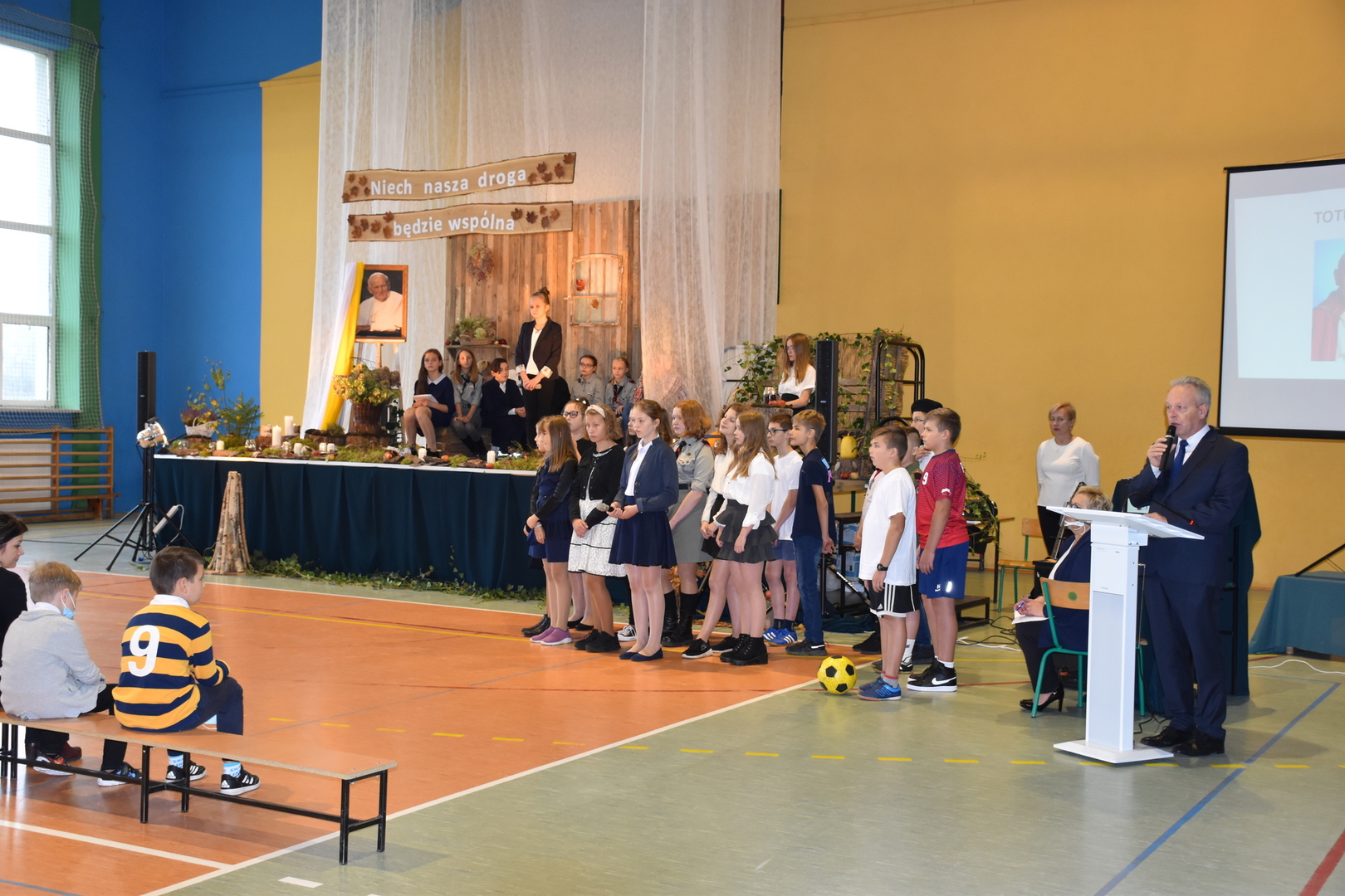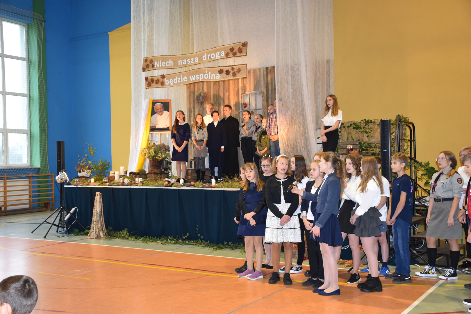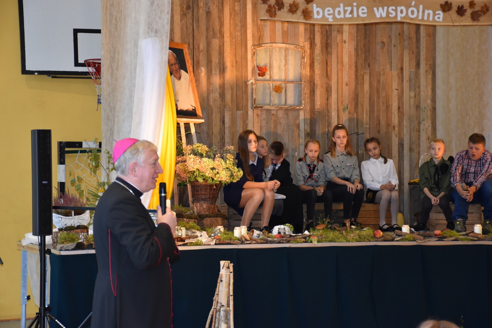 Uczniowie klas V-VIII przygotowali występ w postaci zbiórki harcerskiej, która dedykowana była świętemu Janowi Pawłowi II. Naświetlili jego życiorys, a opowieści biograficzne przeplatane były wierszami, fragmentami różnych powiedzeń Karola Wojtyły oraz piosenkami. Wspólnie zaśpiewaliśmy pieśń „Barkę” w podziękowaniu dla Wielkiego Rodaka, który zawsze wskazywał drogę, którą mamy kroczyć ku temu, co dobre i piękne. Następnie głos zabrał pan dyrektor, który podziękował wszystkim za przygotowanie uroczystości i poprosił o zabranie głosu księdza biskupa Ryszarda Kasynę. Przekonywał on, że powinniśmy być dymni, z takiego patrona. Biskup opowiadał o swojej młodości, o tym jak on sam był uczniem. Odpowiadał na liczne pytania naszych uczniów.