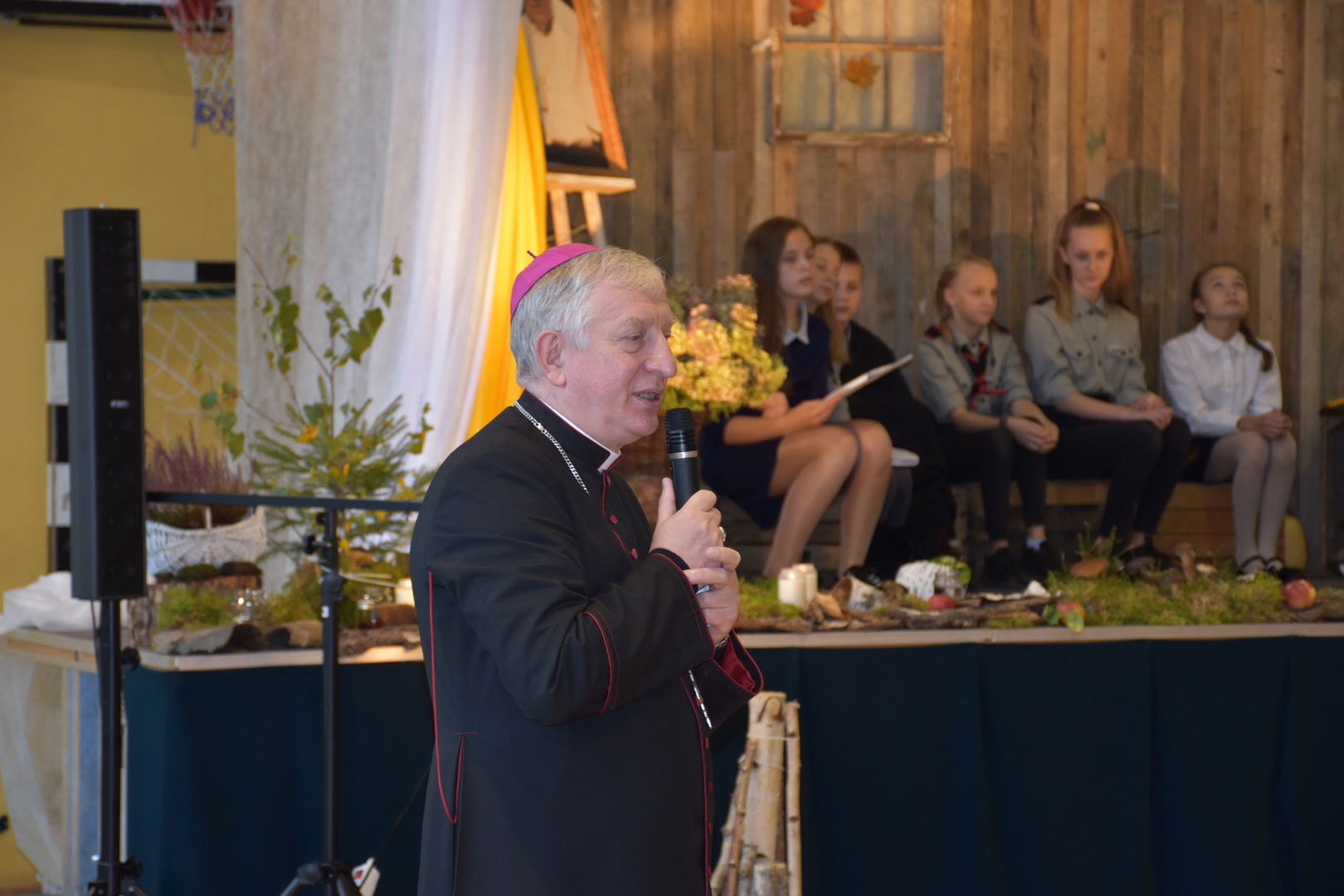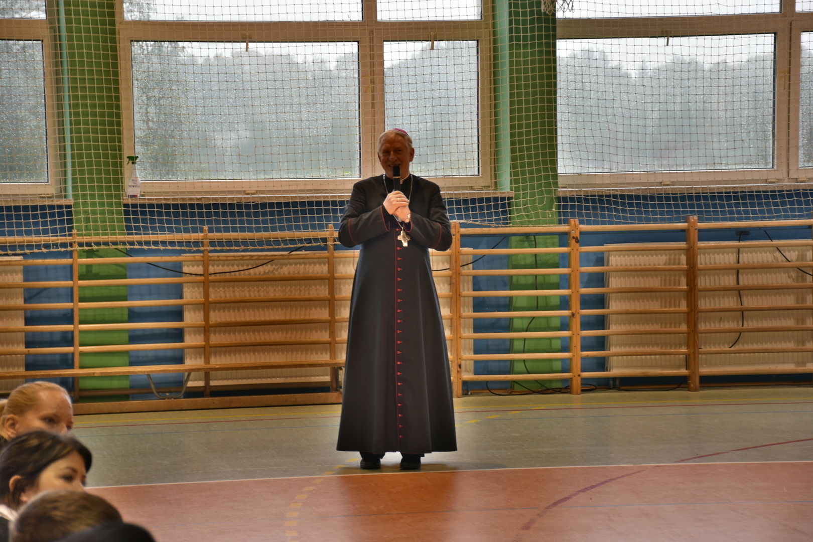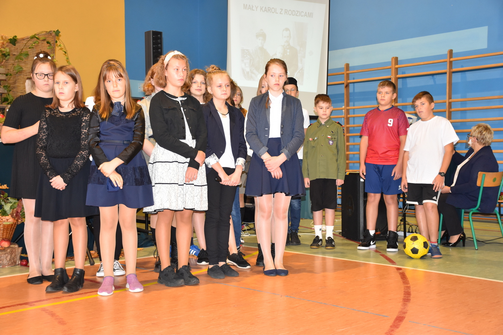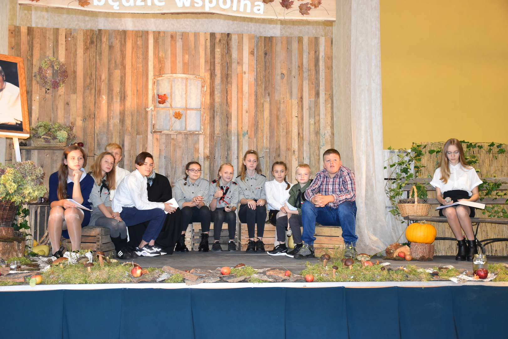 Uczniowie klas V-VIII przygotowali występ w postaci zbiórki harcerskiej, która dedykowana była świętemu Janowi Pawłowi II. Naświetlili jego życiorys, a opowieści biograficzne przeplatane były wierszami, fragmentami różnych powiedzeń Karola Wojtyły oraz piosenkami. Wspólnie zaśpiewaliśmy pieśń „Barkę” w podziękowaniu dla Wielkiego Rodaka, który zawsze wskazywał drogę, którą mamy kroczyć ku temu, co dobre i piękne. Następnie głos zabrał pan dyrektor, który podziękował wszystkim za przygotowanie uroczystości i poprosił o zabranie głosu księdza biskupa Ryszarda Kasynę. Przekonywał on, że powinniśmy być dymni, z takiego patrona. Biskup opowiadał o swojej młodości, o tym jak on sam był uczniem. Odpowiadał na liczne pytania naszych uczniów.
