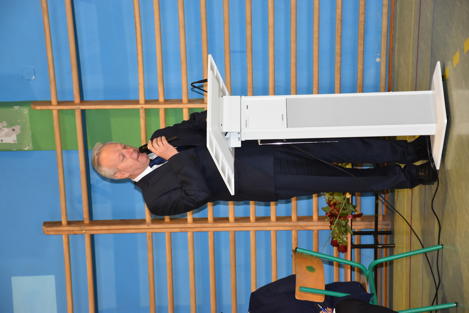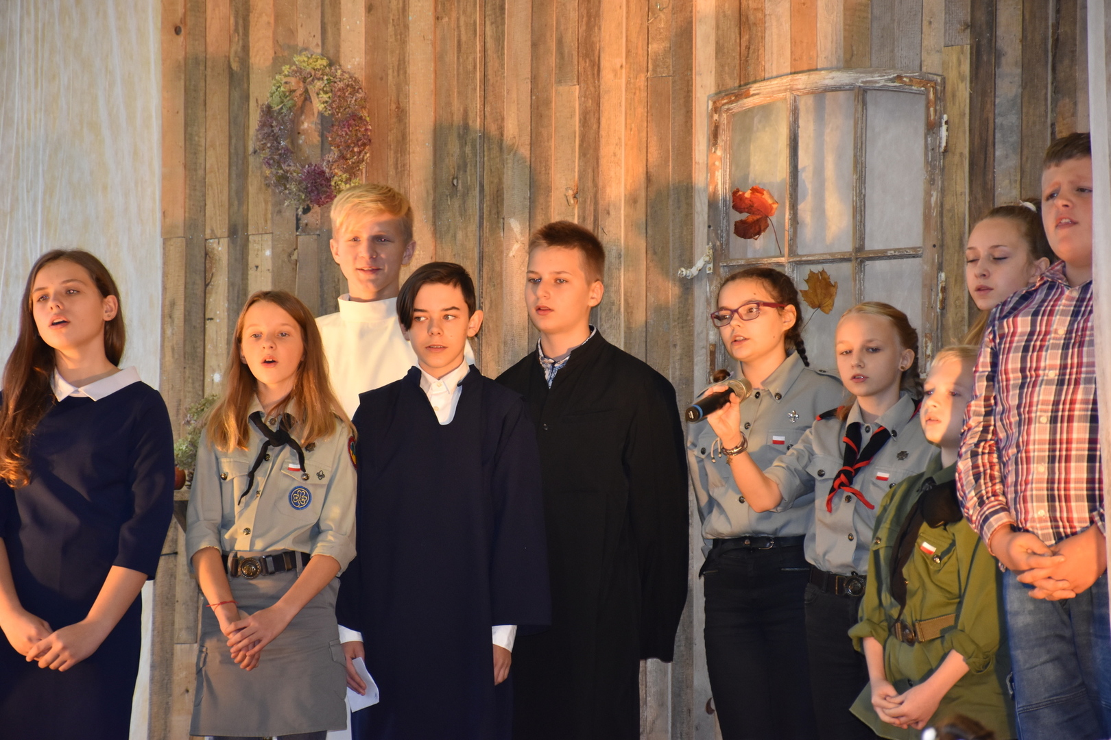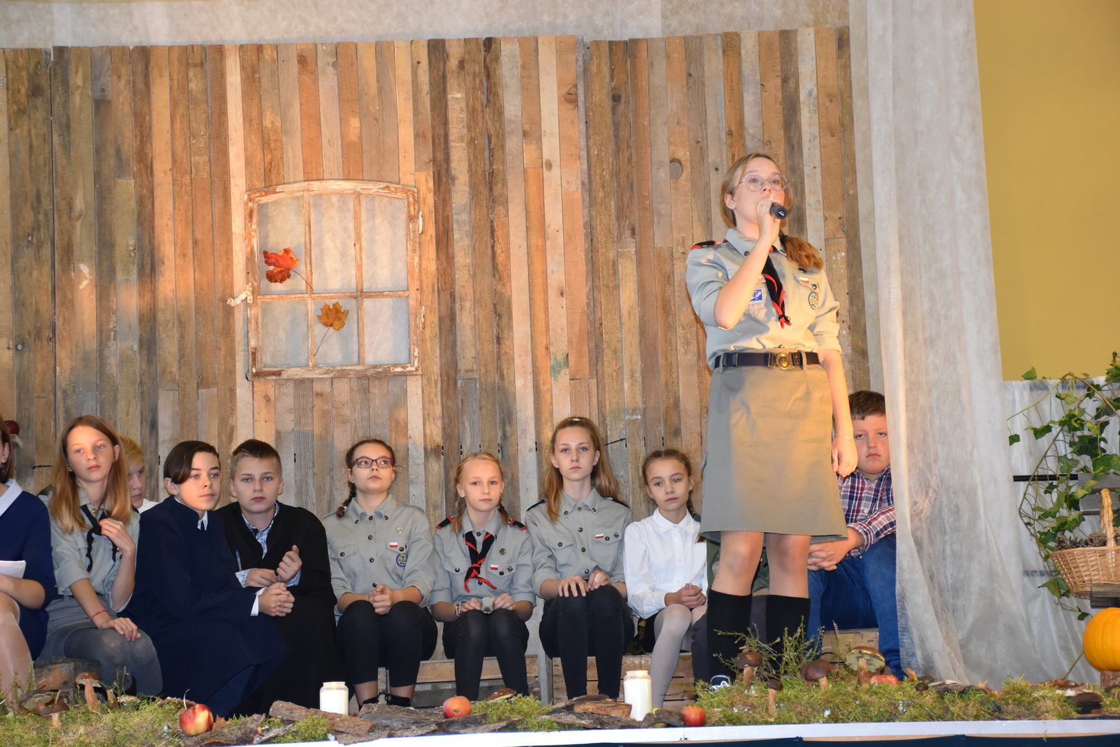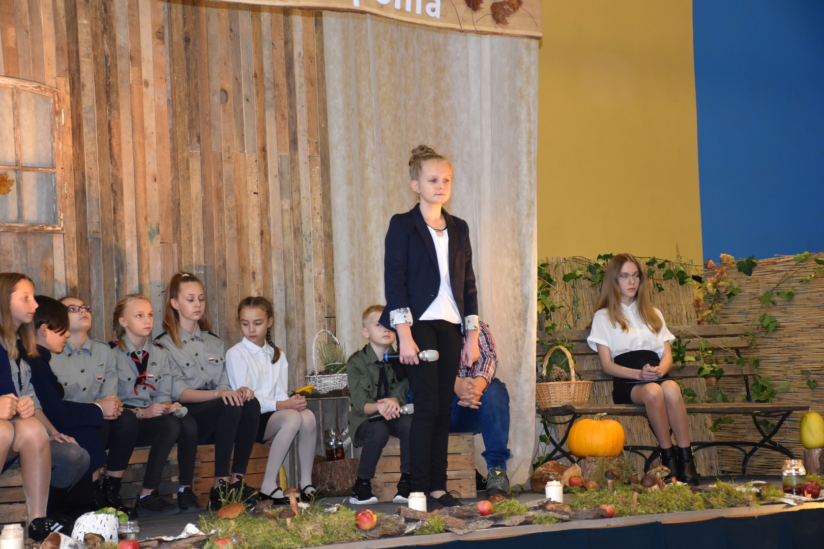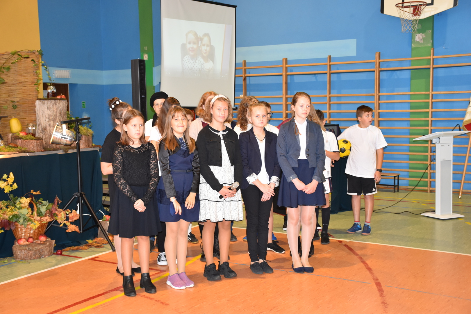 Uczniowie klas V-VIII przygotowali występ w postaci zbiórki harcerskiej, która dedykowana była świętemu Janowi Pawłowi II. Naświetlili jego życiorys, a opowieści biograficzne przeplatane były wierszami, fragmentami różnych powiedzeń Karola Wojtyły oraz piosenkami. Wspólnie zaśpiewaliśmy pieśń „Barkę” w podziękowaniu dla Wielkiego Rodaka, który zawsze wskazywał drogę, którą mamy kroczyć ku temu, co dobre i piękne. Następnie głos zabrał pan dyrektor, który podziękował wszystkim za przygotowanie uroczystości i poprosił o zabranie głosu księdza biskupa Ryszarda Kasynę. Przekonywał on, że powinniśmy być dymni, z takiego patrona. Biskup opowiadał o swojej młodości, o tym jak on sam był uczniem. Odpowiadał na liczne pytania naszych uczniów.