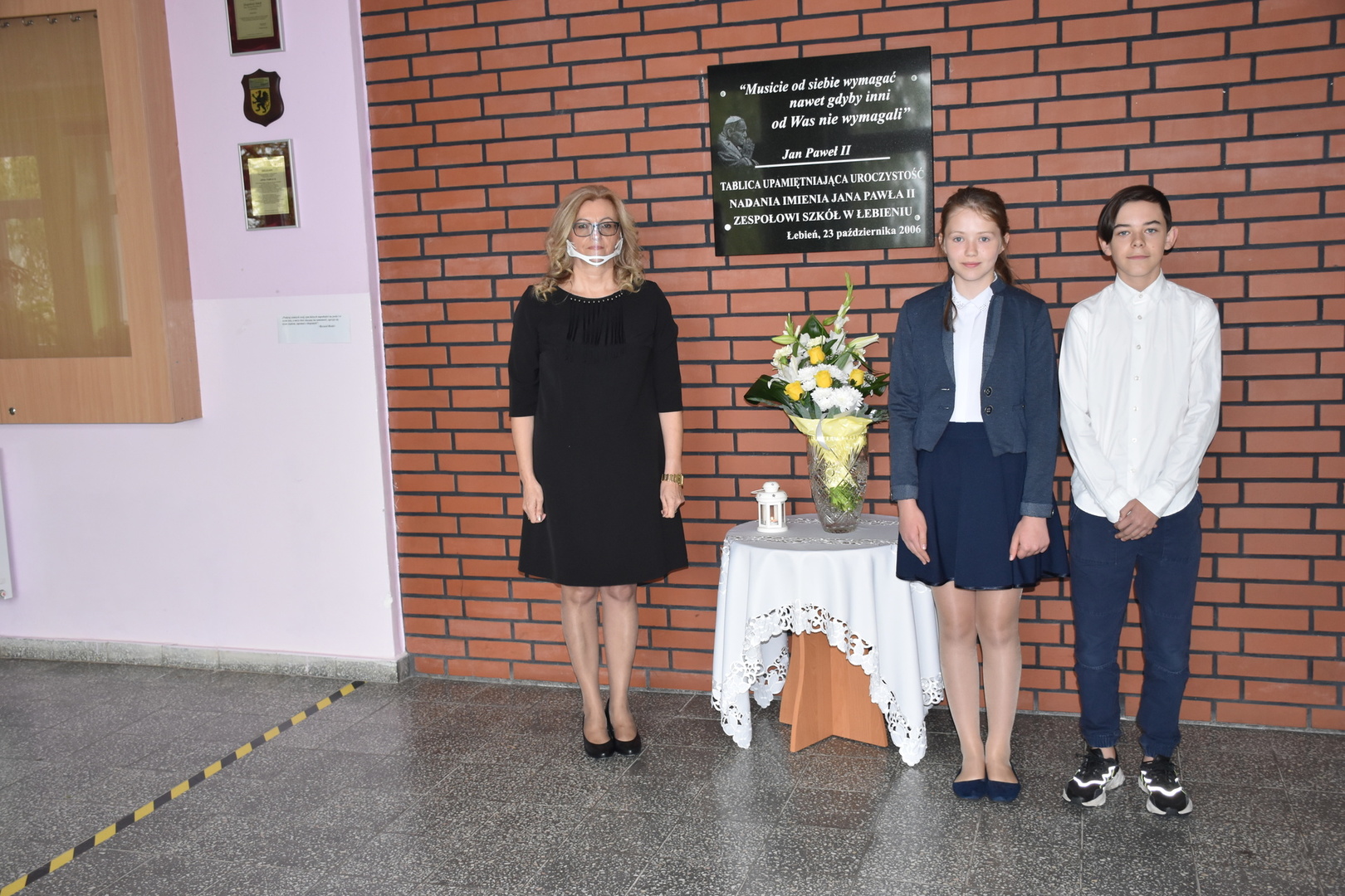 Bardzo uroczyście oddaliśmy hołd naszemu Wielkiemu Patronowi – Janowi Pawłowi II. Po wprowadzeniu sztandaru został odśpiewany hymn szkoły, przedstawiciele Samorządu Szkolnego z Panią wicedyrektor złożyli kwiaty pod tablicą pamiątkową.