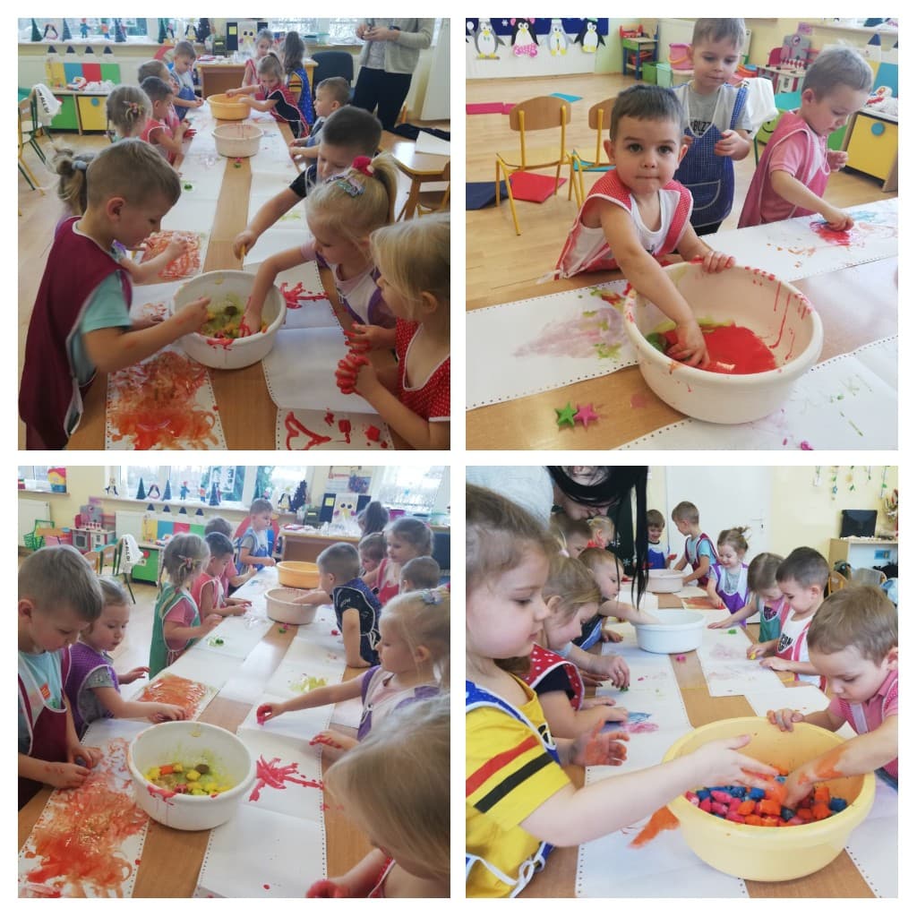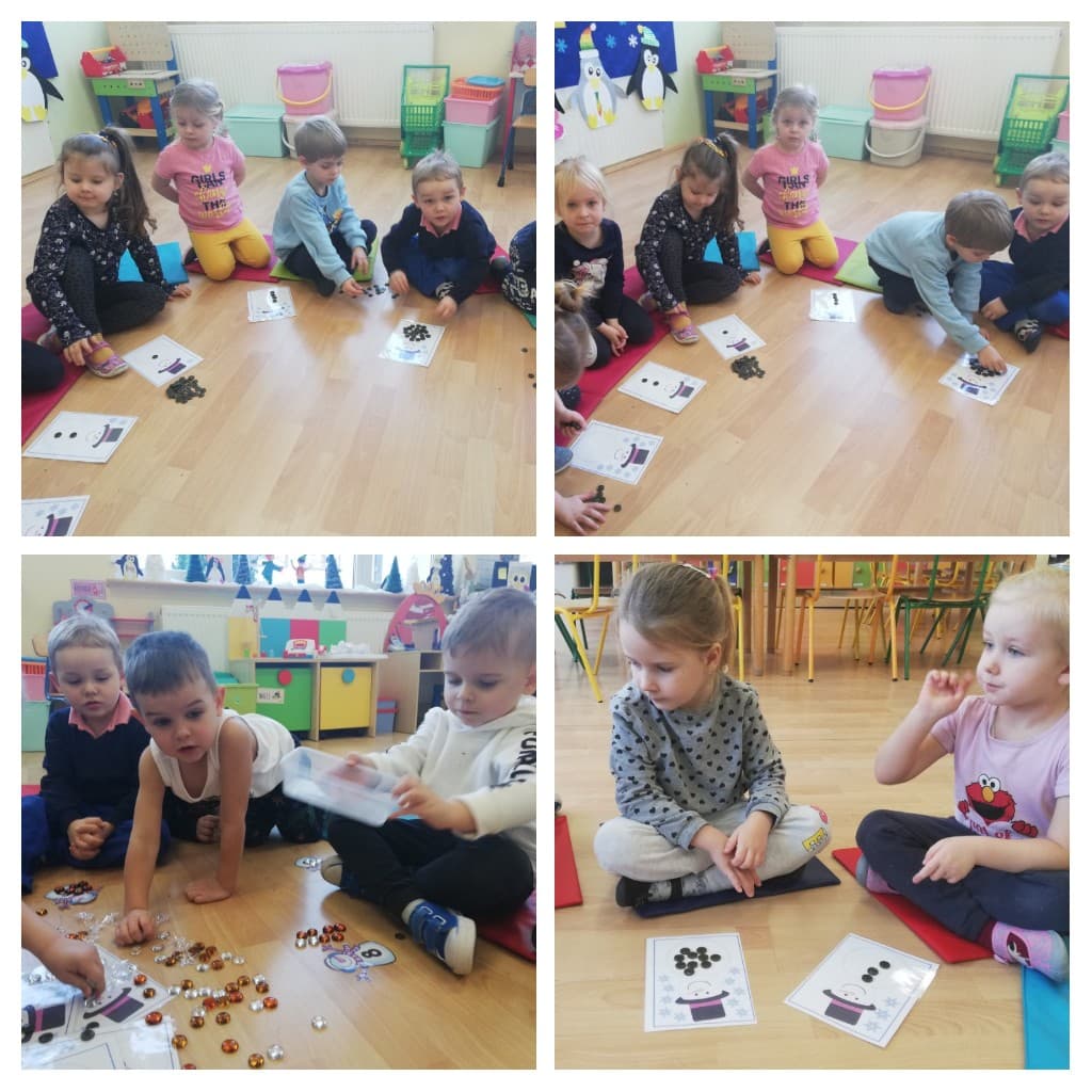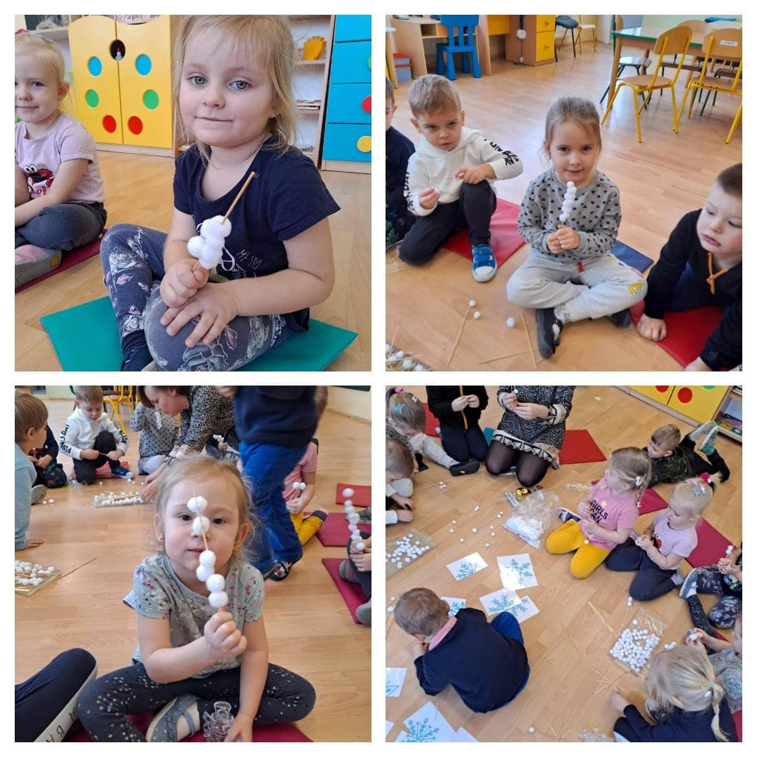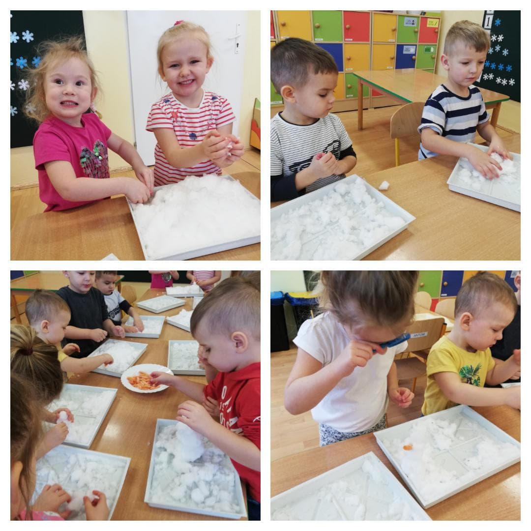 Przedszkolaki dowiedziały się jakiego kształtu są płatki śniegu, podczas jakich zjawisk atmosferycznych występuje śnieg, a wykonując doświadczenia, sprawdziły, co się dzieje ze śniegiem, gdy przyniesiemy go do ciepłej sali, oraz czy śnieg jest czysty. Poprzez realizację zadań od Pani Zimy, dzieci doskonaliły percepcje wzorkową, umiejętności matematyczne w zakresie przeliczania i zapis cyfrowy liczby jak również doskonaliły motorykę małą. Uwieńczeniem zajęć było malowanie śnieżynek kolorowymi kostkami lodu. Bardzo dużą radości sprawiły dzieciom śnieżne zabawy w przedszkolnym ogrodzie.