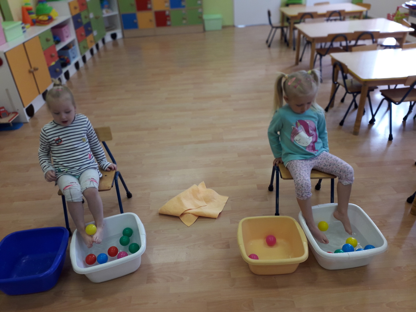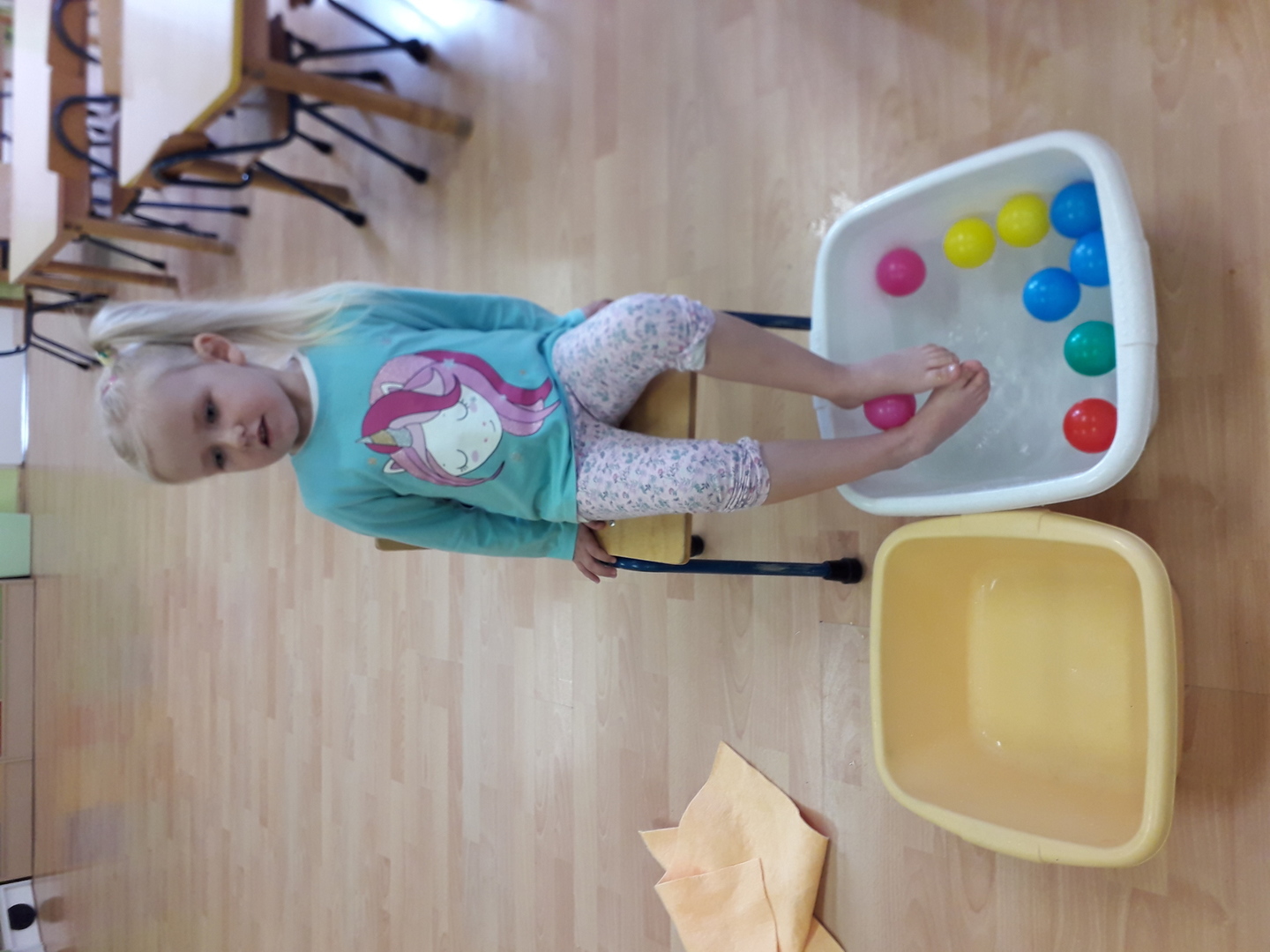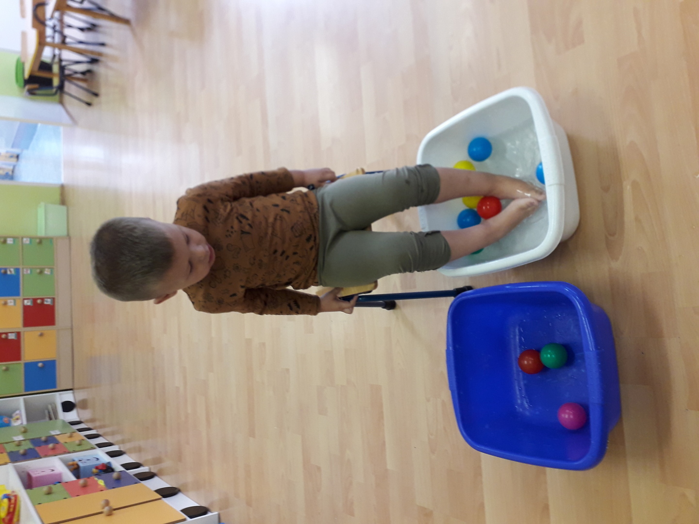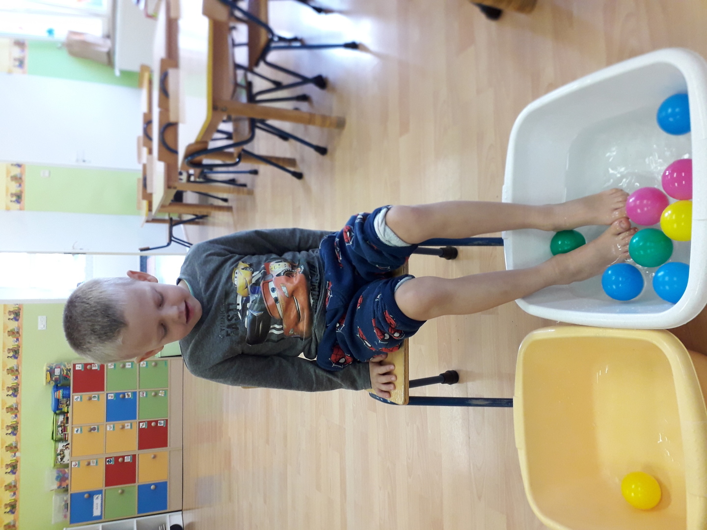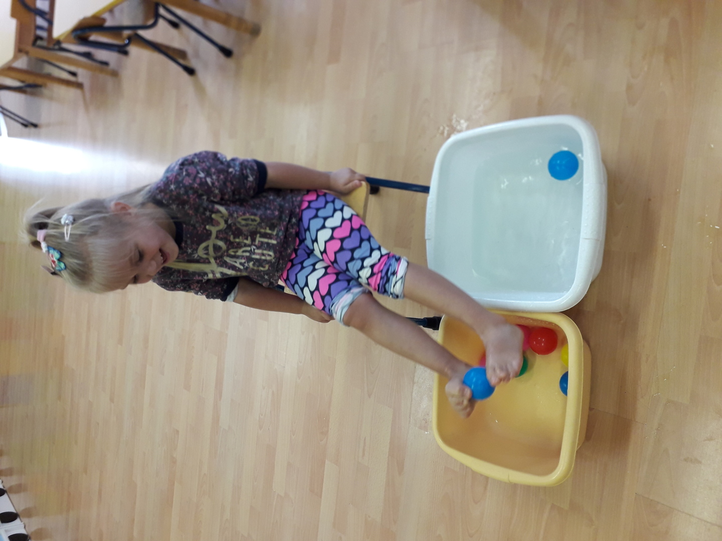 Wielką radość sprawiła dzieciom mała rywalizacja w przenoszeniu stopami kolorowych kulek umieszczonych w misce z wodą. Każdy Lisek chciał spróbować wykonać to zadanie.