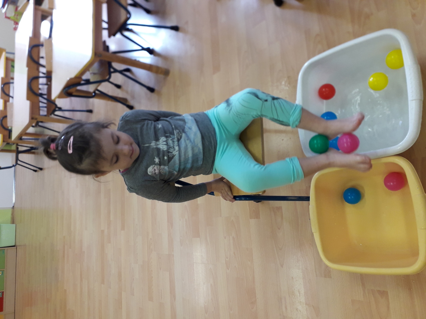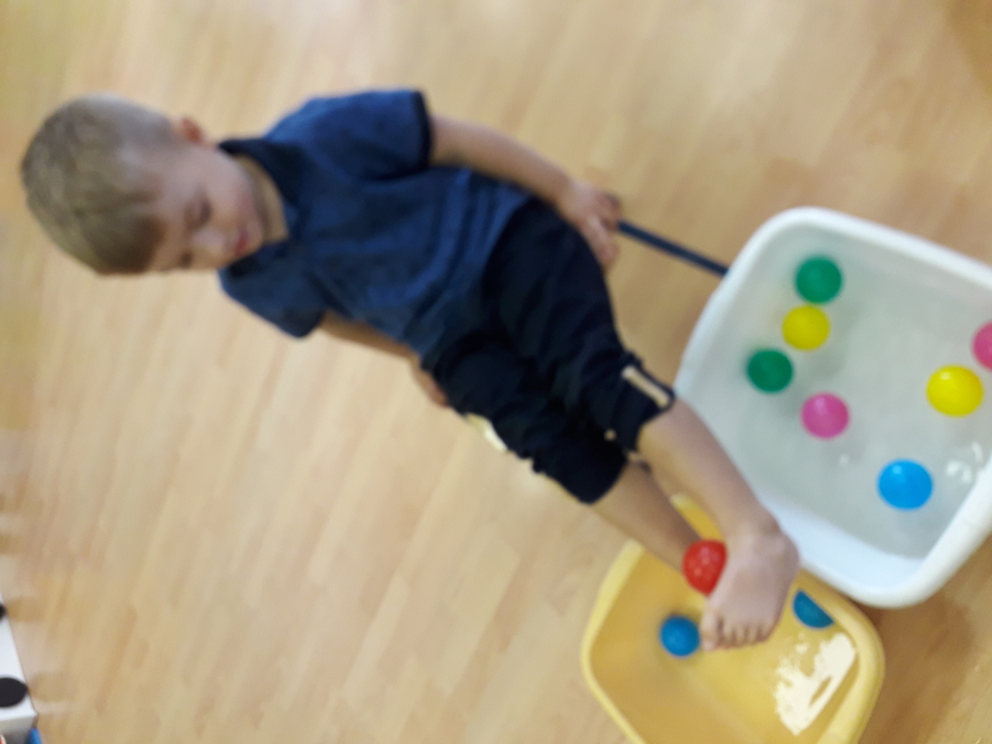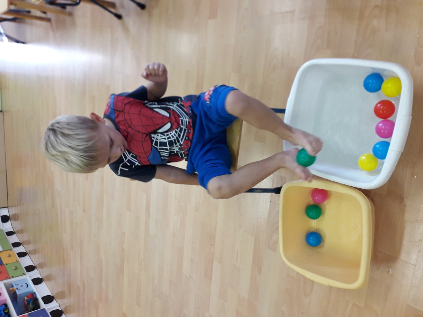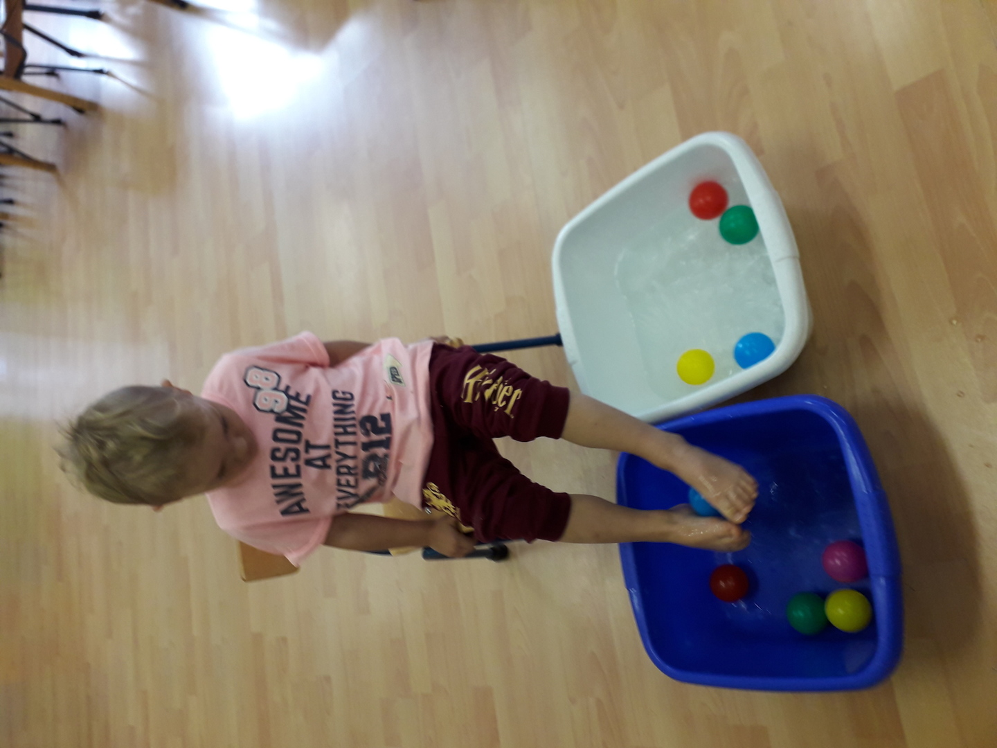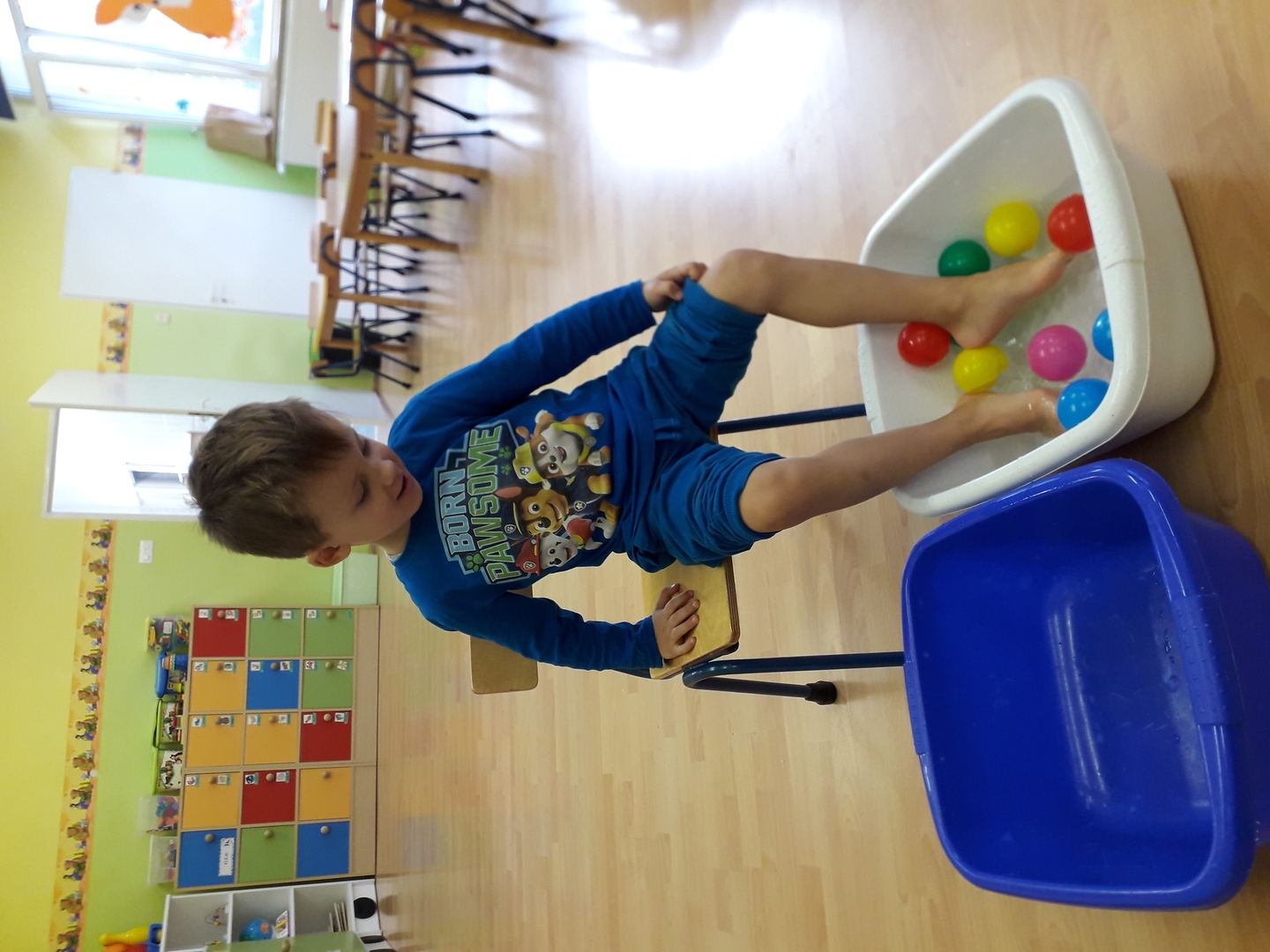 Wielką radość sprawiła dzieciom mała rywalizacja w przenoszeniu stopami kolorowych kulek umieszczonych w misce z wodą. Każdy Lisek chciał spróbować wykonać to zadanie.