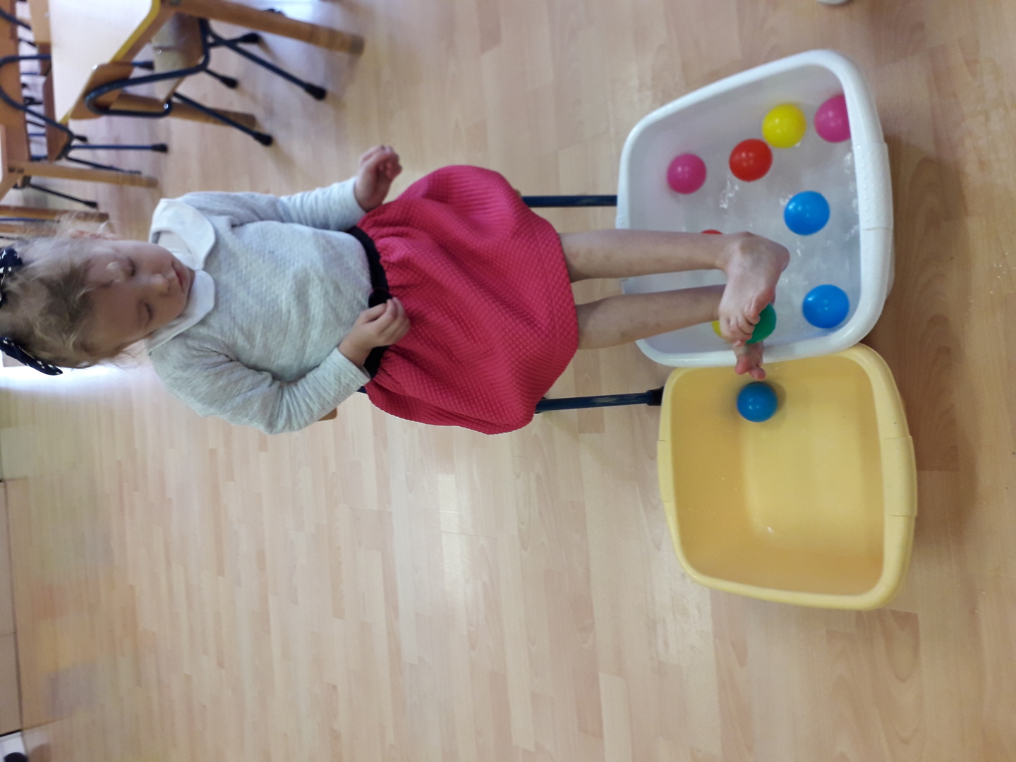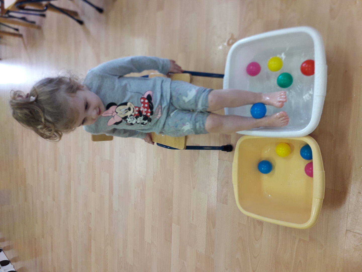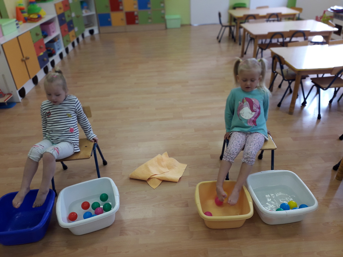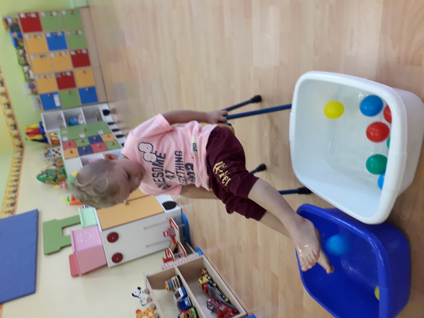 Wielką radość sprawiła dzieciom mała rywalizacja w przenoszeniu stopami kolorowych kulek umieszczonych w misce z wodą. Każdy Lisek chciał spróbować wykonać to zadanie.