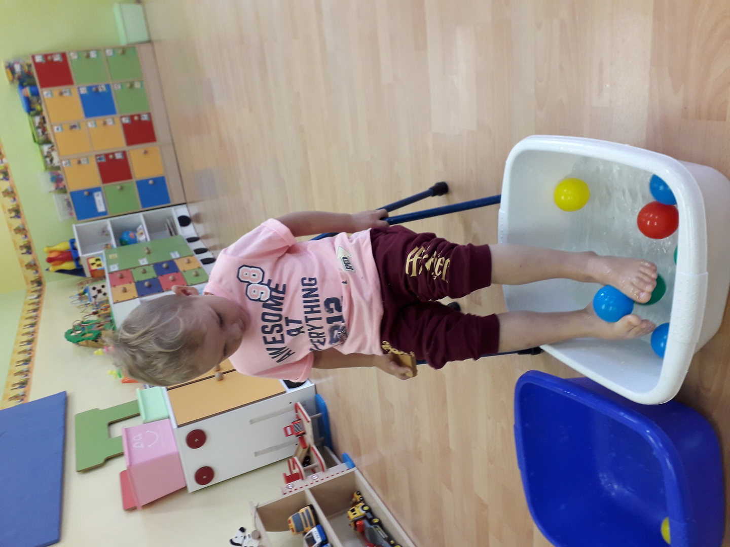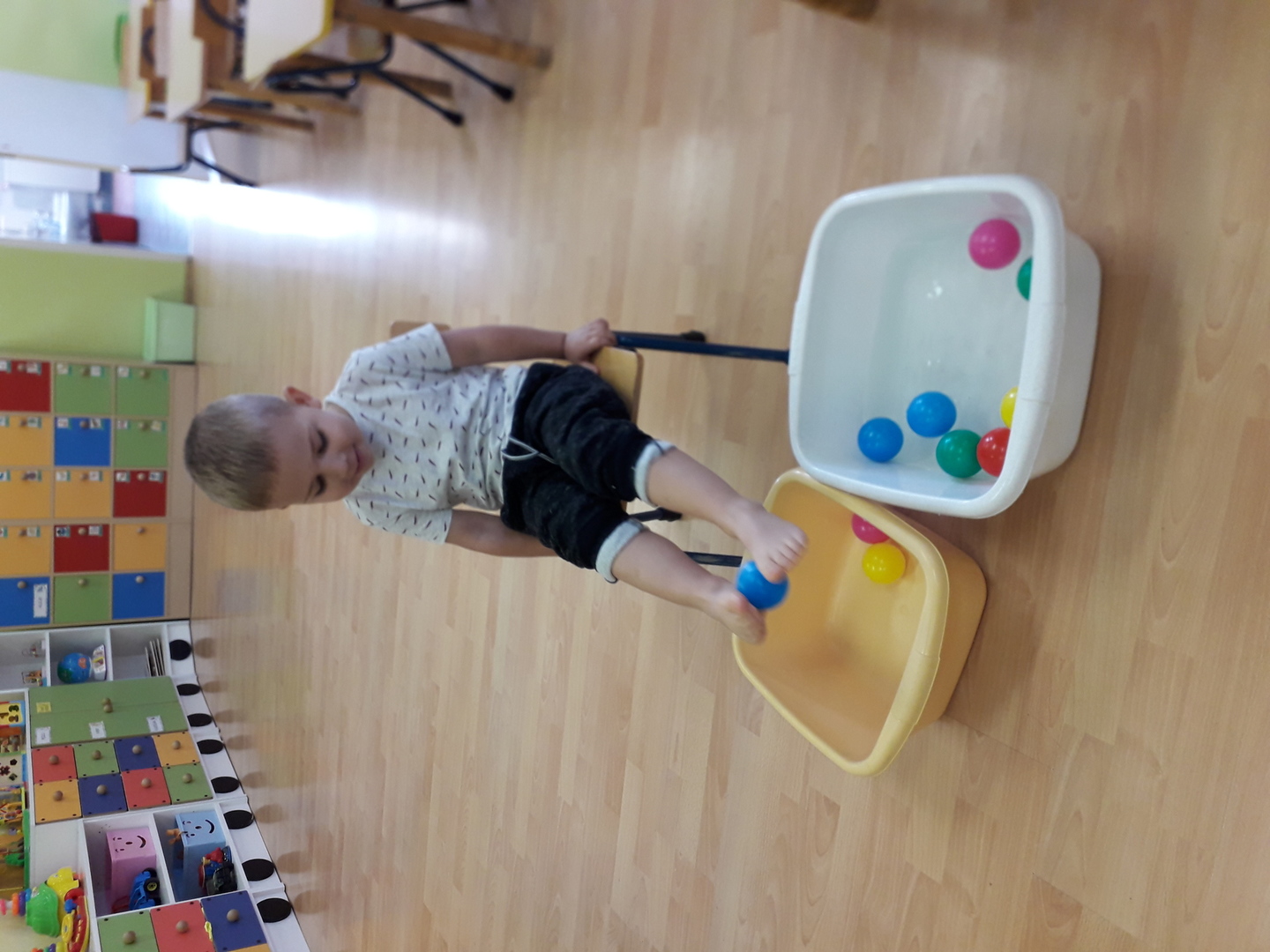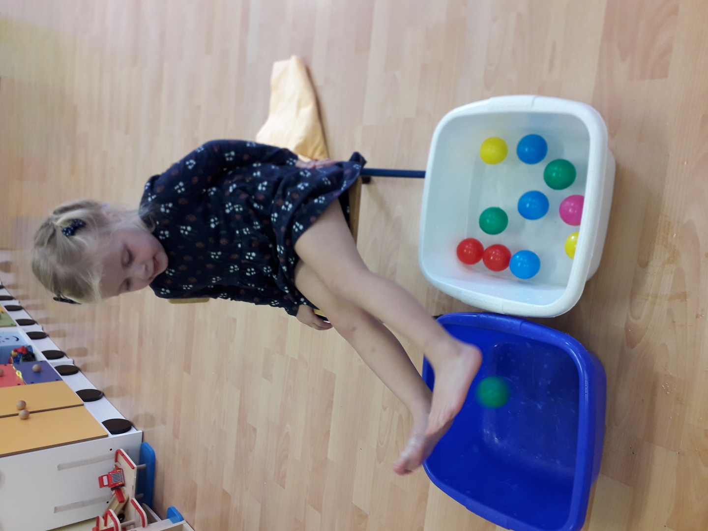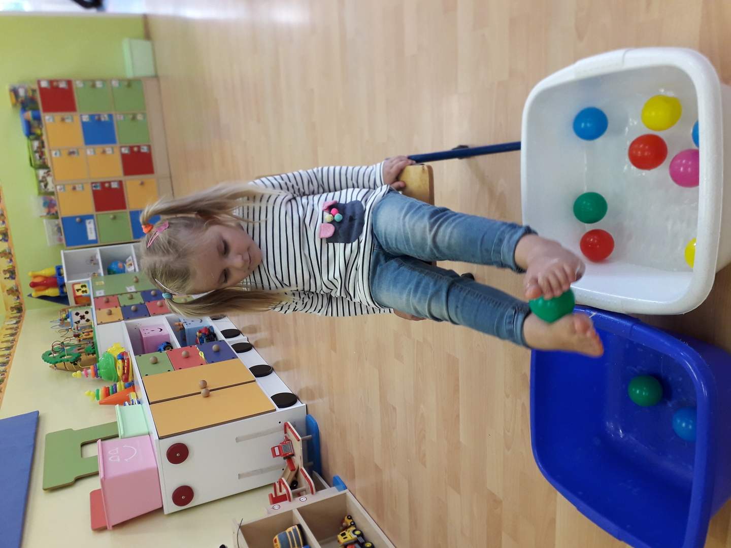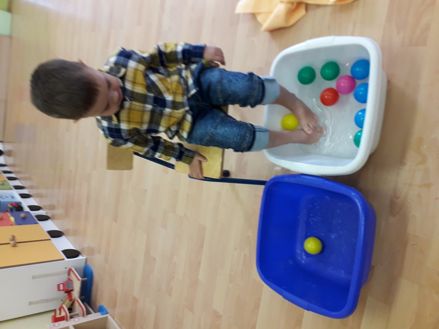 Wielką radość sprawiła dzieciom mała rywalizacja w przenoszeniu stopami kolorowych kulek umieszczonych w misce z wodą. Każdy Lisek chciał spróbować wykonać to zadanie.