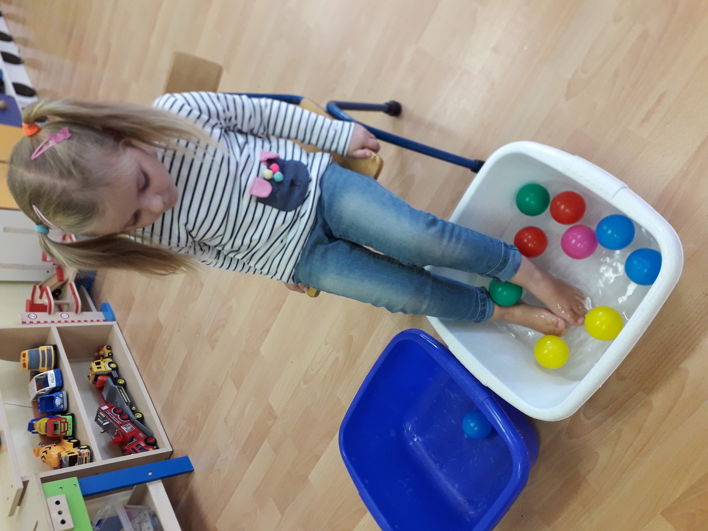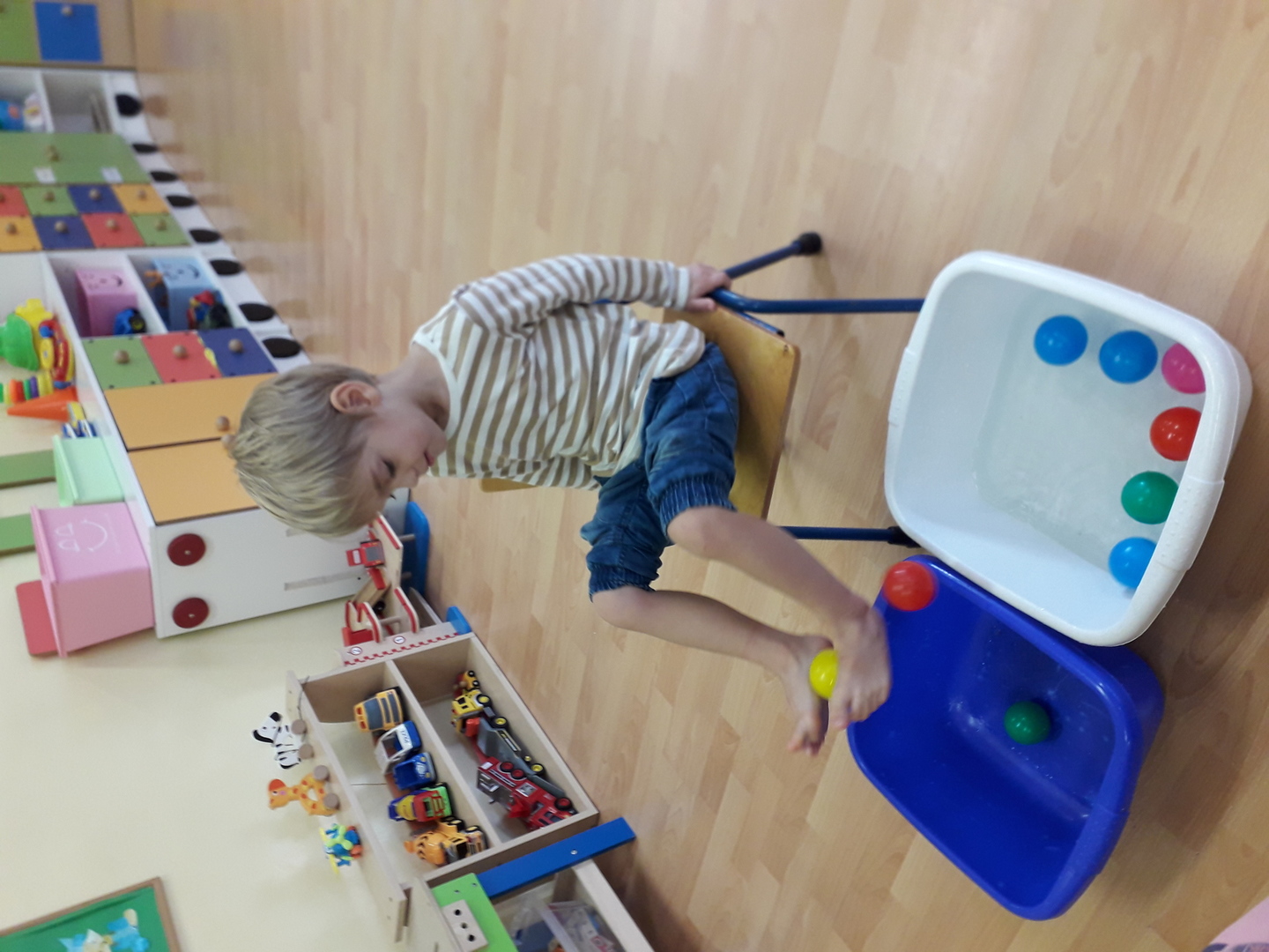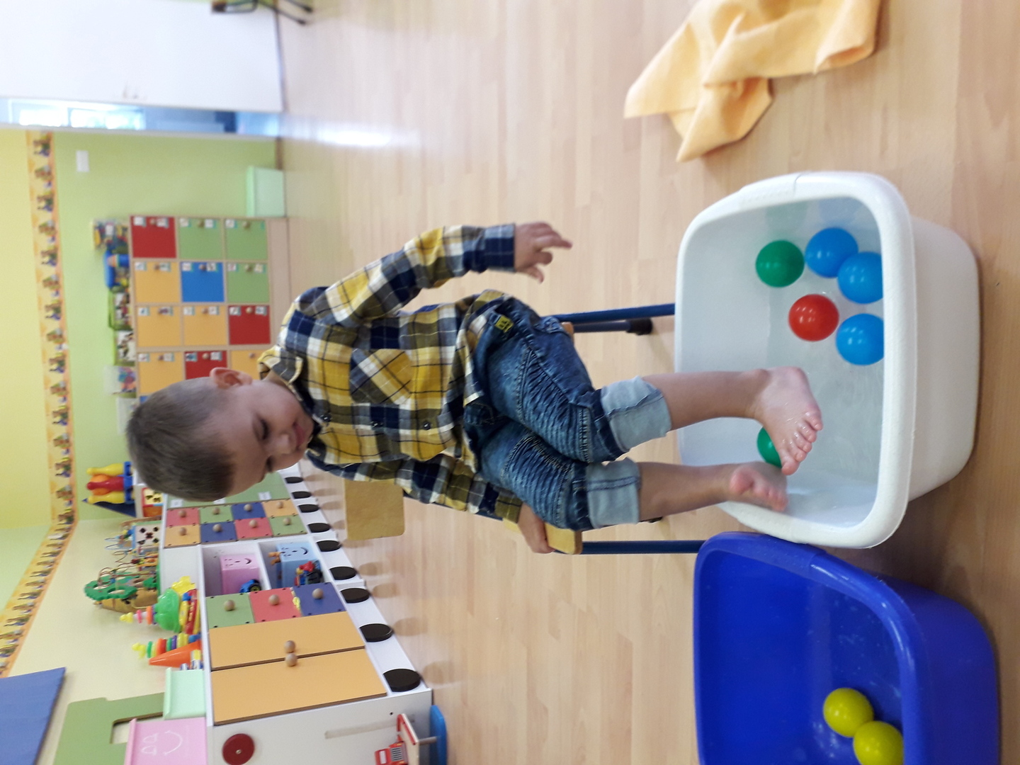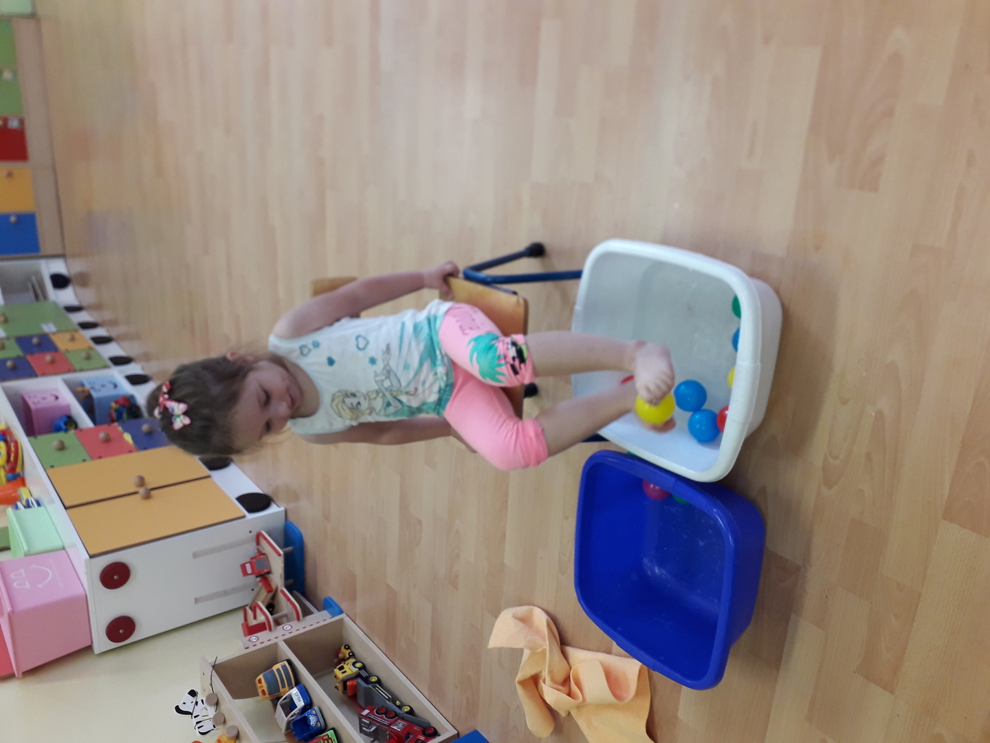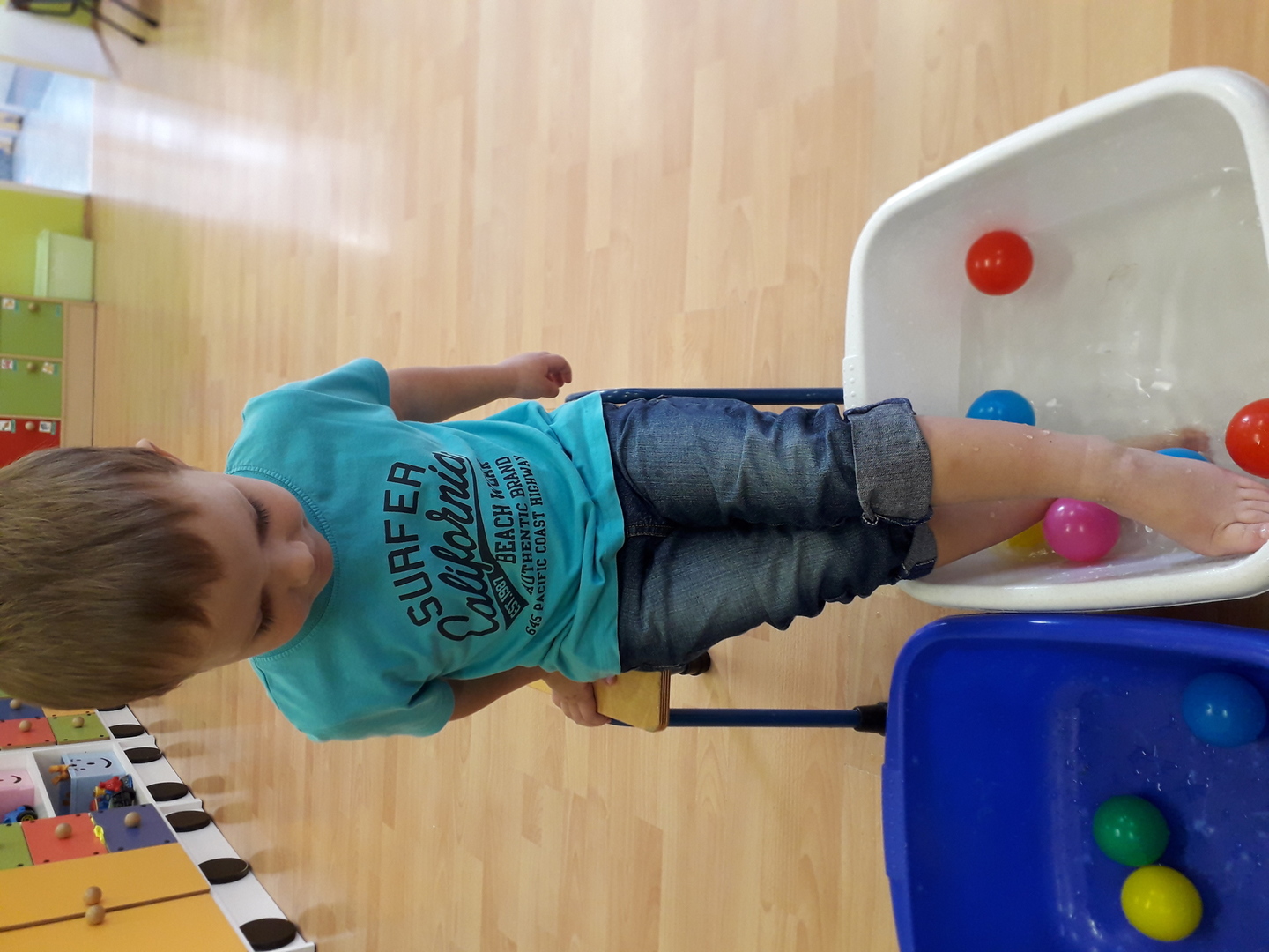 Wielką radość sprawiła dzieciom mała rywalizacja w przenoszeniu stopami kolorowych kulek umieszczonych w misce z wodą. Każdy Lisek chciał spróbować wykonać to zadanie.