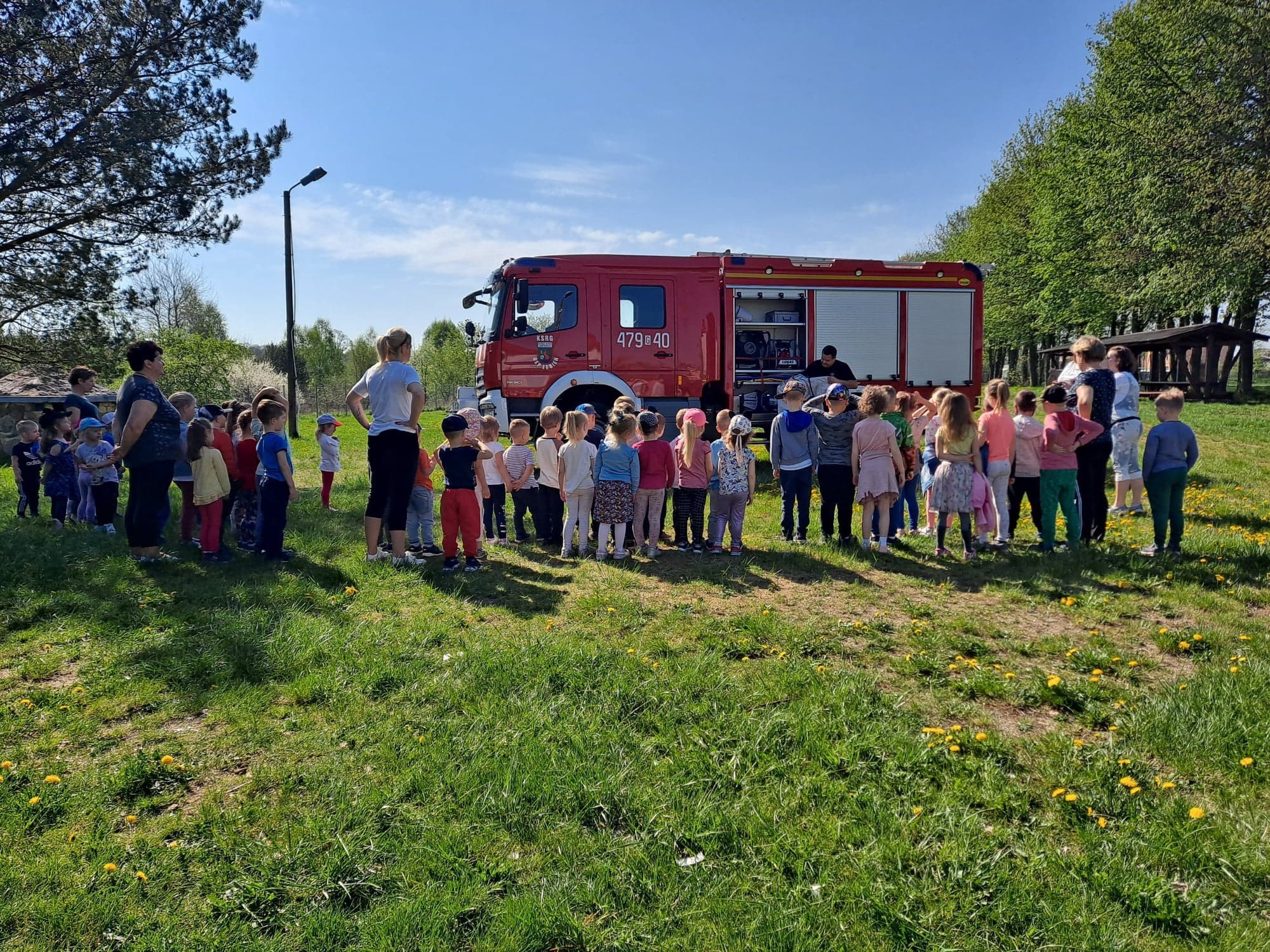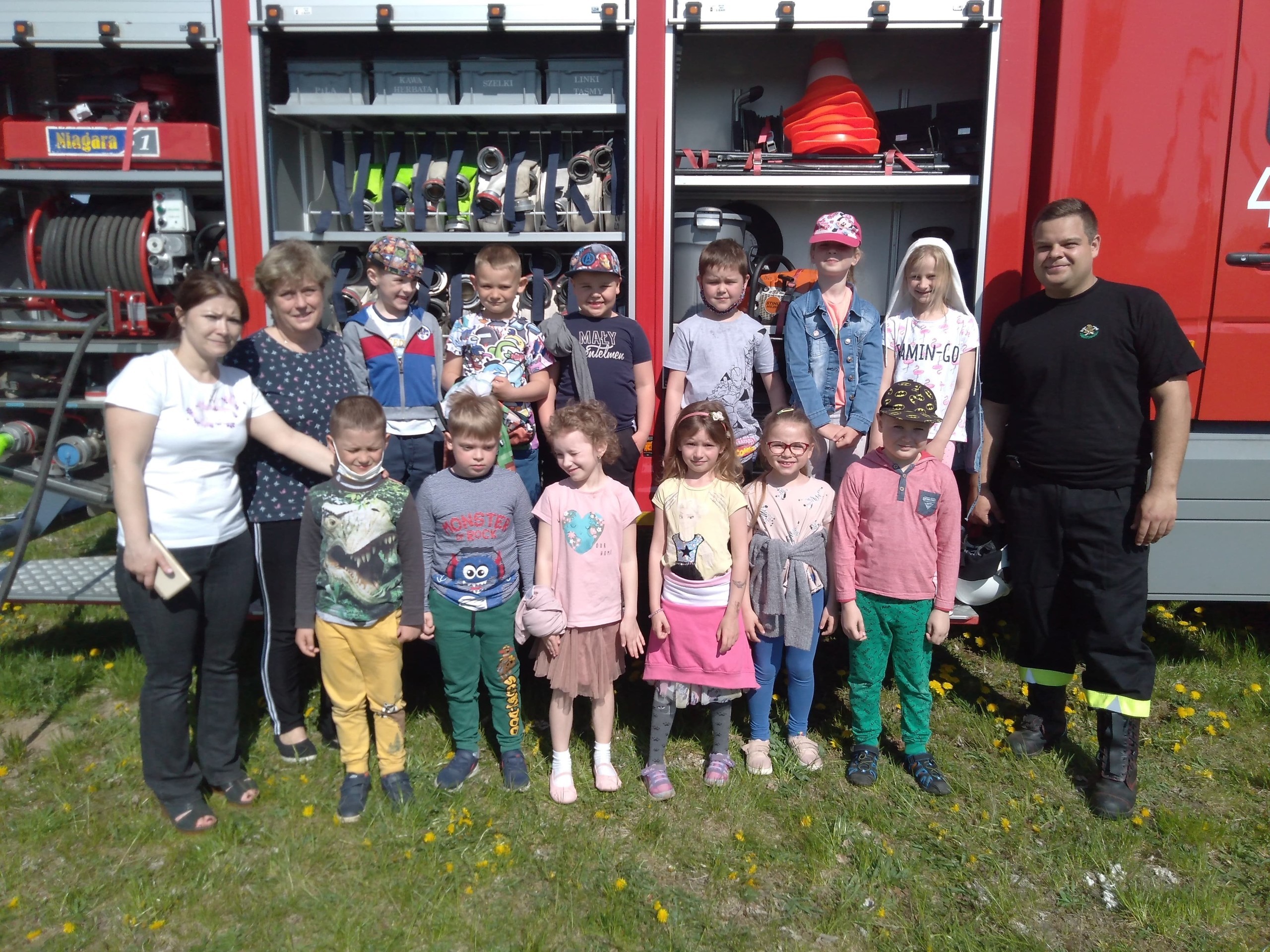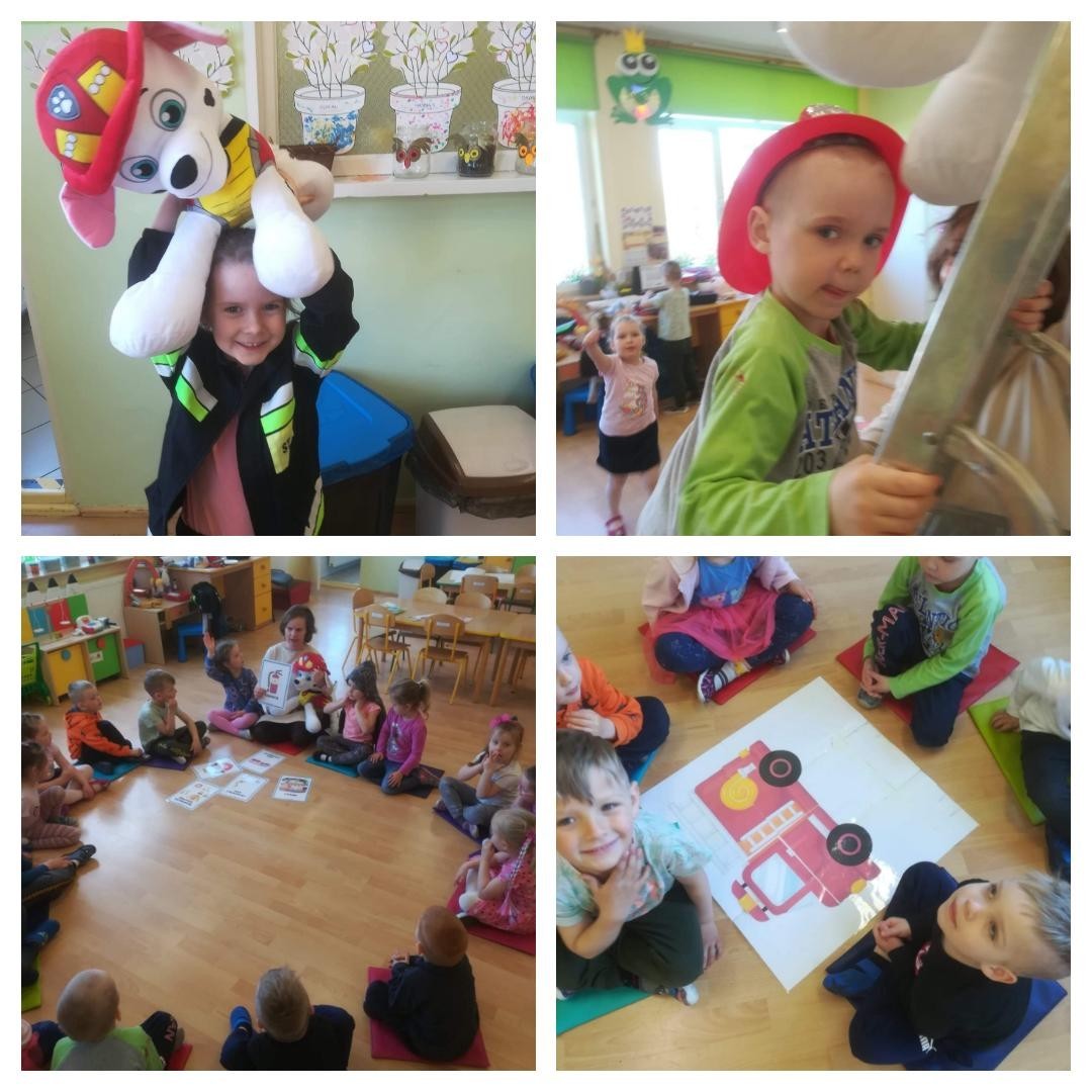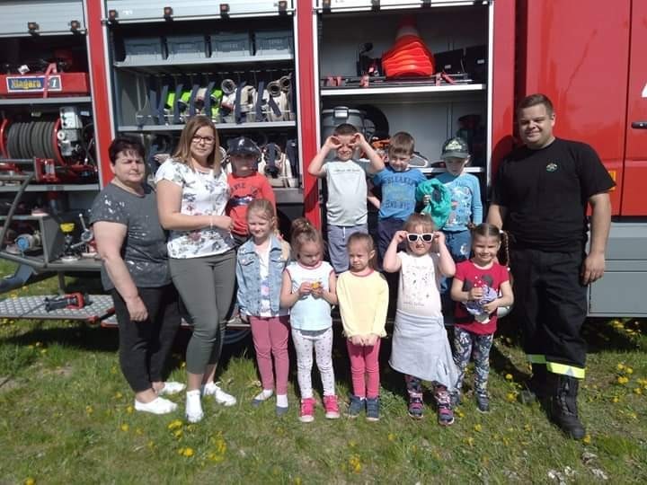 Wizyta gości wzbudziła zainteresowanie dzieci, które w skupieniu słuchały ciekawostek na temat pracy strażaka. Dowiedziały się, w jakich okolicznościach można wzywać straż pożarną, że strażacy nie tylko gaszą pożary, ale również są wzywani do wypadków i innych zdarzeń.